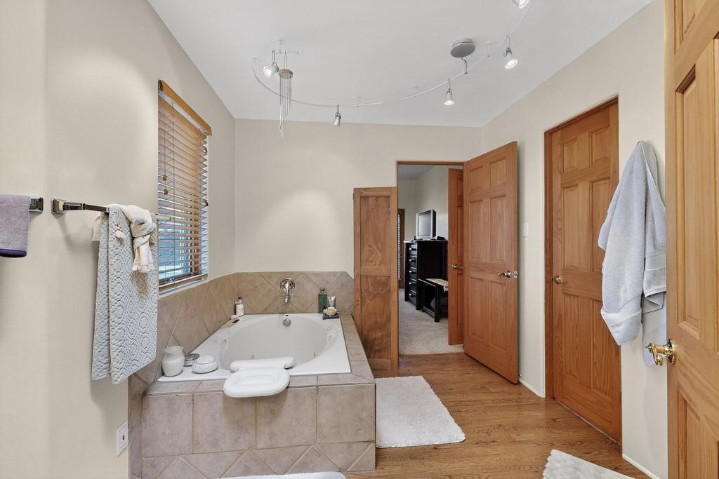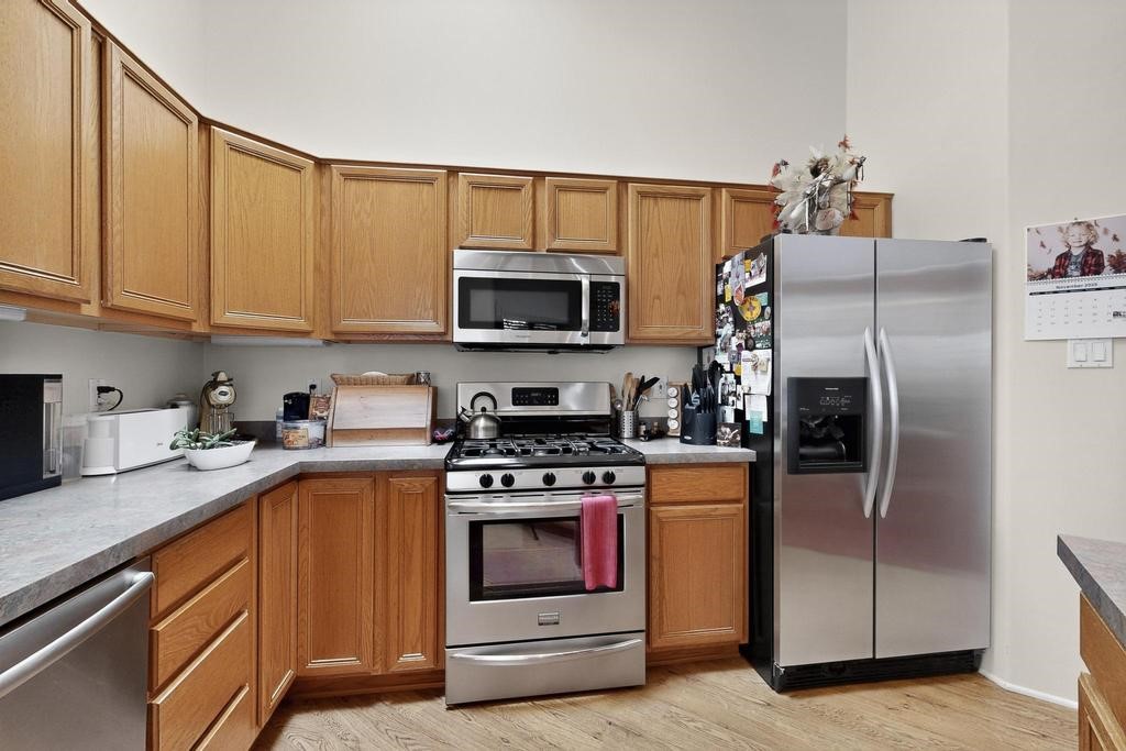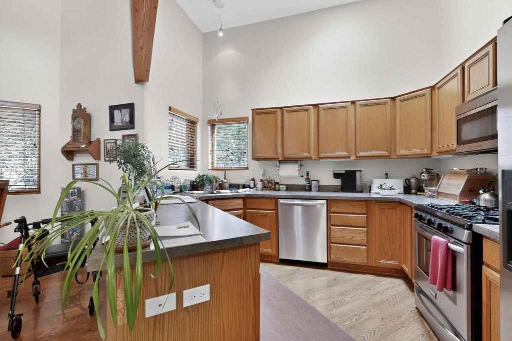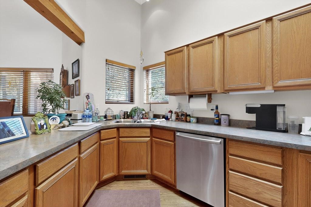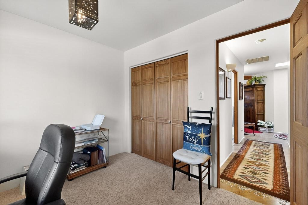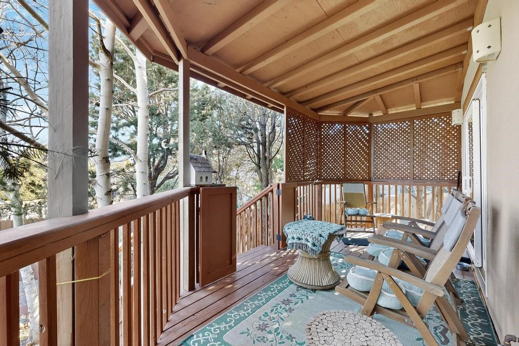 Don't miss this charming single-level home in Pueblos del Sol featuring three bedrooms and two bathrooms. This residence showcases classic Santa Fe details such as Vigas and a cozy Kiva fireplace. Lots of natural light streaming in from five skylights throughout the home. The open floor plan provides great flow and comfortable bedroom separation, while the spacious deck with a solid portal--accessible from both the living room and primary bedroom--offers the perfect place to relax and enjoy the beautiful mountain views. York Central air conditioning and a two-car garage complete this wonderful Santa Fe home. Additionally, the raised subfloor design allows for easy access to plumbing for repairs or modifications. Situated on a large, beautifully landscaped corner lot with native plants and an apricot tree, the property backs onto a greenbelt for added privacy. Recent updates include a finished garage with a new door (2016), a new TPO roof (2021), new coyote and dog-eared fencing (2021), stucco patched and stained (2025), a new hot water heater (2025), and a new sump pump (2023). We invite you to come take a look at this wonderful property.