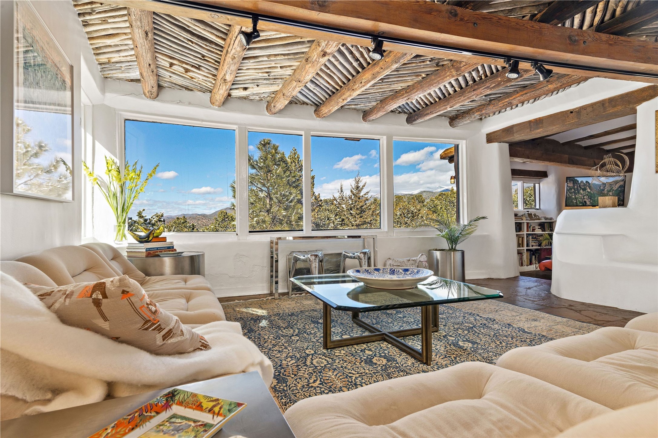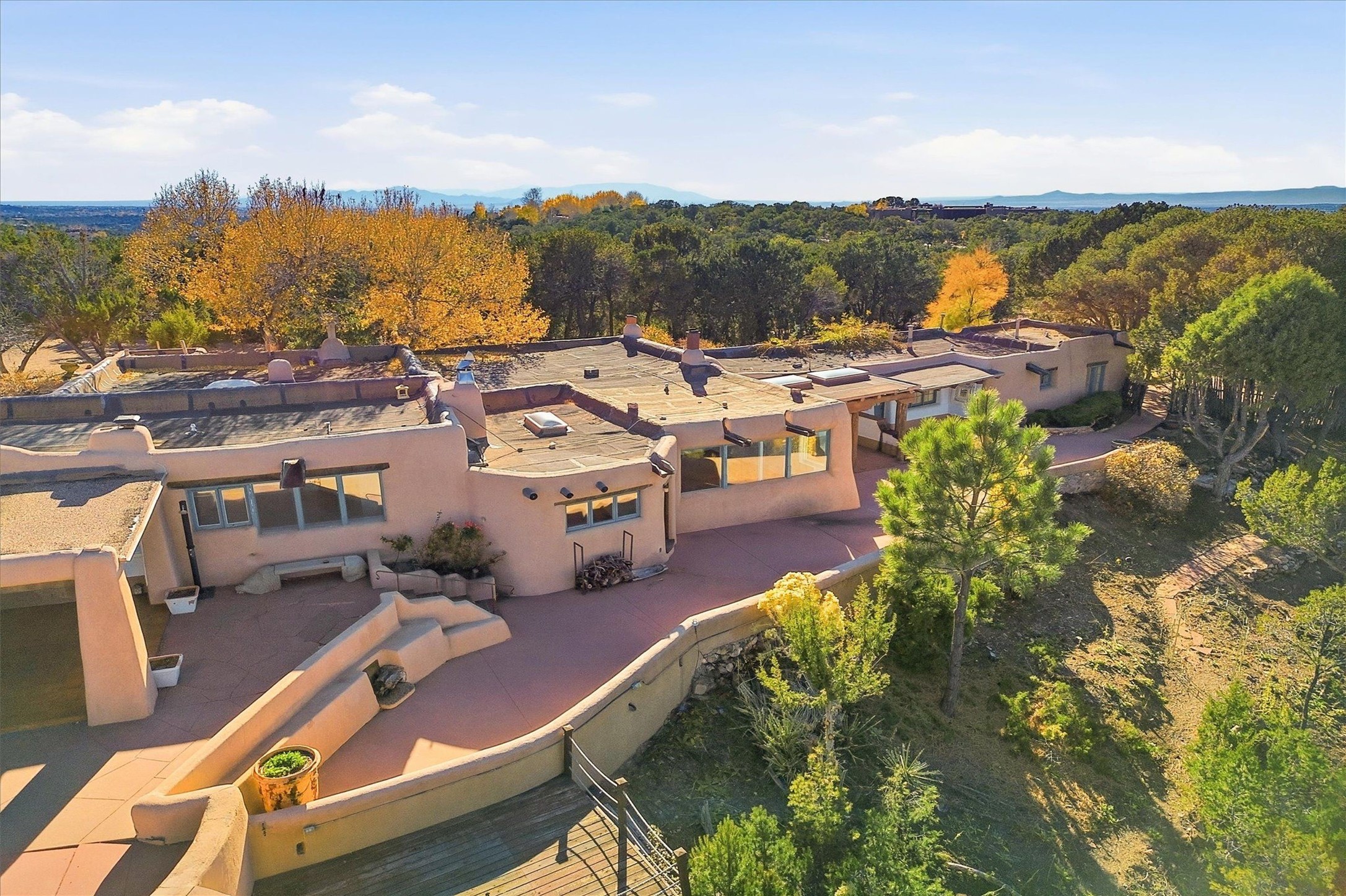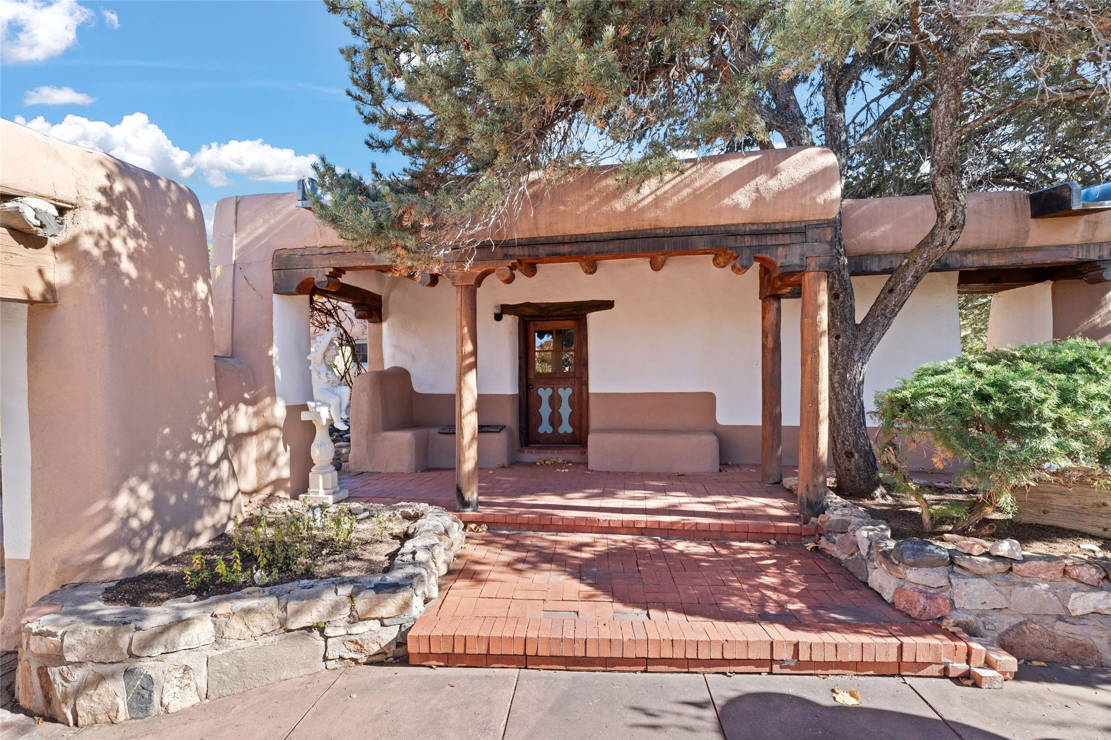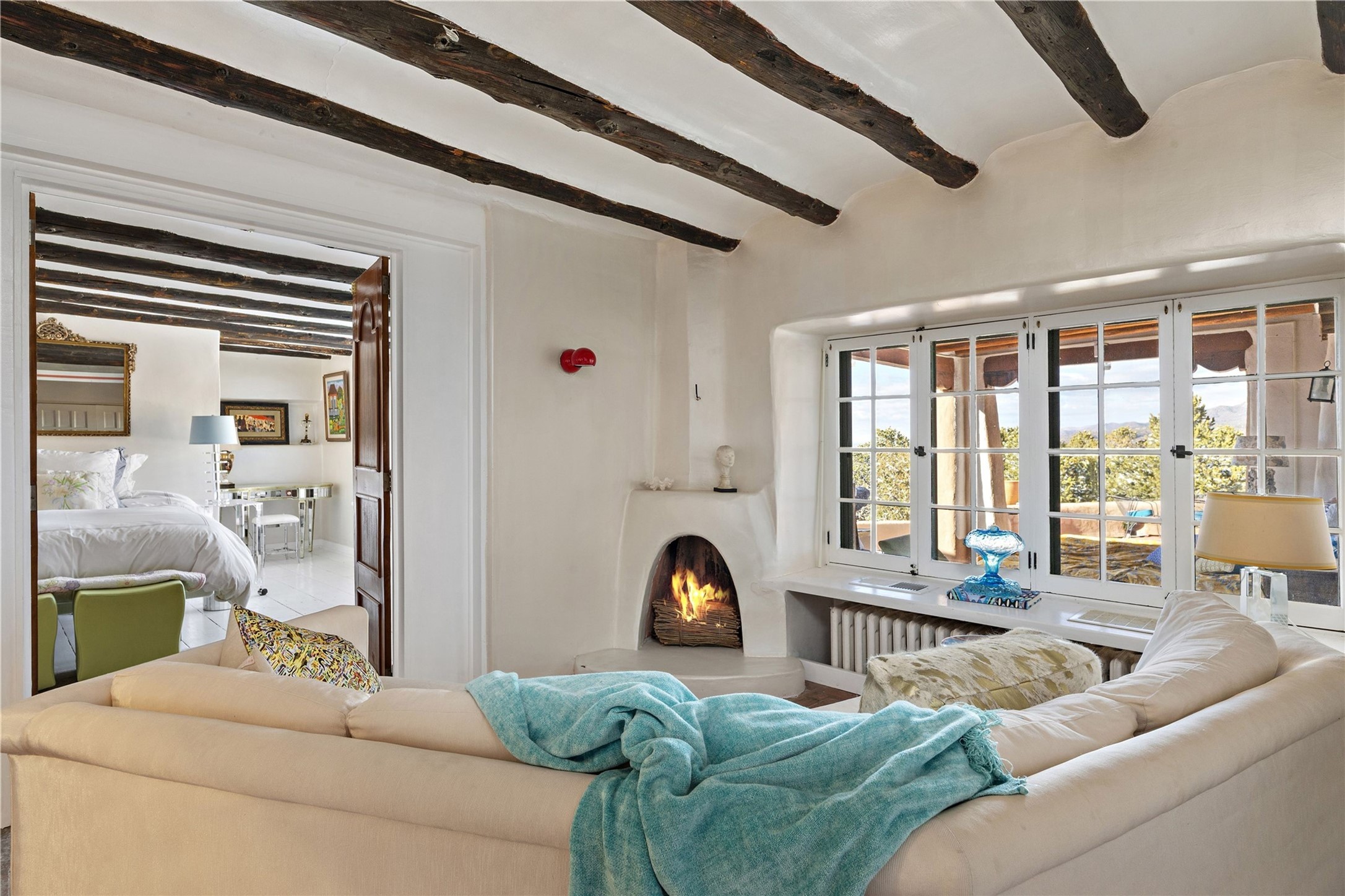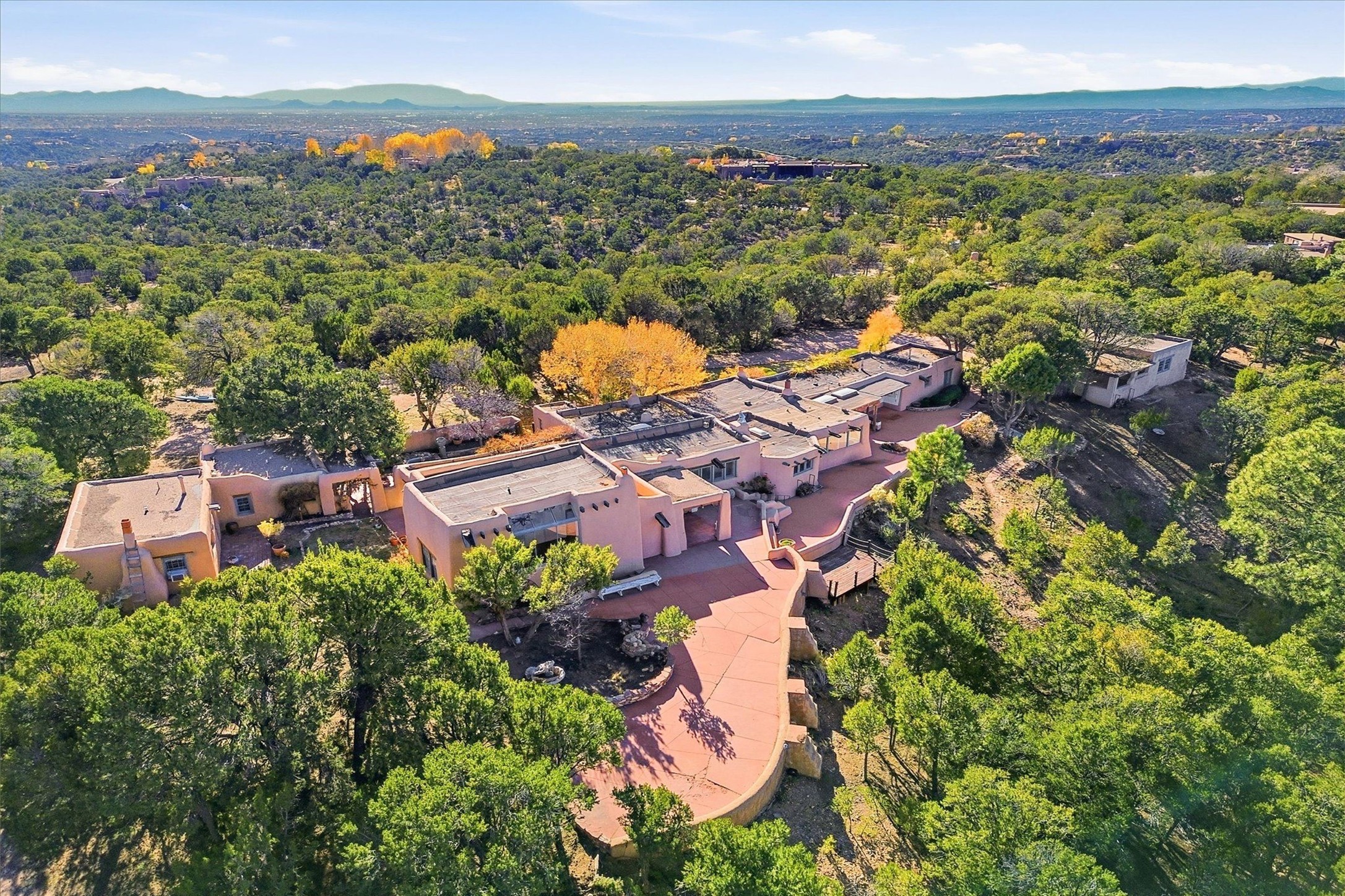 Set atop a private ridgeline with more than seven acres of pristine land, this remarkable residence is both a sanctuary and a celebration of Santa Fe's cultural and architectural heritage. According to prior sellers/listings, this home was designed in the 1920s by John Gaw Meem, one of New Mexico's most influential architects (buyer to verify). The home exemplifies the Spanish Pueblo Revival style that helped define Santa Fe's visual identity. Encompassing over 6,000 square feet, this classic triple-adobe hacienda is rich with craftsmanship and character. Hand-carved wooden doors, more than two centuries old, welcome you into spaces graced with flagstone and oak plank floors, massive vigas, and hand-hewn willow herringbone ceilings--each element adding warmth, texture, and timeless appeal. The main residence offers four bedrooms and four baths, complemented by two charming guest casitas. The bright kitchen features a breakfast nook that opens to multiple patios and courtyards, perfect for dining al fresco while taking in the far-reaching mountain views. Distinctive architectural moments define the home: a gracious adobe-arched dining room, coved ceilings, and divided-light windows that fill the interiors with natural light. According to prior sellers/listings, a studio--originally used in the 1930s by artist McHarg (buyer to verify) Davenport of The Rio Grande Painters--serves as a creative retreat with soaring split cedar ceilings, and access to a rooftop viewing area, ideal for sunsets and stargazing. The location is exceptional--completely private yet nearby Santa Fe's historic Plaza, the Santa Fe Opera and approximately 25 minutes to Ski Santa Fe. Disclaimer: Furnished photos are from 2023. Current photos are of unfurnished property. Seller has never resided in home. Property is being sold in AS-IS, in its current condition.