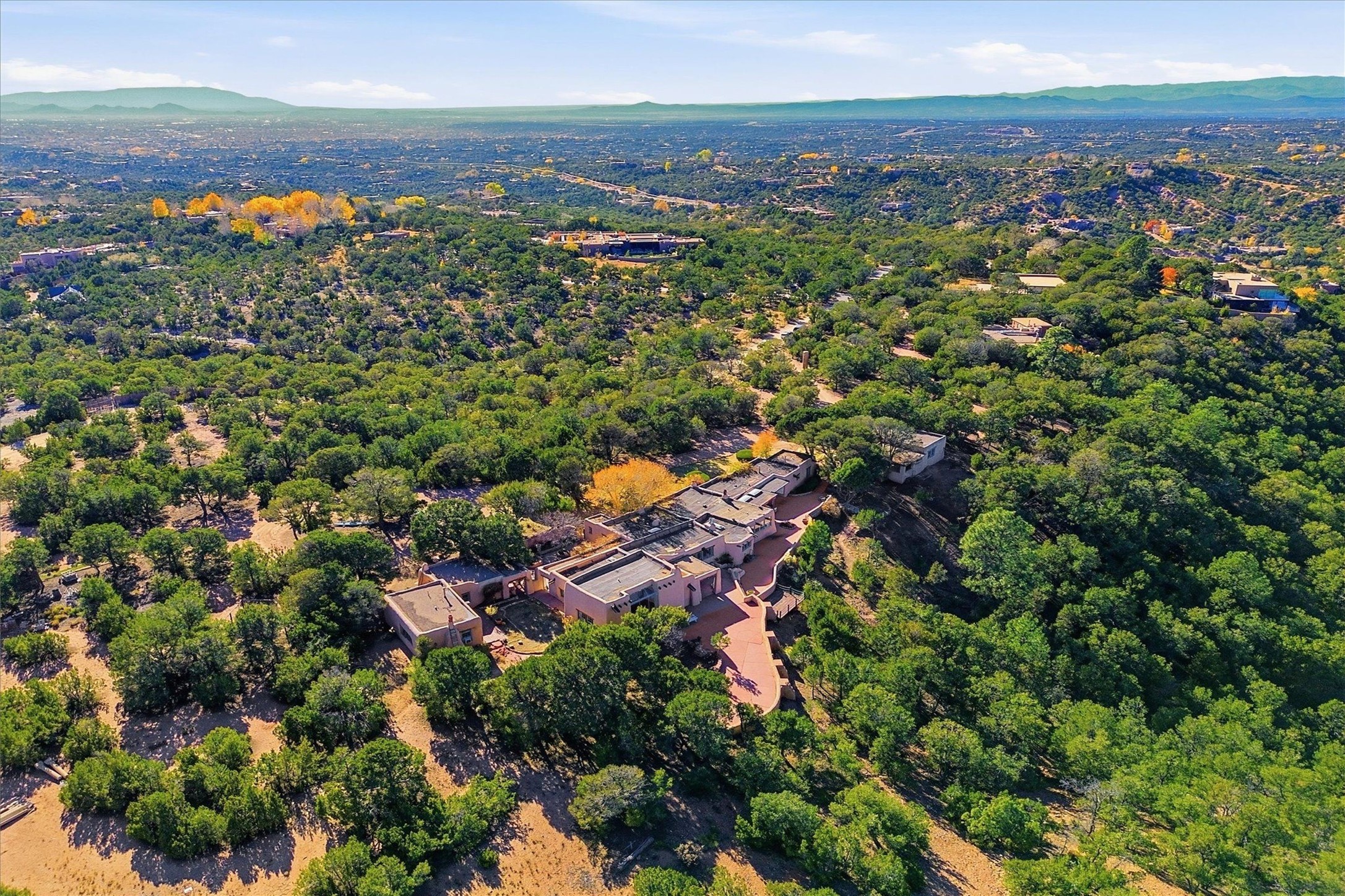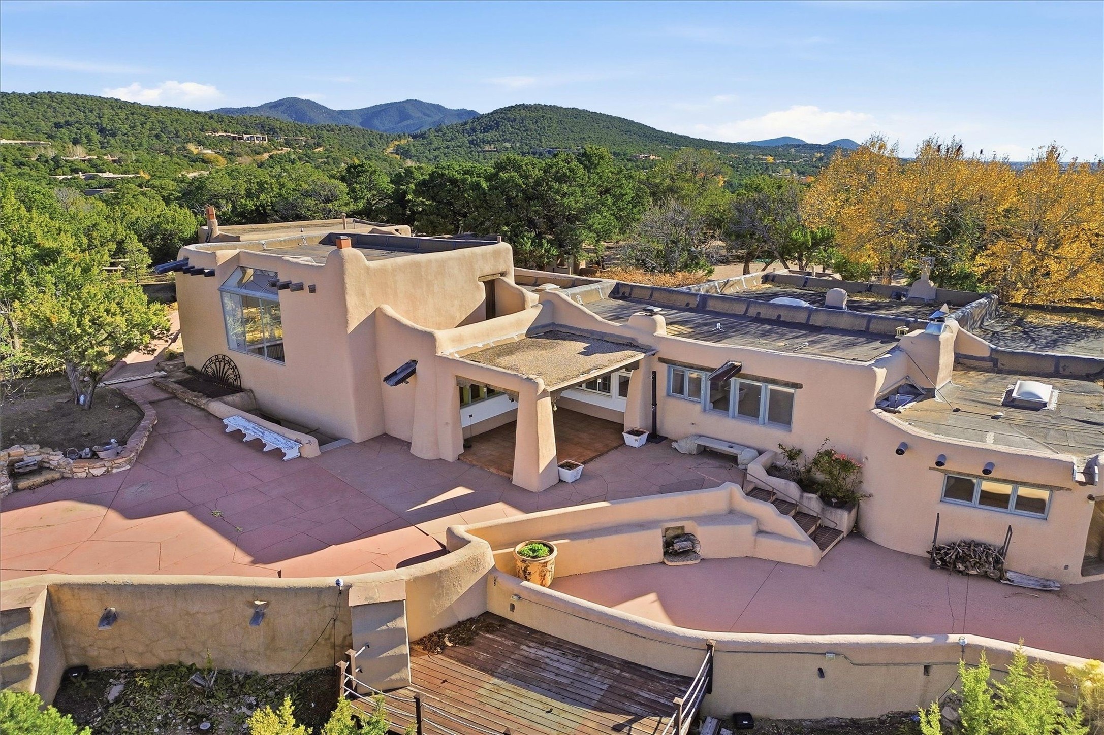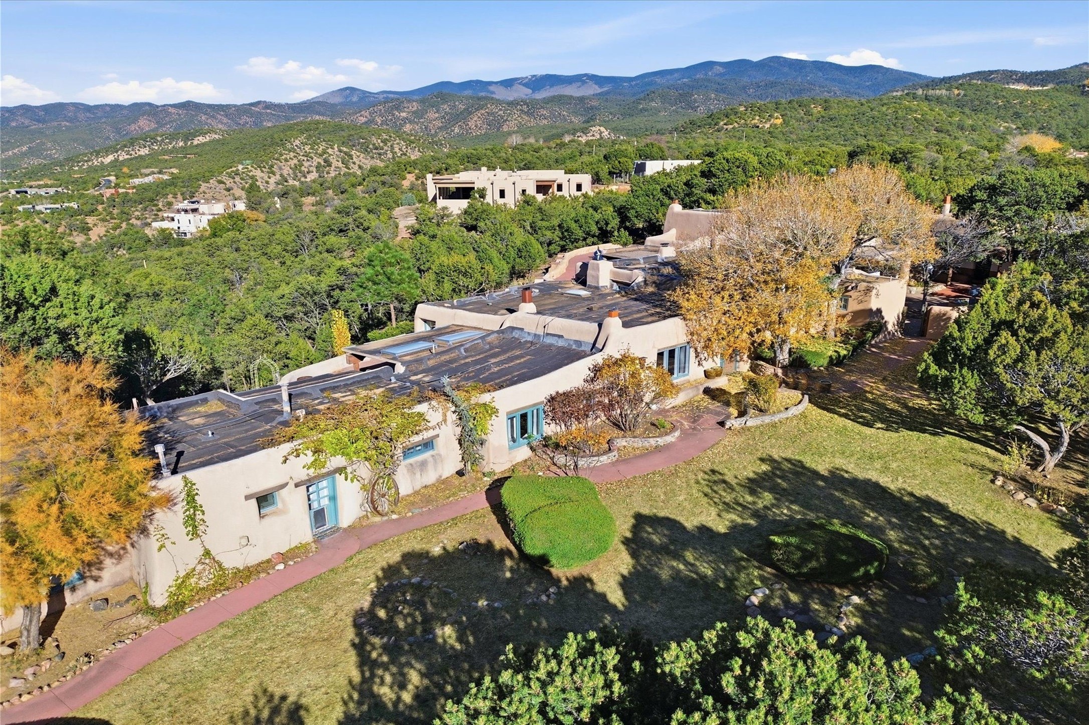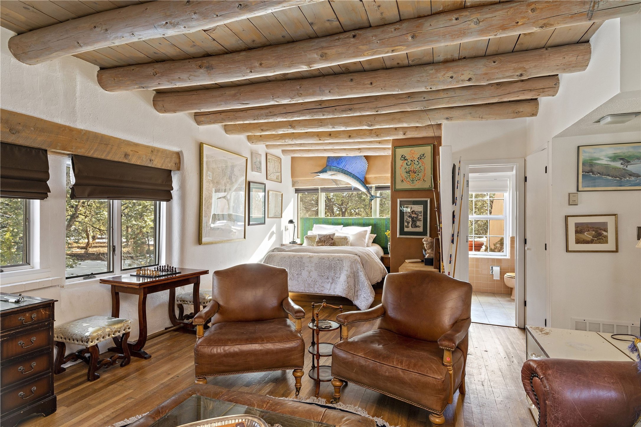 Set atop a private ridgeline with more than seven acres of pristine land, this remarkable residence is both a sanctuary and a celebration of Santa Fe's cultural and architectural heritage. According to prior sellers/listings, this home was designed in the 1920s by John Gaw Meem, one of New Mexico's most influential architects (buyer to verify). The home exemplifies the Spanish Pueblo Revival style that helped define Santa Fe's visual identity. Encompassing over 6,000 square feet, this classic triple-adobe hacienda is rich with craftsmanship and character. Hand-carved wooden doors, more than two centuries old, welcome you into spaces graced with flagstone and oak plank floors, massive vigas, and hand-hewn willow herringbone ceilings--each element adding warmth, texture, and timeless appeal. The main residence offers four bedrooms and four baths, complemented by two charming guest casitas. The bright kitchen features a breakfast nook that opens to multiple patios and courtyards, perfect for dining al fresco while taking in the far-reaching mountain views. Distinctive architectural moments define the home: a gracious adobe-arched dining room, coved ceilings, and divided-light windows that fill the interiors with natural light. According to prior sellers/listings, a studio--originally used in the 1930s by artist McHarg (buyer to verify) Davenport of The Rio Grande Painters--serves as a creative retreat with soaring split cedar ceilings, and access to a rooftop viewing area, ideal for sunsets and stargazing. The location is exceptional--completely private yet nearby Santa Fe's historic Plaza, the Santa Fe Opera and approximately 25 minutes to Ski Santa Fe. Disclaimer: Furnished photos are from 2023. Current photos are of unfurnished property. Seller has never resided in home. Property is being sold in AS-IS, in its current condition.