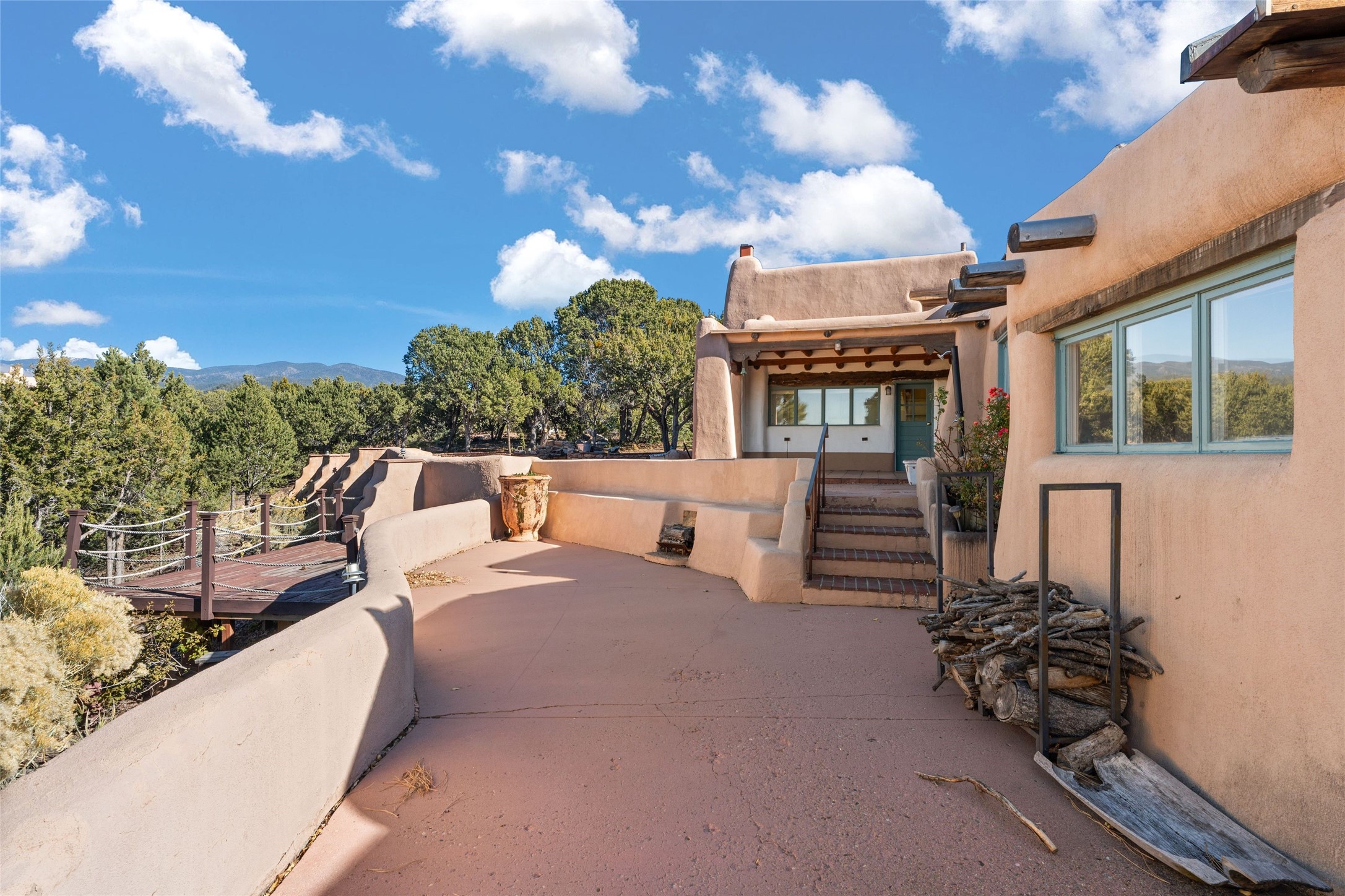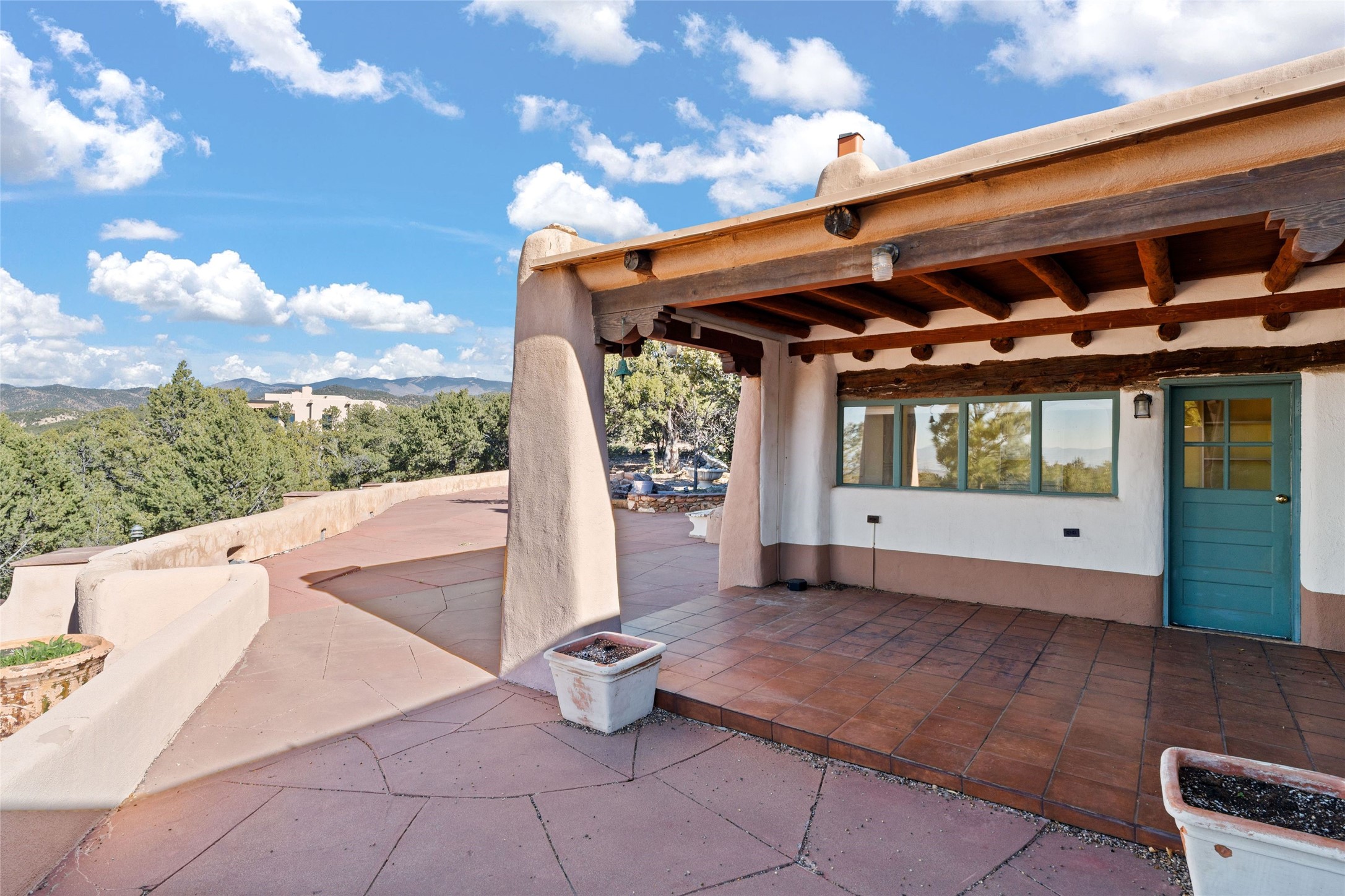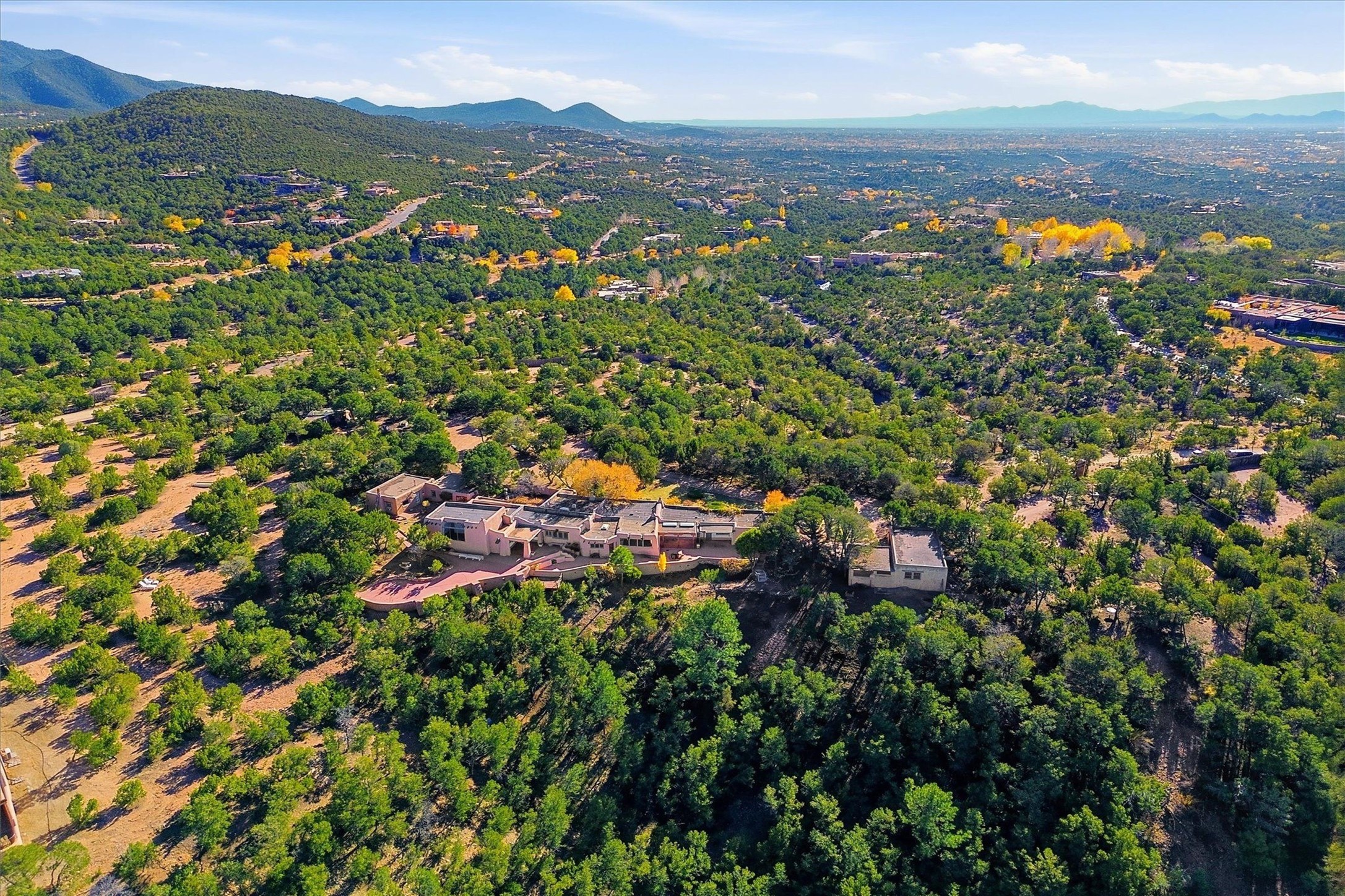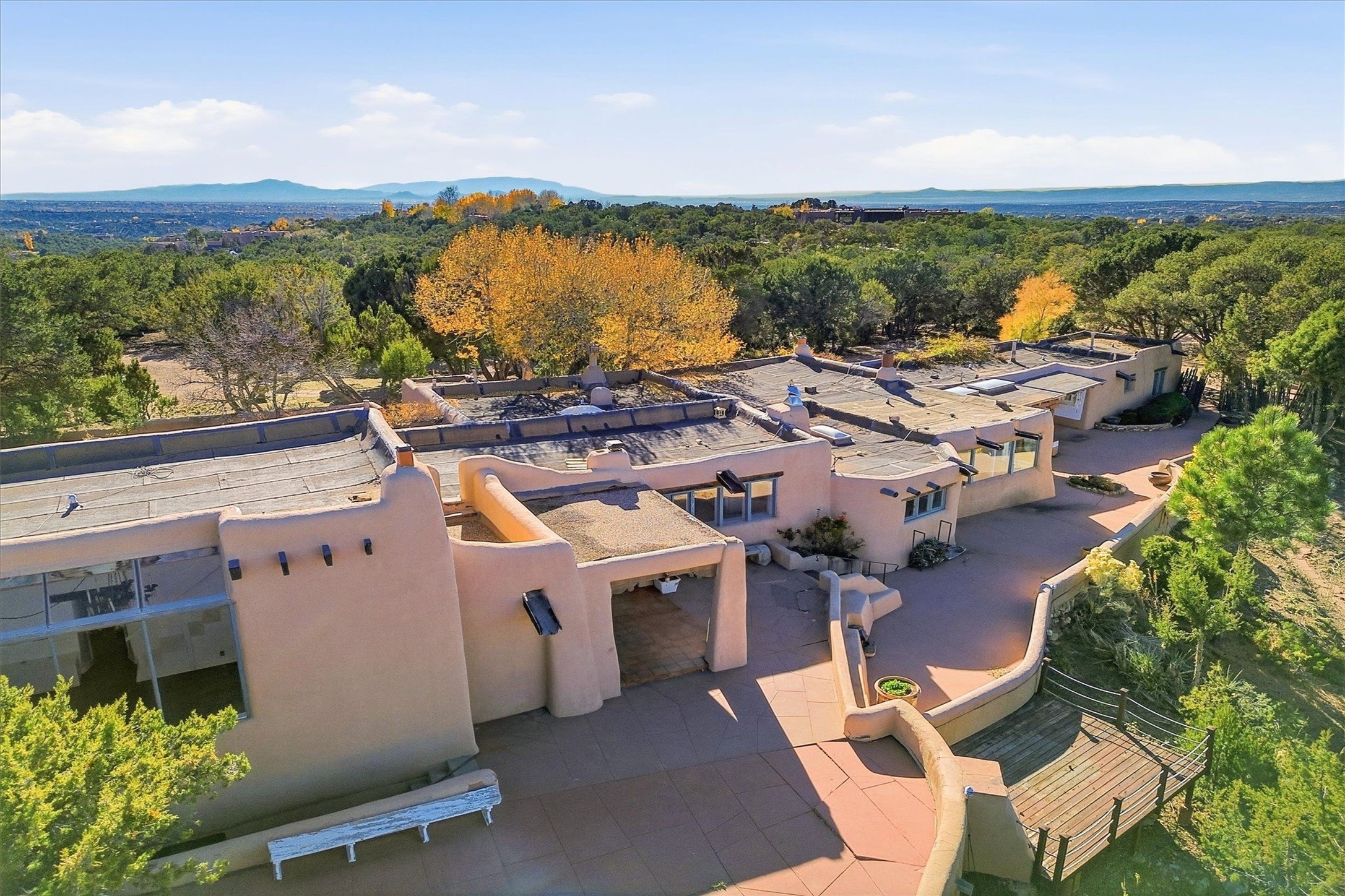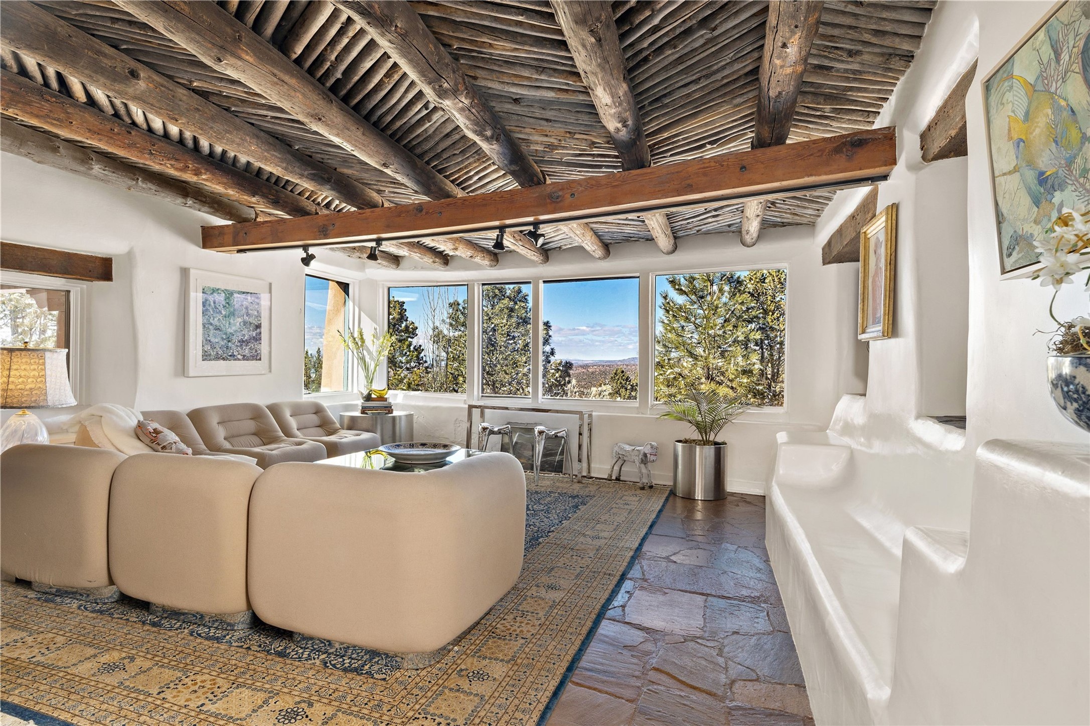 Set atop a private ridgeline with more than seven acres of pristine land, this remarkable residence is both a sanctuary and a celebration of Santa Fe's cultural and architectural heritage. According to prior sellers/listings, this home was designed in the 1920s by John Gaw Meem, one of New Mexico's most influential architects (buyer to verify). The home exemplifies the Spanish Pueblo Revival style that helped define Santa Fe's visual identity. Encompassing over 6,000 square feet, this classic triple-adobe hacienda is rich with craftsmanship and character. Hand-carved wooden doors, more than two centuries old, welcome you into spaces graced with flagstone and oak plank floors, massive vigas, and hand-hewn willow herringbone ceilings--each element adding warmth, texture, and timeless appeal. The main residence offers four bedrooms and four baths, complemented by two charming guest casitas. The bright kitchen features a breakfast nook that opens to multiple patios and courtyards, perfect for dining al fresco while taking in the far-reaching mountain views. Distinctive architectural moments define the home: a gracious adobe-arched dining room, coved ceilings, and divided-light windows that fill the interiors with natural light. According to prior sellers/listings, a studio--originally used in the 1930s by artist McHarg (buyer to verify) Davenport of The Rio Grande Painters--serves as a creative retreat with soaring split cedar ceilings, and access to a rooftop viewing area, ideal for sunsets and stargazing. The location is exceptional--completely private yet nearby Santa Fe's historic Plaza, the Santa Fe Opera and approximately 25 minutes to Ski Santa Fe. Disclaimer: Furnished photos are from 2023. Current photos are of unfurnished property. Seller has never resided in home. Property is being sold in AS-IS, in its current condition.