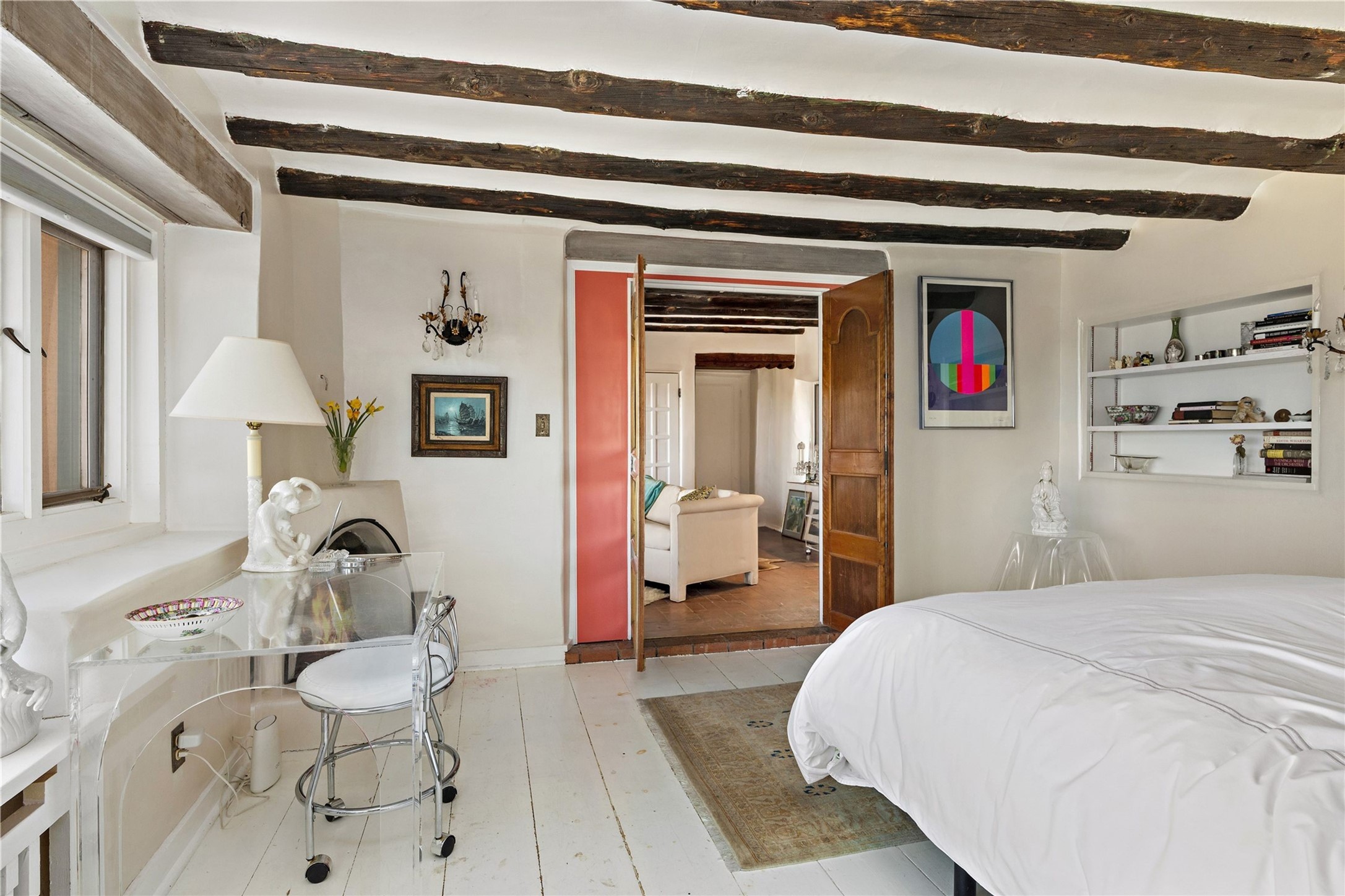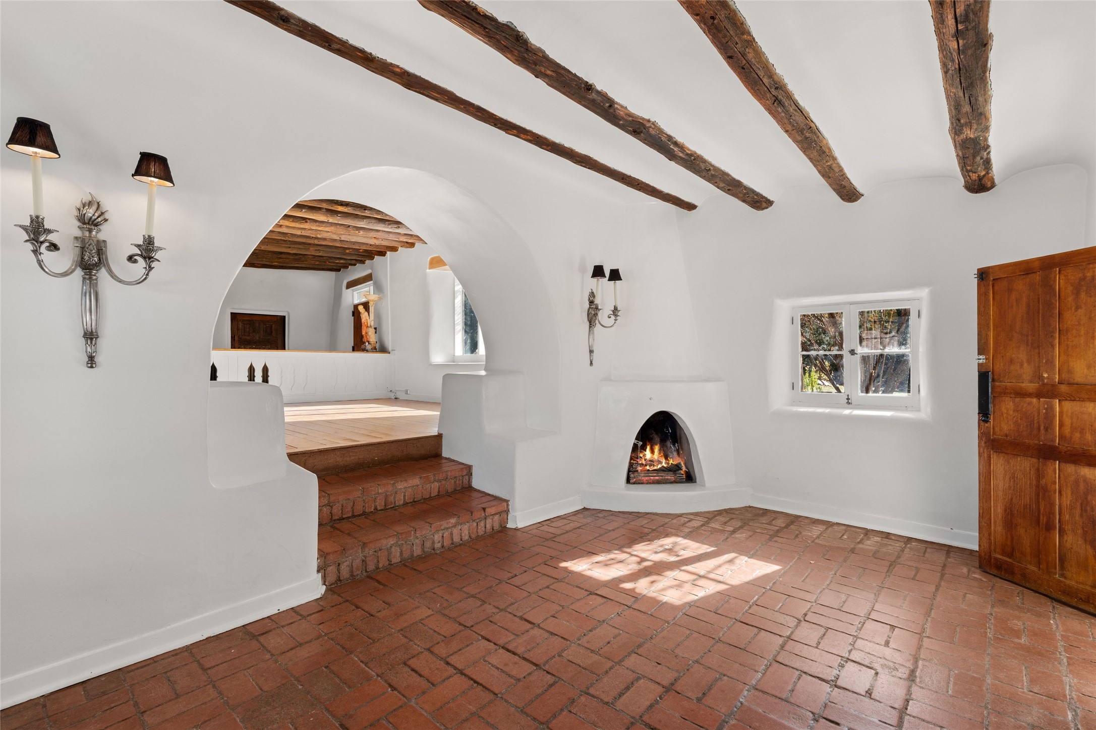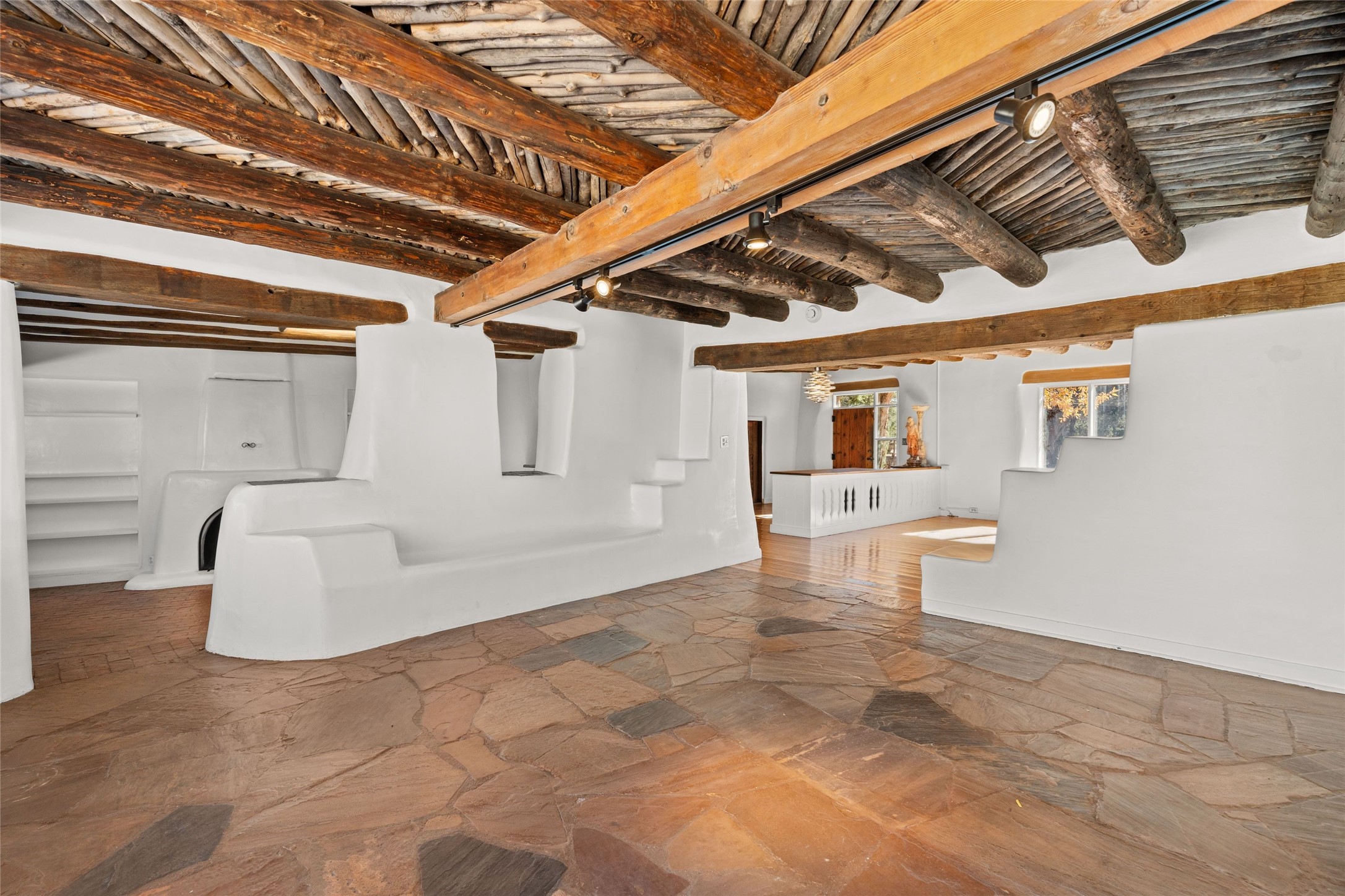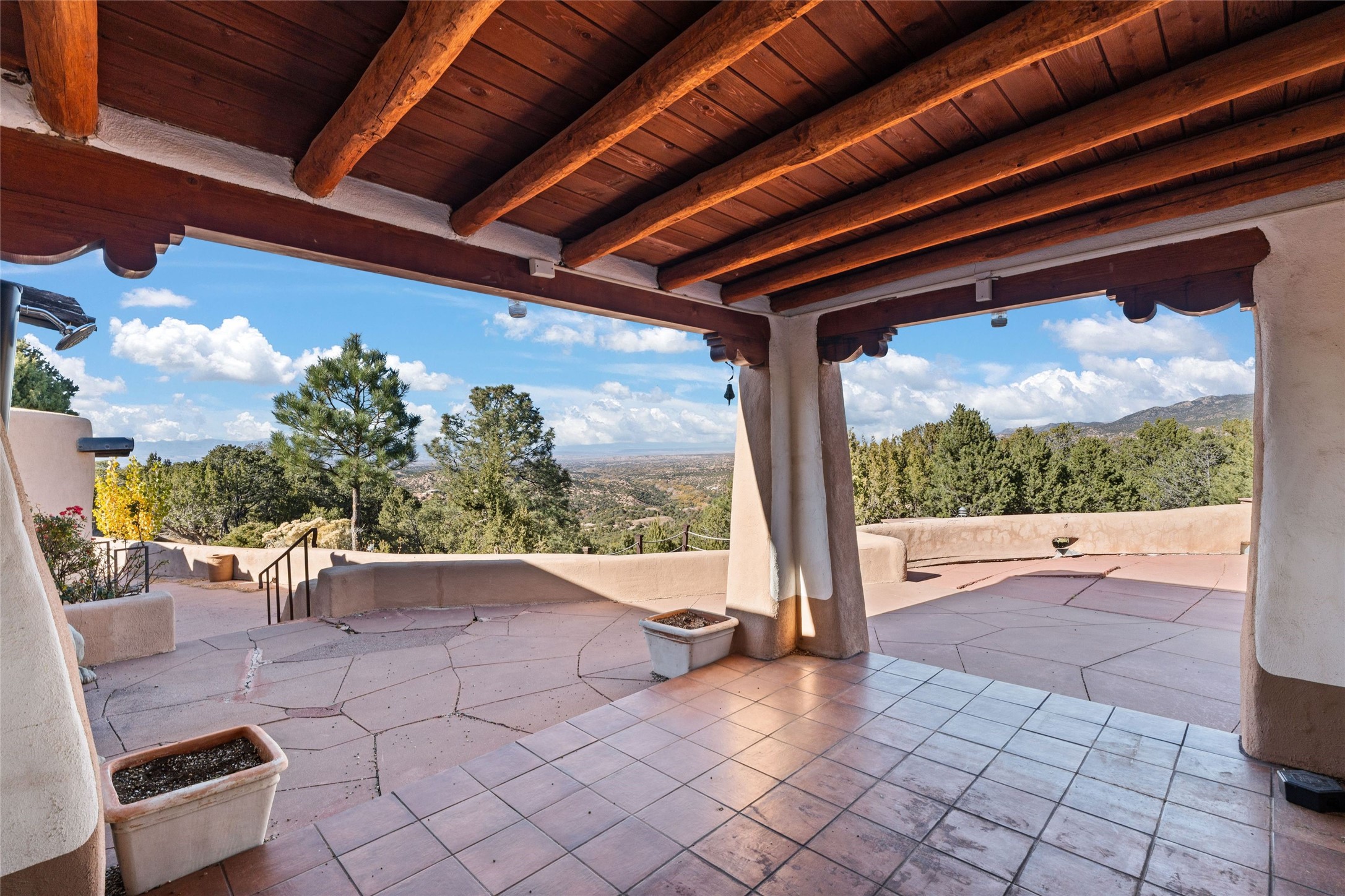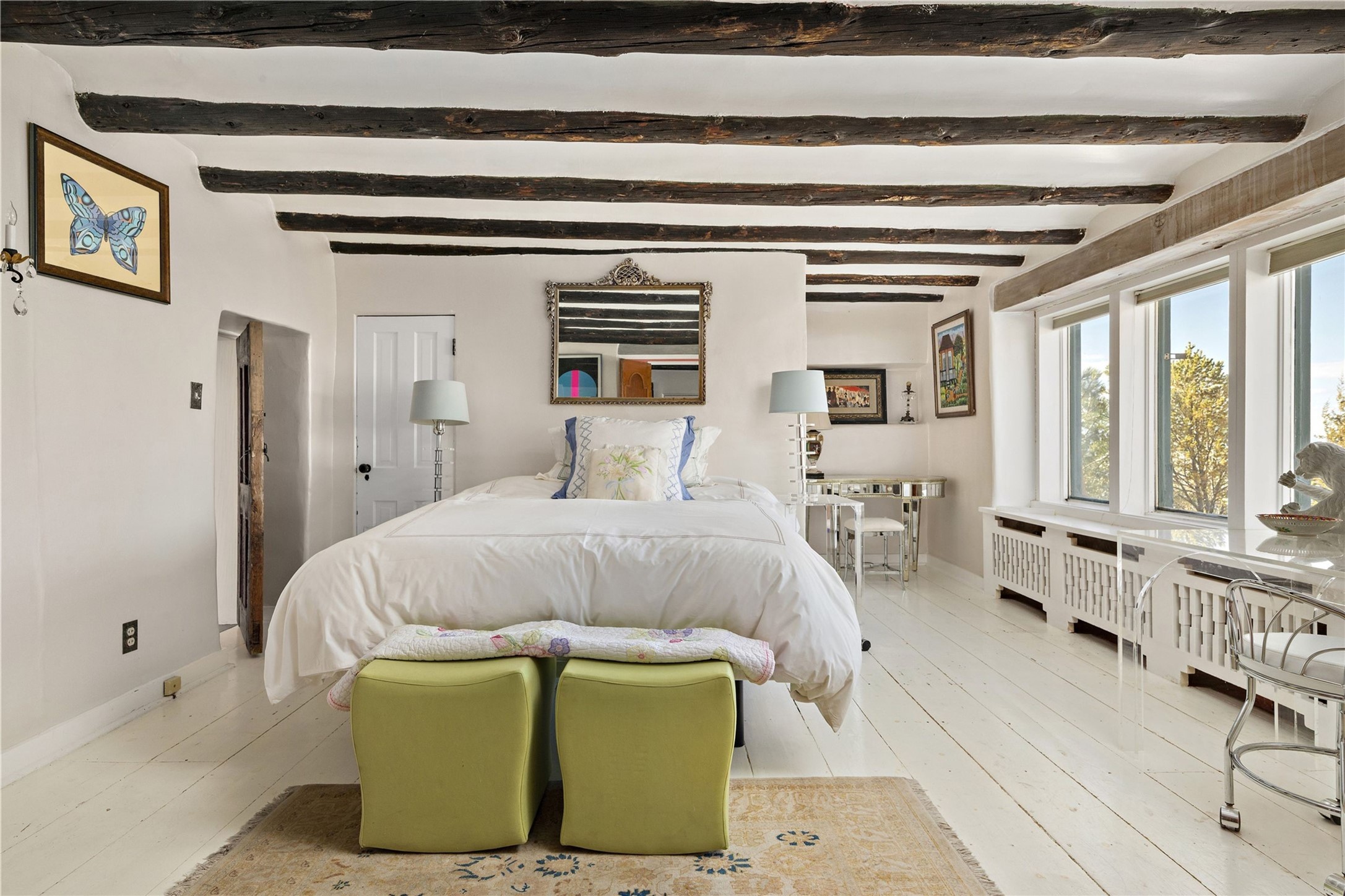 Set atop a private ridgeline with more than seven acres of pristine land, this remarkable residence is both a sanctuary and a celebration of Santa Fe's cultural and architectural heritage. According to prior sellers/listings, this home was designed in the 1920s by John Gaw Meem, one of New Mexico's most influential architects (buyer to verify). The home exemplifies the Spanish Pueblo Revival style that helped define Santa Fe's visual identity. Encompassing over 6,000 square feet, this classic triple-adobe hacienda is rich with craftsmanship and character. Hand-carved wooden doors, more than two centuries old, welcome you into spaces graced with flagstone and oak plank floors, massive vigas, and hand-hewn willow herringbone ceilings--each element adding warmth, texture, and timeless appeal. The main residence offers four bedrooms and four baths, complemented by two charming guest casitas. The bright kitchen features a breakfast nook that opens to multiple patios and courtyards, perfect for dining al fresco while taking in the far-reaching mountain views. Distinctive architectural moments define the home: a gracious adobe-arched dining room, coved ceilings, and divided-light windows that fill the interiors with natural light. According to prior sellers/listings, a studio--originally used in the 1930s by artist McHarg (buyer to verify) Davenport of The Rio Grande Painters--serves as a creative retreat with soaring split cedar ceilings, and access to a rooftop viewing area, ideal for sunsets and stargazing. The location is exceptional--completely private yet nearby Santa Fe's historic Plaza, the Santa Fe Opera and approximately 25 minutes to Ski Santa Fe. Disclaimer: Furnished photos are from 2023. Current photos are of unfurnished property. Seller has never resided in home. Property is being sold in AS-IS, in its current condition.
