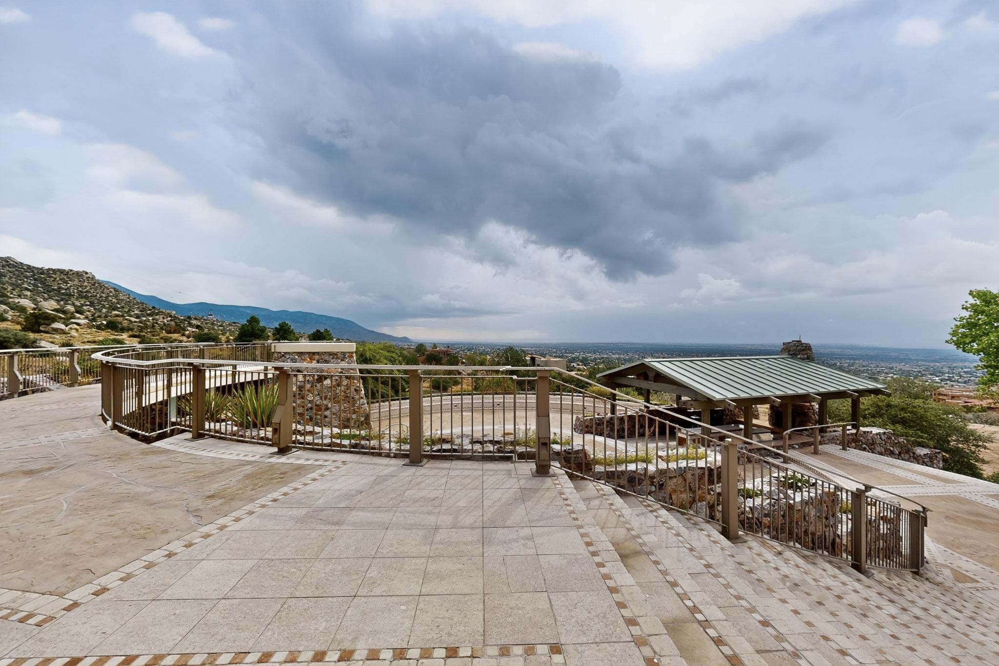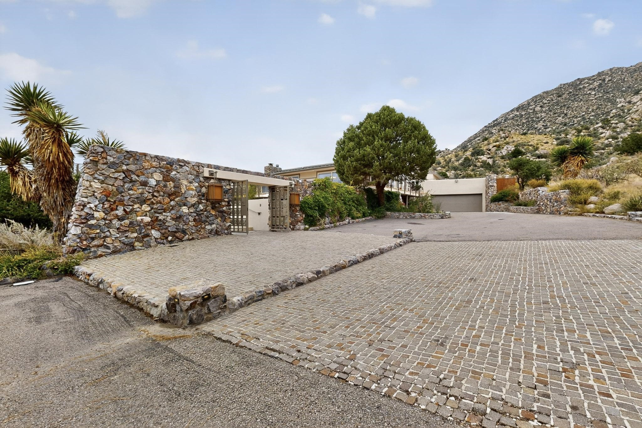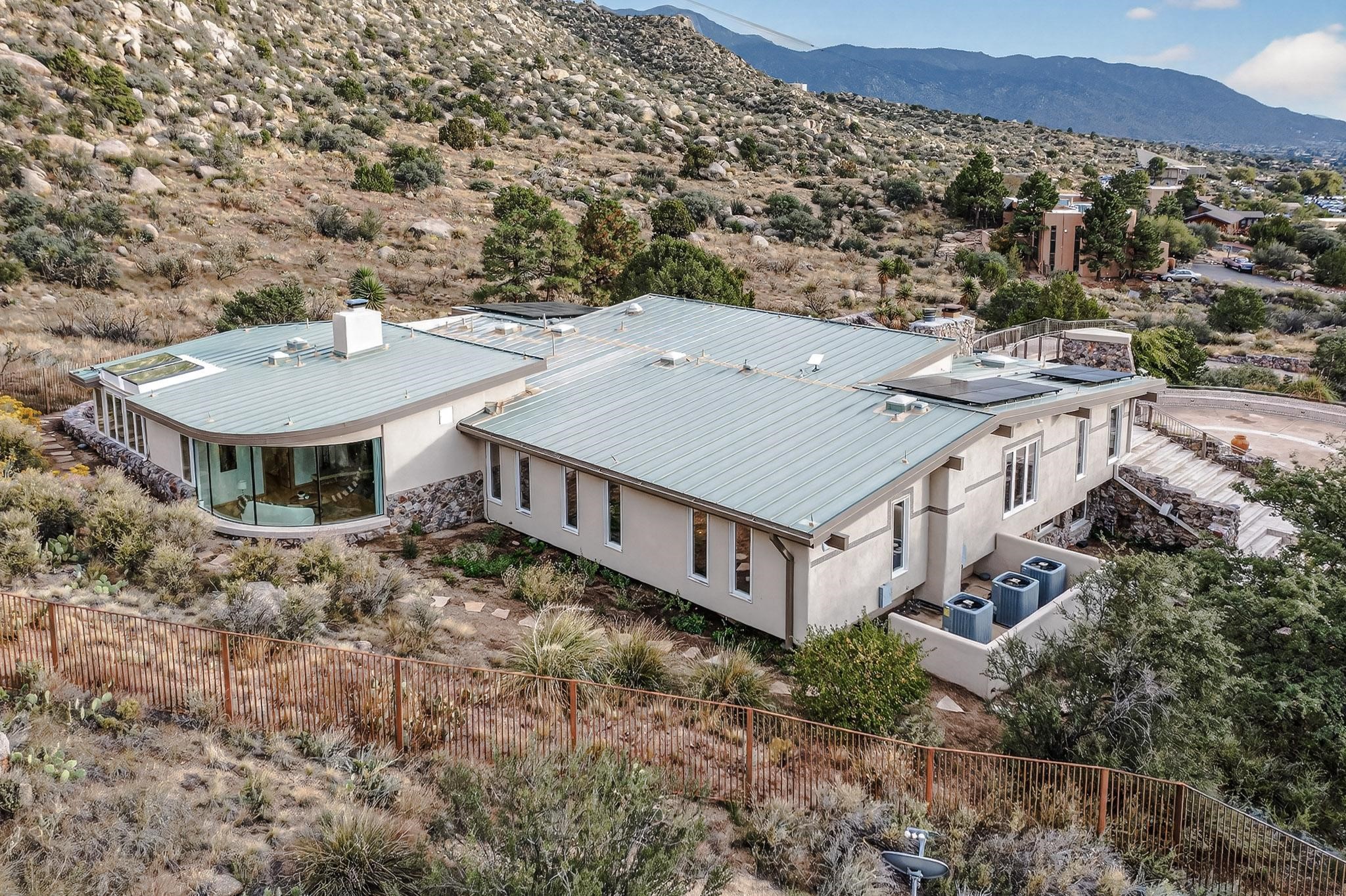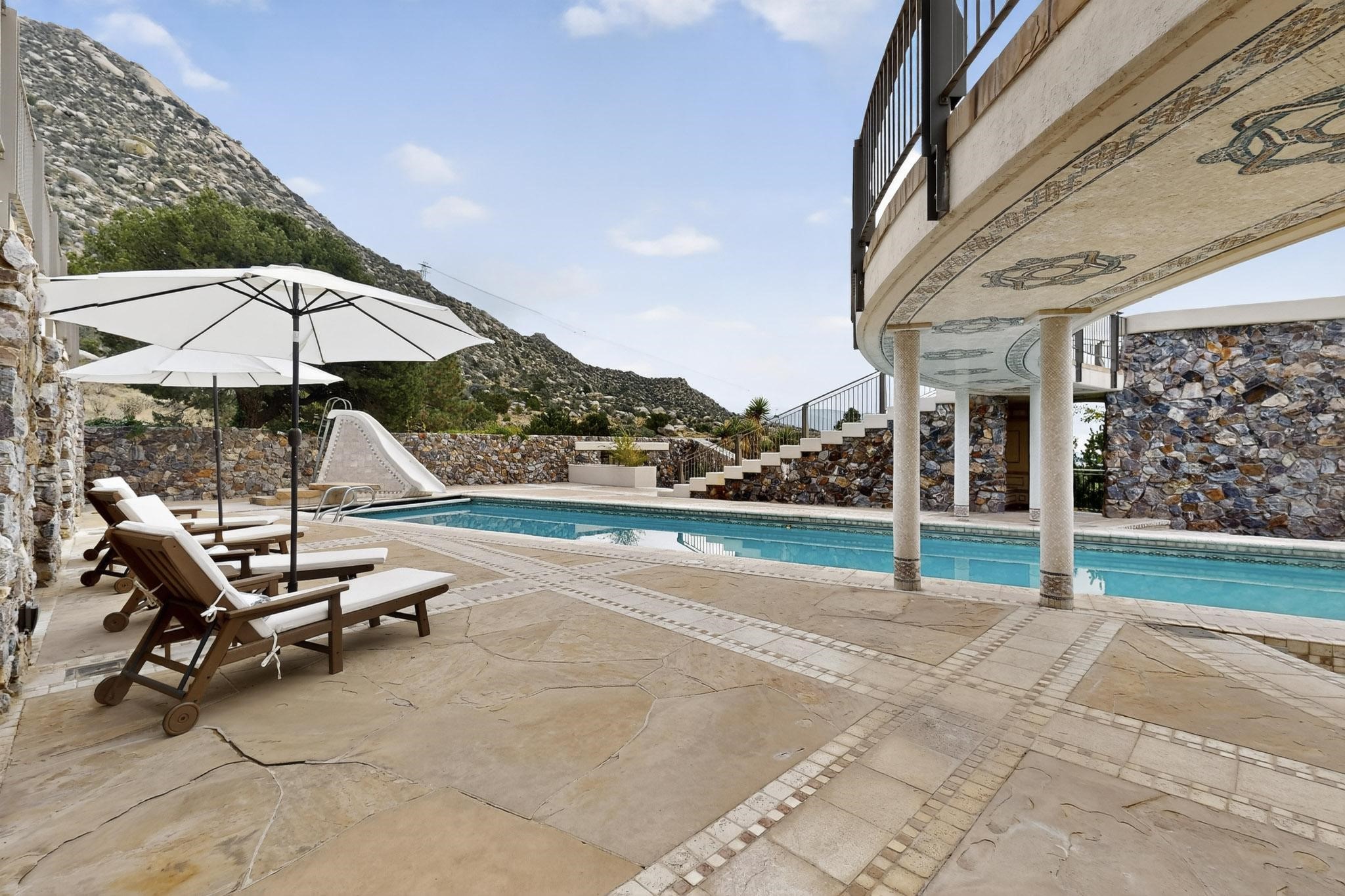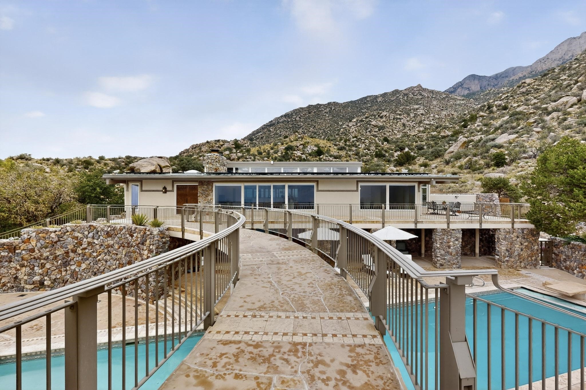 Elevate your lifestyle in this ''one-of-a-kind'' ABQ Dream Home! This authentic and refined mid-century modern home sits on an elevated double lot with 1.87 acres backing the Sandia mountains, bordering the Cibola National Forest and embodies the best of Albuquerque living. Expansive walls of glass frame breathtaking, unobstructed views of the mountains, vibrant sunsets, glittering city lights, starry nights, distant storms, and wildlife crossings. A stunning bridge and covered patio adorned by mosaic-tile cross over the shimmering pool leading to a massive outdoor covered cooking area with granite island, built in seating, and woodburning fireplace, creating a perfect blend of balance of timeless design and luxury living. Designed for both intimate gatherings and grand entertainment, this estate provides spacious living and dining areas filled with an abundance of natural light, 3 indoor woodburning fireplaces, hardwood finishes, large bedrooms, an office and primary suite with two water closets, custom wardrobes, exercise room and a steam shower. Outdoors, a resort-style retreat unfolds with two fully equipped outdoor cooking spaces, a fabulous 14x60 sparkling pool with a water slide, flagstone patios, rock walls, dramatic stairways, and a relaxing hot tub outside the primary bedroom beneath the star lit skies. Inside the lower-level game room boasts a family room with TV projector and retractable screen, pool bath, and cocktail lounge area that open to the pool and expansive deck area, creating the ultimate entertainment hub. With an $85k seller owned solar system, custom details throughout, and a versatile floor plan, this residence delivers a lifestyle of luxury, privacy, and unparalleled scenery- from sunrise over the Sandias to glittering city lights at night.