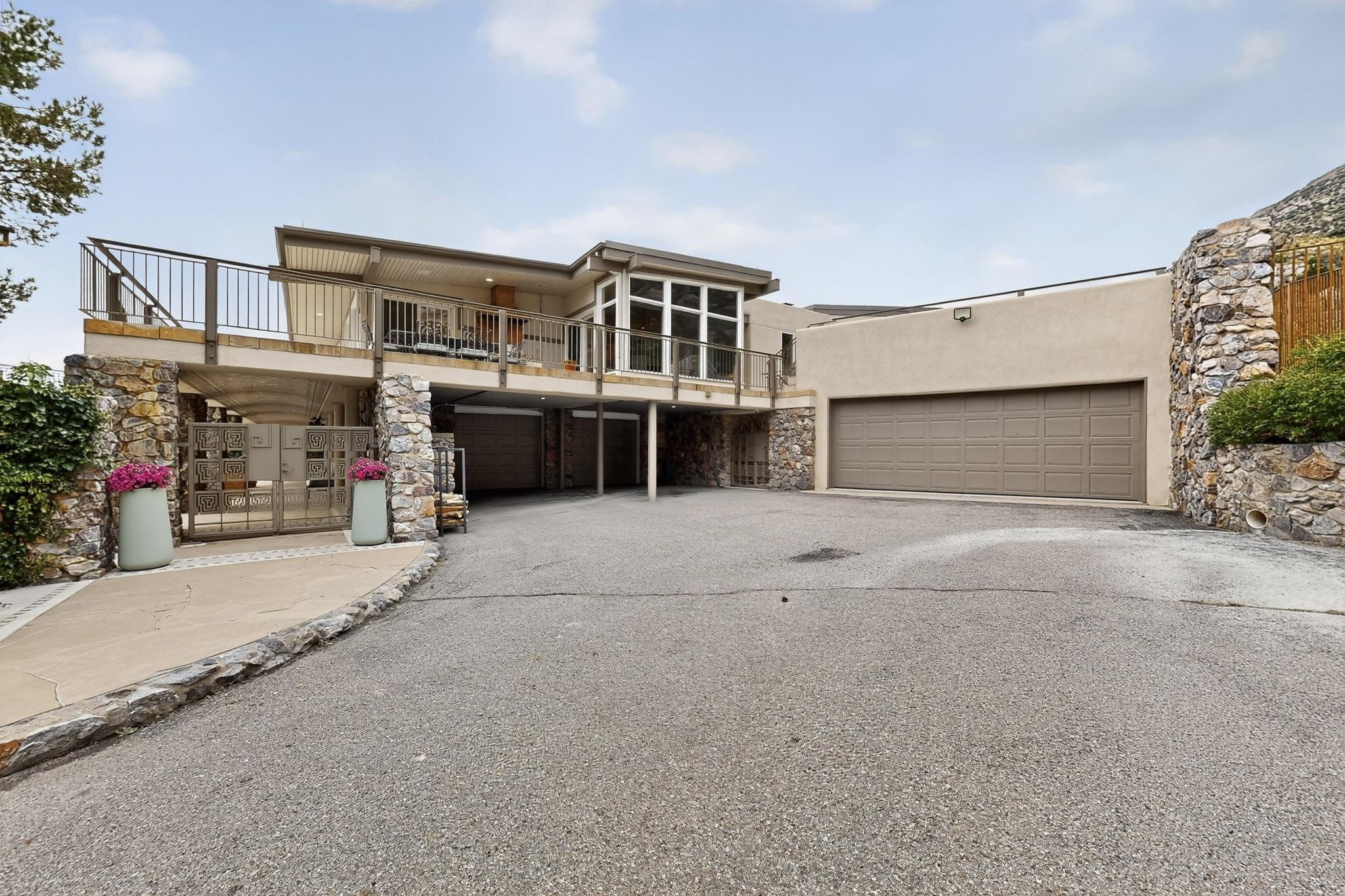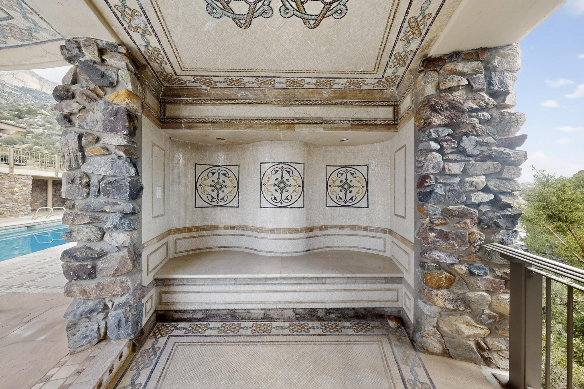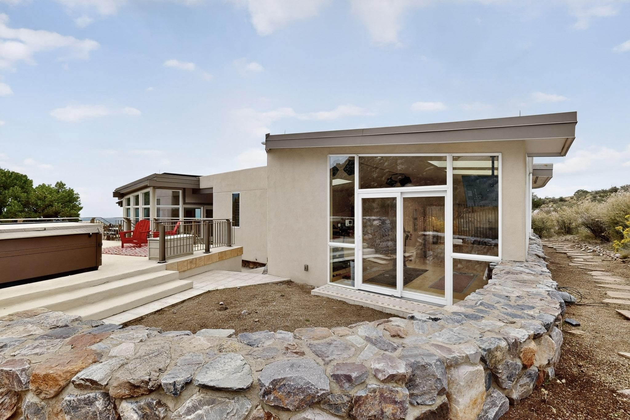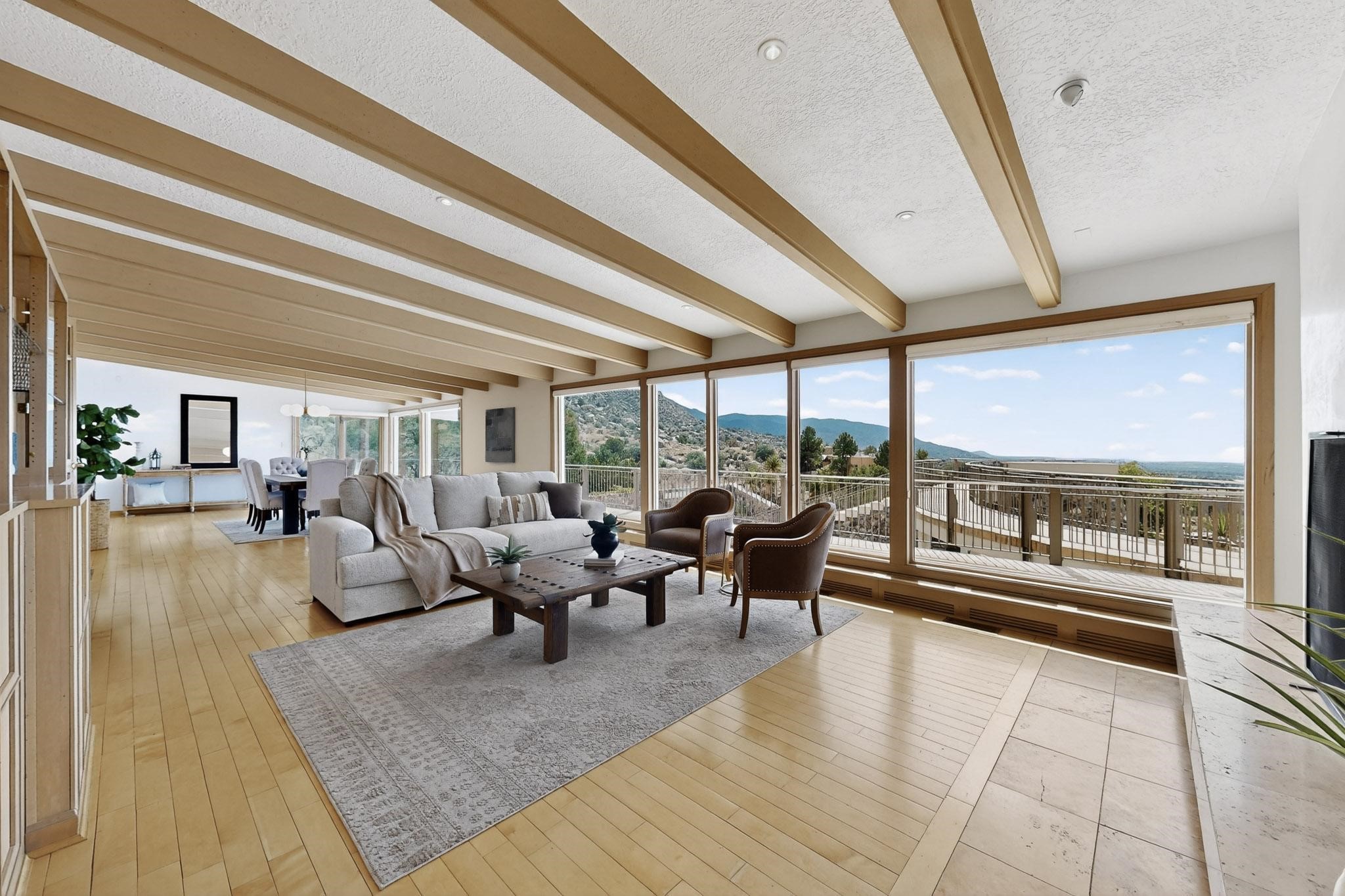 Elevate your lifestyle in this ''one-of-a-kind'' ABQ Dream Home! This authentic and refined mid-century modern home sits on an elevated double lot with 1.87 acres backing the Sandia mountains, bordering the Cibola National Forest and embodies the best of Albuquerque living. Expansive walls of glass frame breathtaking, unobstructed views of the mountains, vibrant sunsets, glittering city lights, starry nights, distant storms, and wildlife crossings. A stunning bridge and covered patio adorned by mosaic-tile cross over the shimmering pool leading to a massive outdoor covered cooking area with granite island, built in seating, and woodburning fireplace, creating a perfect blend of balance of timeless design and luxury living. Designed for both intimate gatherings and grand entertainment, this estate provides spacious living and dining areas filled with an abundance of natural light, 3 indoor woodburning fireplaces, hardwood finishes, large bedrooms, an office and primary suite with two water closets, custom wardrobes, exercise room and a steam shower. Outdoors, a resort-style retreat unfolds with two fully equipped outdoor cooking spaces, a fabulous 14x60 sparkling pool with a water slide, flagstone patios, rock walls, dramatic stairways, and a relaxing hot tub outside the primary bedroom beneath the star lit skies. Inside the lower-level game room boasts a family room with TV projector and retractable screen, pool bath, and cocktail lounge area that open to the pool and expansive deck area, creating the ultimate entertainment hub. With an $85k seller owned solar system, custom details throughout, and a versatile floor plan, this residence delivers a lifestyle of luxury, privacy, and unparalleled scenery- from sunrise over the Sandias to glittering city lights at night.