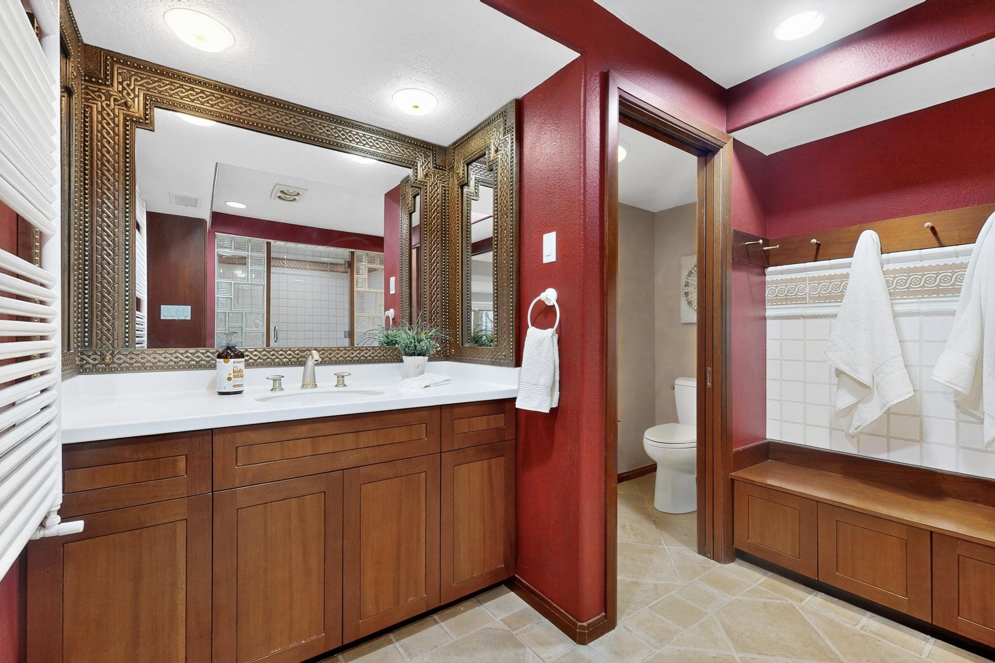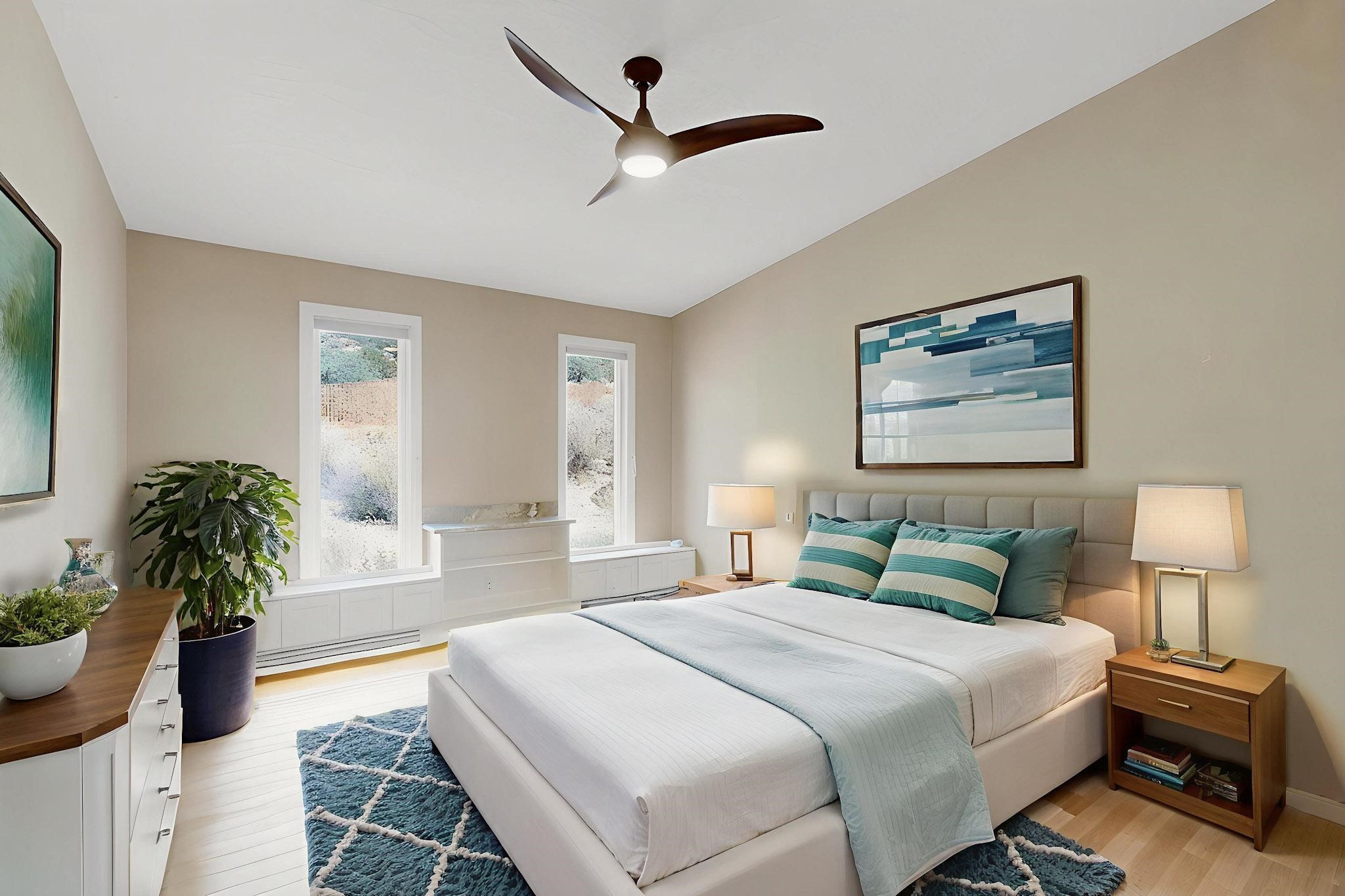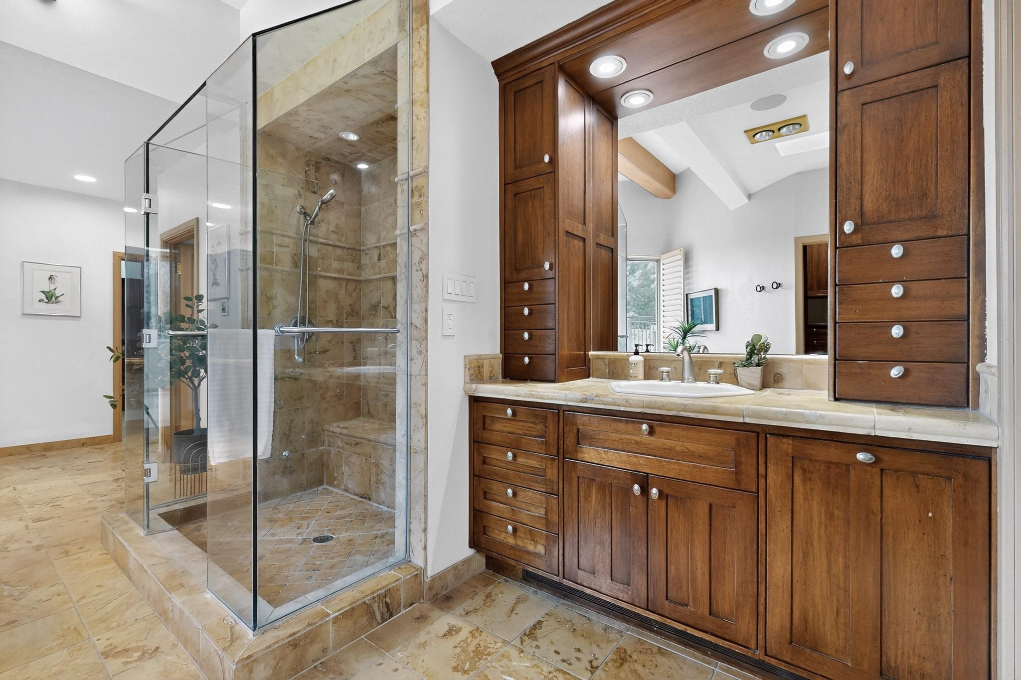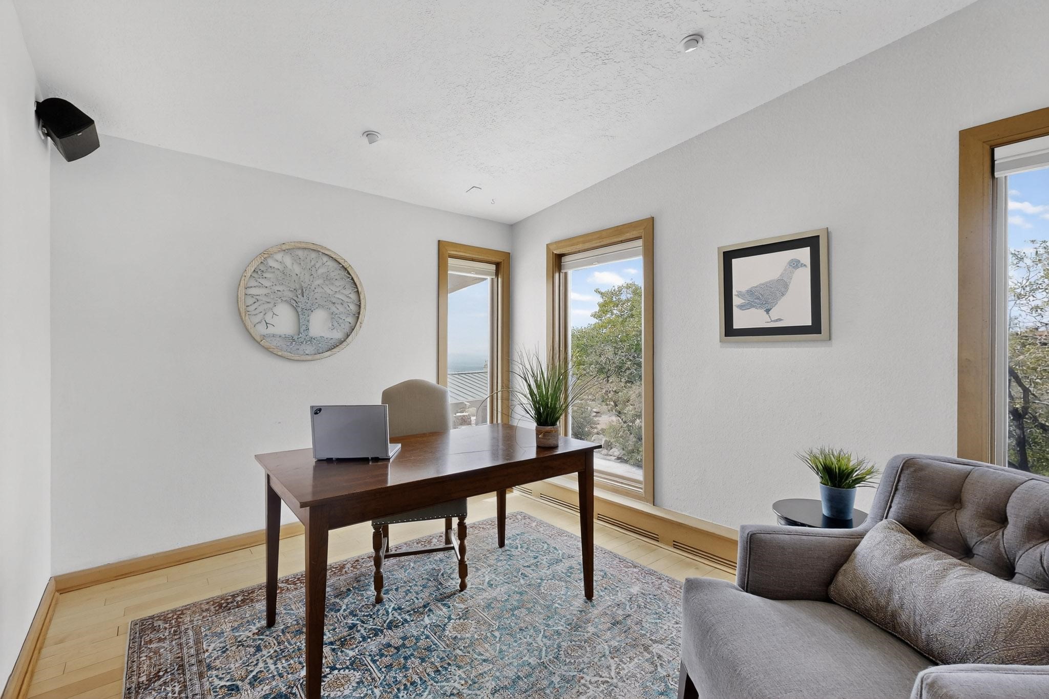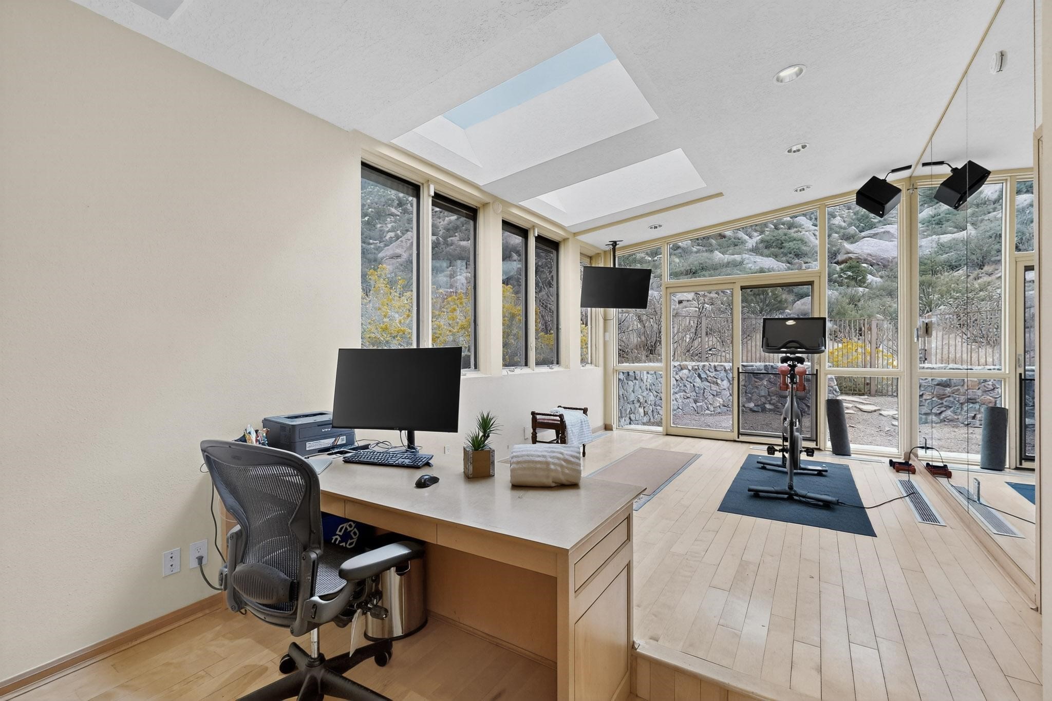 Elevate your lifestyle in this ''one-of-a-kind'' ABQ Dream Home! This authentic and refined mid-century modern home sits on an elevated double lot with 1.87 acres backing the Sandia mountains, bordering the Cibola National Forest and embodies the best of Albuquerque living. Expansive walls of glass frame breathtaking, unobstructed views of the mountains, vibrant sunsets, glittering city lights, starry nights, distant storms, and wildlife crossings. A stunning bridge and covered patio adorned by mosaic-tile cross over the shimmering pool leading to a massive outdoor covered cooking area with granite island, built in seating, and woodburning fireplace, creating a perfect blend of balance of timeless design and luxury living. Designed for both intimate gatherings and grand entertainment, this estate provides spacious living and dining areas filled with an abundance of natural light, 3 indoor woodburning fireplaces, hardwood finishes, large bedrooms, an office and primary suite with two water closets, custom wardrobes, exercise room and a steam shower. Outdoors, a resort-style retreat unfolds with two fully equipped outdoor cooking spaces, a fabulous 14x60 sparkling pool with a water slide, flagstone patios, rock walls, dramatic stairways, and a relaxing hot tub outside the primary bedroom beneath the star lit skies. Inside the lower-level game room boasts a family room with TV projector and retractable screen, pool bath, and cocktail lounge area that open to the pool and expansive deck area, creating the ultimate entertainment hub. With an $85k seller owned solar system, custom details throughout, and a versatile floor plan, this residence delivers a lifestyle of luxury, privacy, and unparalleled scenery- from sunrise over the Sandias to glittering city lights at night.