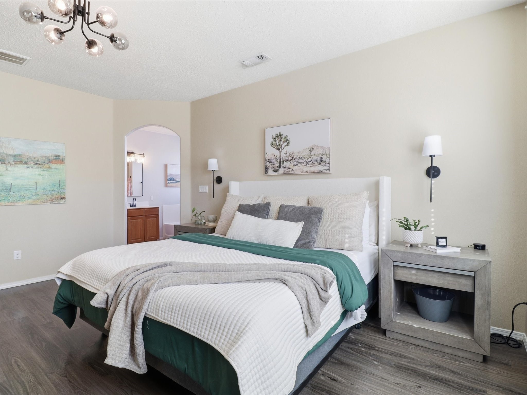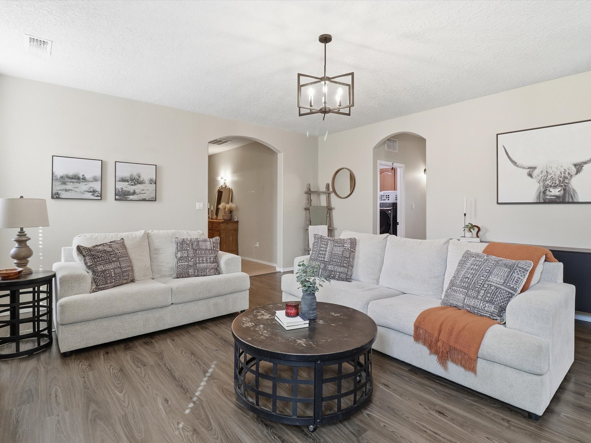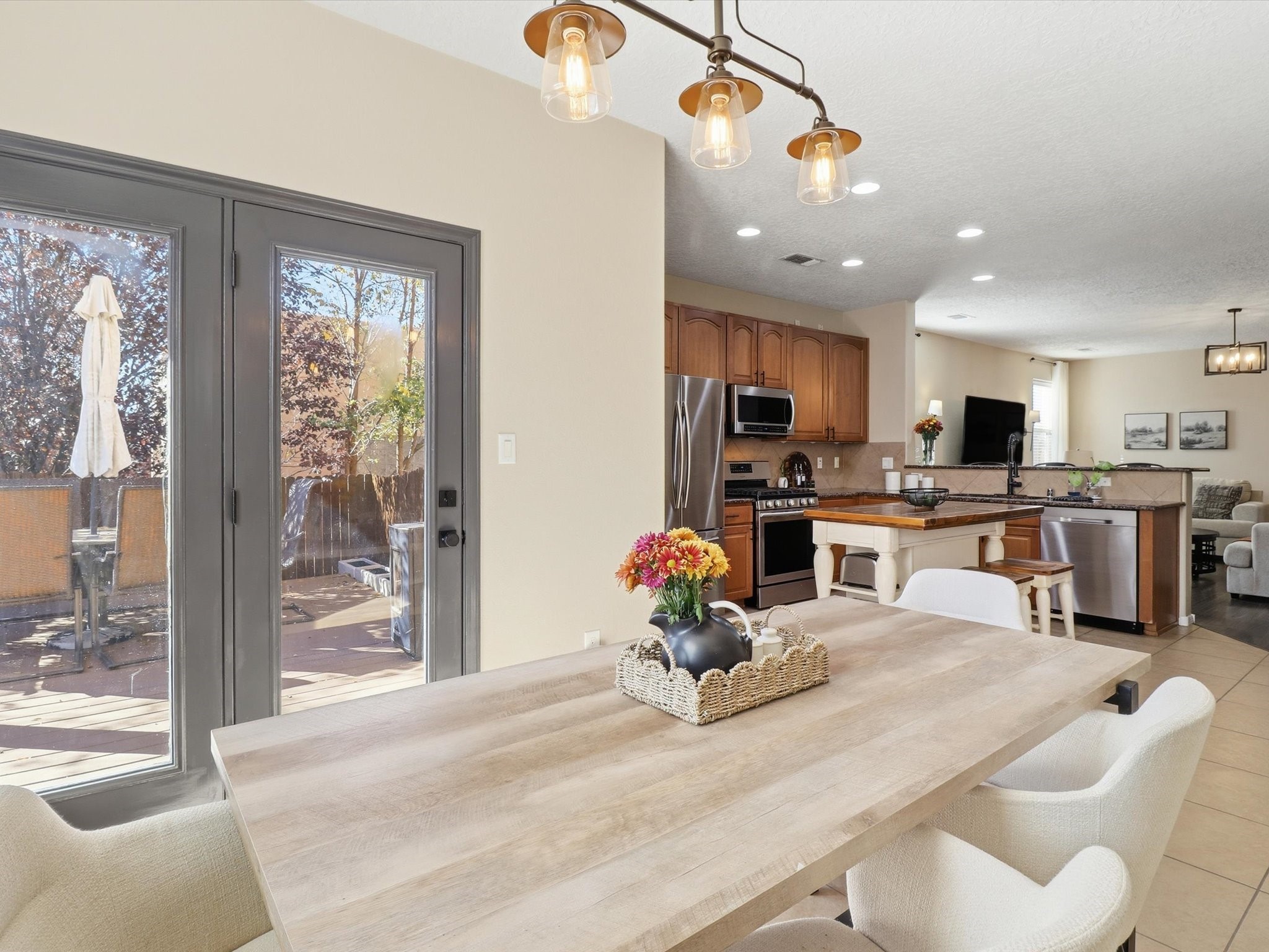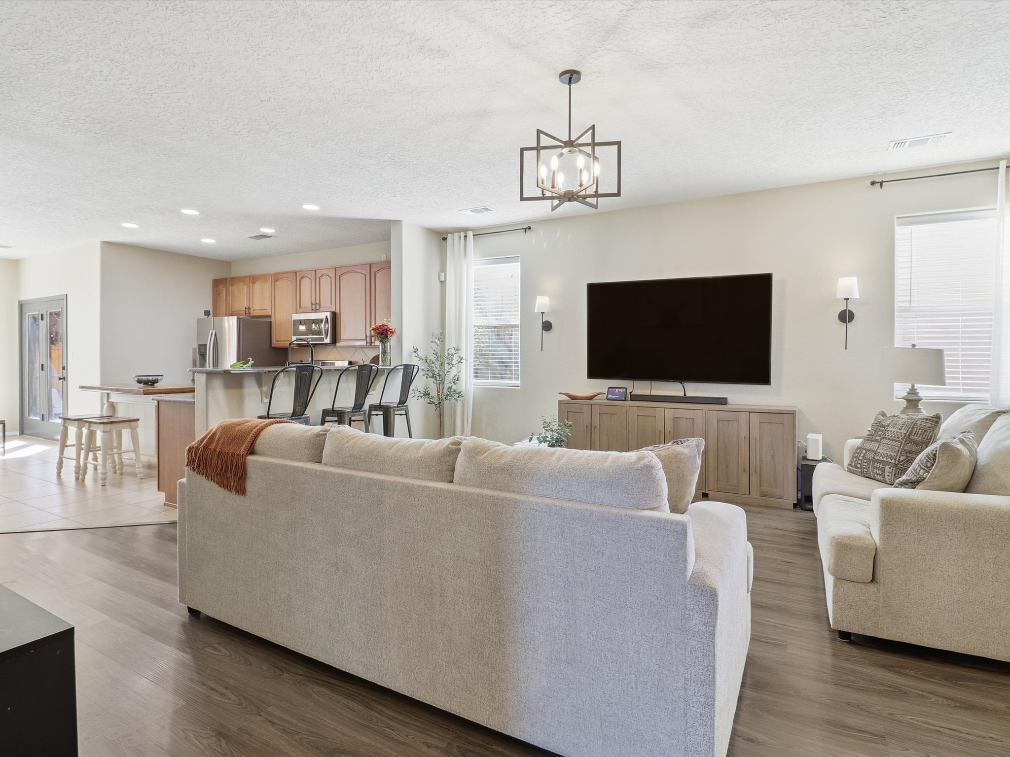 Experience true Santa Fe living in the sought-after Villa Sonata community--ideally located minutes from I-25 and the vibrant Plaza! This former model home shines with thoughtful upgrades and modern style. Enjoy added privacy with open space on one side, plus major updates: new spray foam roof (2019), stucco (2020), furnace, refrigerated air, water heater (all 2024), carpet and engineered wood floors (2022). The open-concept kitchen boasts a center island, stainless steel appliances, walk-in pantry, and bar seating. Spacious bedrooms include a primary suite with dual sinks, soaking tub, separate shower, and private water closet. With updated hardware, lighting, a finished garage, gutters w/ rain barrel, and a large synthetic wood patio--this home is move-in ready and made for easy living!