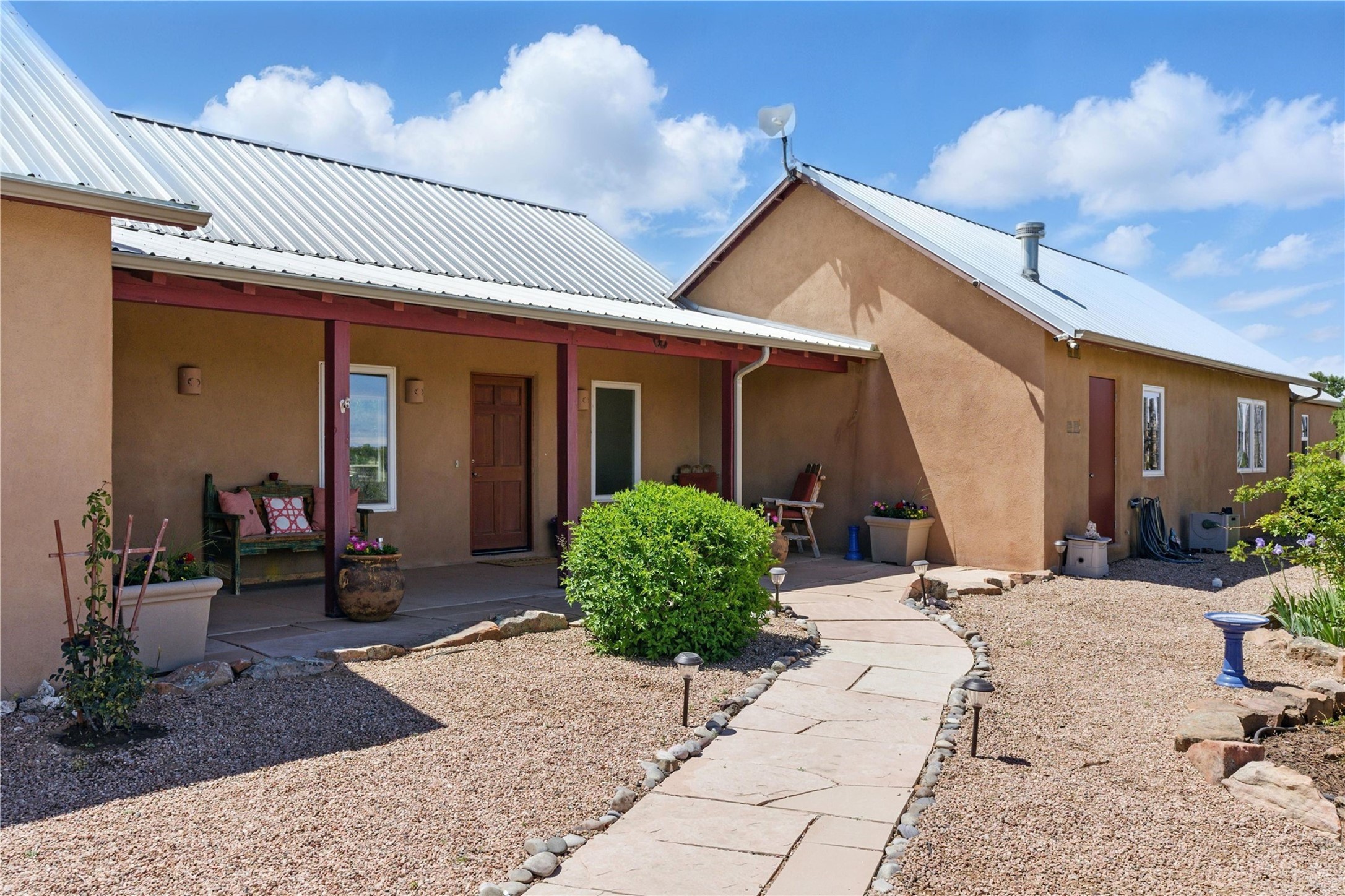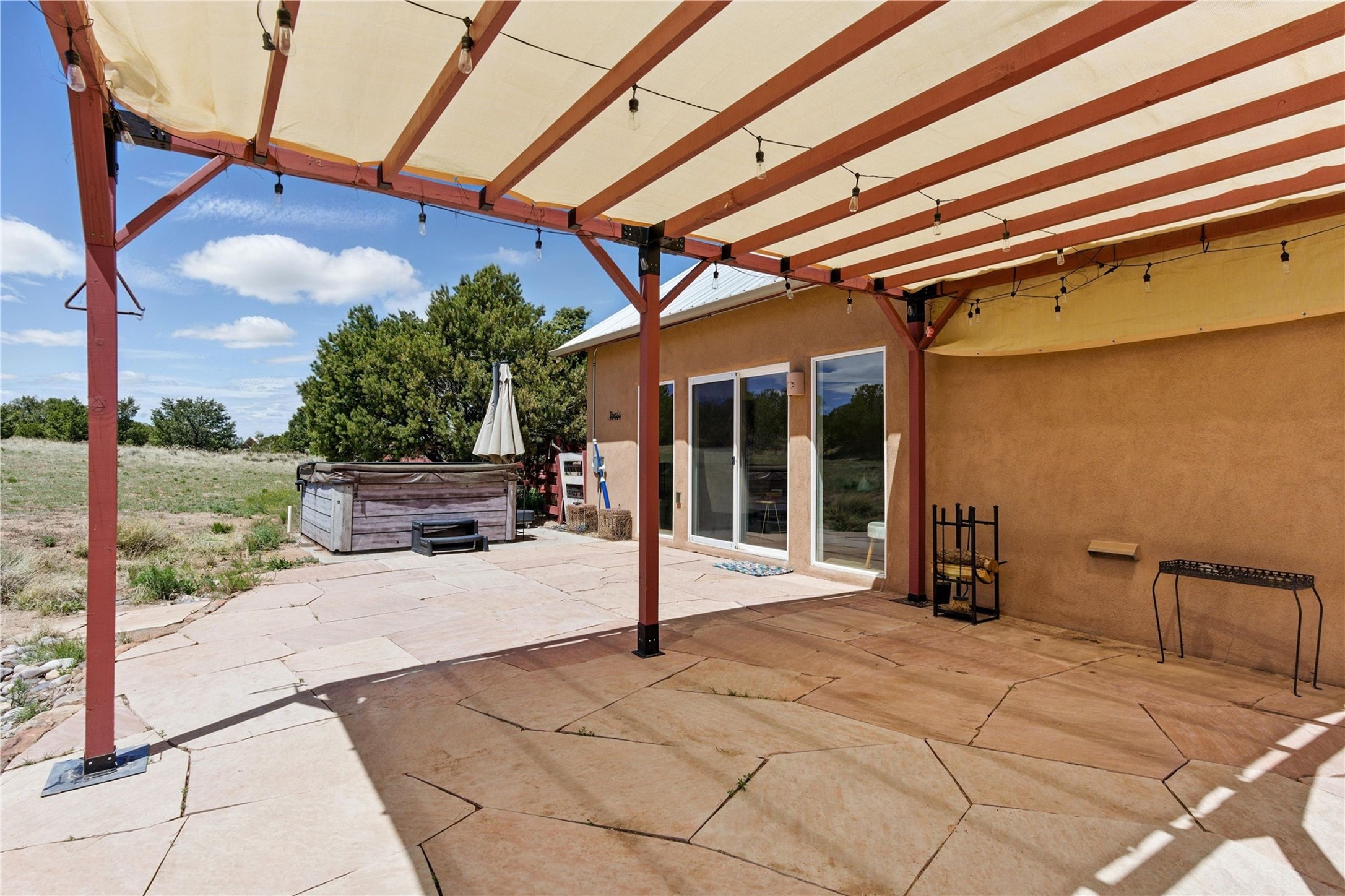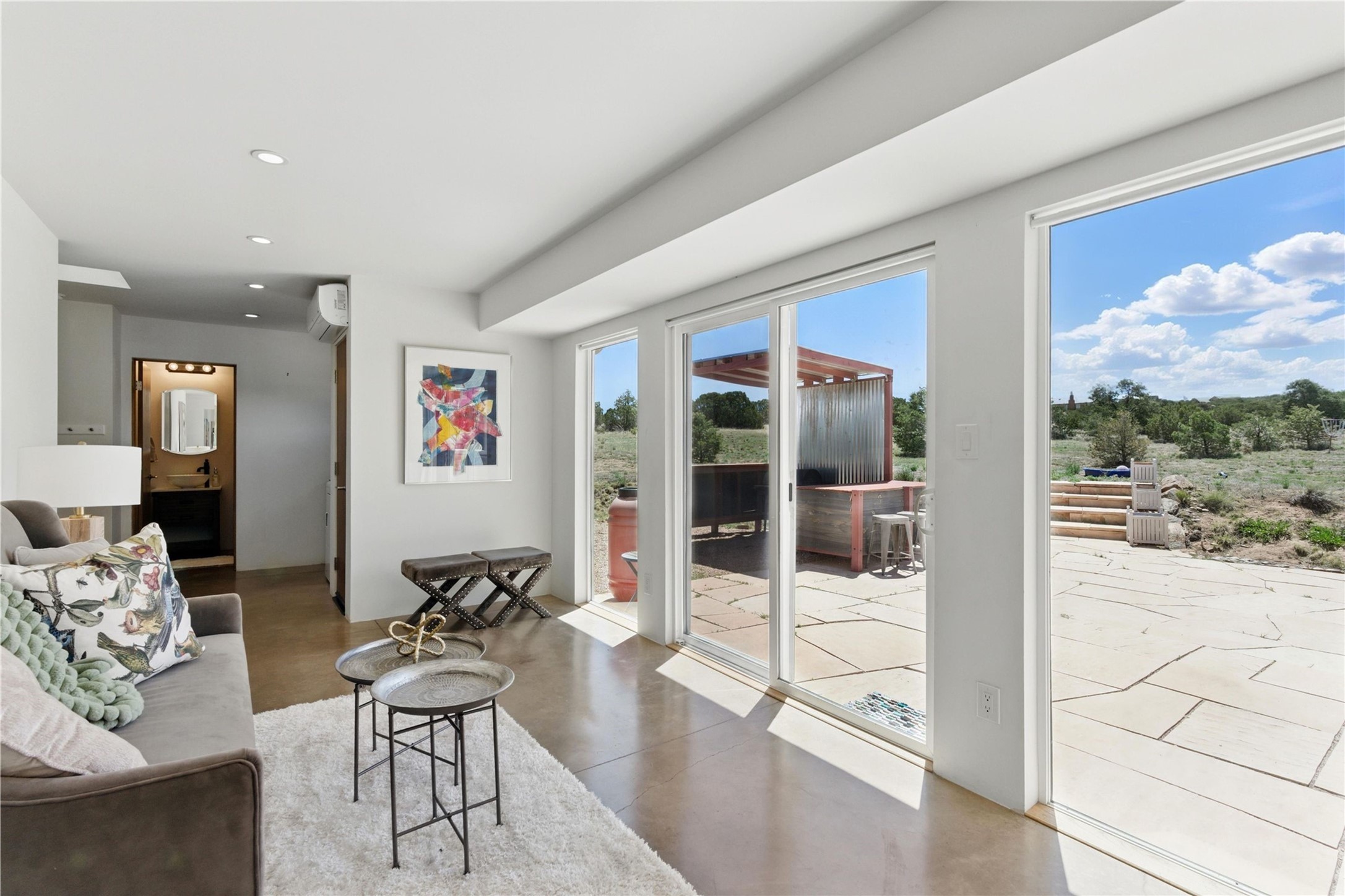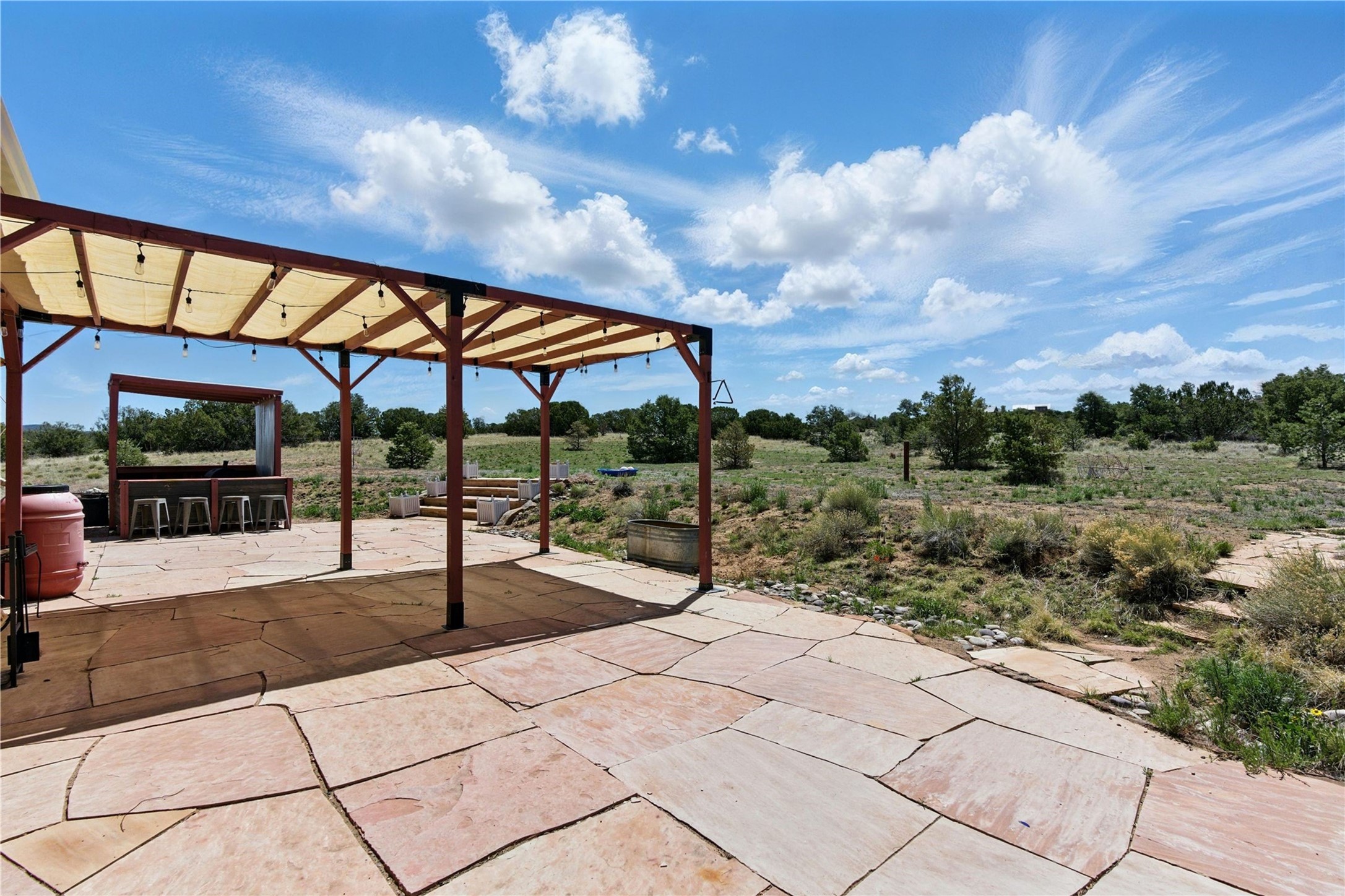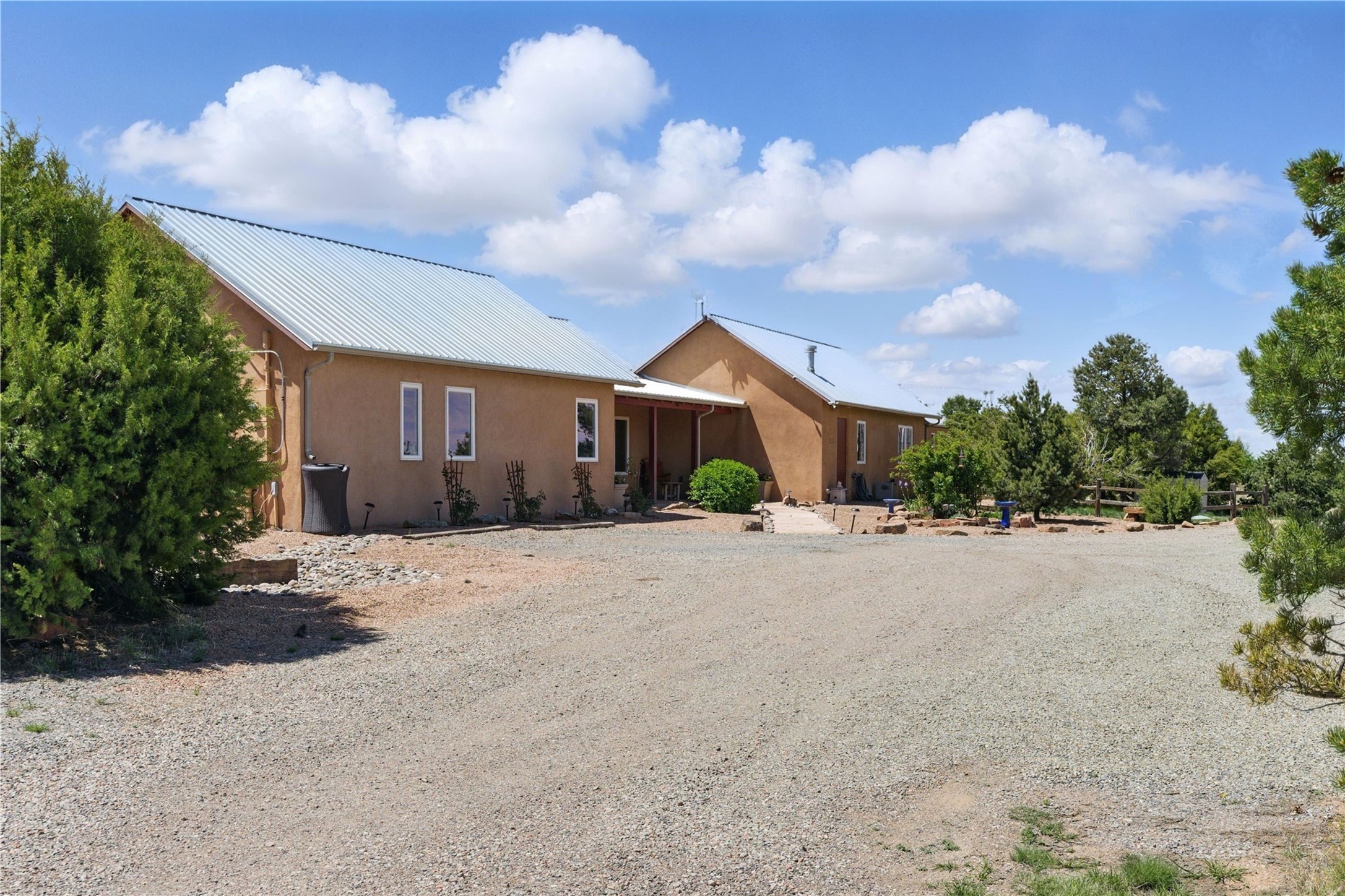Priced at $589,000, this pitched-roof, four-bedroom, two-bath, Northern-New-Mexico style home on 4.85 acres represents an absolute bargain value to any sophisticated buyer who has researched Santa Fe home prices (for a virtual tour, visit 34RanchRoad.com). Designed by architect Bruce Davis, this single-story contemporary home in Lamy offers ample separation between the primary suite on the west side and the guest bedrooms on the east. As you enter, you'll walk into the open-concept living room, with the contemporary kitchen (with bright granite countertops, stainless appliances, and an island stove) on the left. The home is defined by the quality of the natural light in virtually every room. Davis designed the home to take advantage of the north/south facing layout in its passive-solar design. Radiant heat runs through stained concrete floors and mini splits provide heating and cooling. A hidden door in the primary bedroom opens into a heated studio, which also has access to the exterior. There is a 220-volt outlet near the parking area for RV use or to convert to EV charging use (it's also set up on the other side for the hot tub). Outside covered pergola and barbeque hut add to your enjoyment. Two horses are allowed. One of the sellers is a New Mexico real estate licensee. There are two additional lots available on the north side, each at $169,500. Please see MLS 202402587 and 202402586 (24 and 30 Ranch Road). Please note that the property is being sold in its current condition. The seller will make no repairs or concessions. An open house will be held Sunday November 23 from 1:00 to 4:00 pm.