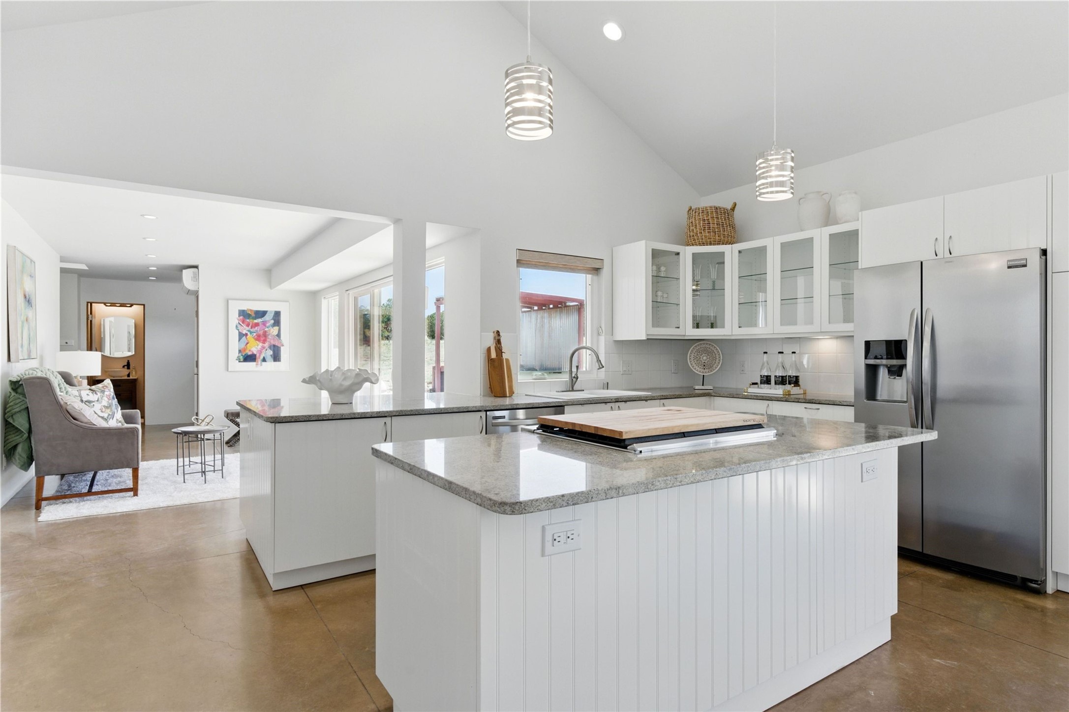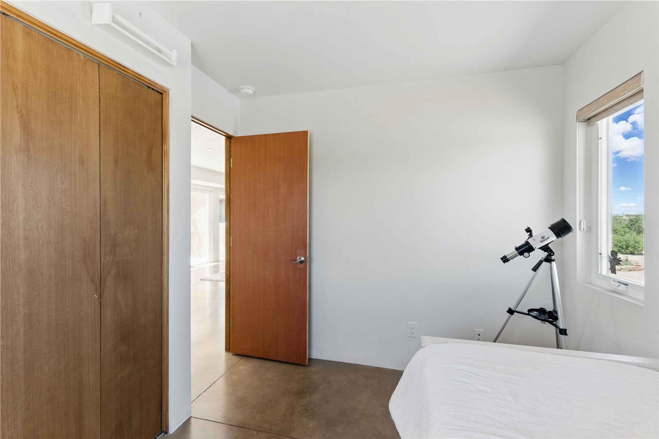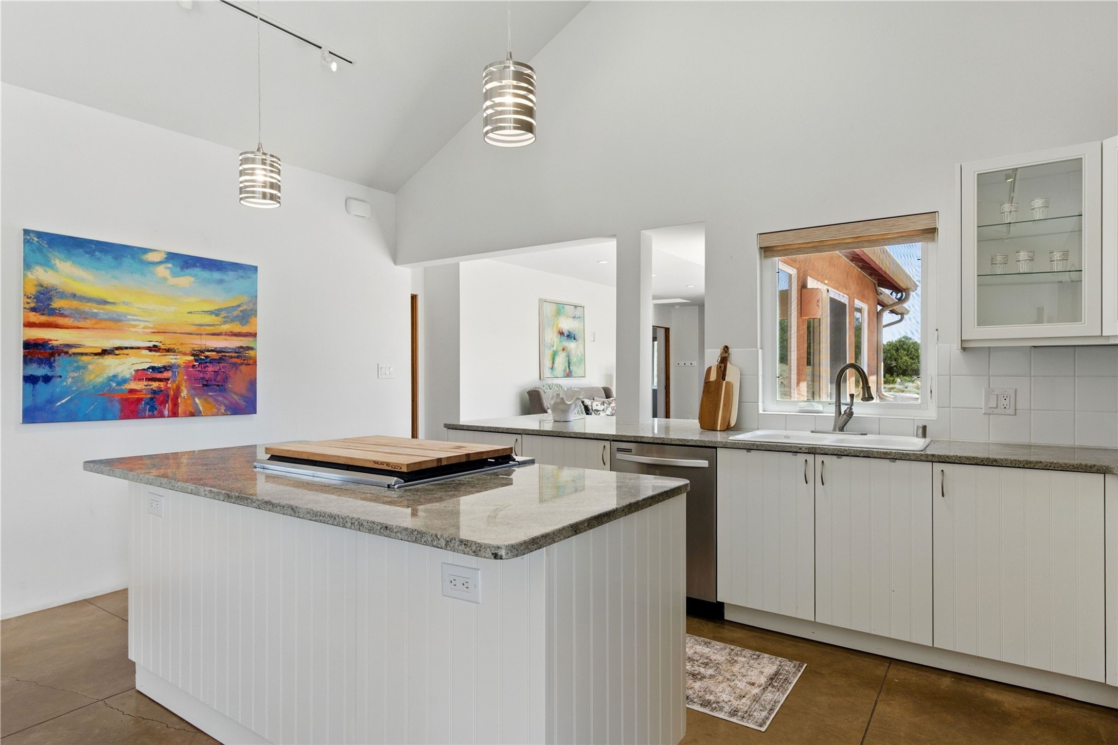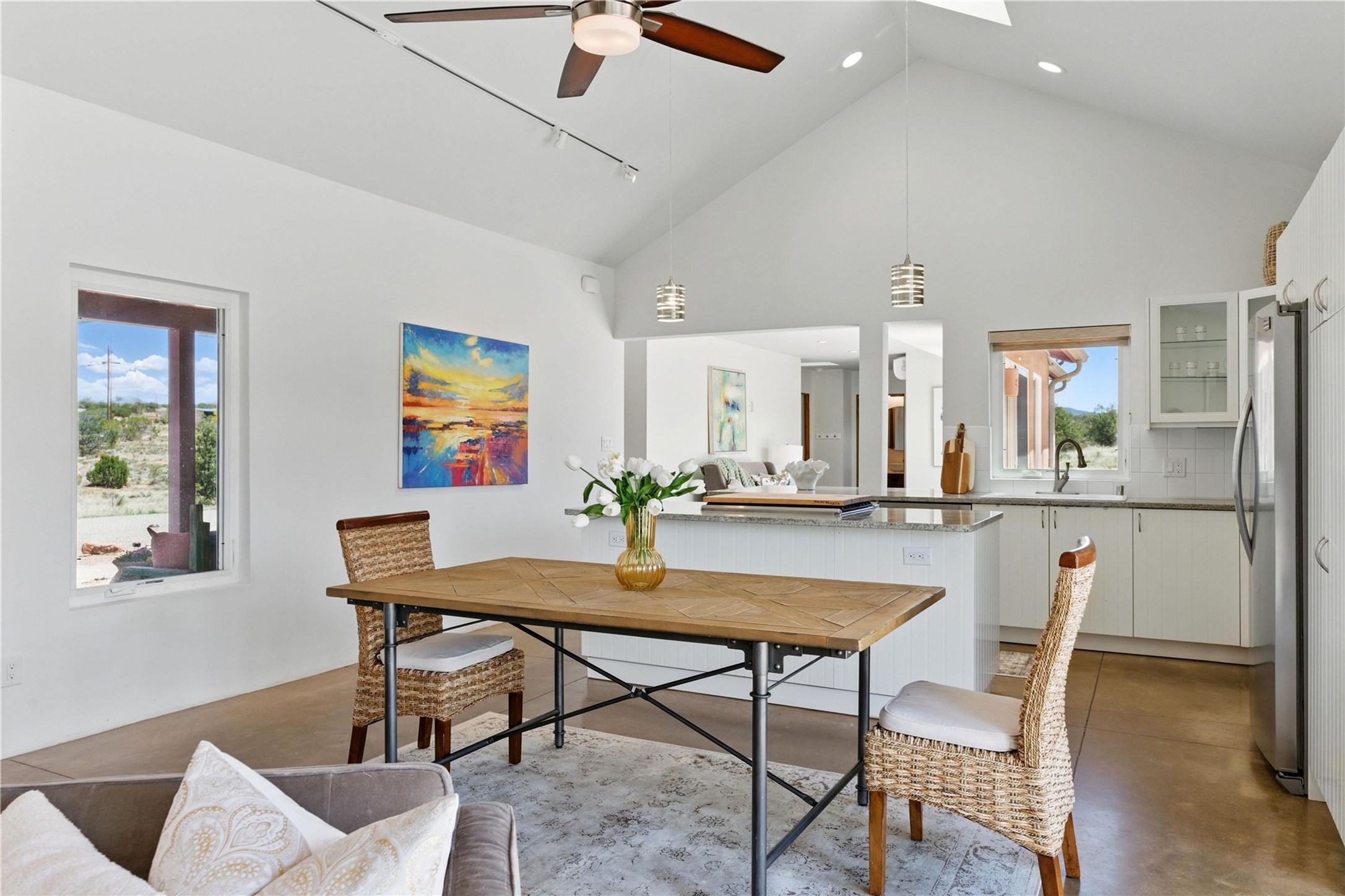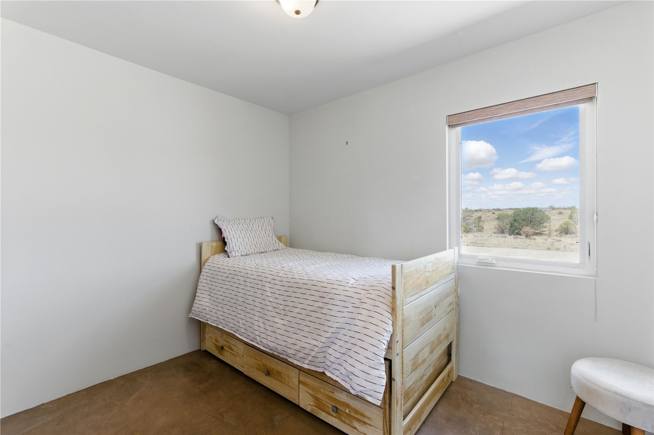 Priced at $589,000, this pitched-roof, four-bedroom, two-bath, Northern-New-Mexico style home on 4.85 acres represents an absolute bargain value to any sophisticated buyer who has researched Santa Fe home prices (for a virtual tour, visit 34RanchRoad.com). Designed by architect Bruce Davis, this single-story contemporary home in Lamy offers ample separation between the primary suite on the west side and the guest bedrooms on the east. As you enter, you'll walk into the open-concept living room, with the contemporary kitchen (with bright granite countertops, stainless appliances, and an island stove) on the left. The home is defined by the quality of the natural light in virtually every room. Davis designed the home to take advantage of the north/south facing layout in its passive-solar design. Radiant heat runs through stained concrete floors and mini splits provide heating and cooling. A hidden door in the primary bedroom opens into a heated studio, which also has access to the exterior. There is a 220-volt outlet near the parking area for RV use or to convert to EV charging use (it's also set up on the other side for the hot tub). Outside covered pergola and barbeque hut add to your enjoyment. Two horses are allowed. One of the sellers is a New Mexico real estate licensee. There are two additional lots available on the north side, each at $169,500. Please see MLS 202402587 and 202402586 (24 and 30 Ranch Road). Please note that the property is being sold in its current condition. The seller will make no repairs or concessions. An open house will be held Sunday November 23 from 1:00 to 4:00 pm.