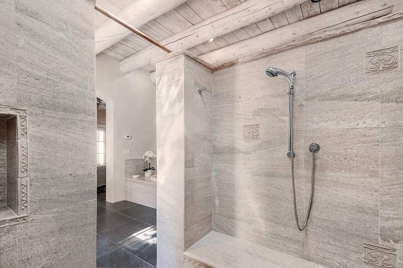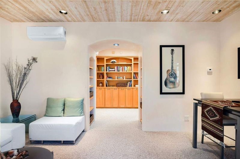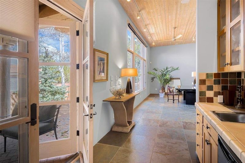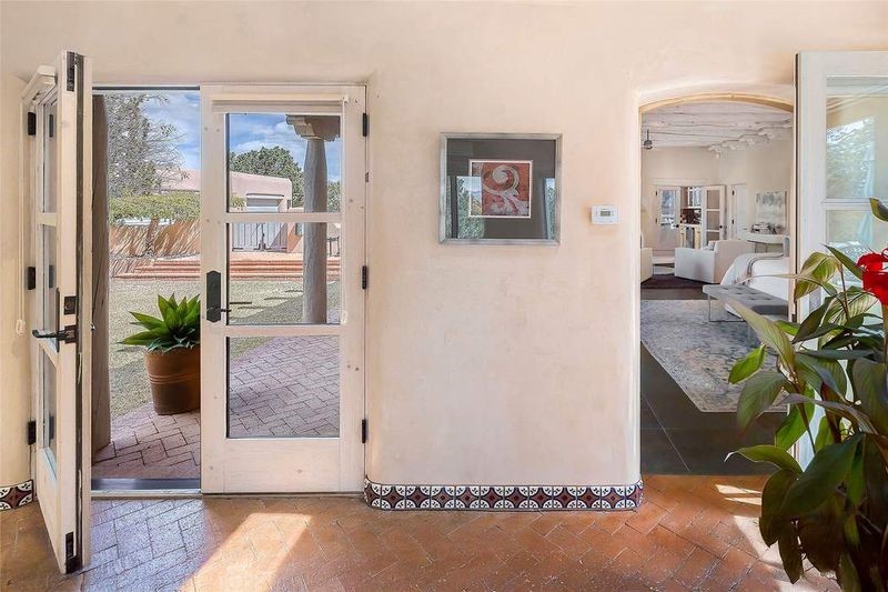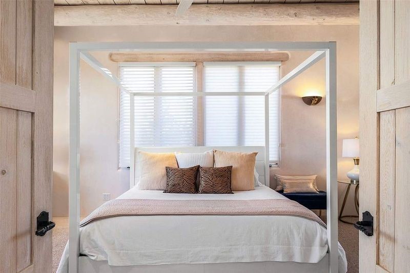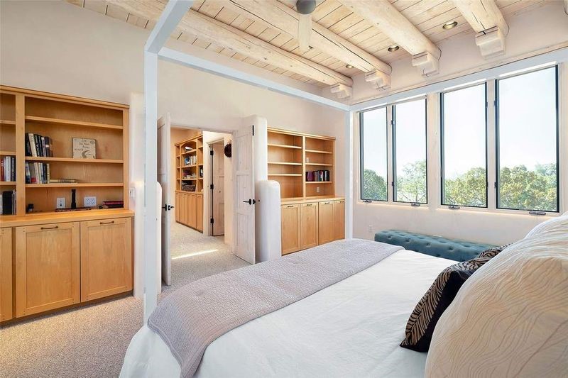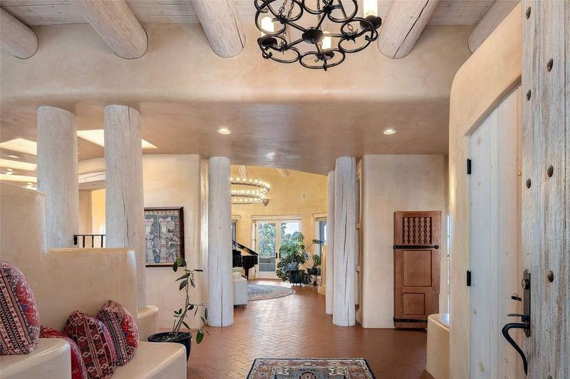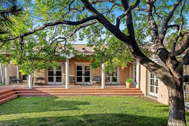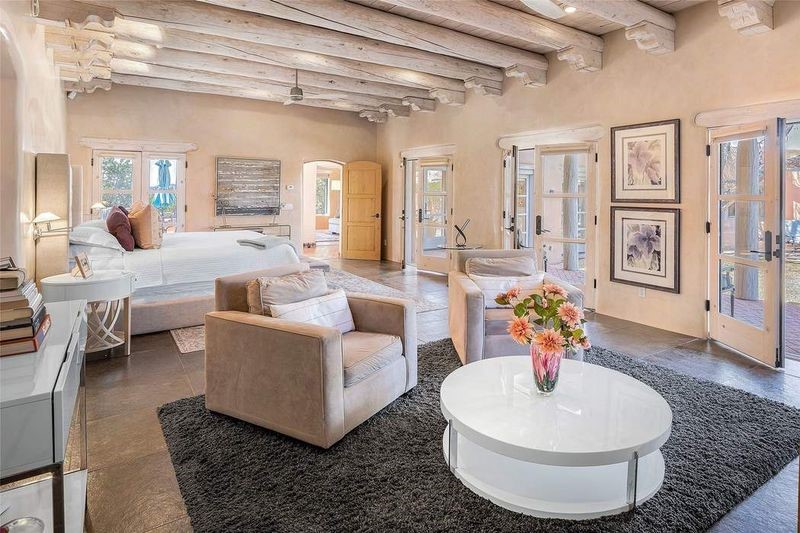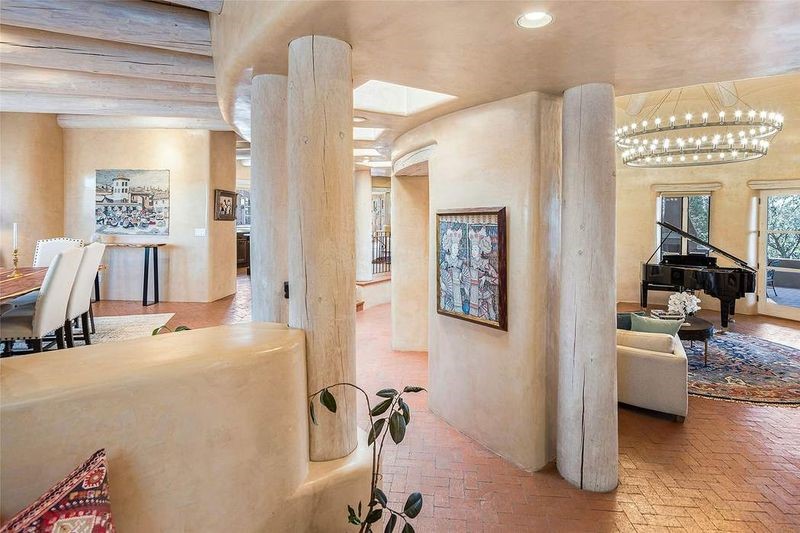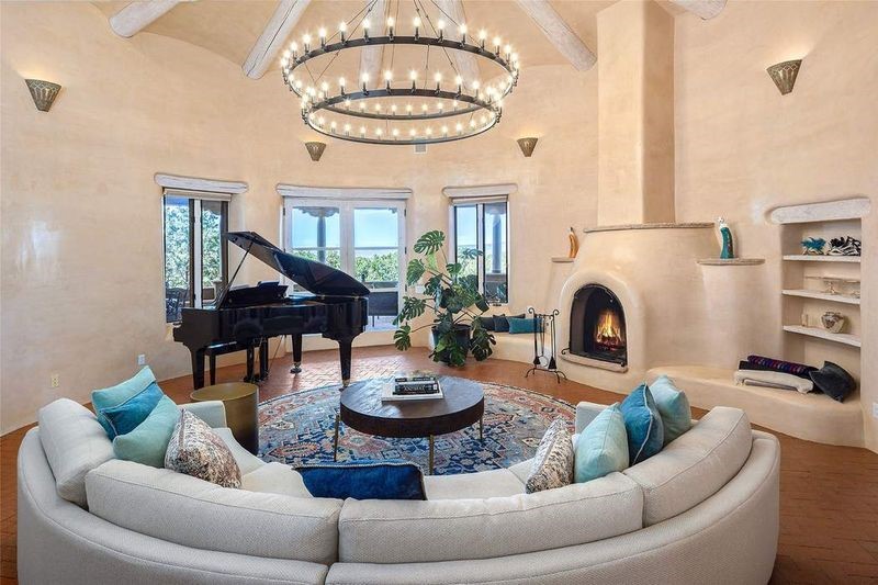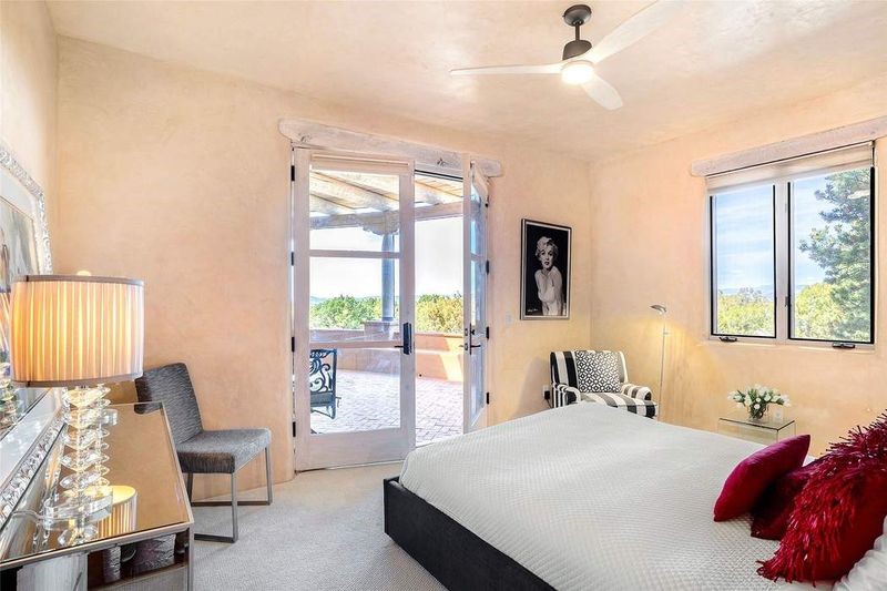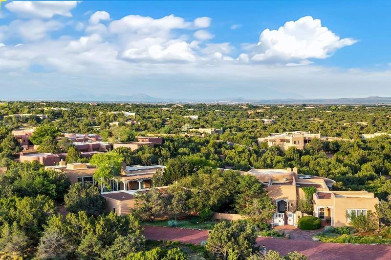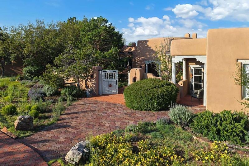 One of the most iconic homes in all of Santa Fe, this Robert Ritter-built house and guest house, exemplifies the ultimate Santa Fe and Las Campanas lifestyle with spectacular lush landscape and fountains, Jemez Mountain, Sangre de Cristo Mountain and sunset views, all within minutes to the Plaza and The Club as Las Campanas. Sited on a private, 1.8-acre lot, this distinctive home excites with a flexible floor plan which superbly incorporates a seamless indoor and outdoor living experience, while also providing excellent separation of space, featuring a 650 square foot detached guest house and an attached studio, ideal as an artist studio, home theater or large office. The main house design features include an incredible floor plan, ideal for entertaining and guests, with a stunning formal living room complete with views, a grand fireplace, portal access and a modern chandelier. The updated island kitchen impresses with leathered granite counters, Wolf and Sub-Zero appliances, a walk-in pantry and a built-in Miele coffee maker. Located directly off the kitchen is a breakfast area with a fireplace and a formal dining room, with a curved wall of windows with views of the front courtyard gardens. The spacious primary suite delights with a seating area, a fireplace, courtyard access, and a luxurious spa-like bath with access to the outdoor spa and lounging area. Additional main house features include a secondary primary suite with an ensuite bath, 2 additional guest bedrooms in the main house plus an office, and one of the finest portals in Santa Fe with a 24' wrap around outdoor living area, complete with a built-in Viking BBQ and an outdoor fireplace. The well appointed one bedroom guest house offers a separate entrance, living room, barista area, 3/4 bath and views. Exceptional features include a large 3 car garage, primarily adobe construction, a newly bricked driveway, creamy plaster walls, soft natural light and superior craftsmanship throughout.