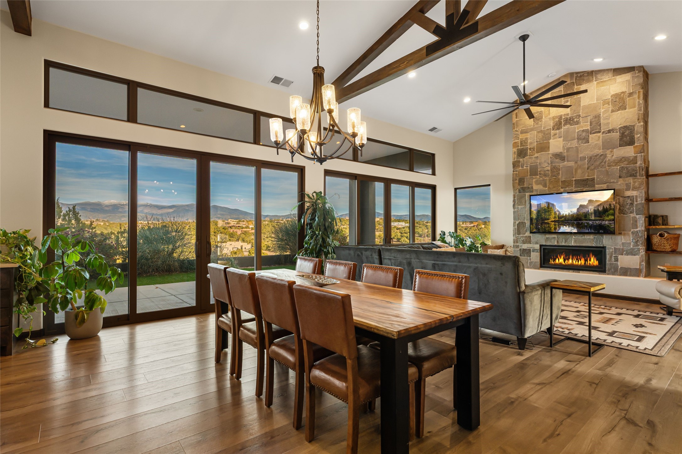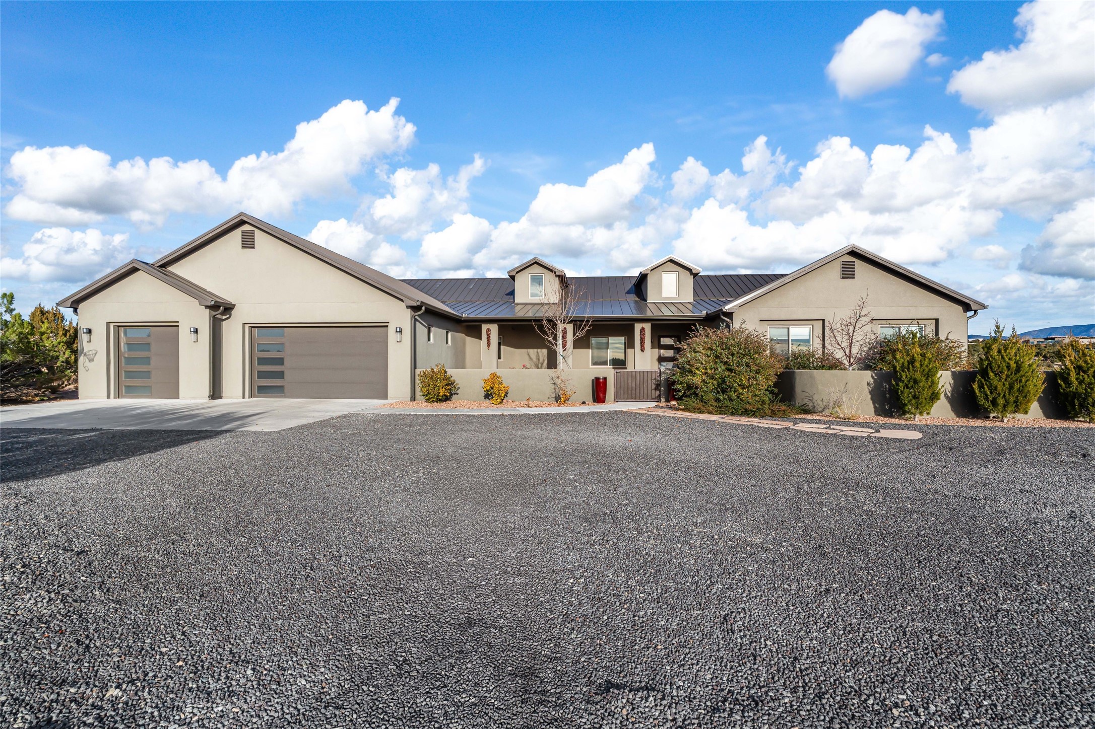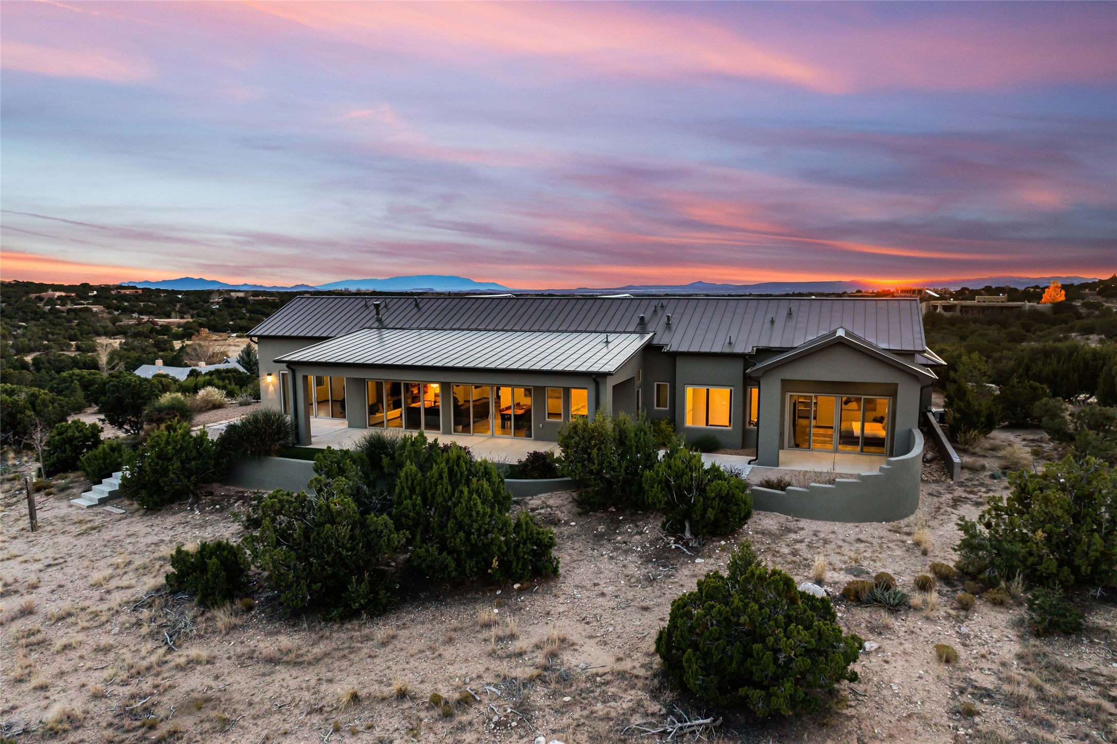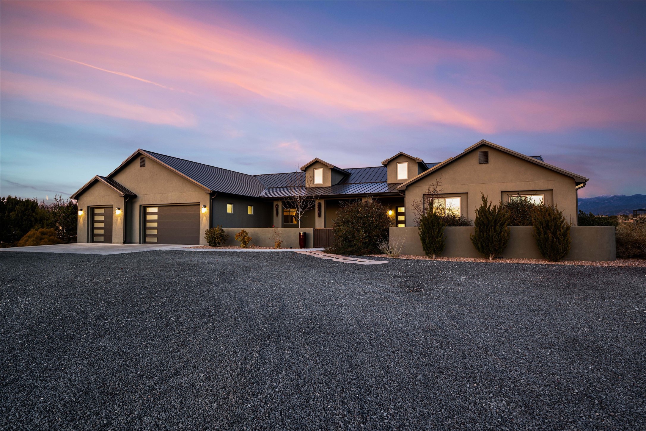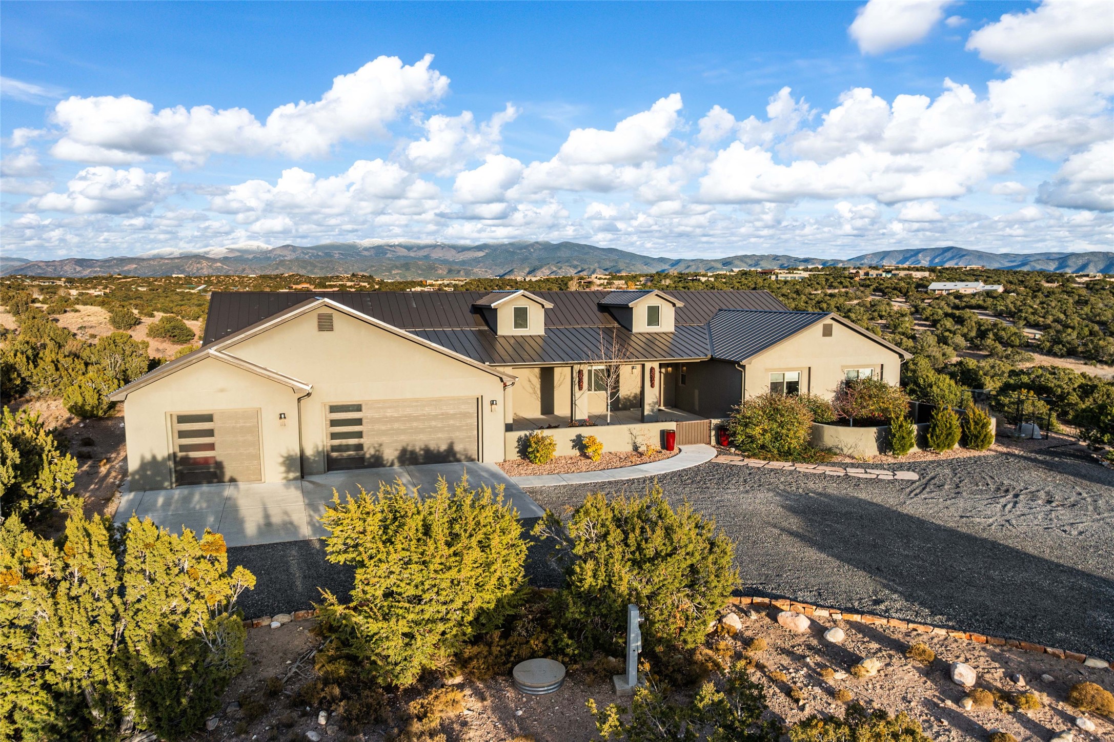 Step into grandeur and breathtaking views of the majestic Sangre de Cristo Mountains in this spectacular Northern New Mexico-style home. Perfectly sited on 3.25 acres to capture both sunrise and sunset views, this 2022 custom-built residence blends contemporary style with a spacious, thoughtful floor plan ideal for both large-scale entertaining and comfortable everyday living.This exceptional 4-bedroom, 3.5-bath home features an open-concept main living area, a private Primary Suite, three Guest Bedrooms, a dedicated Office, and a large Workout Studio/Bonus Room. An expansive wall of floor-to-ceiling windows provides unobstructed mountain views, framing the Sangre de Cristos like artwork. Sunsets paint the landscape in soft desert hues, which become an everyday backdrop to living, dining, and entertaining.The Gourmet Chef's Kitchen is truly a chef's dream offering abundant cabinetry and countertop space, a generous center island, granite and quartz countertops, a spacious walk-in pantry, a coffee/wet bar with refrigerated storage, and stainless-steel appliances including a 48-inch gas cooktop and double electric wall ovens.The heart of the home unfolds into an inviting, open concept living space with 14 ft. vaulted ceilings featuring dramatic finished-wood trusses and opens seamlessly to a large, covered patio which is perfect for enjoying the sweeping mountain views.Thoughtfully designed for optimal privacy and separation from the Guest Wing, the spacious Primary Suite offers a serene retreat with captivating morning sunrise views and direct access to the east-facing patio. The spacious en suite Primary Bathroom features dual vanities, a free-standing soaking tub, and a large walk-in shower.Additional features include a pitched metal roof, an oversized three-car garage designed to accommodate a workshop or hobby area, and a spacious attic above the garage that provides substantial additional storage capacity. Not only was this home exceptionally built, it has also been meticulously cared for and is move-in ready for its new owners.Enjoy convenient access to the Santa Fe Plaza, shopping, restaurants, and the world-famous Santa Fe Opera while living the ultimate Santa Fe lifestyle surrounded by unparalleled natural beauty! Schedule your own private tour to preview this extraordinary home for yourself.