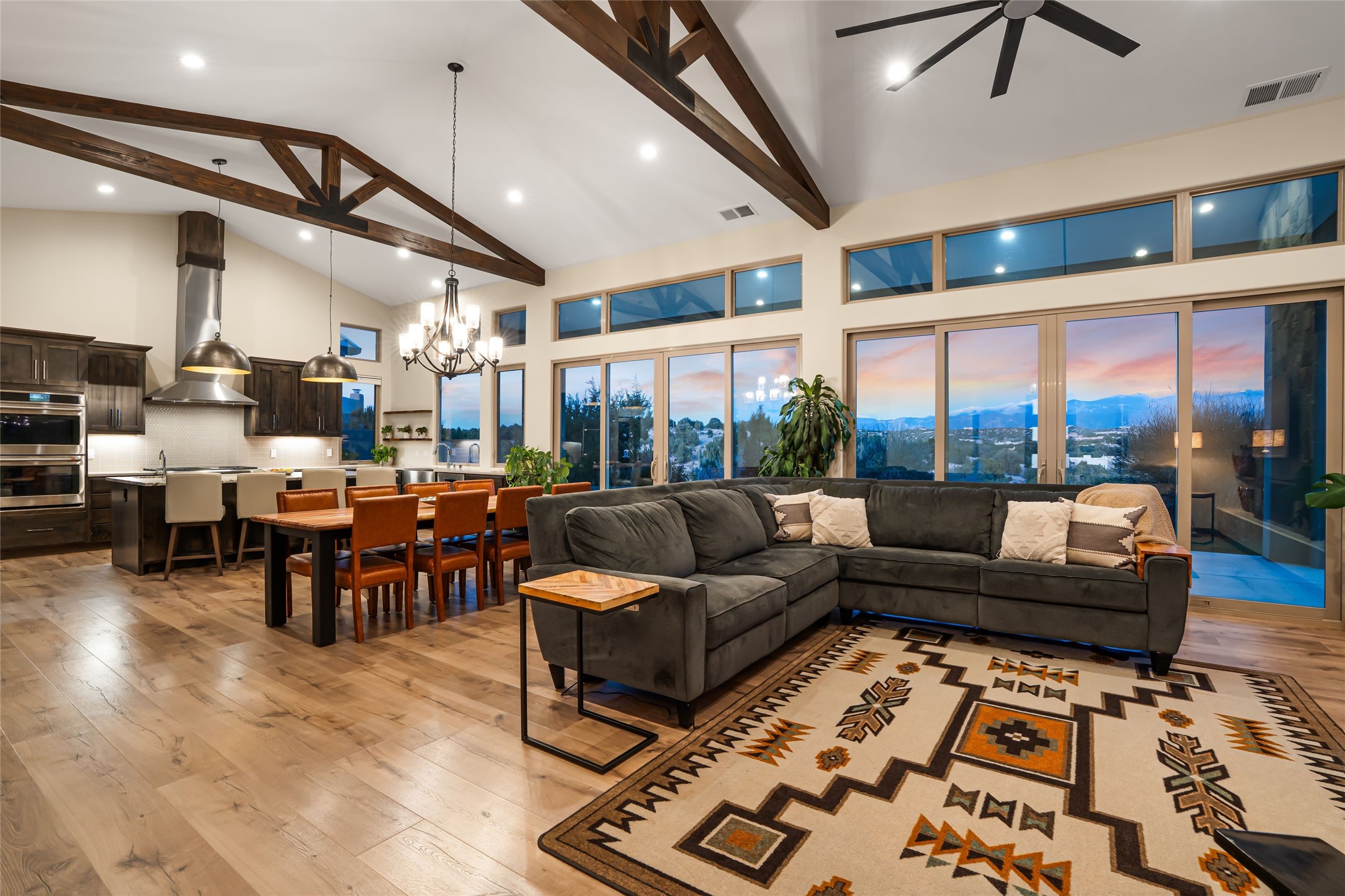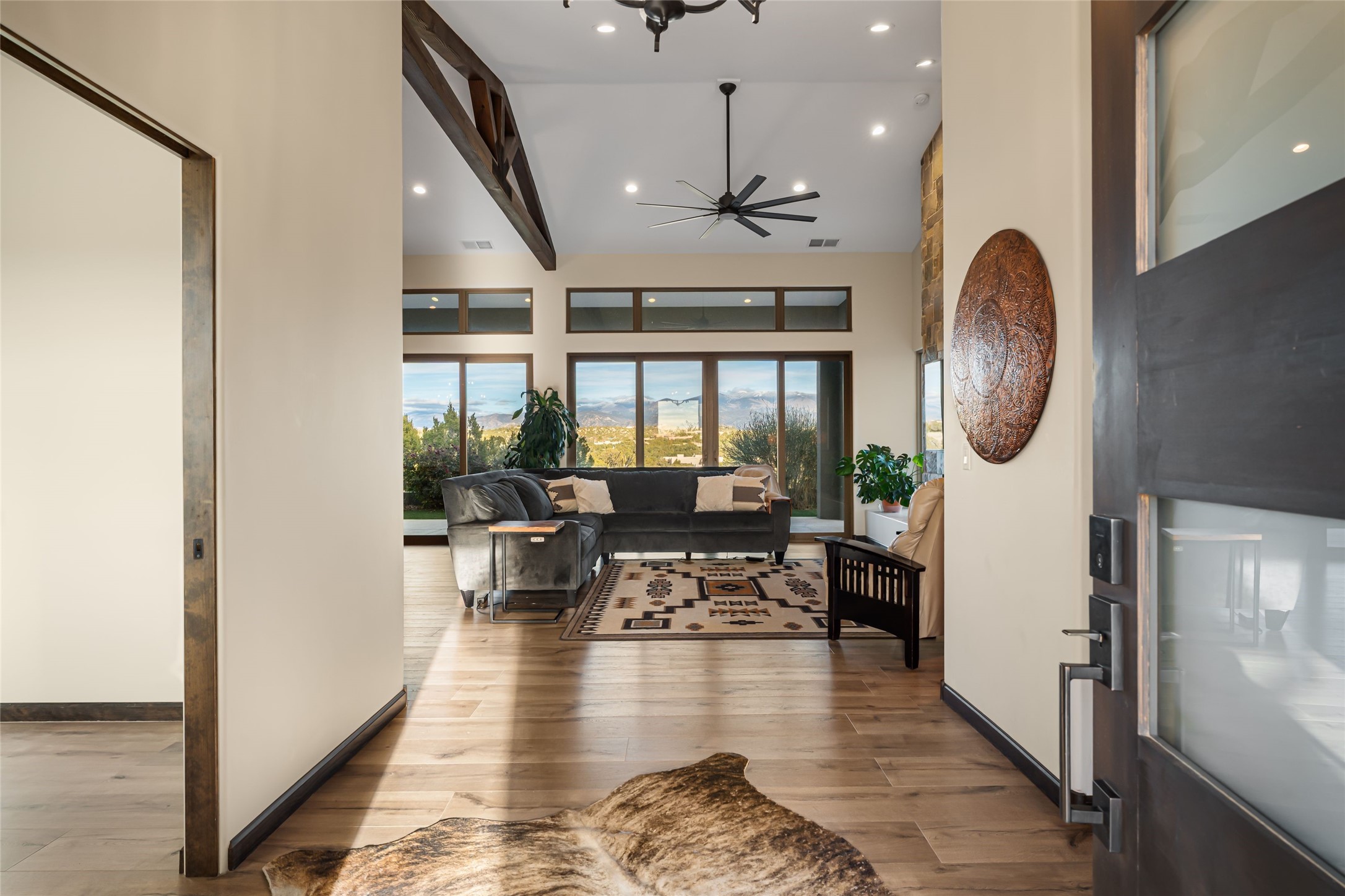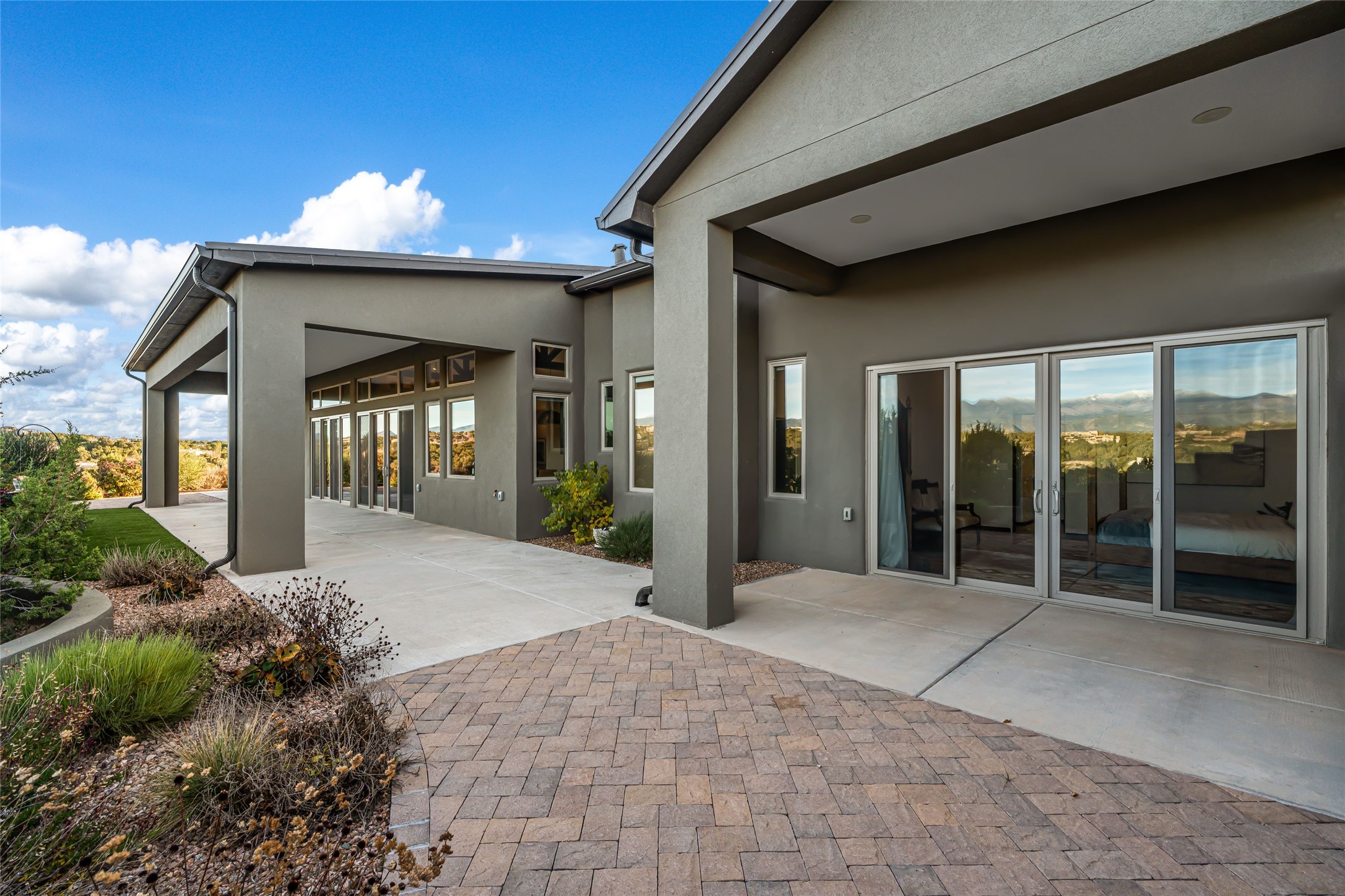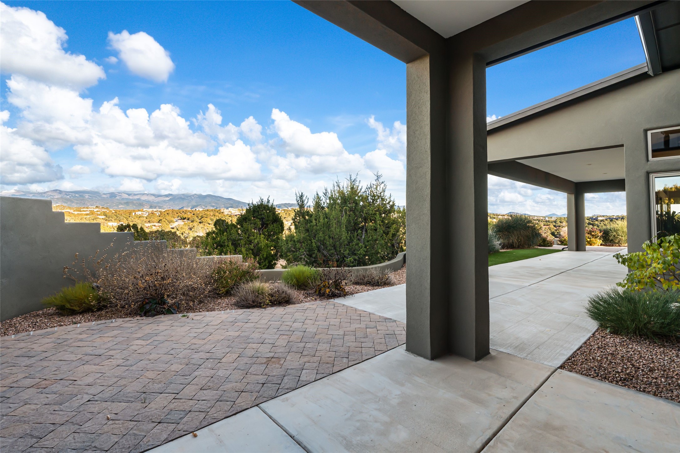 Step into grandeur and breathtaking views of the majestic Sangre de Cristo Mountains in this spectacular Northern New Mexico-style home. Perfectly sited on 3.25 acres to capture both sunrise and sunset views, this 2022 custom-built residence blends contemporary style with a spacious, thoughtful floor plan ideal for both large-scale entertaining and comfortable everyday living.This exceptional 4-bedroom, 3.5-bath home features an open-concept main living area, a private Primary Suite, three Guest Bedrooms, a dedicated Office, and a large Workout Studio/Bonus Room. An expansive wall of floor-to-ceiling windows provides unobstructed mountain views, framing the Sangre de Cristos like artwork. Sunsets paint the landscape in soft desert hues, which become an everyday backdrop to living, dining, and entertaining.The Gourmet Chef's Kitchen is truly a chef's dream offering abundant cabinetry and countertop space, a generous center island, granite and quartz countertops, a spacious walk-in pantry, a coffee/wet bar with refrigerated storage, and stainless-steel appliances including a 48-inch gas cooktop and double electric wall ovens.The heart of the home unfolds into an inviting, open concept living space with 14 ft. vaulted ceilings featuring dramatic finished-wood trusses and opens seamlessly to a large, covered patio which is perfect for enjoying the sweeping mountain views.Thoughtfully designed for optimal privacy and separation from the Guest Wing, the spacious Primary Suite offers a serene retreat with captivating morning sunrise views and direct access to the east-facing patio. The spacious en suite Primary Bathroom features dual vanities, a free-standing soaking tub, and a large walk-in shower.Additional features include a pitched metal roof, an oversized three-car garage designed to accommodate a workshop or hobby area, and a spacious attic above the garage that provides substantial additional storage capacity. Not only was this home exceptionally built, it has also been meticulously cared for and is move-in ready for its new owners.Enjoy convenient access to the Santa Fe Plaza, shopping, restaurants, and the world-famous Santa Fe Opera while living the ultimate Santa Fe lifestyle surrounded by unparalleled natural beauty! Schedule your own private tour to preview this extraordinary home for yourself.