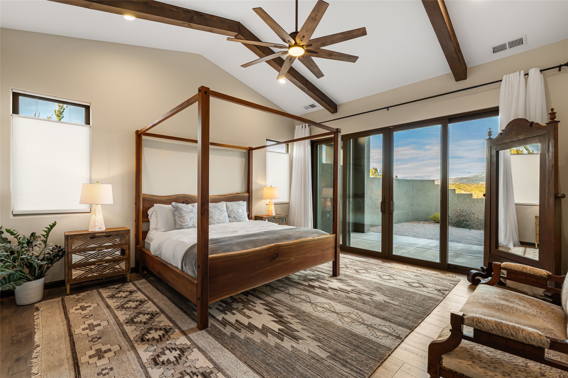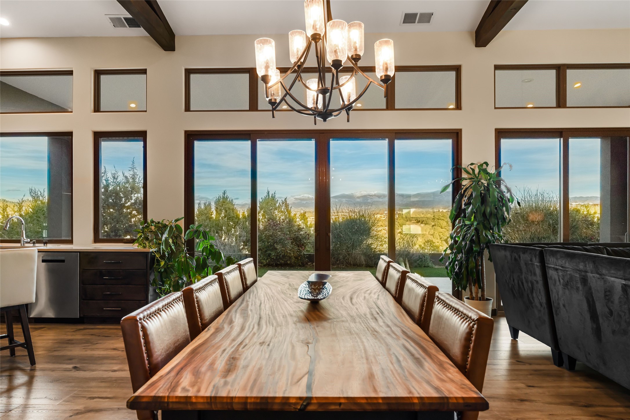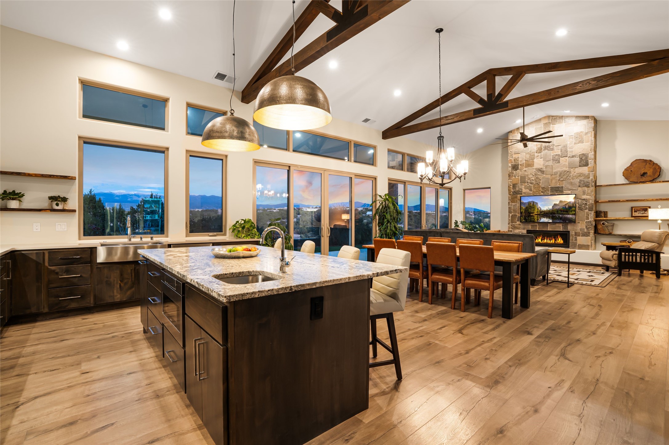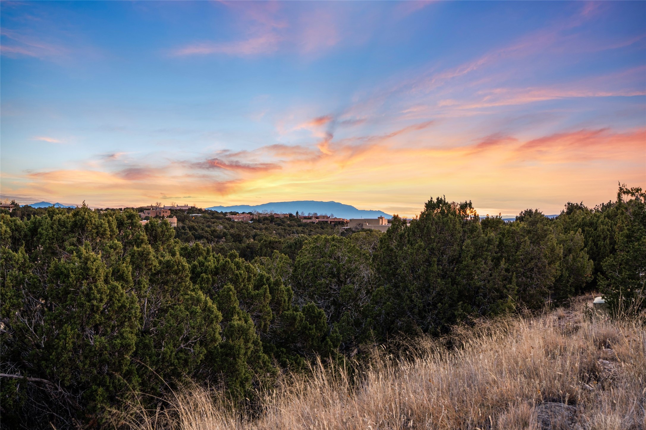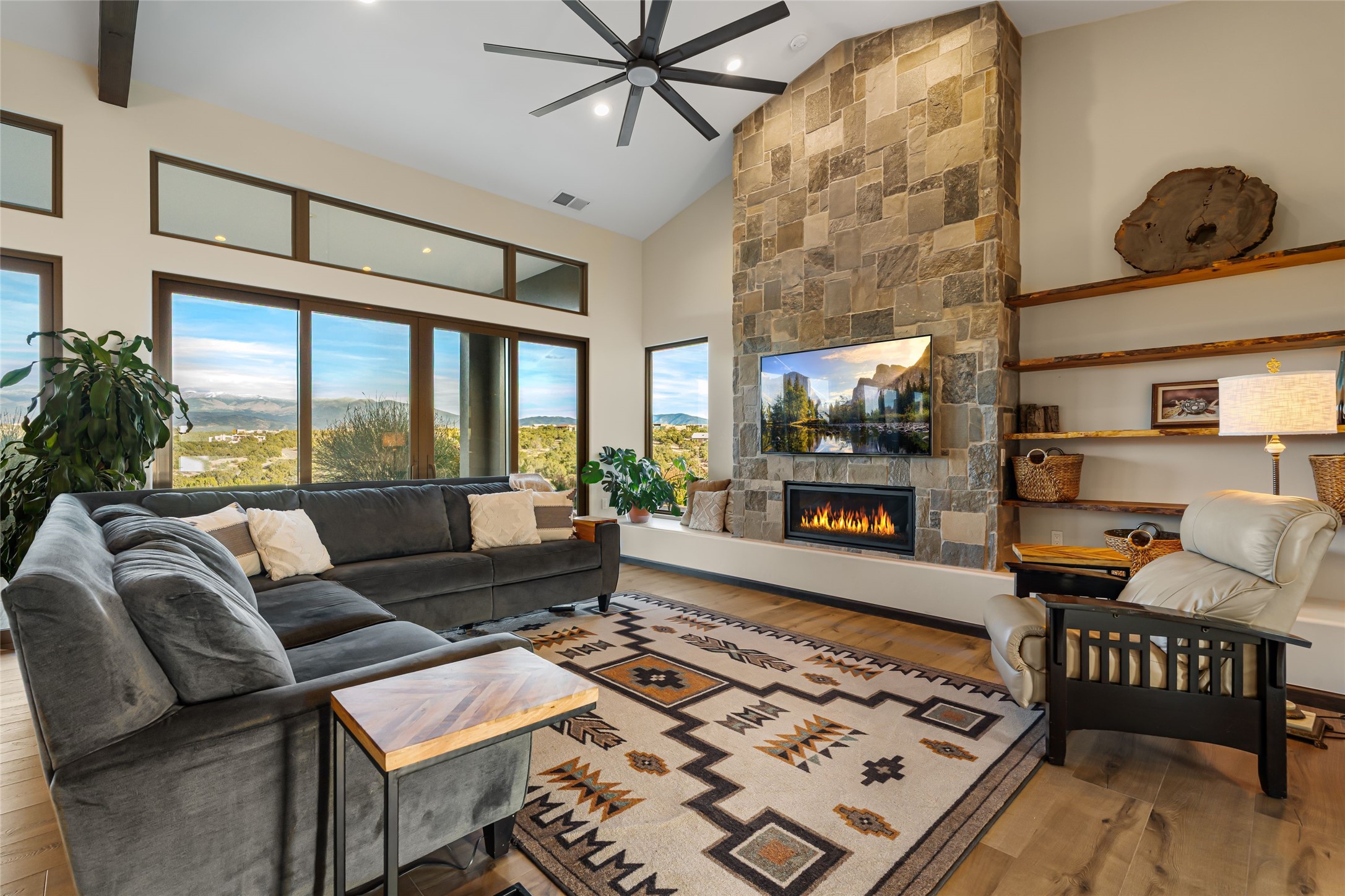 Step into grandeur and breathtaking views of the majestic Sangre de Cristo Mountains in this spectacular Northern New Mexico-style home. Perfectly sited on 3.25 acres to capture both sunrise and sunset views, this 2022 custom-built residence blends contemporary style with a spacious, thoughtful floor plan ideal for both large-scale entertaining and comfortable everyday living.This exceptional 4-bedroom, 3.5-bath home features an open-concept main living area, a private Primary Suite, three Guest Bedrooms, a dedicated Office, and a large Workout Studio/Bonus Room. An expansive wall of floor-to-ceiling windows provides unobstructed mountain views, framing the Sangre de Cristos like artwork. Sunsets paint the landscape in soft desert hues, which become an everyday backdrop to living, dining, and entertaining.The Gourmet Chef's Kitchen is truly a chef's dream offering abundant cabinetry and countertop space, a generous center island, granite and quartz countertops, a spacious walk-in pantry, a coffee/wet bar with refrigerated storage, and stainless-steel appliances including a 48-inch gas cooktop and double electric wall ovens.The heart of the home unfolds into an inviting, open concept living space with 14 ft. vaulted ceilings featuring dramatic finished-wood trusses and opens seamlessly to a large, covered patio which is perfect for enjoying the sweeping mountain views.Thoughtfully designed for optimal privacy and separation from the Guest Wing, the spacious Primary Suite offers a serene retreat with captivating morning sunrise views and direct access to the east-facing patio. The spacious en suite Primary Bathroom features dual vanities, a free-standing soaking tub, and a large walk-in shower.Additional features include a pitched metal roof, an oversized three-car garage designed to accommodate a workshop or hobby area, and a spacious attic above the garage that provides substantial additional storage capacity. Not only was this home exceptionally built, it has also been meticulously cared for and is move-in ready for its new owners.Enjoy convenient access to the Santa Fe Plaza, shopping, restaurants, and the world-famous Santa Fe Opera while living the ultimate Santa Fe lifestyle surrounded by unparalleled natural beauty! Schedule your own private tour to preview this extraordinary home for yourself.