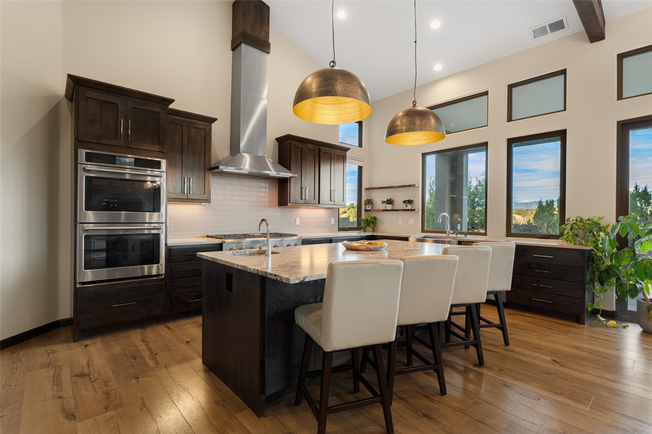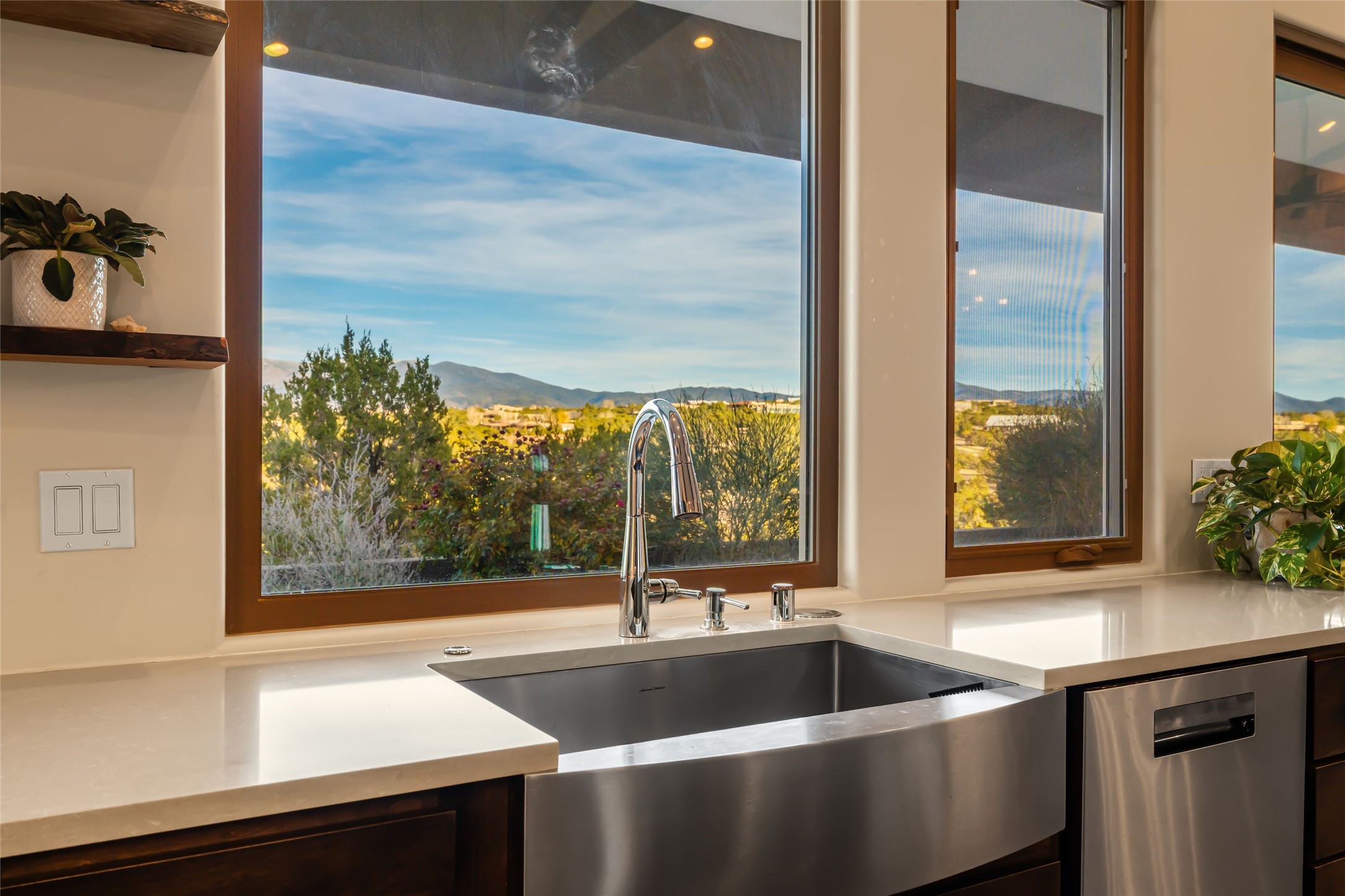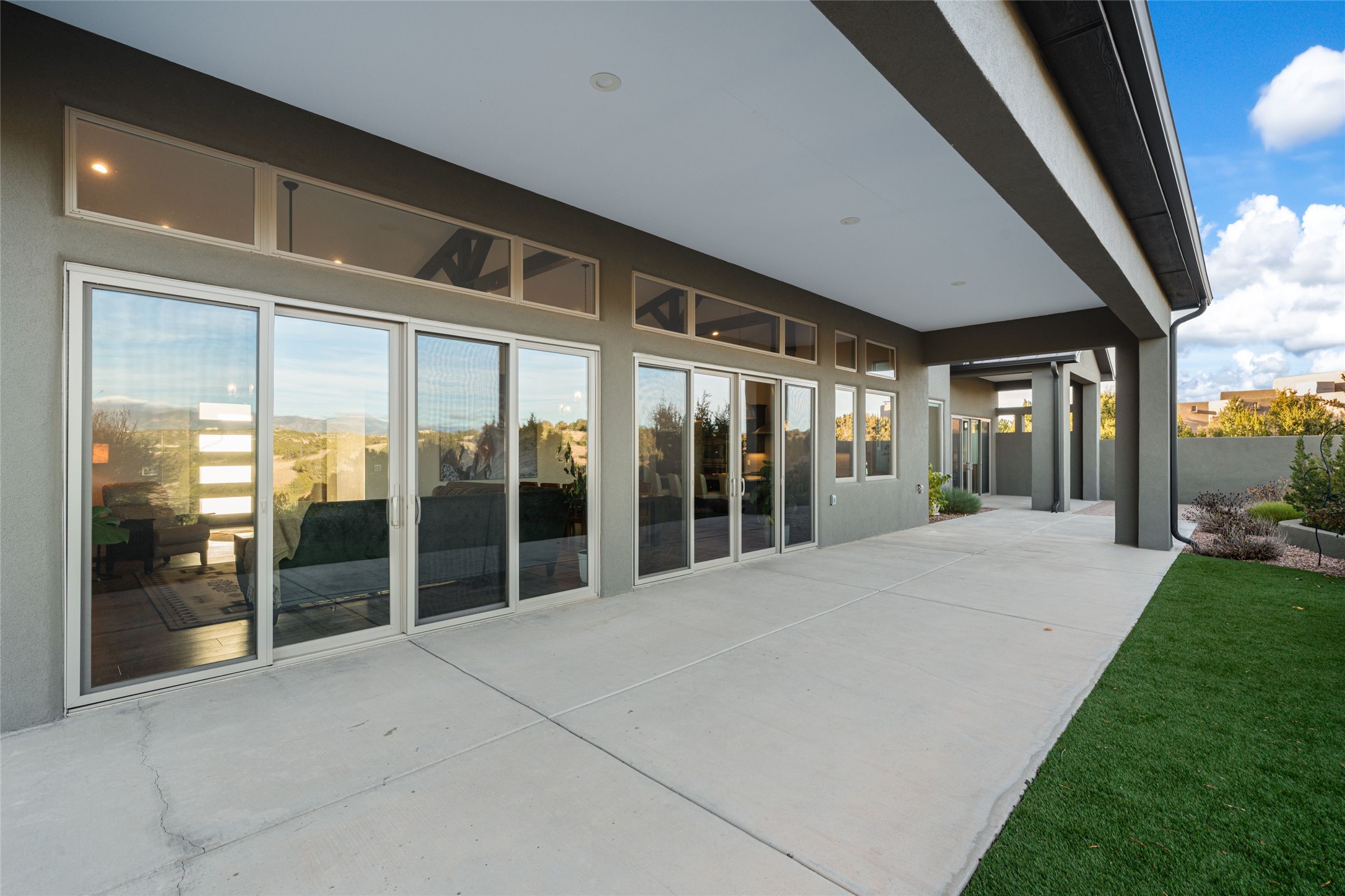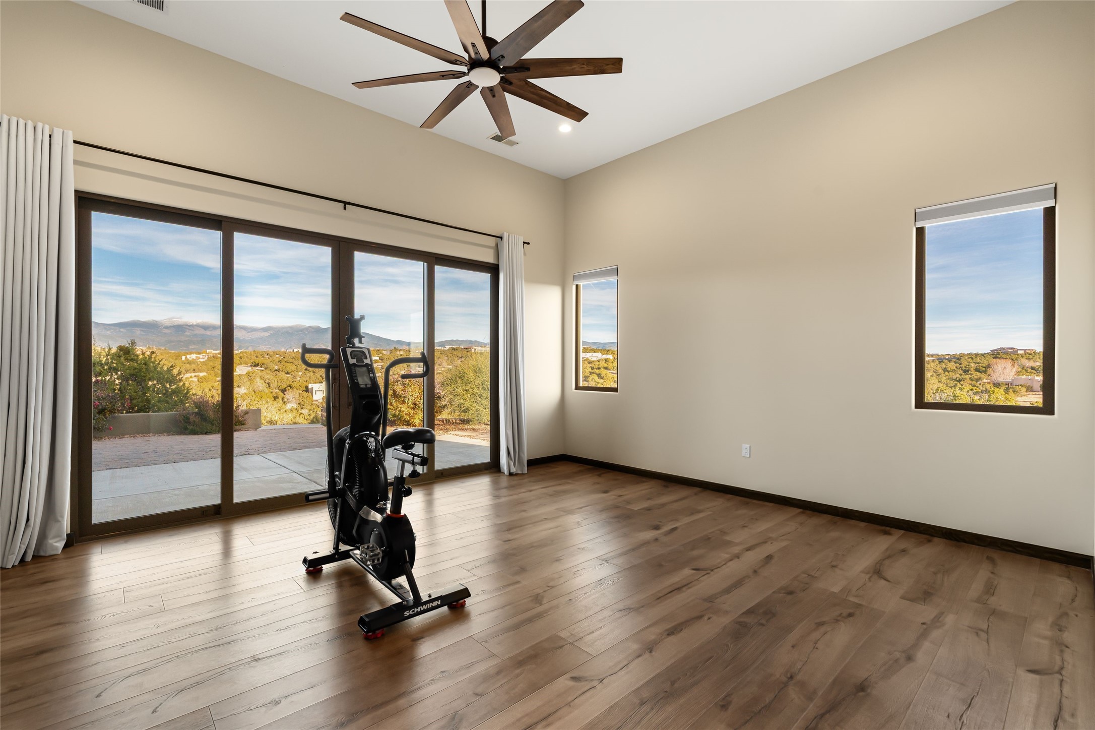 Step into grandeur and breathtaking views of the majestic Sangre de Cristo Mountains in this spectacular Northern New Mexico-style home. Perfectly sited on 3.25 acres to capture both sunrise and sunset views, this 2022 custom-built residence blends contemporary style with a spacious, thoughtful floor plan ideal for both large-scale entertaining and comfortable everyday living.This exceptional 4-bedroom, 3.5-bath home features an open-concept main living area, a private Primary Suite, three Guest Bedrooms, a dedicated Office, and a large Workout Studio/Bonus Room. An expansive wall of floor-to-ceiling windows provides unobstructed mountain views, framing the Sangre de Cristos like artwork. Sunsets paint the landscape in soft desert hues, which become an everyday backdrop to living, dining, and entertaining.The Gourmet Chef's Kitchen is truly a chef's dream offering abundant cabinetry and countertop space, a generous center island, granite and quartz countertops, a spacious walk-in pantry, a coffee/wet bar with refrigerated storage, and stainless-steel appliances including a 48-inch gas cooktop and double electric wall ovens.The heart of the home unfolds into an inviting, open concept living space with 14 ft. vaulted ceilings featuring dramatic finished-wood trusses and opens seamlessly to a large, covered patio which is perfect for enjoying the sweeping mountain views.Thoughtfully designed for optimal privacy and separation from the Guest Wing, the spacious Primary Suite offers a serene retreat with captivating morning sunrise views and direct access to the east-facing patio. The spacious en suite Primary Bathroom features dual vanities, a free-standing soaking tub, and a large walk-in shower.Additional features include a pitched metal roof, an oversized three-car garage designed to accommodate a workshop or hobby area, and a spacious attic above the garage that provides substantial additional storage capacity. Not only was this home exceptionally built, it has also been meticulously cared for and is move-in ready for its new owners.Enjoy convenient access to the Santa Fe Plaza, shopping, restaurants, and the world-famous Santa Fe Opera while living the ultimate Santa Fe lifestyle surrounded by unparalleled natural beauty! Schedule your own private tour to preview this extraordinary home for yourself.