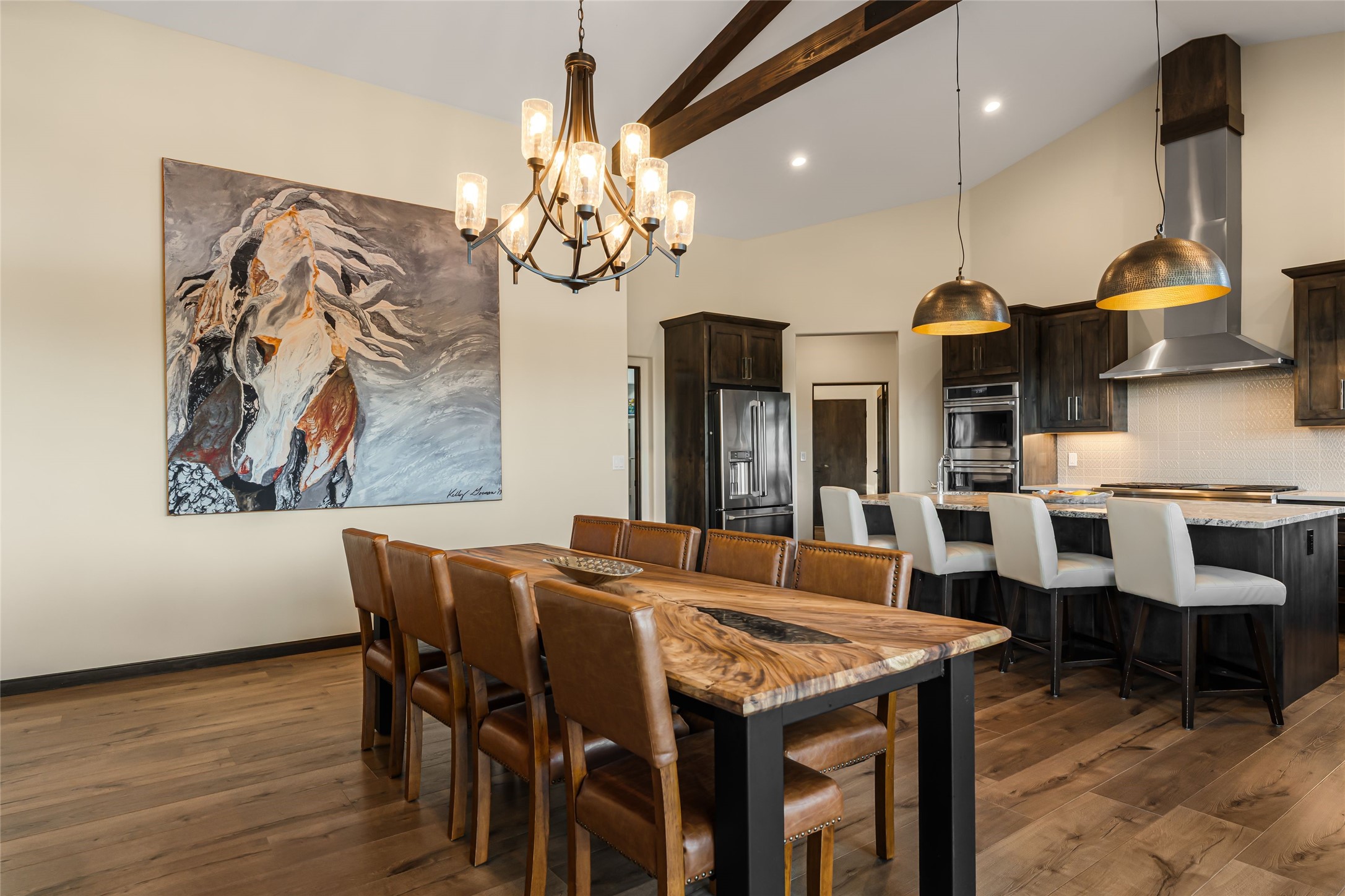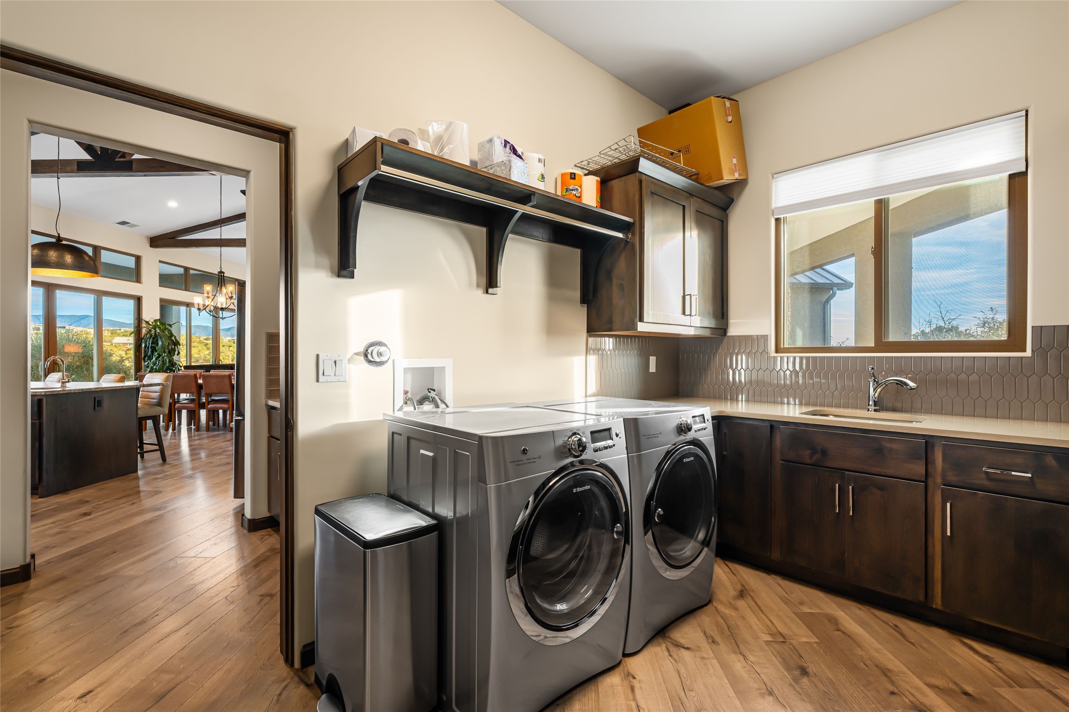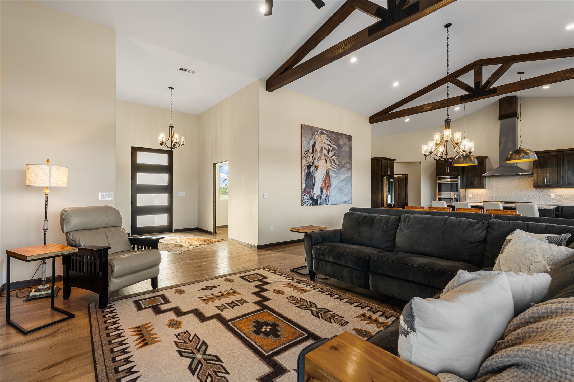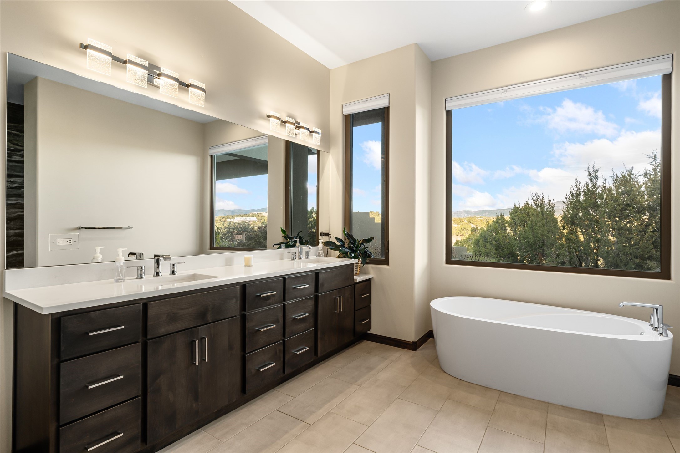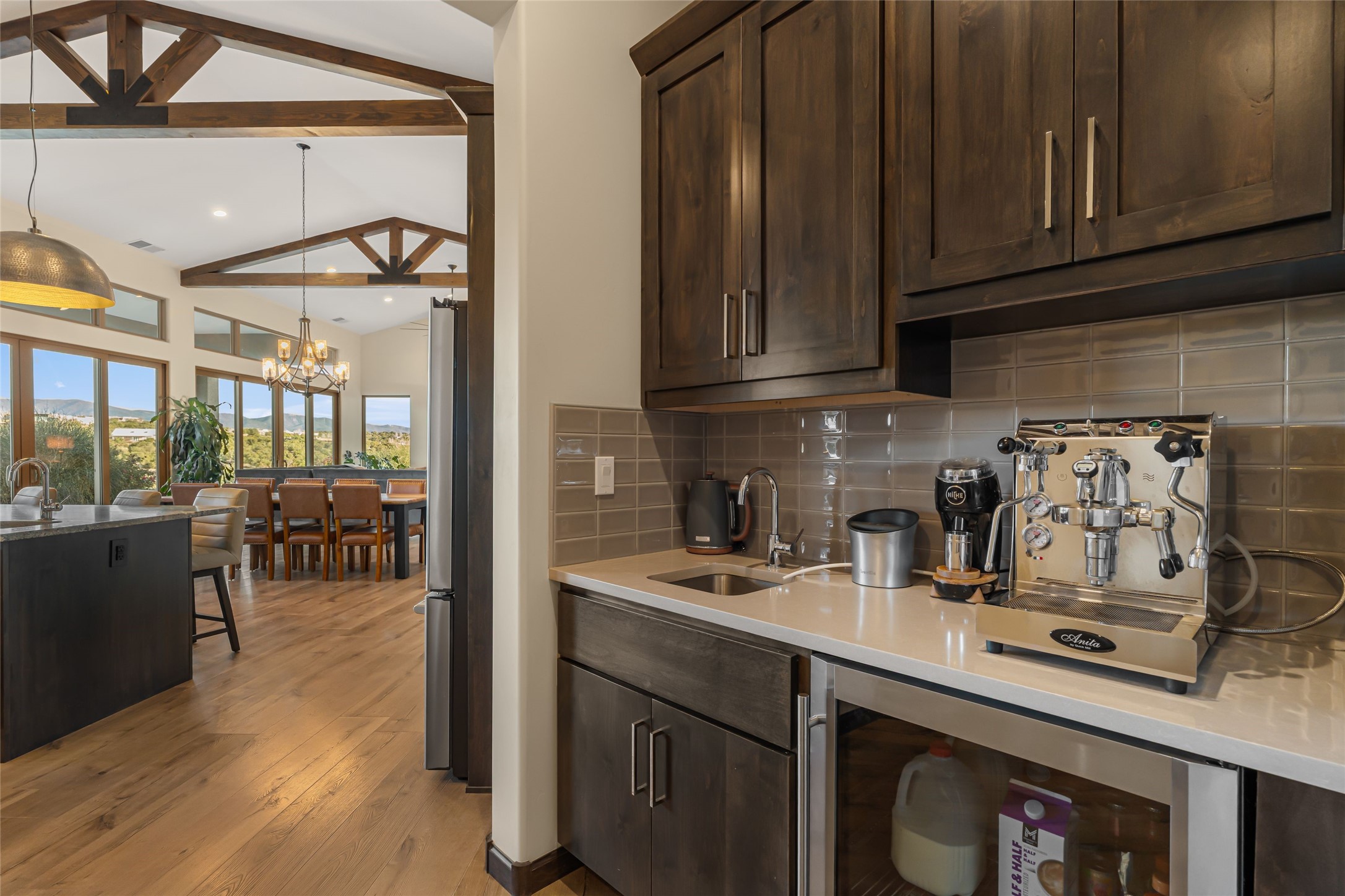 Step into grandeur and breathtaking views of the majestic Sangre de Cristo Mountains in this spectacular Northern New Mexico-style home. Perfectly sited on 3.25 acres to capture both sunrise and sunset views, this 2022 custom-built residence blends contemporary style with a spacious, thoughtful floor plan ideal for both large-scale entertaining and comfortable everyday living.This exceptional 4-bedroom, 3.5-bath home features an open-concept main living area, a private Primary Suite, three Guest Bedrooms, a dedicated Office, and a large Workout Studio/Bonus Room. An expansive wall of floor-to-ceiling windows provides unobstructed mountain views, framing the Sangre de Cristos like artwork. Sunsets paint the landscape in soft desert hues, which become an everyday backdrop to living, dining, and entertaining.The Gourmet Chef's Kitchen is truly a chef's dream offering abundant cabinetry and countertop space, a generous center island, granite and quartz countertops, a spacious walk-in pantry, a coffee/wet bar with refrigerated storage, and stainless-steel appliances including a 48-inch gas cooktop and double electric wall ovens.The heart of the home unfolds into an inviting, open concept living space with 14 ft. vaulted ceilings featuring dramatic finished-wood trusses and opens seamlessly to a large, covered patio which is perfect for enjoying the sweeping mountain views.Thoughtfully designed for optimal privacy and separation from the Guest Wing, the spacious Primary Suite offers a serene retreat with captivating morning sunrise views and direct access to the east-facing patio. The spacious en suite Primary Bathroom features dual vanities, a free-standing soaking tub, and a large walk-in shower.Additional features include a pitched metal roof, an oversized three-car garage designed to accommodate a workshop or hobby area, and a spacious attic above the garage that provides substantial additional storage capacity. Not only was this home exceptionally built, it has also been meticulously cared for and is move-in ready for its new owners.Enjoy convenient access to the Santa Fe Plaza, shopping, restaurants, and the world-famous Santa Fe Opera while living the ultimate Santa Fe lifestyle surrounded by unparalleled natural beauty! Schedule your own private tour to preview this extraordinary home for yourself.