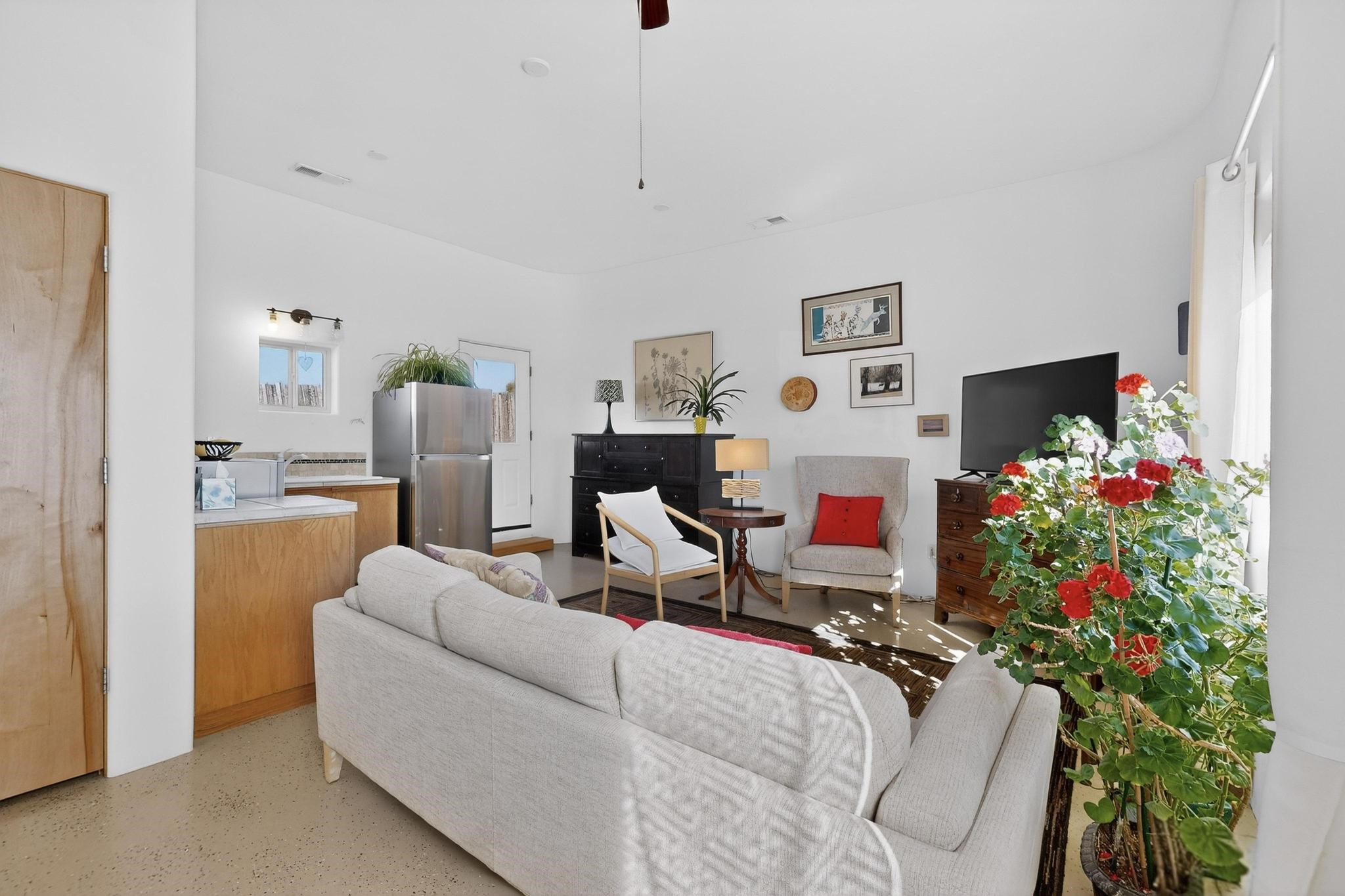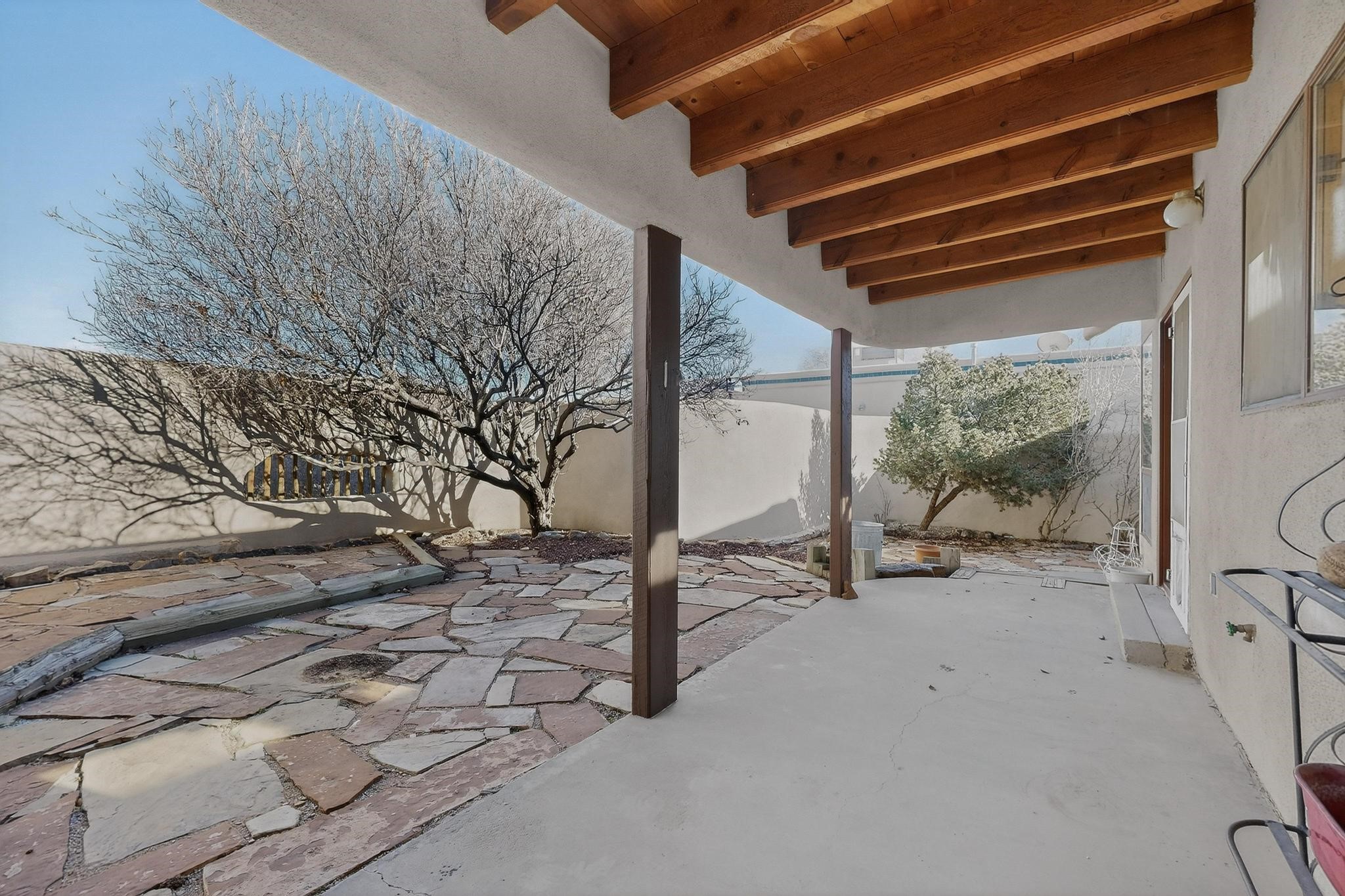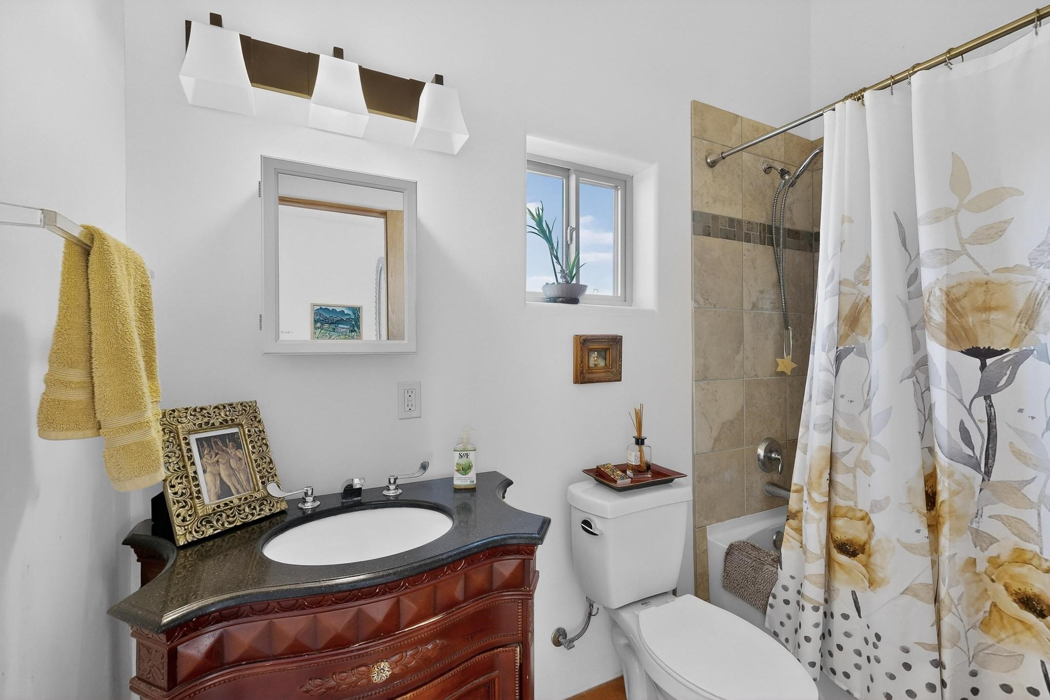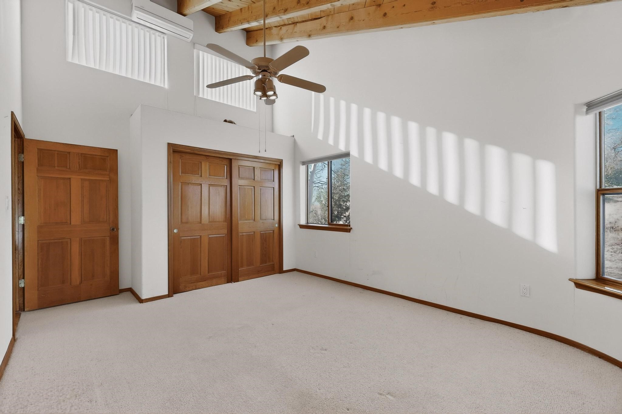 Remarkable opportunity to obtain a 3963sf multi generational 4 bedroom home in Eldorado. Born with a passive solar design and high ceilings with deep southern glazing this home is full of sunlight. Saltillo tile floors, beam and viga ceilings, high clerestories, nichos and 2 kiva fireplaces this contemporary pueblo home is amazing. A spacious country style kitchen with large breakfast bar and breakfast nook will accommodate plenty of family entertainment. There is an adjoining family room, sunken living room and a formal dining room/den off the kitchen. the owners suite features a spacious bathroom and walk in closet, plus there are 3 guest bedrooms with a 3/4 and full bath. The laundry includes a tub and plenty of extra storage. On going through the 3 bay garage you can enter the studio/guest wing which includes a 2 large rooms, bath and a separate 4th garage. A walled private flagstoned courtyard and portal in front and to the rear offer plenty of outside enjoyment. The paved driveway also includes plenty of guest parking. This home is within easy reach of the Eldorado Community Center amenities, local shopping, school, library and senior center, and only minutes into Santa Fe.