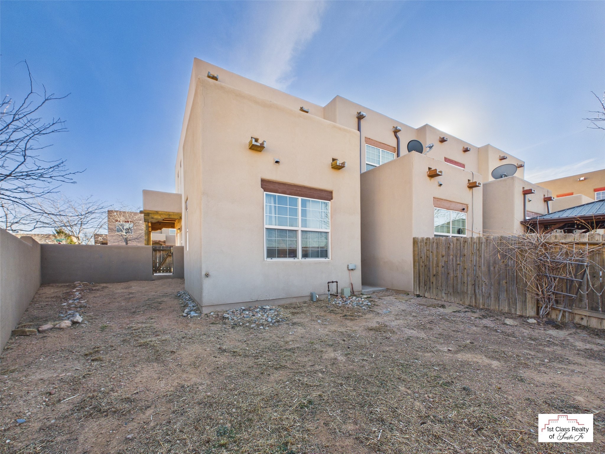 Welcome home to this contemporary pueblo-style end-unit on a corner lot in the desirable El Nido community. Light-filled interior with an open main-level living area, kitchen, and a flexible bedroom/office plus a bath. Two additional bedrooms and a full bath are located upstairs. Enjoy a private walled courtyard ideal for outdoor dining, gardening, or pets, as well as an upper deck offering expansive mountain views, sunset backdrops, and star-filled night skies. Additional features include off-street parking for two vehicles and abundant natural light throughout. Convenient south side location just minutes to SWAN Park, the Santa Fe Country Club, shopping, dining, entertainment, and the Presbyterian Medical Center. Quick access to I-25 and Hwy 599 for easy commuting to ABQ or Los Alamos. A well-kept home in a convenient area.