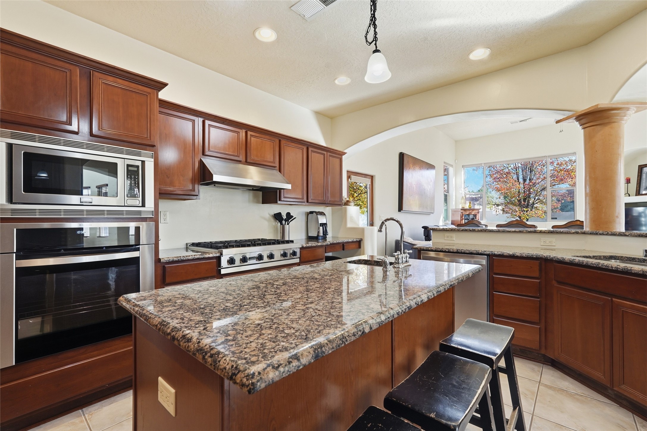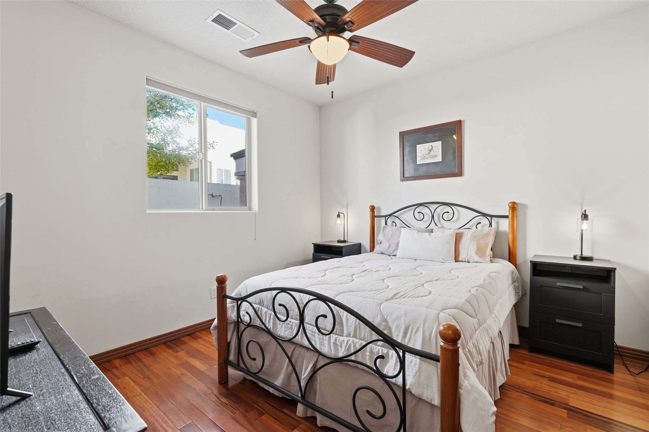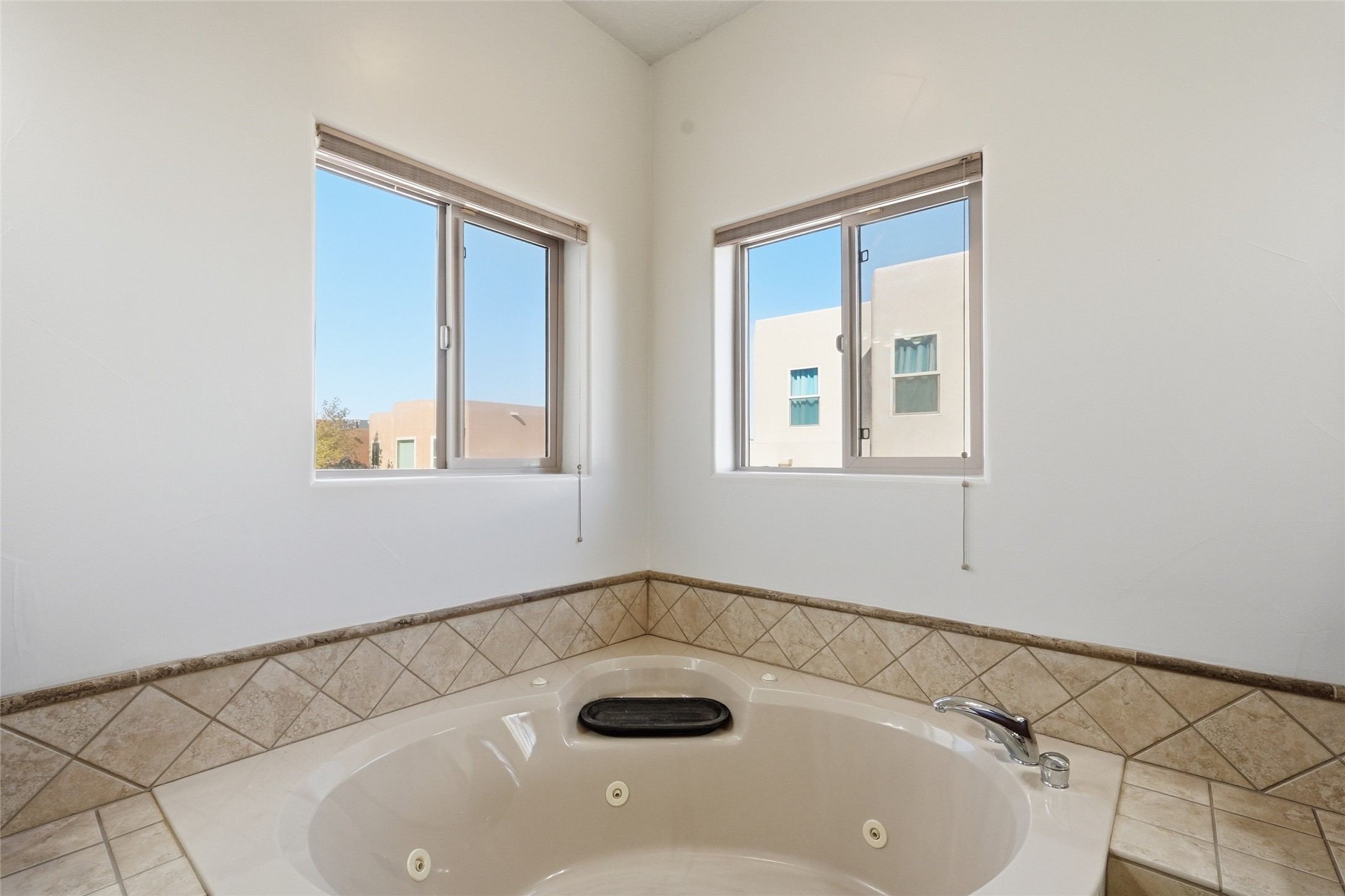 Welcome home! This beautifully maintained property in the far NE Heights truly has it all. Located on a premium lot with stunning views of the Sandia Mountains. A charming courtyard welcomes you as you enter. This home offers elegance, comfort, high ceilings and exceptional attention to detail.Featuring tile and cherry hardwood floors throughout, a chef's kitchen complete with a Viking gas cook top and spacious granite counters and kitchen island. Master bedroom has its own inside/outside fireplace on balcony. Flexible fourth room that can serve as a nursery, bedroom, gym, or office--this home is designed to fit your lifestyle.The backyard is perfect for entertaining, with garden beds, a soothing water feature, and a covered patio ideal for gatherings.Come see everything this remarkable home has to offer!