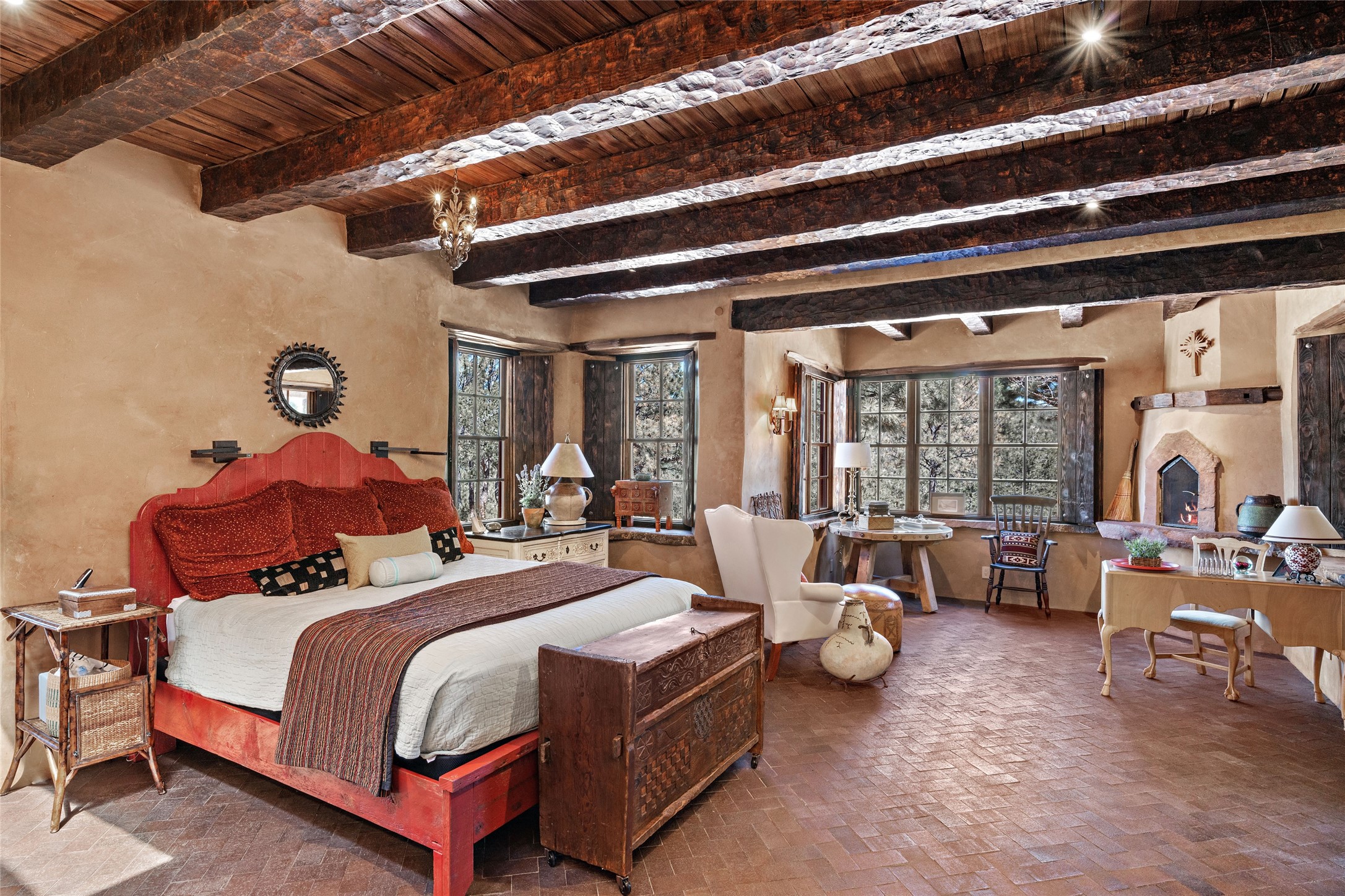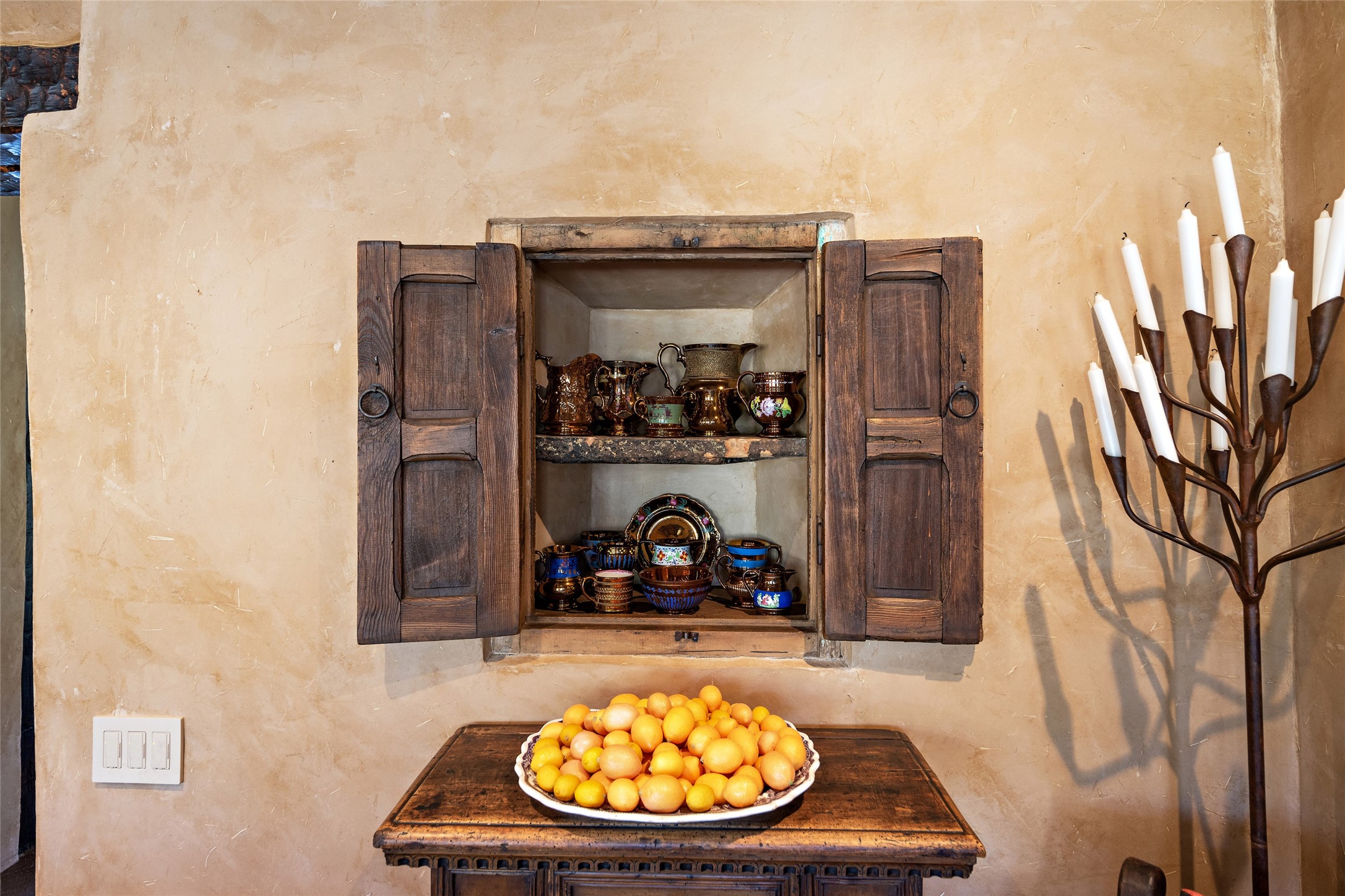 The ultimate hideaway home in Santa Fe High in the pines, fresh flower blooms, verdant grape vines and full apricots fruits beckon you to discover the bit of paradise. You are above allergies, crowds and pollution here. Through these doors, discover what is arguably the finest example of a Colonial Pueblo home in New Mexico atop very private mountain location with all the stars at night and your days filled with beautiful views. Thoughtfully designed, it boasts the finest finishes, hand-plastered double thick adobe walls, hand-carved beams with a massive 36 foot long 160-year-old Amish beam and hand carved 3 1/2 " thick doors from around the world. Windows trimmed with massive native rock, 8 heart-warming fireplaces and radiant-heated brick flooring. The spacious open floor plan features a chef's kitchen with 16 Sub-Zero drawers, Wolf appliances and an 18-foot island. Two elegant bedroom suites are well separated for privacy. An attached casita office/third en-suite bedroom offers work or guest accommodations. Spacious portals are everywhere. Gated access provides privacy and security. Three lucky vehicles are sheltered in an oversized garage with adaptable work areas. Enjoy nature and wildlife on the hiking and walking trails. This is a magical Santa Fe escape and an opportunity not to be missed just 15 minutes from the town center. Truly special.