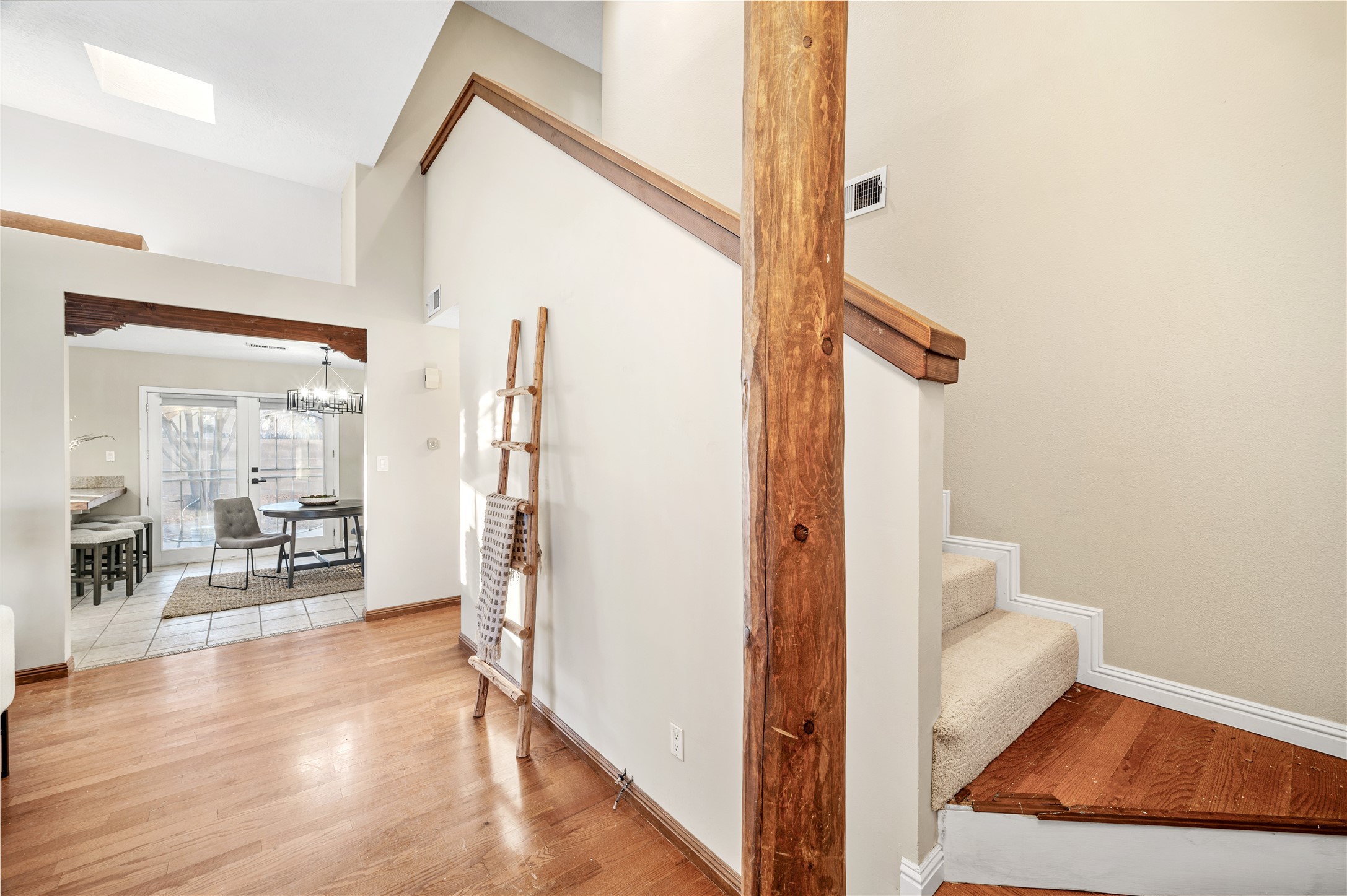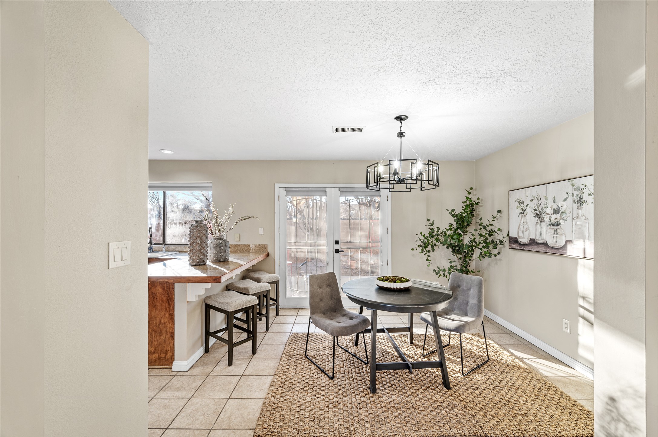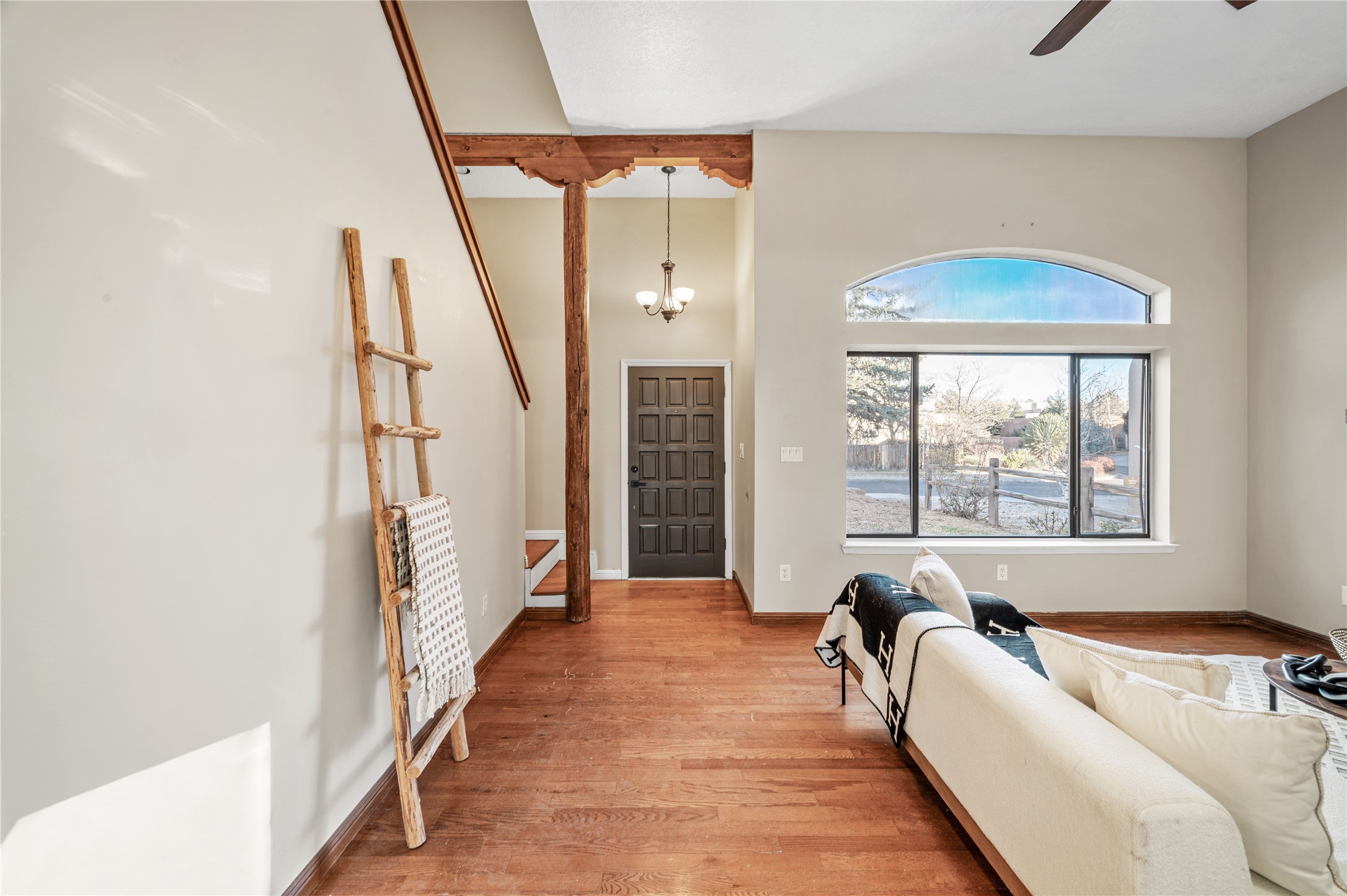 Set within a peaceful gated community, this Santa Fe home blends warm Southwest style with modern comfort. Soaring ceilings, exposed wood beams, and abundant natural light create an inviting and refined living space. The flexible layout features a main-level primary suite with private French doors opening to the backyard, plus an upstairs en-suite with a secluded balcony for quiet retreat. The kitchen flows into a bright dining area overlooking the outdoor living spaces. Outside, enjoy multiple patios, mature trees, and natural landscaping that offer room to relax or entertain. Nestled in a quiet cul-de-sac, this home captures timeless Santa Fe charm with everyday livability. Explore this home in person and experience its unique setting and design.