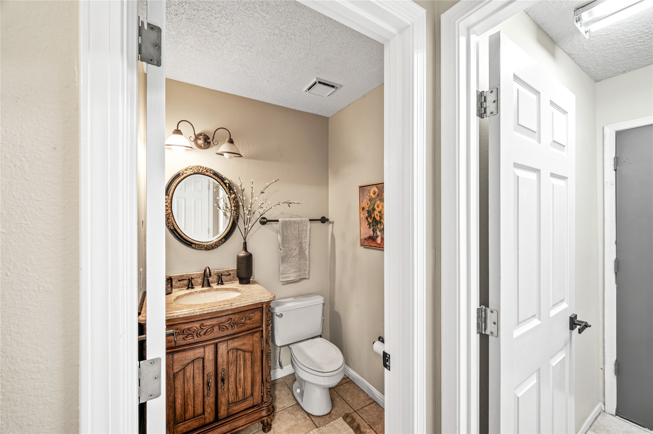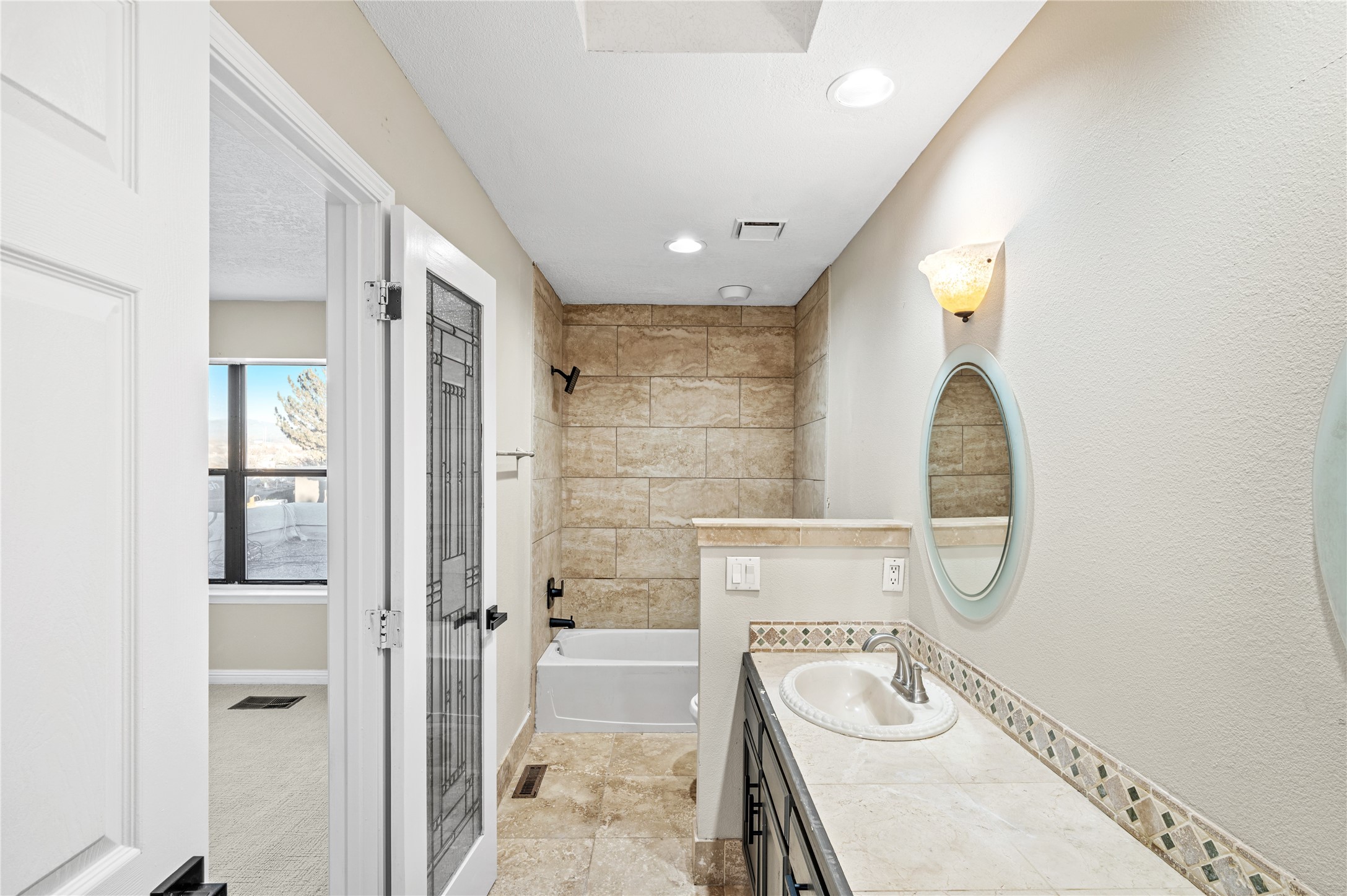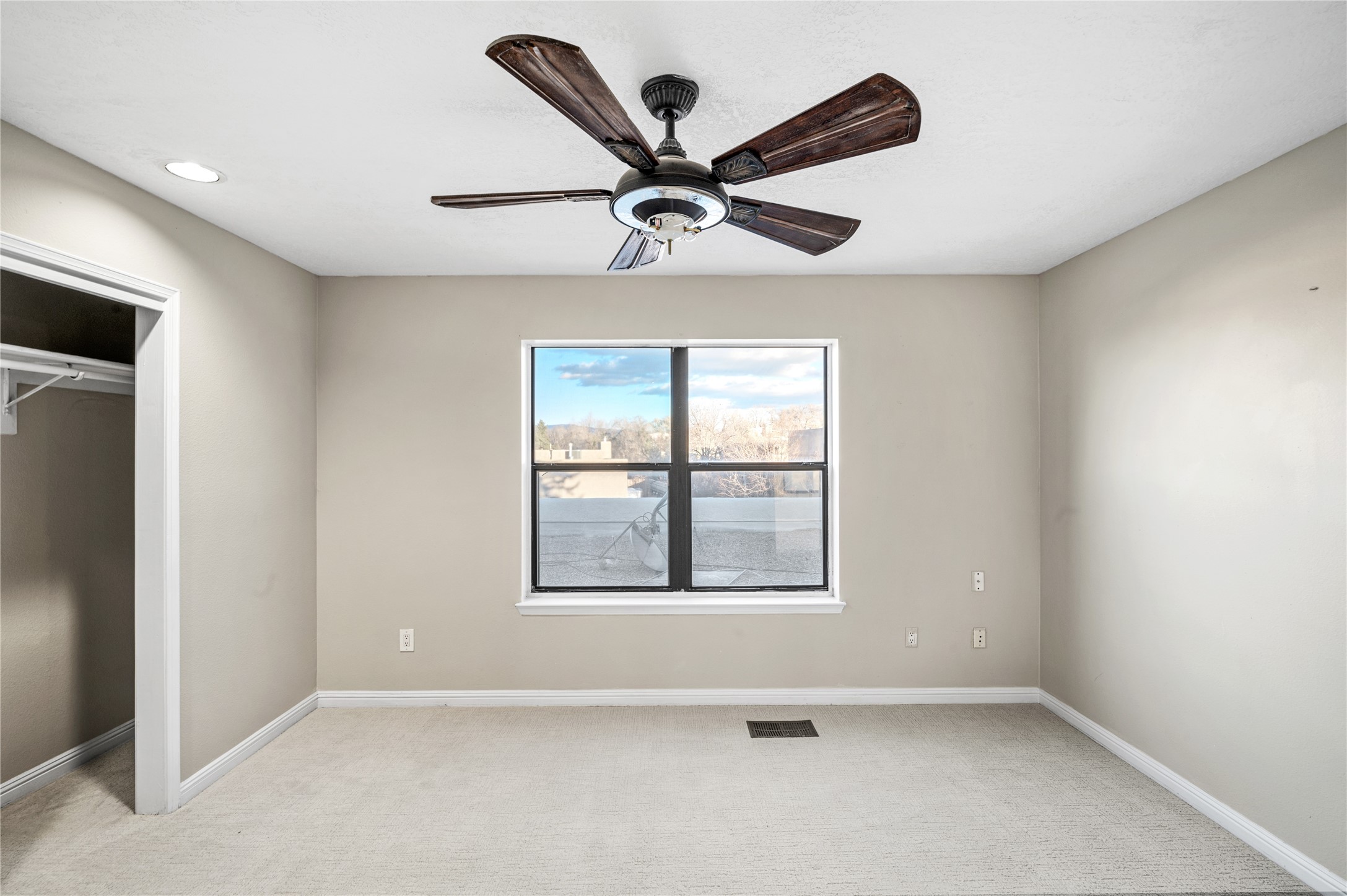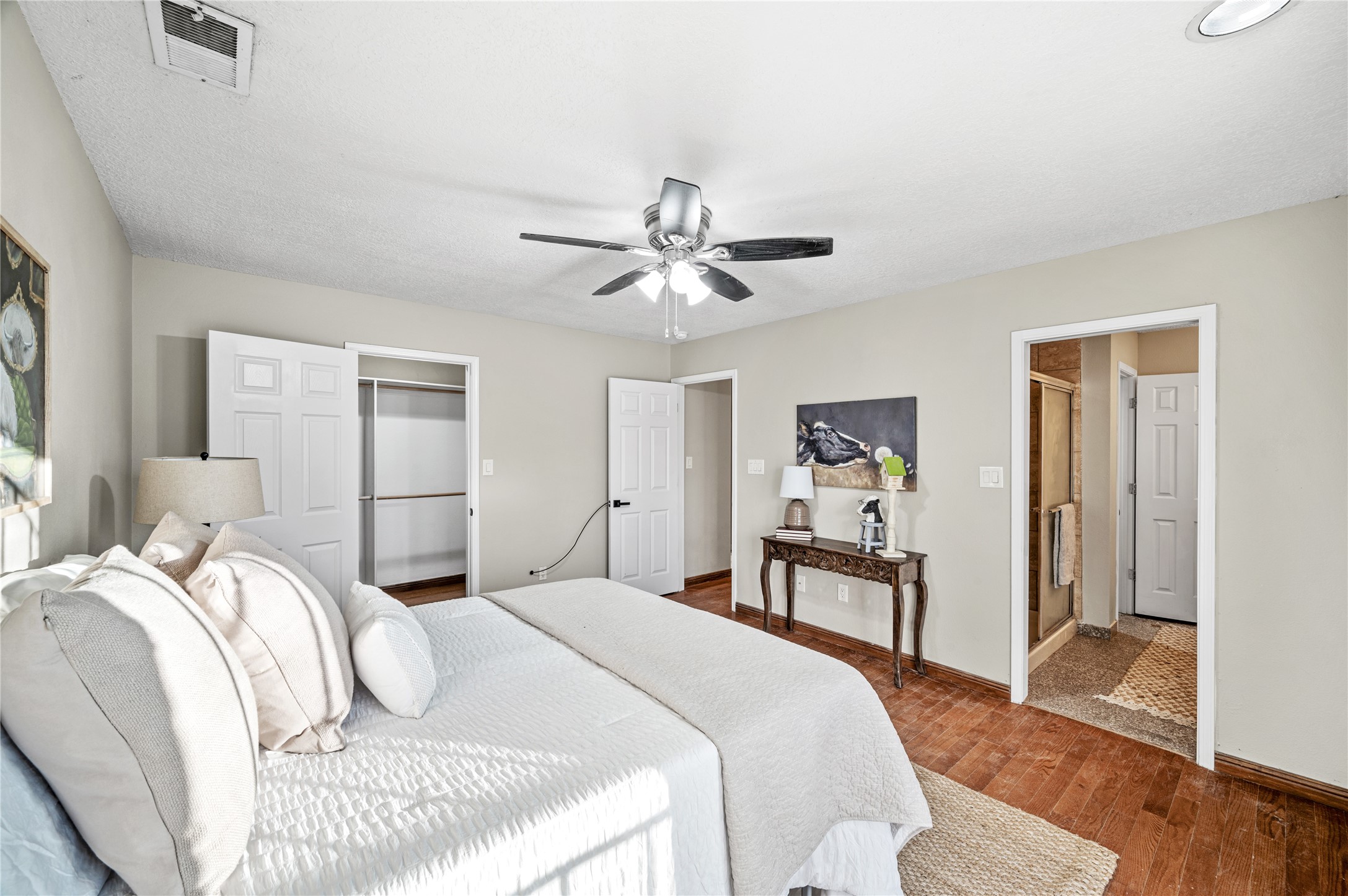 Set within a peaceful gated community, this Santa Fe home blends warm Southwest style with modern comfort. Soaring ceilings, exposed wood beams, and abundant natural light create an inviting and refined living space. The flexible layout features a main-level primary suite with private French doors opening to the backyard, plus an upstairs en-suite with a secluded balcony for quiet retreat. The kitchen flows into a bright dining area overlooking the outdoor living spaces. Outside, enjoy multiple patios, mature trees, and natural landscaping that offer room to relax or entertain. Nestled in a quiet cul-de-sac, this home captures timeless Santa Fe charm with everyday livability. Explore this home in person and experience its unique setting and design.