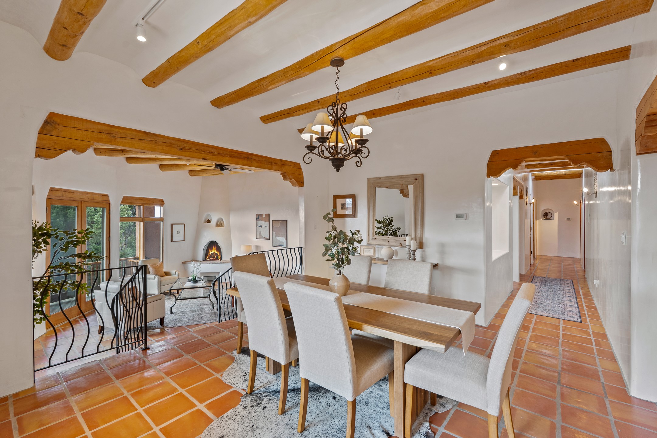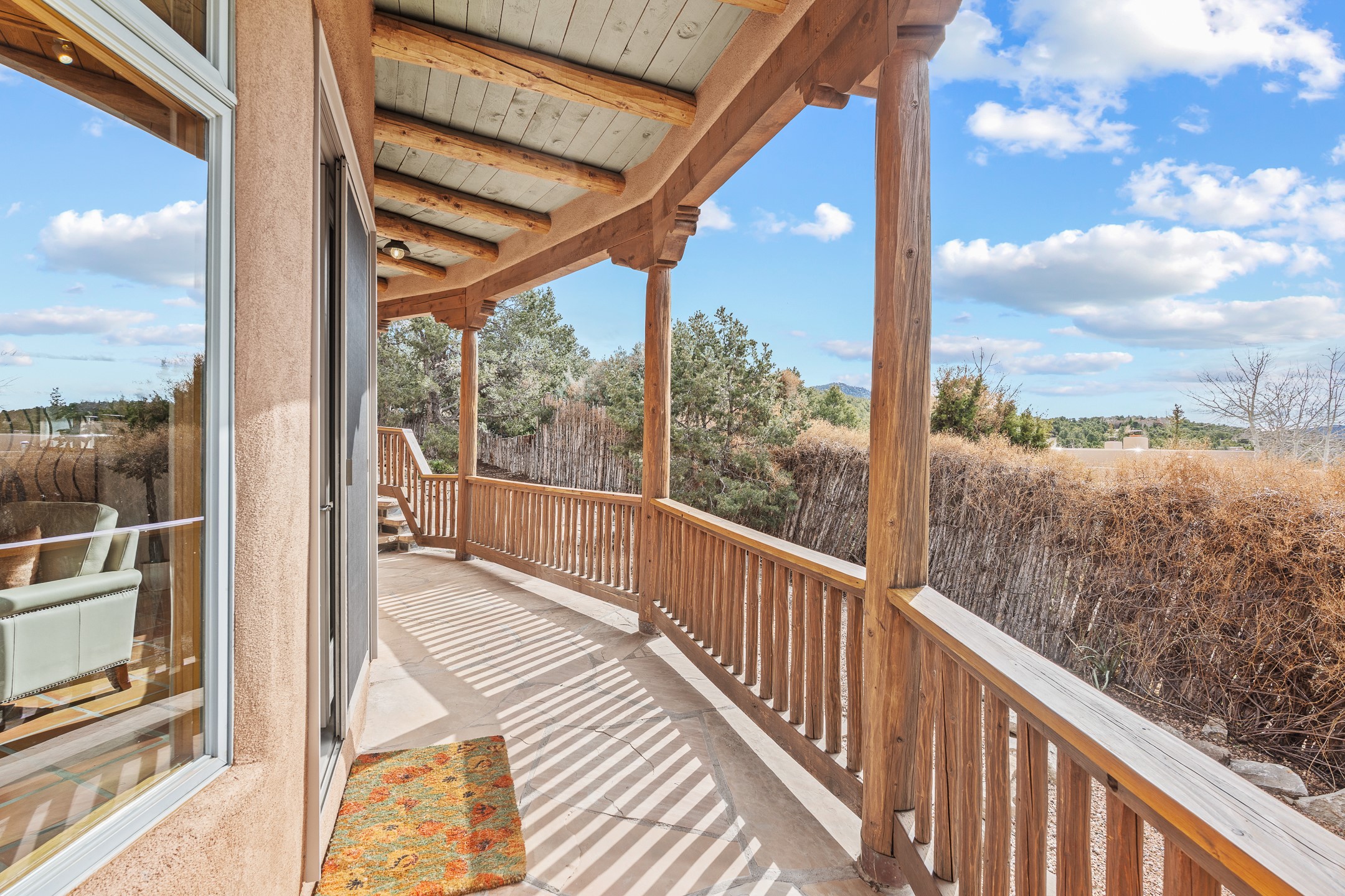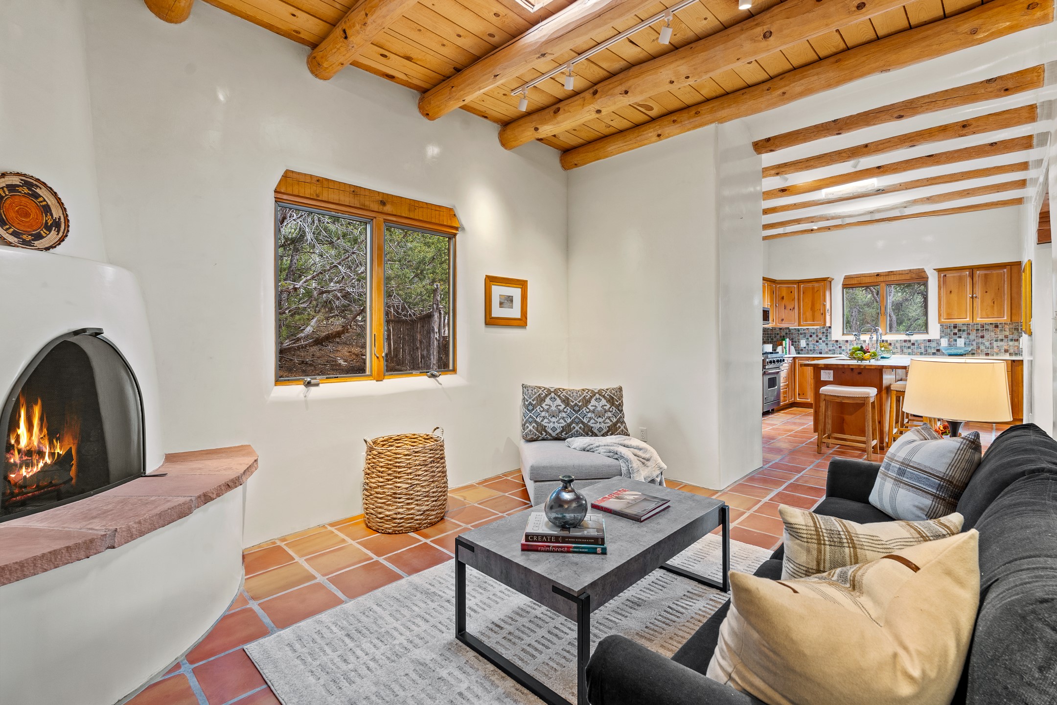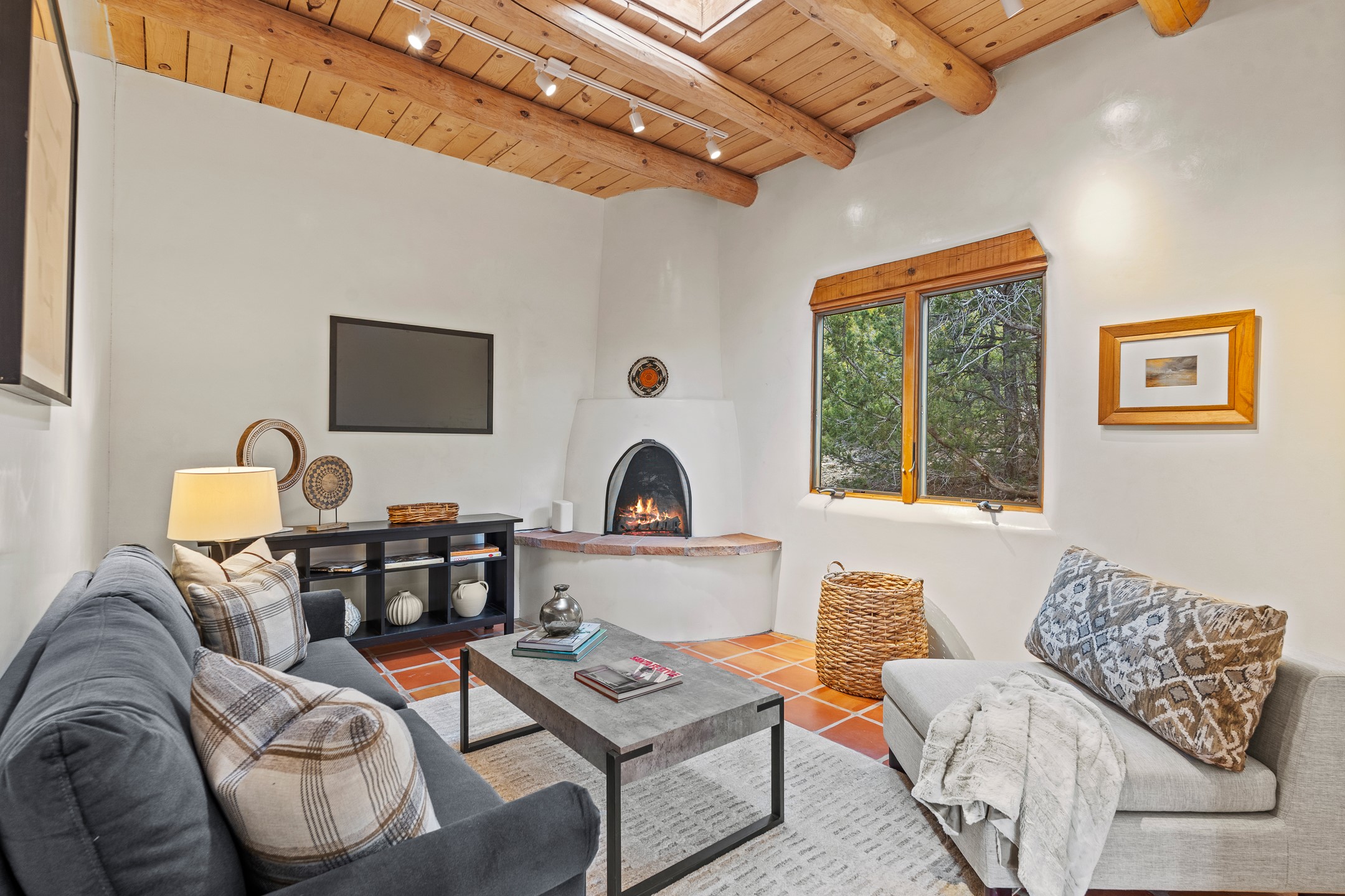 Located on a quiet cul-de-sac in the desirable Cerros Colorados neighborhood, this beautifully renovated 2,693 sq. ft. home sits on 0.58 acres with sunset and Sandia mountain views. Just 10 minutes to the Plaza and directly adjacent to the Dale Ball Trail system, this residence offers the perfect blend of natural beauty, privacy, and accessibility. Renovated down to the studs between 2022-2024, the home is filled with handcrafted Southwestern details--high viga ceilings, white hand-troweled plaster walls, coved ceilings, and a custom Indonesian front door. The main South-facing living area features a kiva fireplace and opens to a wraparound portal for seamless indoor-outdoor living. The kitchen is outfitted with white stone countertops, a butcher block island with prep sink, Viking range, Sub-Zero refrigerator, and bar seating--ideal for gatherings. A cozy den with its own kiva fireplace sits just off the kitchen. The private primary suite is located in the southwest corner with a balcony for stargazing and sunset views, one large West-facing banco and a spa-like bath with a clawfoot soaking tub, walk-in shower, and a generous walk-in closet. Two guest bedrooms and a full bath are located on the north side of the home, along with a large laundry room. A central powder room includes an additional shower for flexible guest use. A stairway leads to a heated 700 sq. ft. garage, perfect for storage, studio, or workshop needs. This property is a rare offering--artful, serene, and reimagined for modern Santa Fe living.