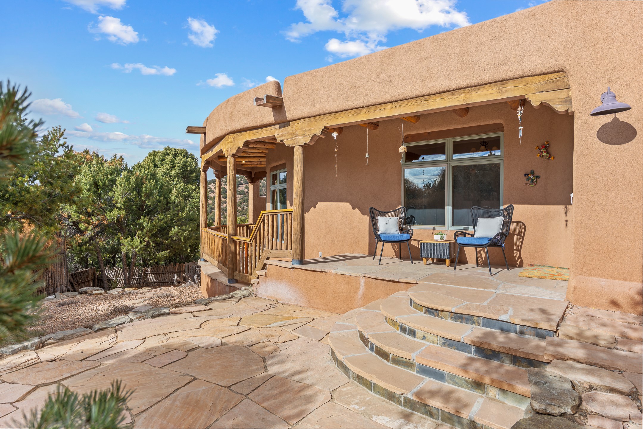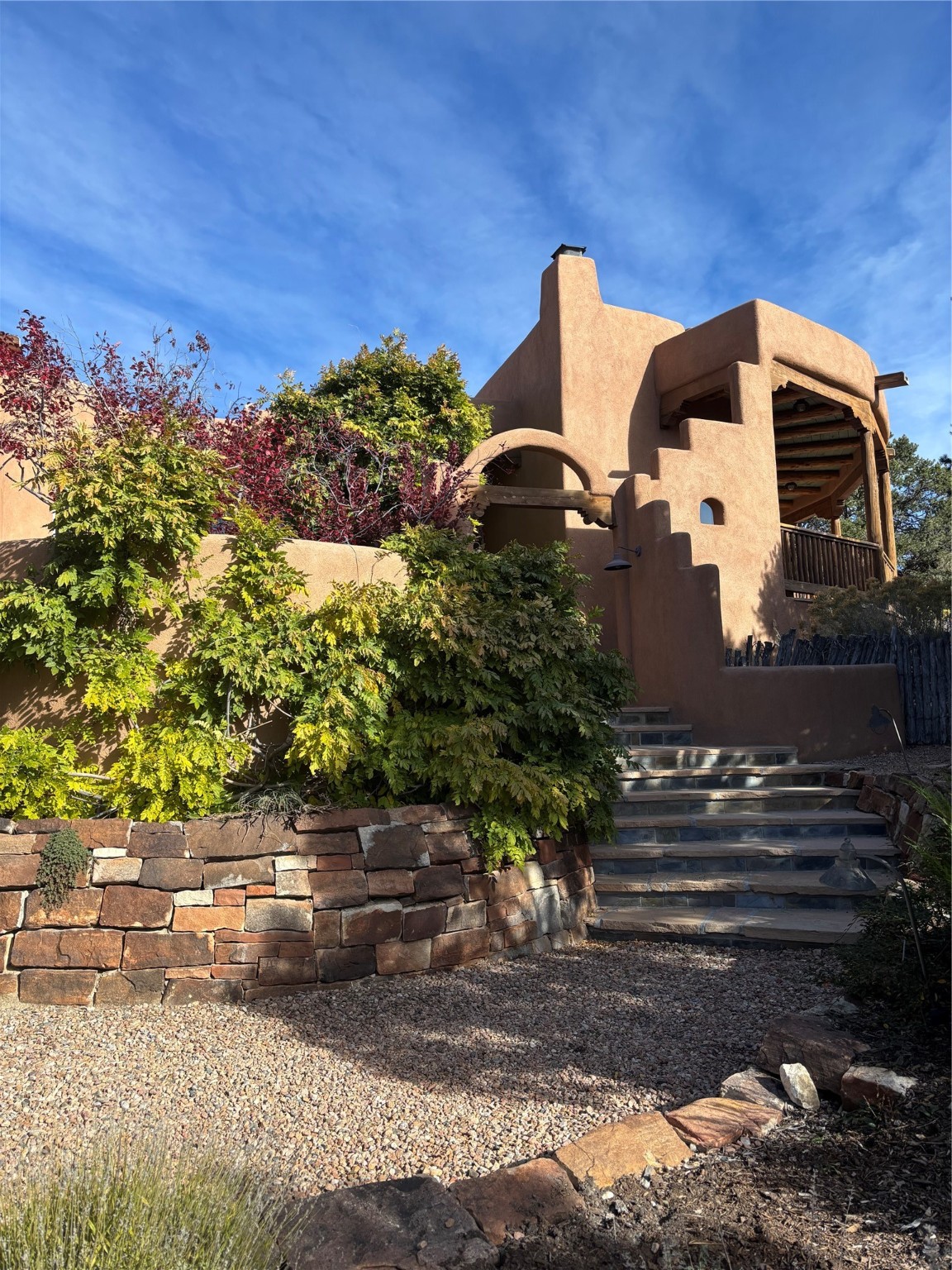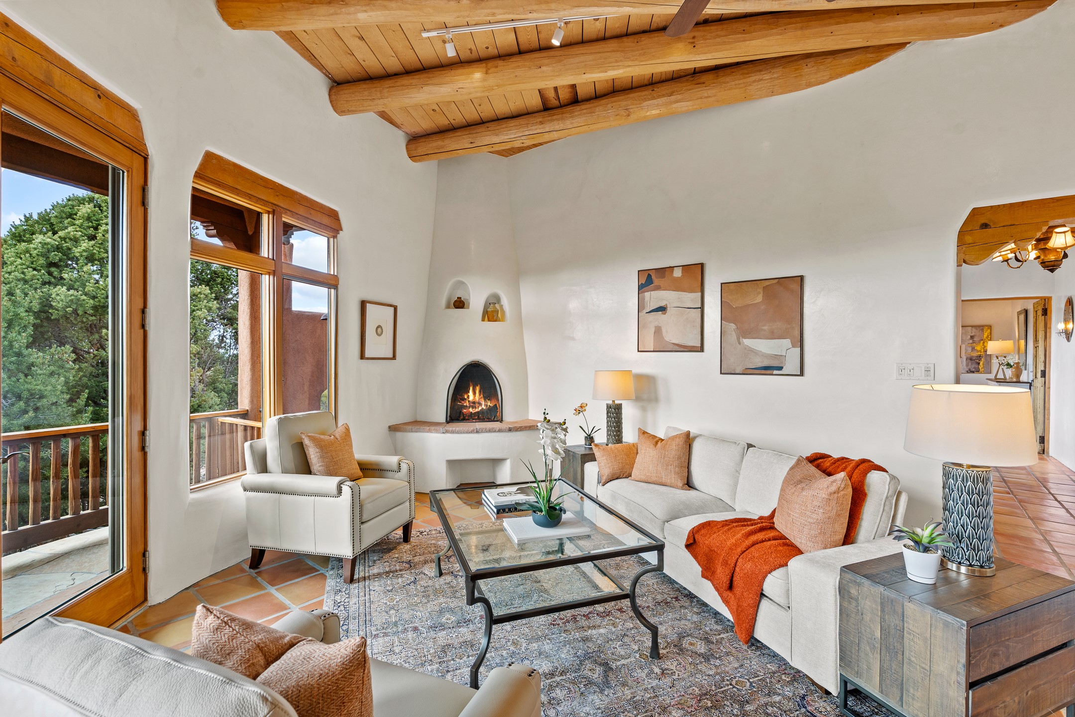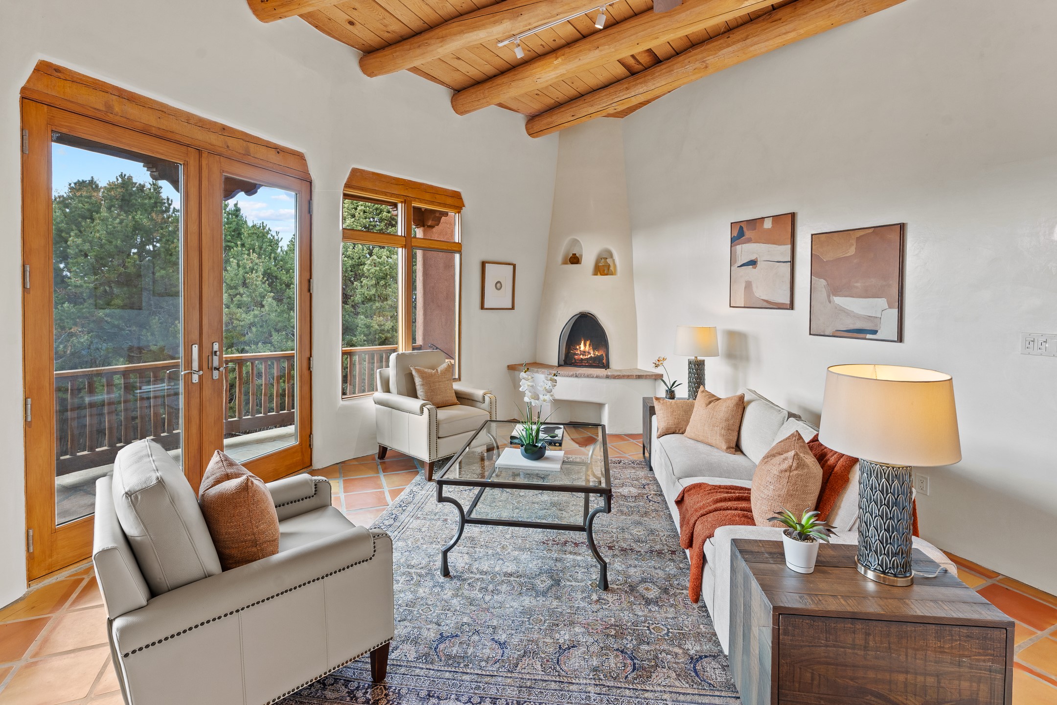 Located on a quiet cul-de-sac in the desirable Cerros Colorados neighborhood, this beautifully renovated 2,693 sq. ft. home sits on 0.58 acres with sunset and Sandia mountain views. Just 10 minutes to the Plaza and directly adjacent to the Dale Ball Trail system, this residence offers the perfect blend of natural beauty, privacy, and accessibility. Renovated down to the studs between 2022-2024, the home is filled with handcrafted Southwestern details--high viga ceilings, white hand-troweled plaster walls, coved ceilings, and a custom Indonesian front door. The main South-facing living area features a kiva fireplace and opens to a wraparound portal for seamless indoor-outdoor living. The kitchen is outfitted with white stone countertops, a butcher block island with prep sink, Viking range, Sub-Zero refrigerator, and bar seating--ideal for gatherings. A cozy den with its own kiva fireplace sits just off the kitchen. The private primary suite is located in the southwest corner with a balcony for stargazing and sunset views, one large West-facing banco and a spa-like bath with a clawfoot soaking tub, walk-in shower, and a generous walk-in closet. Two guest bedrooms and a full bath are located on the north side of the home, along with a large laundry room. A central powder room includes an additional shower for flexible guest use. A stairway leads to a heated 700 sq. ft. garage, perfect for storage, studio, or workshop needs. This property is a rare offering--artful, serene, and reimagined for modern Santa Fe living.