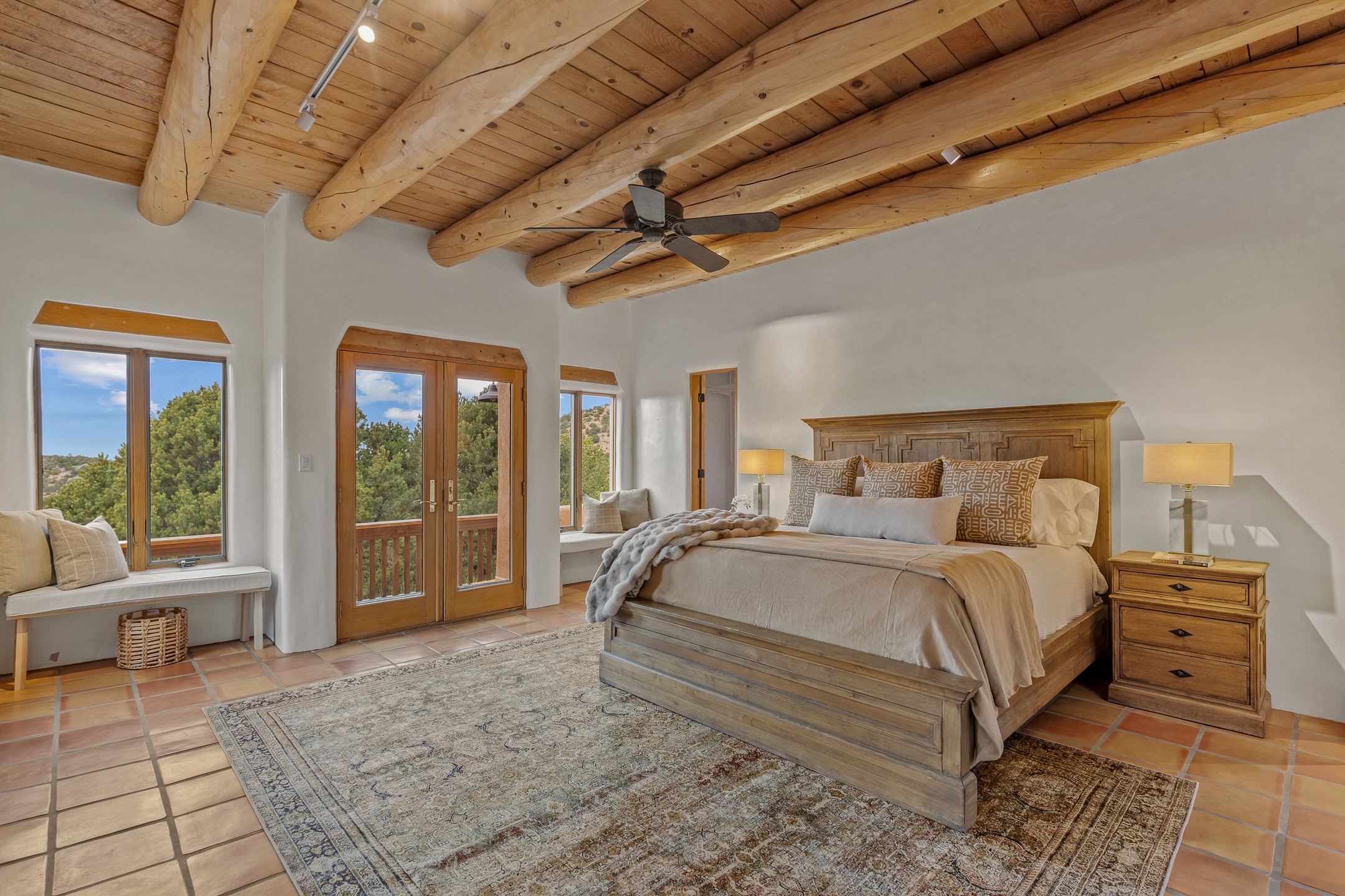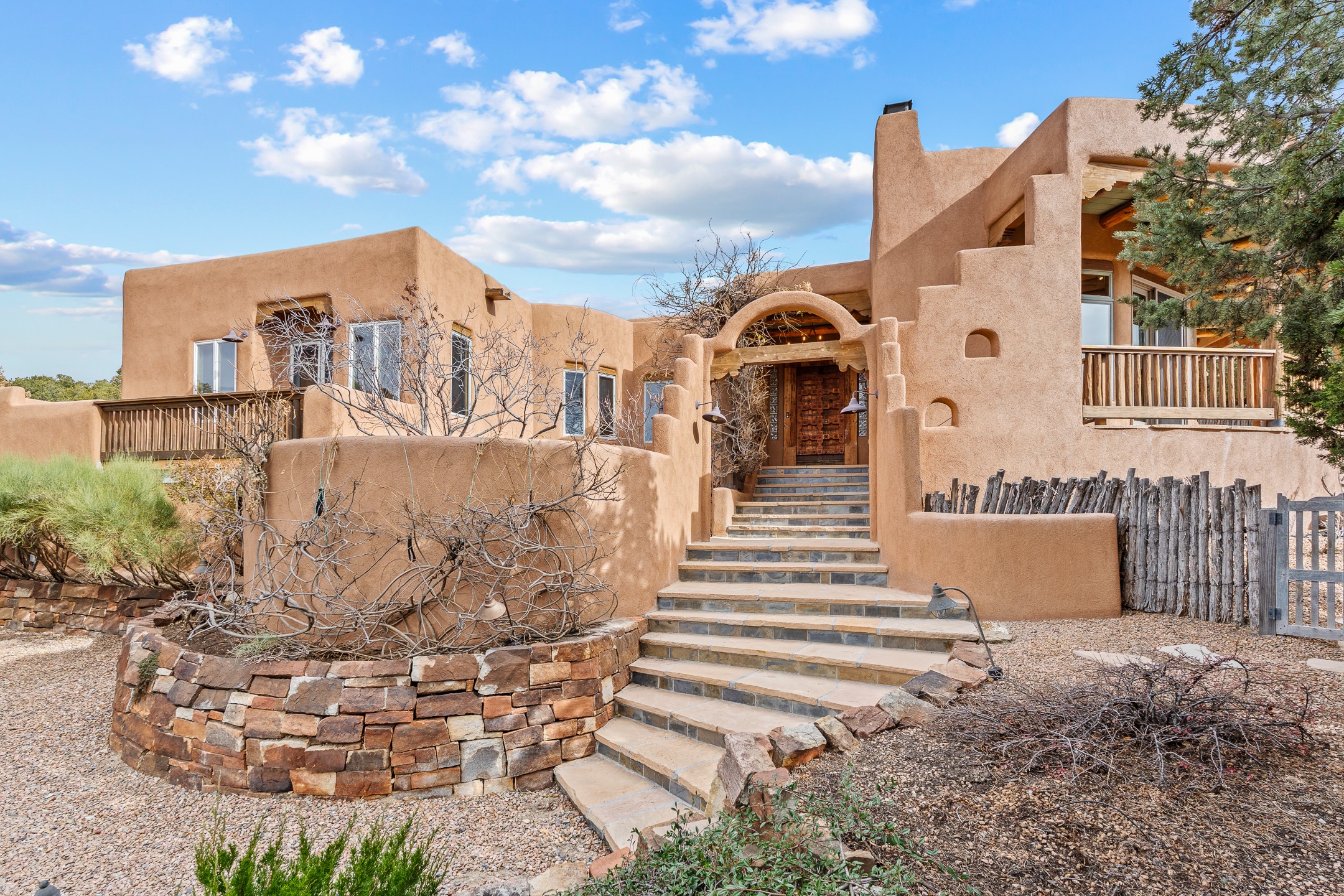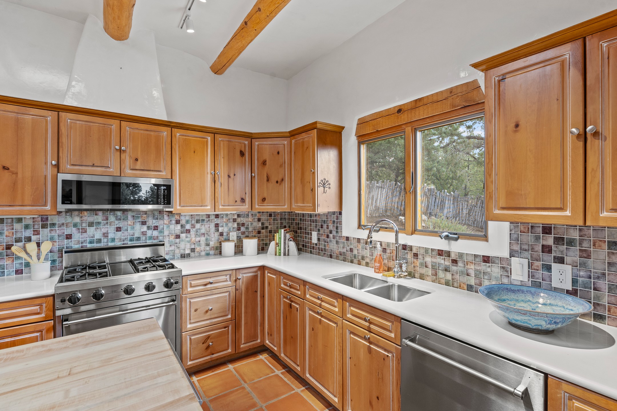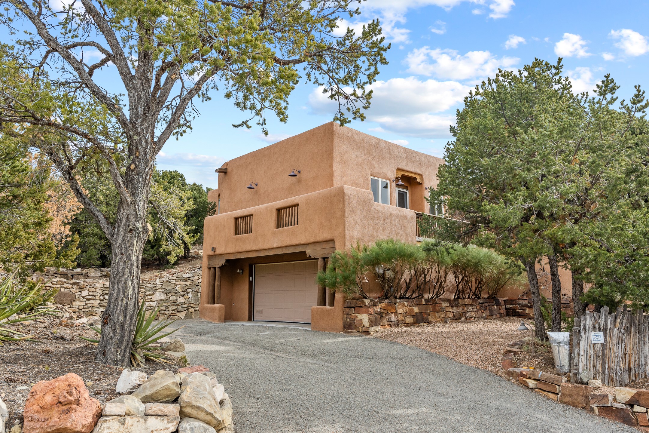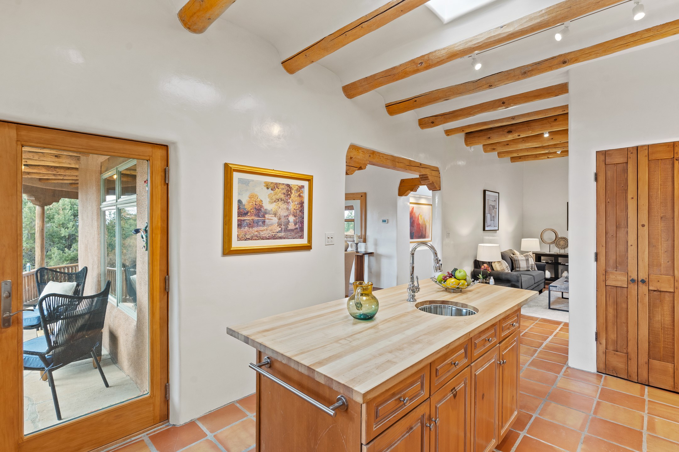 Located on a quiet cul-de-sac in the desirable Cerros Colorados neighborhood, this beautifully renovated 2,693 sq. ft. home sits on 0.58 acres with sunset and Sandia mountain views. Just 10 minutes to the Plaza and directly adjacent to the Dale Ball Trail system, this residence offers the perfect blend of natural beauty, privacy, and accessibility. Renovated down to the studs between 2022-2024, the home is filled with handcrafted Southwestern details--high viga ceilings, white hand-troweled plaster walls, coved ceilings, and a custom Indonesian front door. The main South-facing living area features a kiva fireplace and opens to a wraparound portal for seamless indoor-outdoor living. The kitchen is outfitted with white stone countertops, a butcher block island with prep sink, Viking range, Sub-Zero refrigerator, and bar seating--ideal for gatherings. A cozy den with its own kiva fireplace sits just off the kitchen. The private primary suite is located in the southwest corner with a balcony for stargazing and sunset views, one large West-facing banco and a spa-like bath with a clawfoot soaking tub, walk-in shower, and a generous walk-in closet. Two guest bedrooms and a full bath are located on the north side of the home, along with a large laundry room. A central powder room includes an additional shower for flexible guest use. A stairway leads to a heated 700 sq. ft. garage, perfect for storage, studio, or workshop needs. This property is a rare offering--artful, serene, and reimagined for modern Santa Fe living.