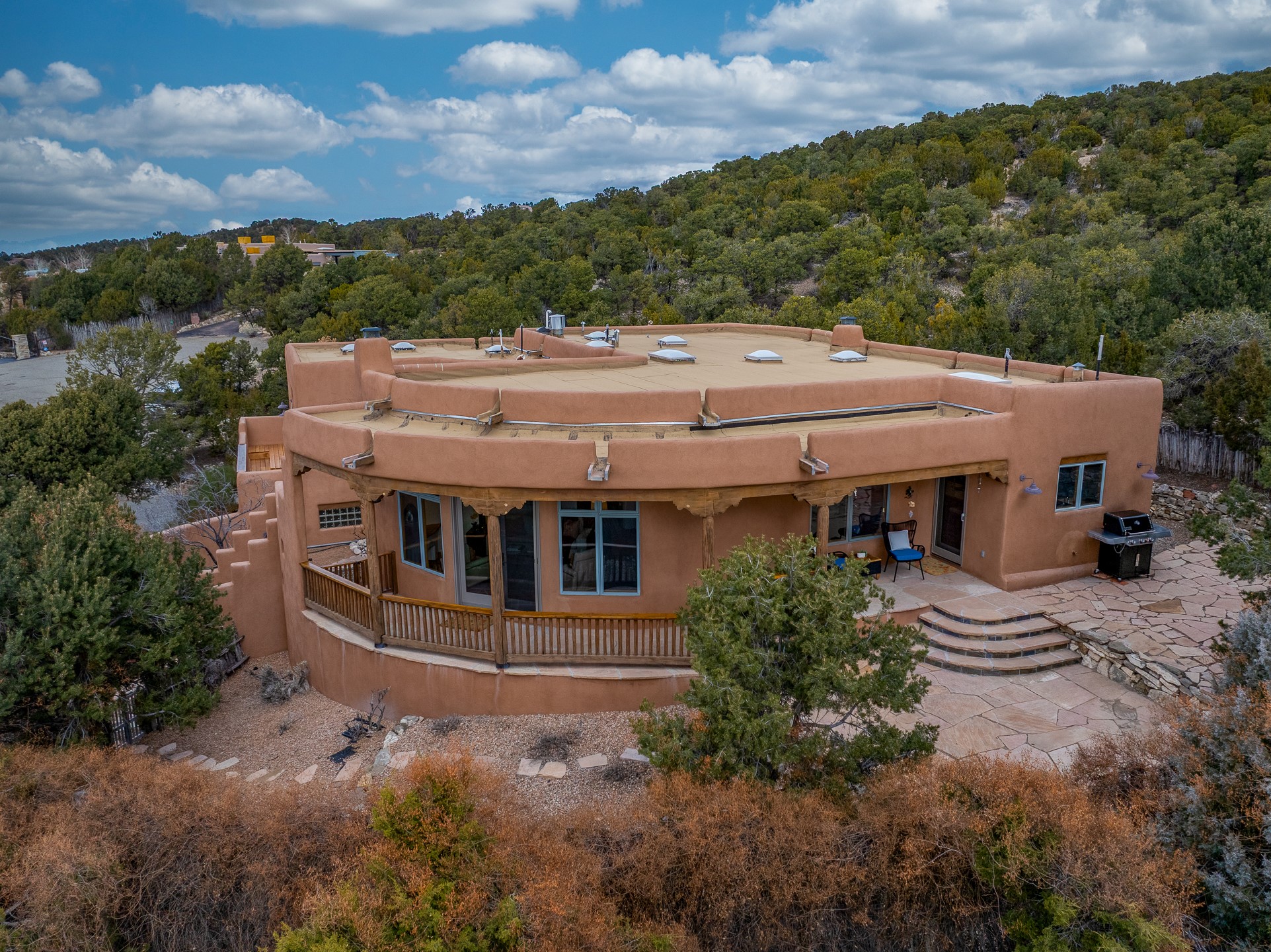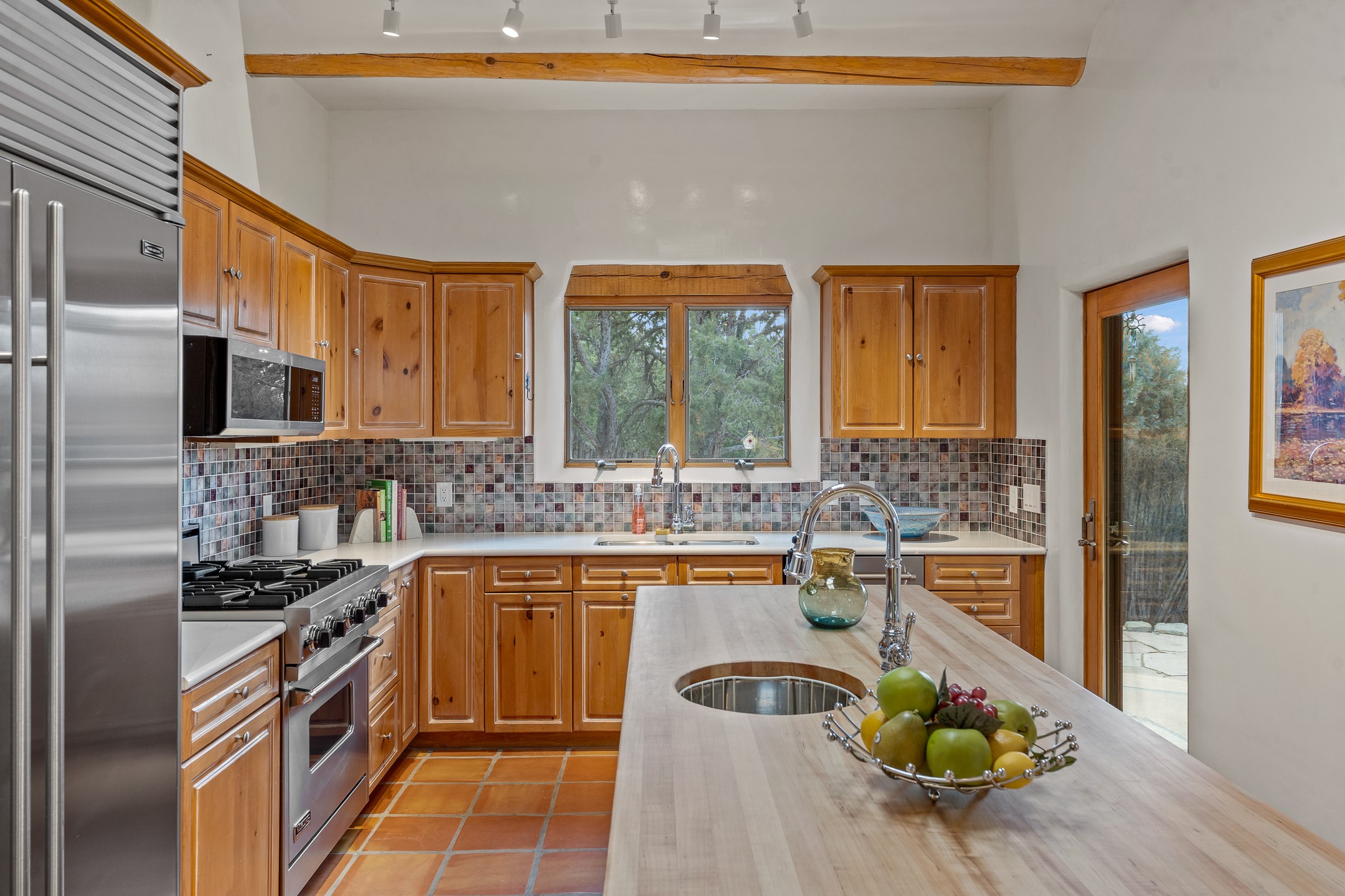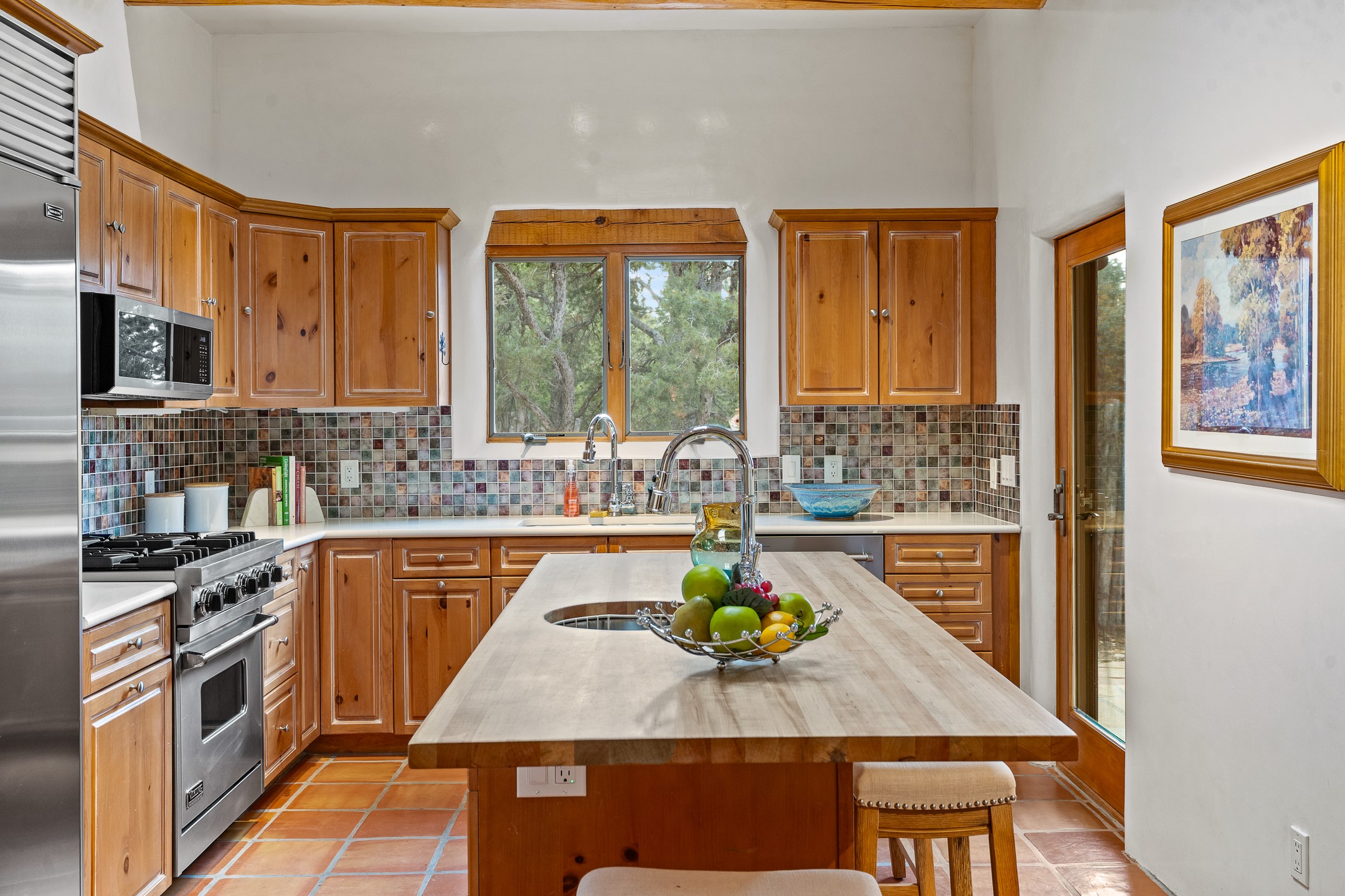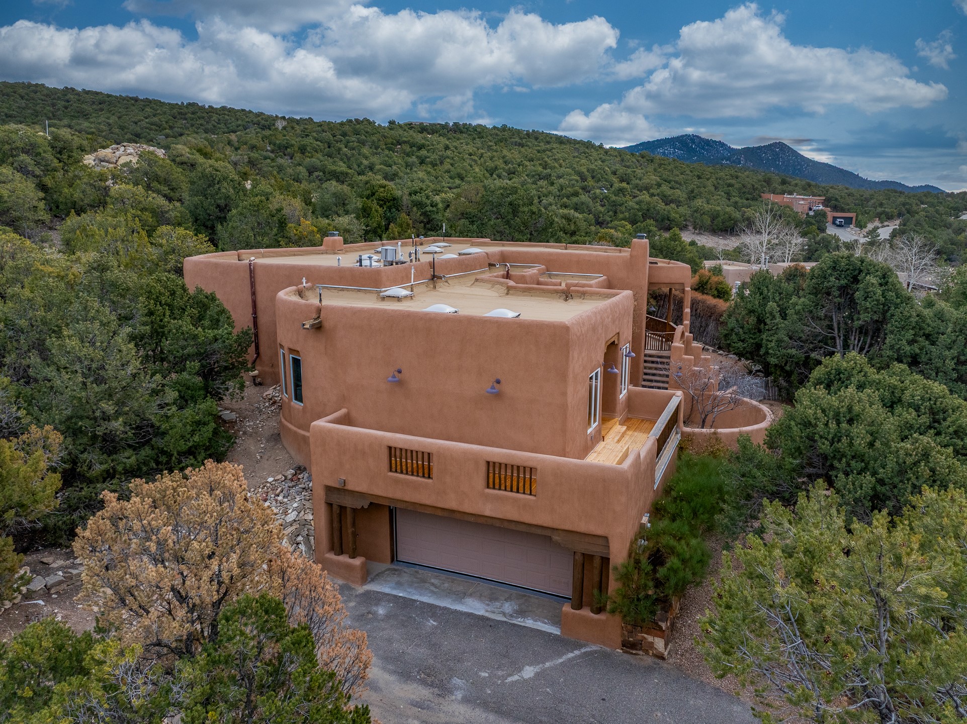 Located on a quiet cul-de-sac in the desirable Cerros Colorados neighborhood, this beautifully renovated 2,693 sq. ft. home sits on 0.58 acres with sunset and Sandia mountain views. Just 10 minutes to the Plaza and directly adjacent to the Dale Ball Trail system, this residence offers the perfect blend of natural beauty, privacy, and accessibility. Renovated down to the studs between 2022-2024, the home is filled with handcrafted Southwestern details--high viga ceilings, white hand-troweled plaster walls, coved ceilings, and a custom Indonesian front door. The main South-facing living area features a kiva fireplace and opens to a wraparound portal for seamless indoor-outdoor living. The kitchen is outfitted with white stone countertops, a butcher block island with prep sink, Viking range, Sub-Zero refrigerator, and bar seating--ideal for gatherings. A cozy den with its own kiva fireplace sits just off the kitchen. The private primary suite is located in the southwest corner with a balcony for stargazing and sunset views, one large West-facing banco and a spa-like bath with a clawfoot soaking tub, walk-in shower, and a generous walk-in closet. Two guest bedrooms and a full bath are located on the north side of the home, along with a large laundry room. A central powder room includes an additional shower for flexible guest use. A stairway leads to a heated 700 sq. ft. garage, perfect for storage, studio, or workshop needs. This property is a rare offering--artful, serene, and reimagined for modern Santa Fe living.