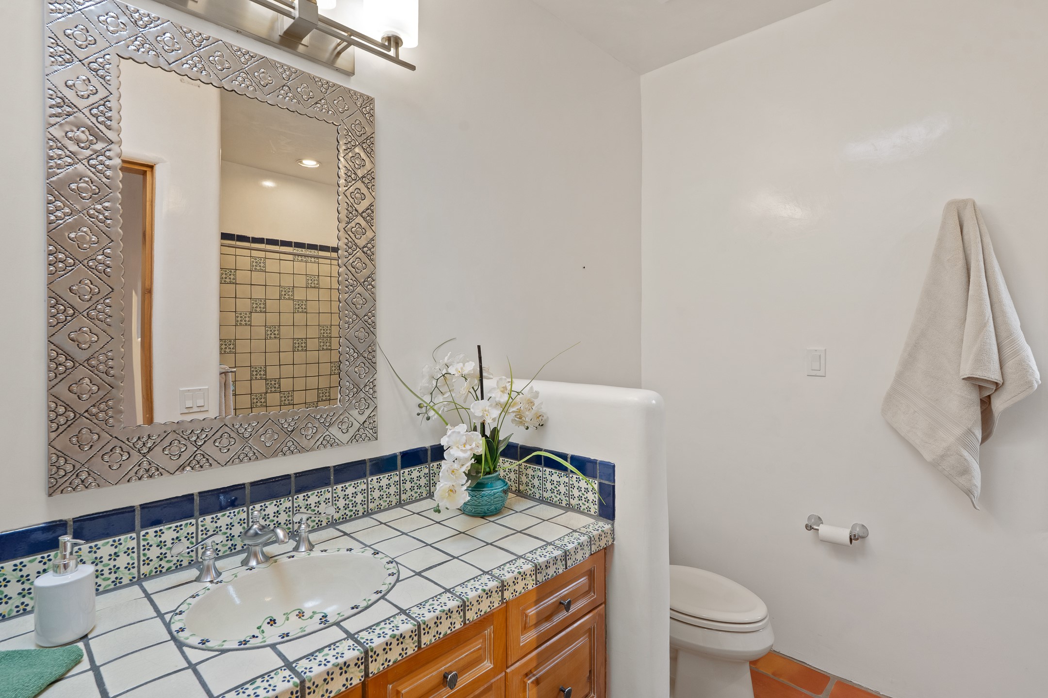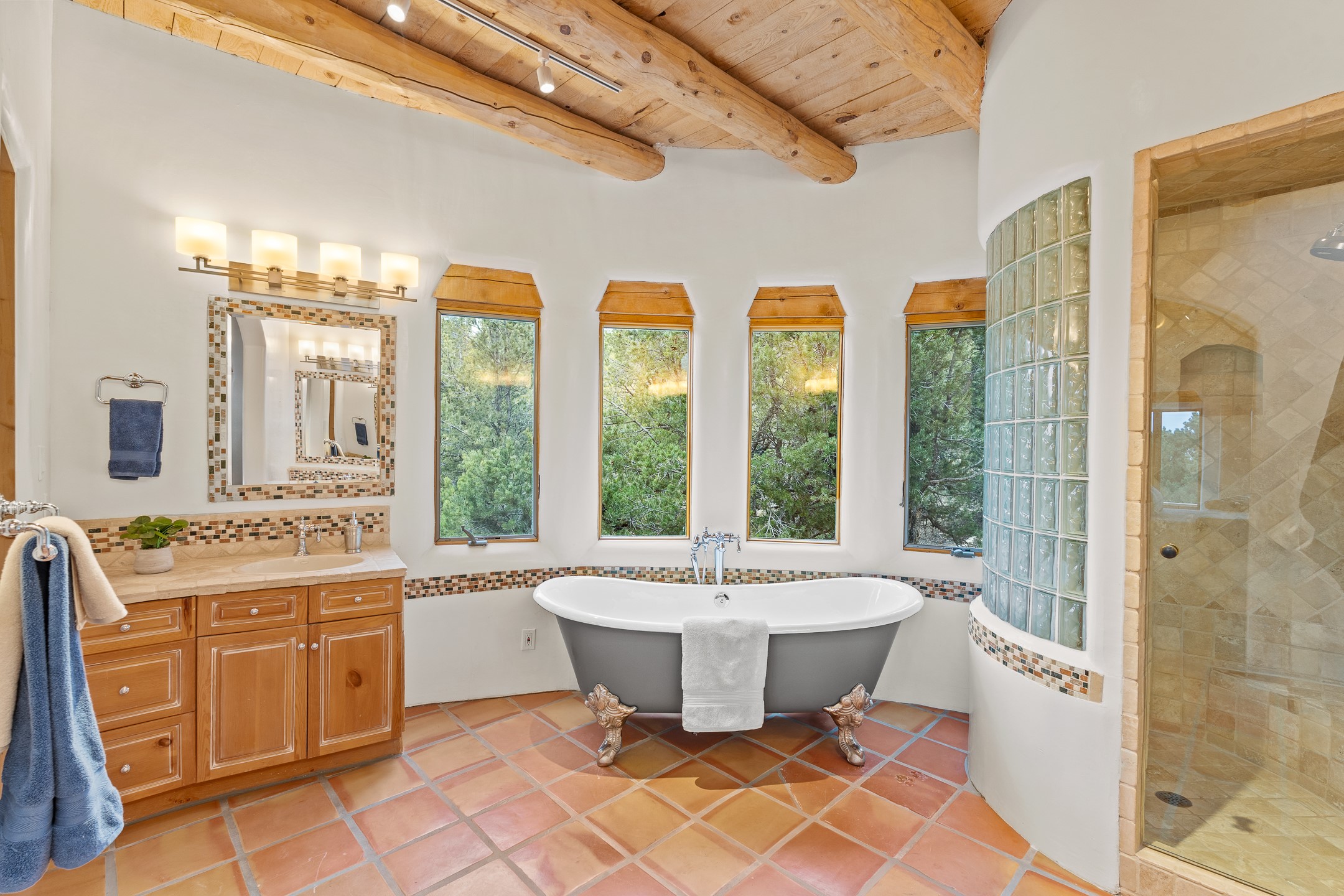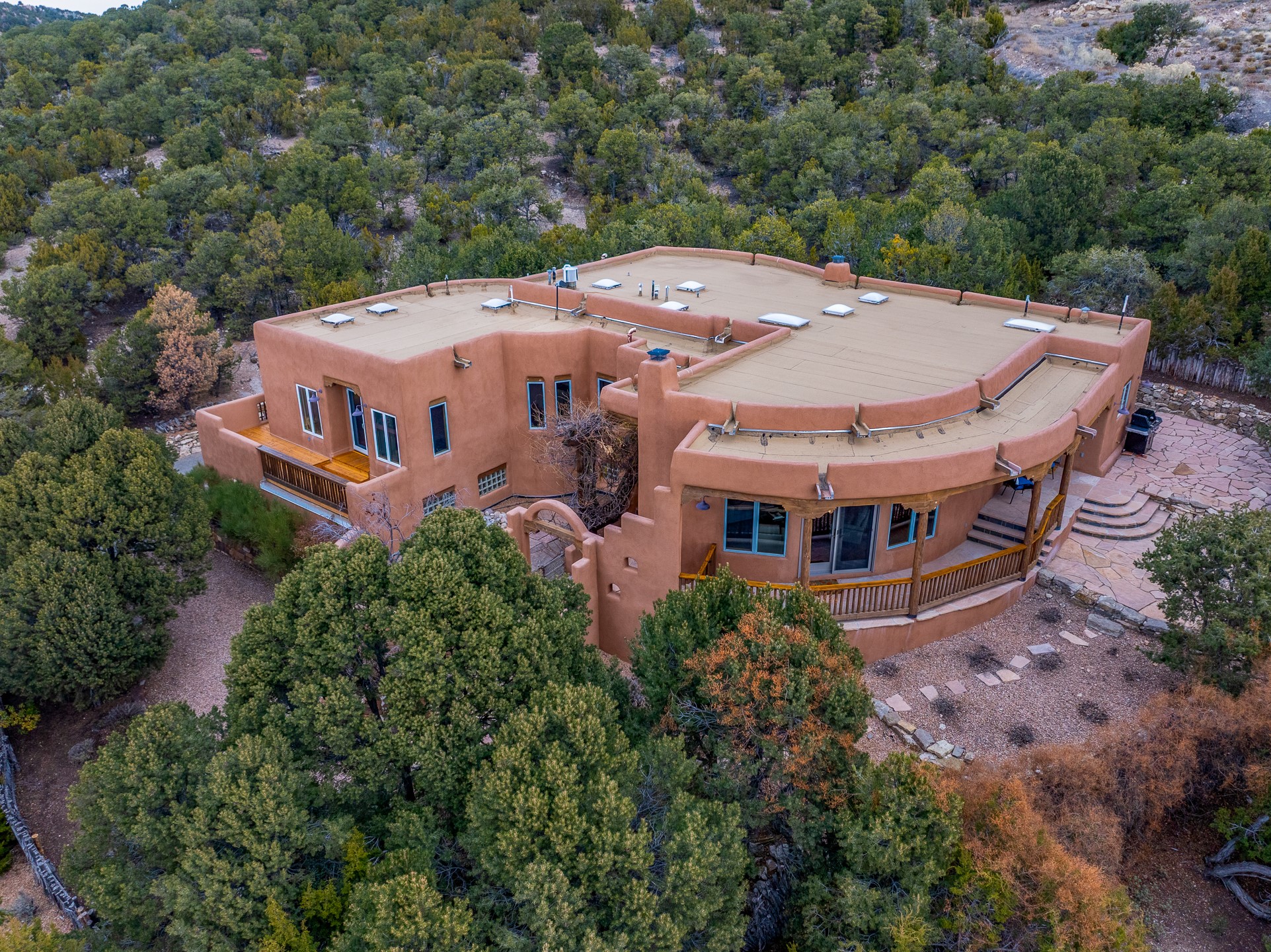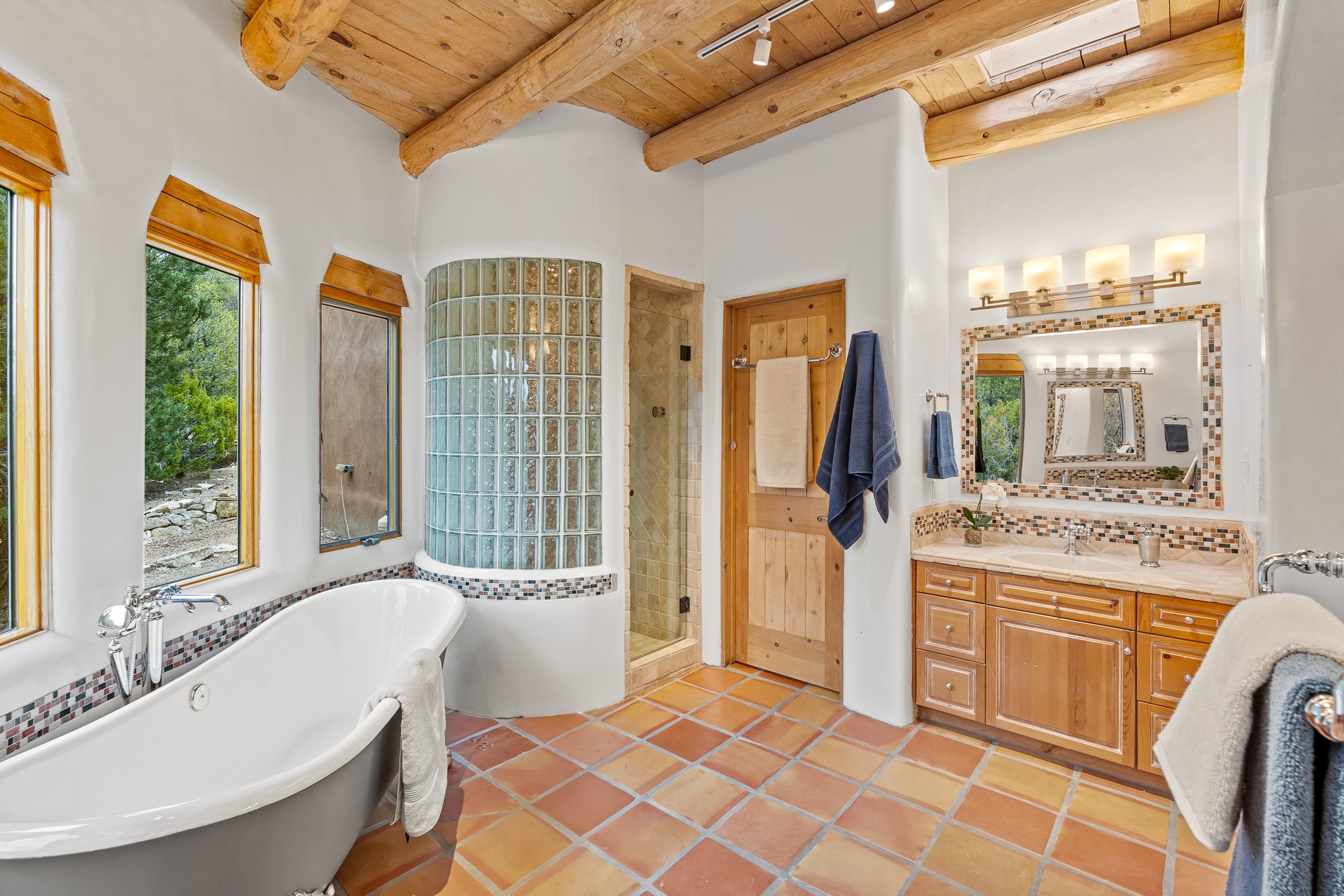 Located on a quiet cul-de-sac in the desirable Cerros Colorados neighborhood, this beautifully renovated 2,693 sq. ft. home sits on 0.58 acres with sunset and Sandia mountain views. Just 10 minutes to the Plaza and directly adjacent to the Dale Ball Trail system, this residence offers the perfect blend of natural beauty, privacy, and accessibility. Renovated down to the studs between 2022-2024, the home is filled with handcrafted Southwestern details--high viga ceilings, white hand-troweled plaster walls, coved ceilings, and a custom Indonesian front door. The main South-facing living area features a kiva fireplace and opens to a wraparound portal for seamless indoor-outdoor living. The kitchen is outfitted with white stone countertops, a butcher block island with prep sink, Viking range, Sub-Zero refrigerator, and bar seating--ideal for gatherings. A cozy den with its own kiva fireplace sits just off the kitchen. The private primary suite is located in the southwest corner with a balcony for stargazing and sunset views, one large West-facing banco and a spa-like bath with a clawfoot soaking tub, walk-in shower, and a generous walk-in closet. Two guest bedrooms and a full bath are located on the north side of the home, along with a large laundry room. A central powder room includes an additional shower for flexible guest use. A stairway leads to a heated 700 sq. ft. garage, perfect for storage, studio, or workshop needs. This property is a rare offering--artful, serene, and reimagined for modern Santa Fe living.