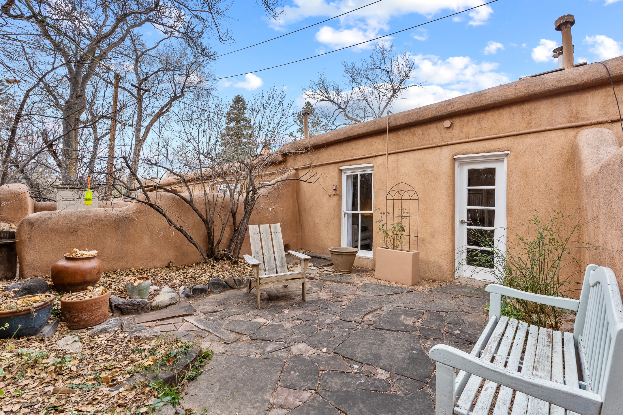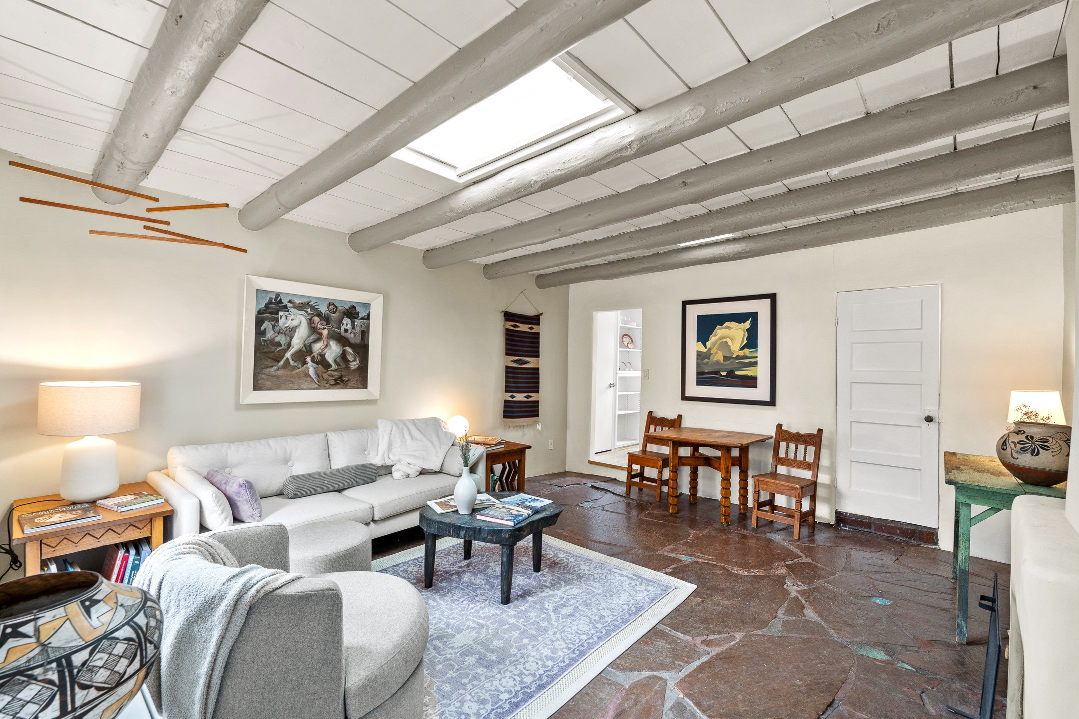 Tucked in the storied Webster Compound on Garcia Street, this enchanting adobe retreat offers a rare opportunity to live within one of Santa Fe's most culturally significant enclaves. Part of an artist colony that nurtured writers, poets, and painters. This timeless residence is more than a home. It's a connection point to Santa Fe's creative soul.Flagstone floors, hand-plastered walls, skylights, and vigas create an atmosphere that feels both grounding and uplifting, an old-world sanctuary shaped by nearly a century of history. The great room centers around an inviting kiva fireplace, its soft glow anchoring the space whether you are relaxing, dreaming, or creating. Doors and divided-light windows open to a south-facing walled garden where winter sunlight warms the adobe and summer trees cast delicate shade. The patio, lilac tree, and serene enclosure evoke the feeling of a hidden courtyard in a far-off place.The newer owner will step into a lineage. Willa Cather, Arthur Sze, Ramona Sakiestewa, Stanley Noyes, and Kon Tiki author Thor Heyerdahl once lived and created within this very compound, shaping works that traveled far beyond Santa Fe. There is a quiet hum of inspiration that lingers on these grounds, and the new steward of this residence will feel it immediately. This home whispers a sweet lullaby.The kitchen blends traditional charm with modern usefulness. Oak floors, stainless steel appliances, custom cabinets, pantry space, and a generous wood countertop. The full bath features classic Mexican tile. With a design that welcomes both simplicity and depth, the home becomes an ideal escape for contemplation, creativity, and renewal.Just moments from Downtown Subscription, Canyon Road, Garcia Street Books, Museum Hill, hiking trails, and the Plaza, this location is quintessential Eastside living, with treed lanes, intimate beauty, and the sense of belonging to a part of Santa Fe that still breathes with history, art, and human connection.