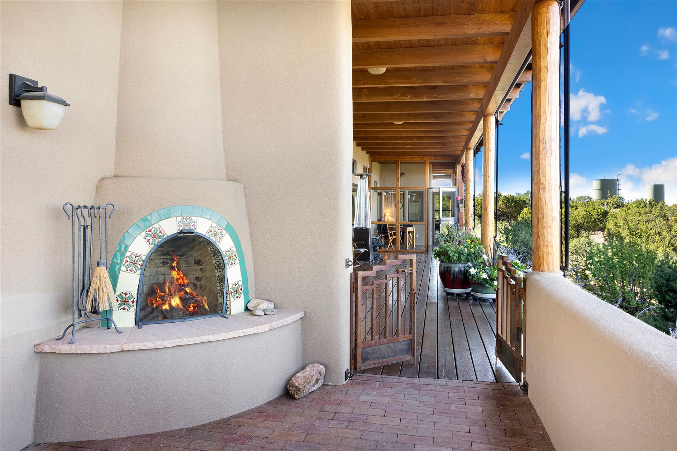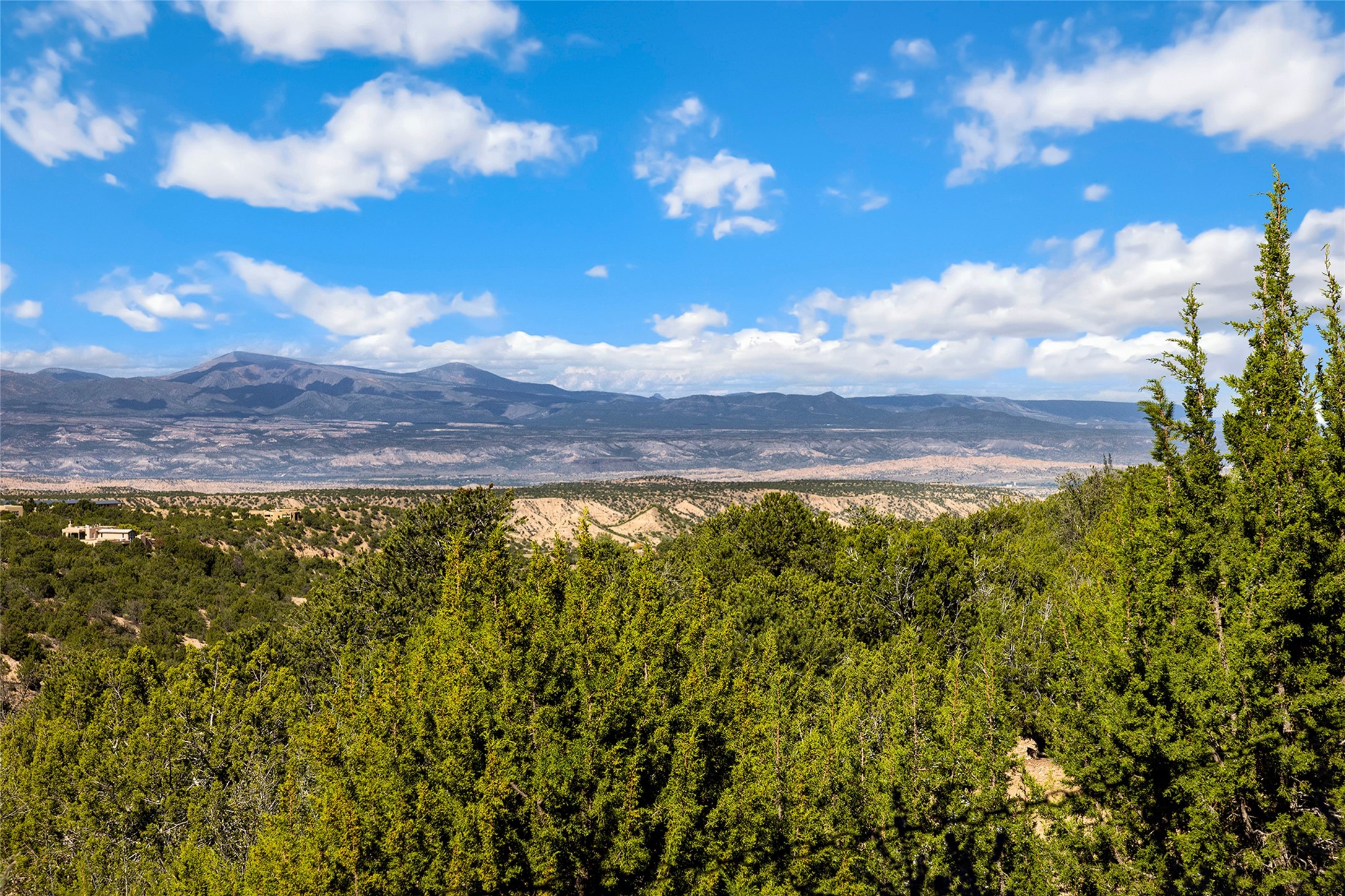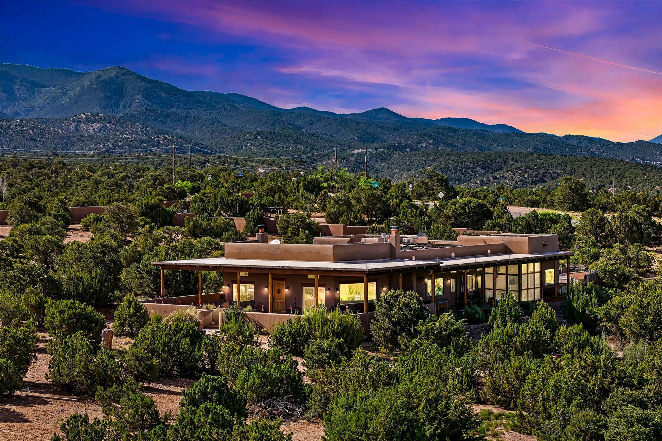 Meticulously designed by its current owners and custom built in 2014 by Tierra Concepts, this exceptional single-level Santa Fe-style residence is perched high (7200 ft) on a mesa above Tesuque Village, in the gated community of Tesuque Villas. Set on 3.5 secluded acres of beautifully landscaped environs, this solar-intensive all-electric home affords panoramic vistas in every direction - from Santa Fe Baldy and the Sangres to the east, to the entire Jemez range across the Rio Grande Valley to the west, with its fabled sunsets year-around.The front entrance opens into a spacious living and dining "great room," with a high viga-and-latilla ceiling and solid hickory flooring, and adjoining kitchen (with pantry). Its sweeping views are framed by large picture windows and a corner kiva fireplace. This majestic space links seamlessly with a wrap-around portal and walled garden, ideal for gatherings large and small, as well as outdoor dining and relaxation.A central galleried corridor continues the beautiful hickory flooring, fostering an easy, elegant flow throughout the house. It leads past the primary bedroom suite (with luxury bathroom) and two other bedrooms, to a private guest suite. These four bedrooms and their three bathrooms are well-suited to multiple purposes. The guest suite bedroom can be a music or other activity room; and another bedroom, with built-in shelving, makes an excellent office. All have magnificent views. A rooftop deck - easily accessible via outside stairway - and enclosed porch do so as well.Wonderfully secluded from town, tourists and traffic, and yet just 15 minutes from downtown Santa Fe, this gem of a home and location is not too close to town for comfort, but is close enough. Only moments from the Four Seasons Resort, and not far from the Tesuque Village Market, it perfectly blends tranquility, craftsmanship, and breathtaking views in one of Santa Fe's most coveted settings.