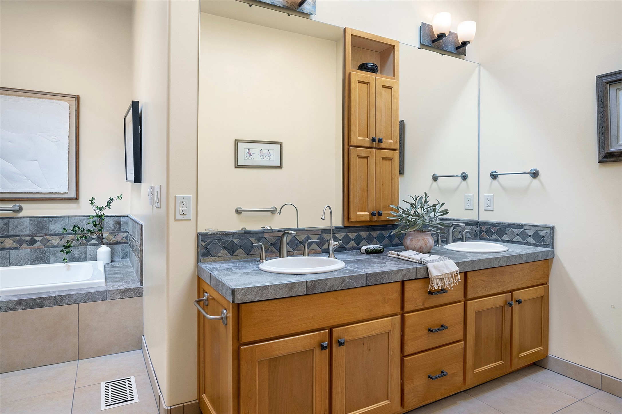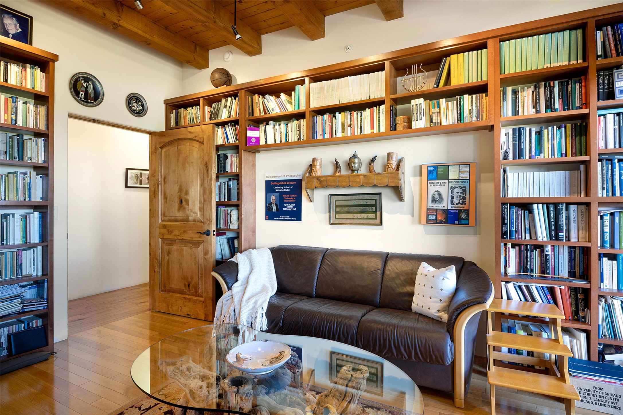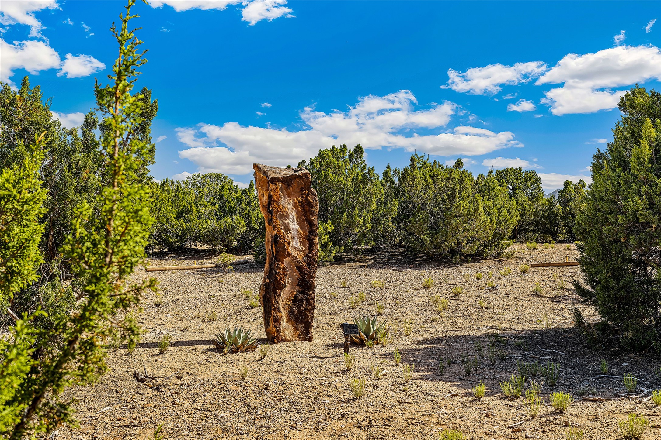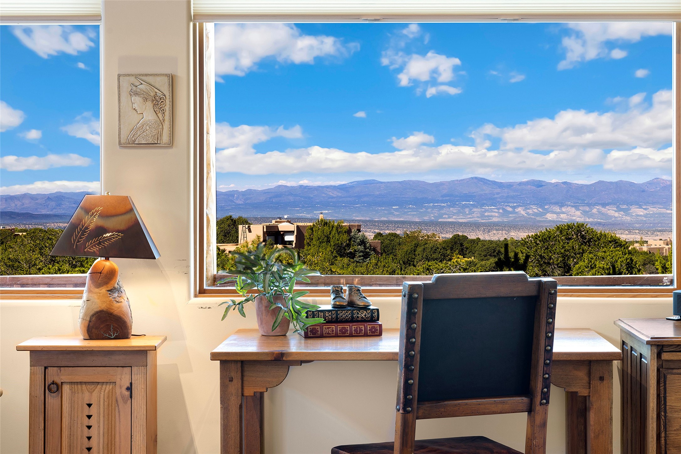 Meticulously designed by its current owners and custom built in 2014 by Tierra Concepts, this exceptional single-level Santa Fe-style residence is perched high (7200 ft) on a mesa above Tesuque Village, in the gated community of Tesuque Villas. Set on 3.5 secluded acres of beautifully landscaped environs, this solar-intensive all-electric home affords panoramic vistas in every direction - from Santa Fe Baldy and the Sangres to the east, to the entire Jemez range across the Rio Grande Valley to the west, with its fabled sunsets year-around.The front entrance opens into a spacious living and dining "great room," with a high viga-and-latilla ceiling and solid hickory flooring, and adjoining kitchen (with pantry). Its sweeping views are framed by large picture windows and a corner kiva fireplace. This majestic space links seamlessly with a wrap-around portal and walled garden, ideal for gatherings large and small, as well as outdoor dining and relaxation.A central galleried corridor continues the beautiful hickory flooring, fostering an easy, elegant flow throughout the house. It leads past the primary bedroom suite (with luxury bathroom) and two other bedrooms, to a private guest suite. These four bedrooms and their three bathrooms are well-suited to multiple purposes. The guest suite bedroom can be a music or other activity room; and another bedroom, with built-in shelving, makes an excellent office. All have magnificent views. A rooftop deck - easily accessible via outside stairway - and enclosed porch do so as well.Wonderfully secluded from town, tourists and traffic, and yet just 15 minutes from downtown Santa Fe, this gem of a home and location is not too close to town for comfort, but is close enough. Only moments from the Four Seasons Resort, and not far from the Tesuque Village Market, it perfectly blends tranquility, craftsmanship, and breathtaking views in one of Santa Fe's most coveted settings.