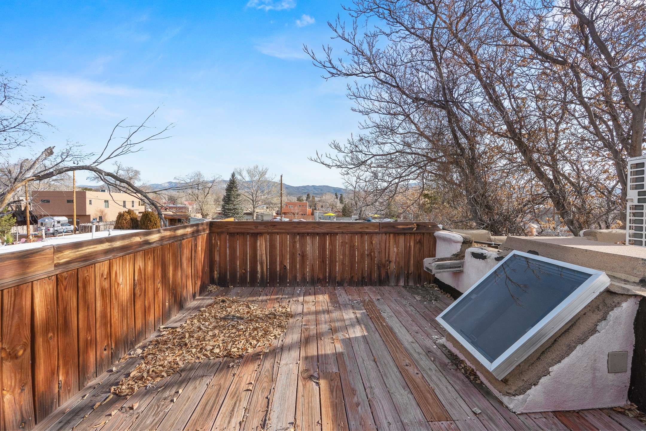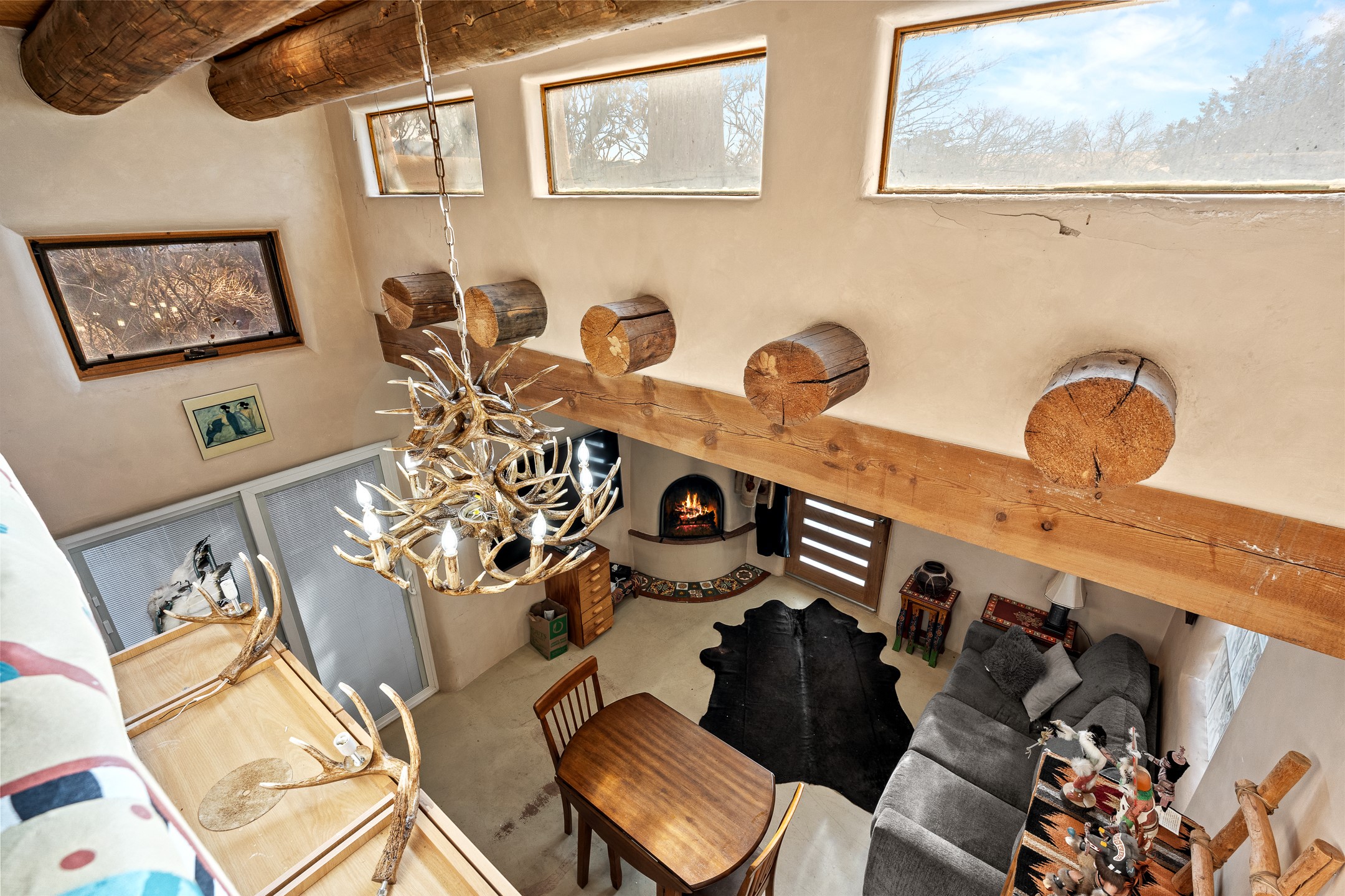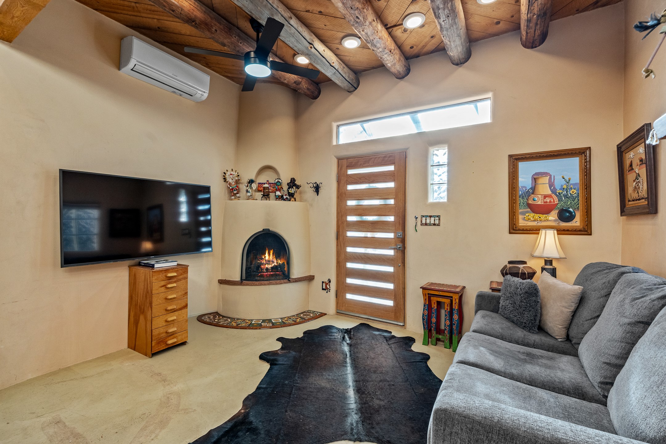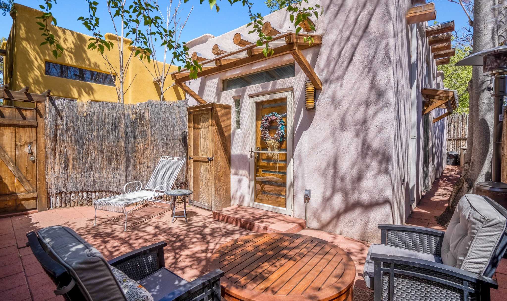 Just minutes from the historic Plaza, this freestanding condo with no shared walls offers the perfect blend of privacy, charm, and location. Situated at 107A Moore, you're ideally positioned near the Casa Solana Shopping Center, the Santa Fe River, and scenic trails that effortlessly lead you downtown. This sweet and sophisticated 1-bedroom residence is rich in authentic Santa Fe character and thoughtful upgrades. The open living space features a cozy kiva fireplace, vigas, tongue-and-groove ceilings, smooth plaster walls, and sleek concrete flooring throughout. The kitchen is appointed with granite countertops and stainless steel appliances, while the spa-like bathroom showcases a striking tiger's eye sink paired with white quartz counter. Comfort is ensured year-round with mini-split heating and cooling, and a washer and dryer convey for added convenience. A compact lofted storage area provides bonus space and is accessed via pull-down stairs through the laundry room. Outside, enjoy your own private courtyard, beautifully enclosed by coyote fencing an ideal setting for outdoor dining, morning coffee, or evening wine under the Santa Fe sky.A rare opportunity to own a private, freestanding condo in a highly desirable and walkable location close to everything Santa Fe has to offer.