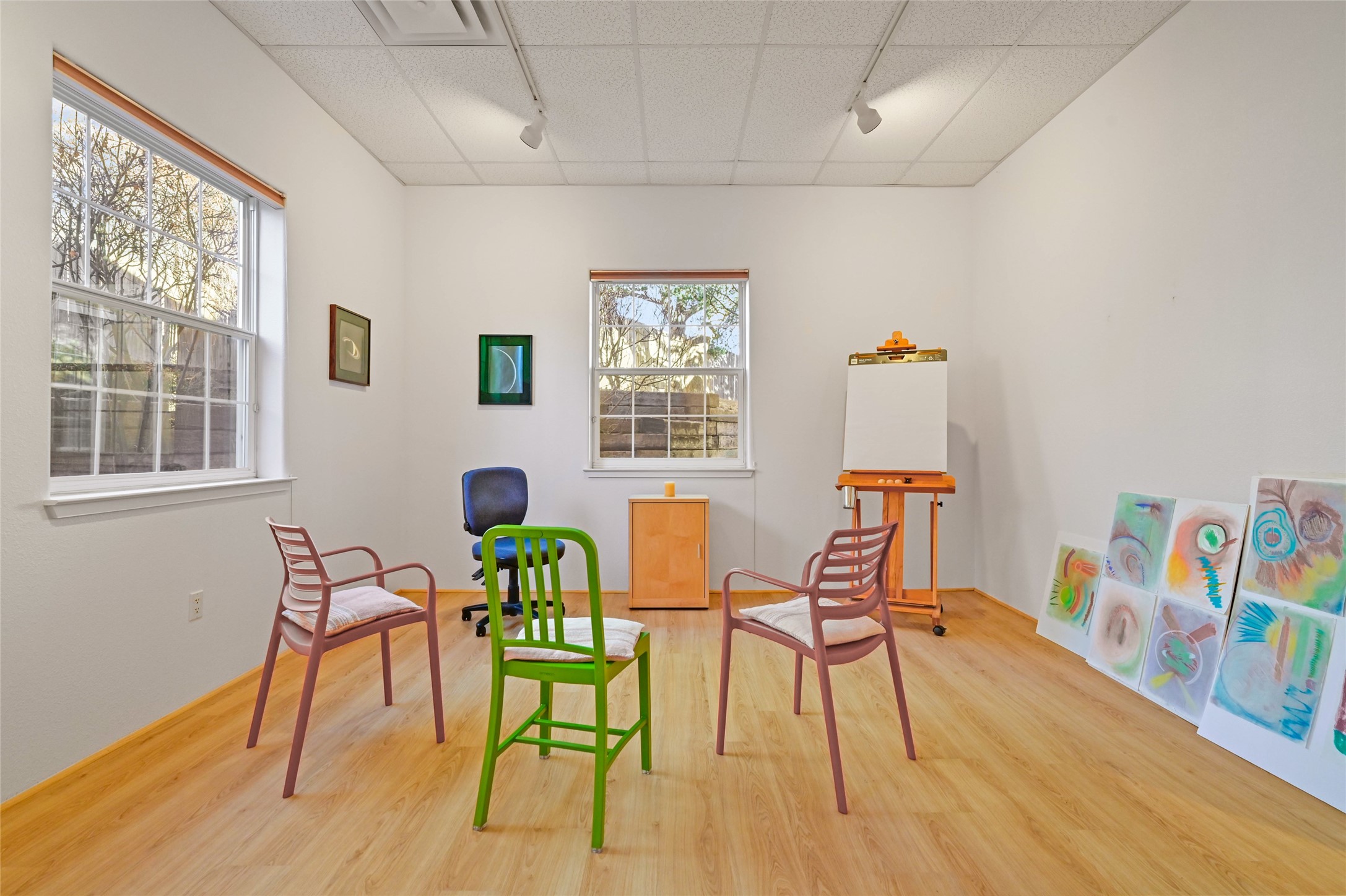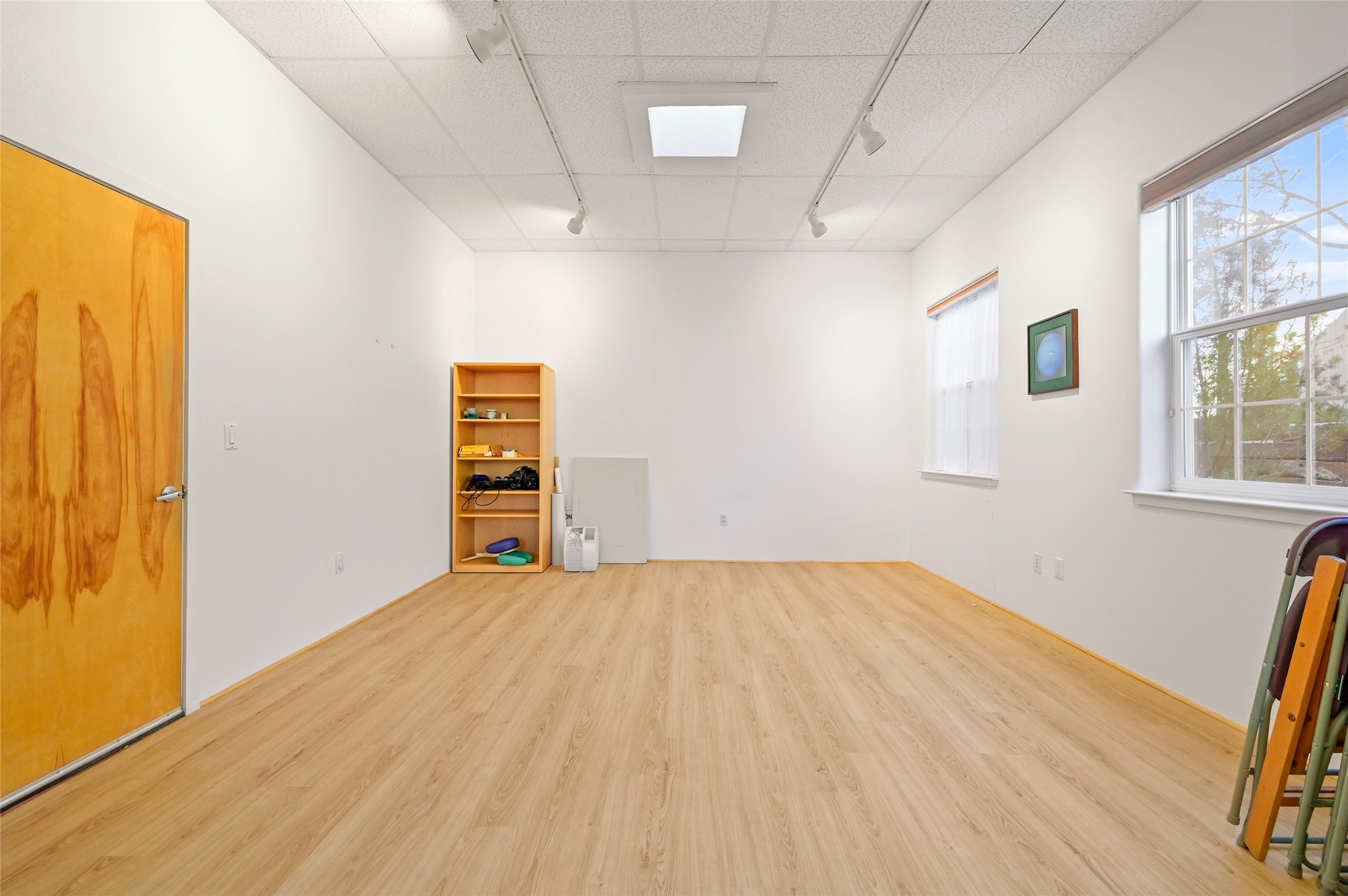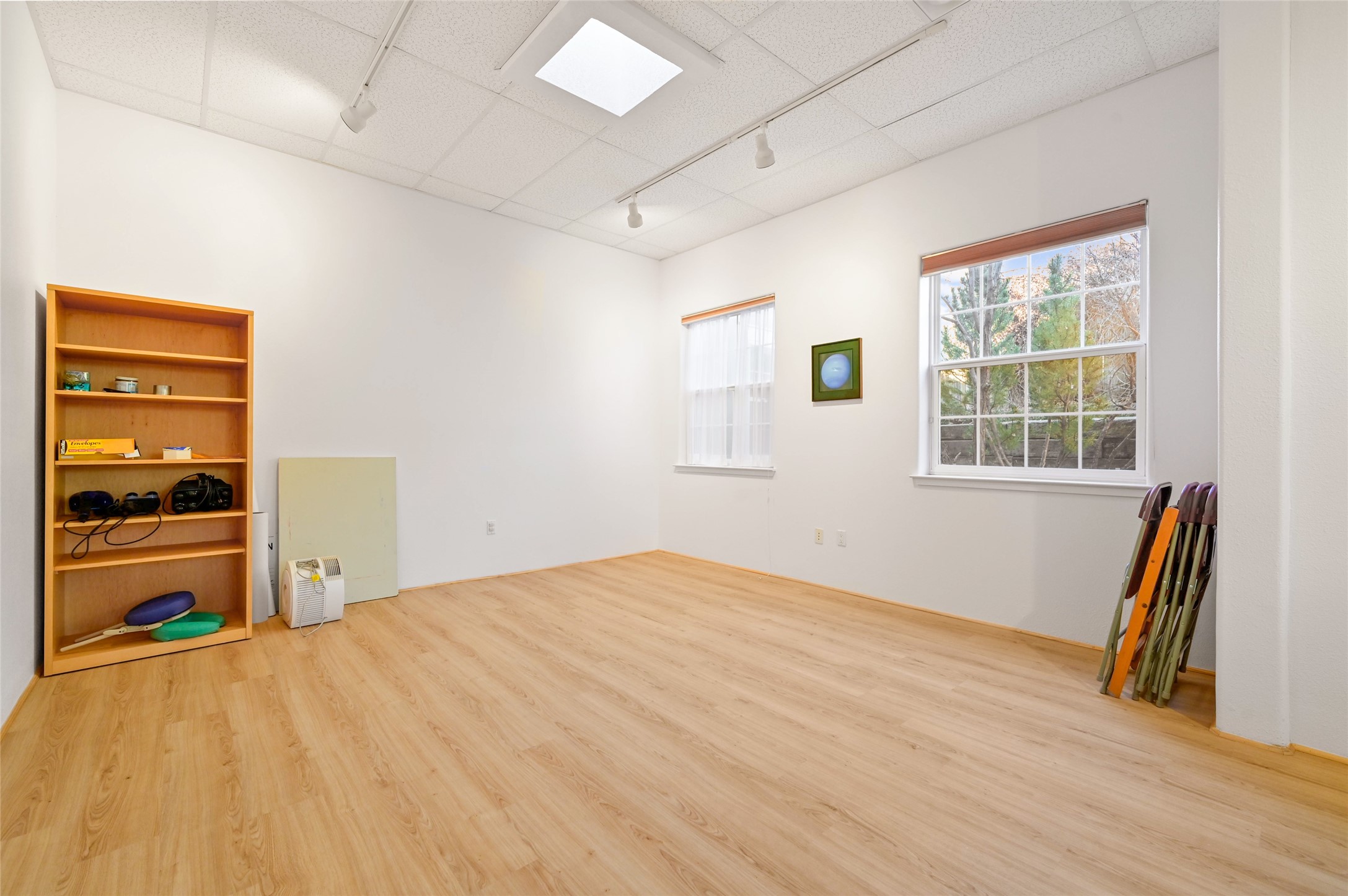 Galisteo Business Park Office Space for Sale. This nicely built-out office space features a reception and waiting area with high ceilings, skylights, and track lighting throughout. The space includes two large, windowed private offices, one office offers an expansive area with vinyl flooring, large enough for a group setting or training room, and could be converted into a third office. Additional features include a kitchenette and two in-suite restrooms. The property is professionally managed and conveniently located within the St. Michael's and S. St. Francis corridor. Monthly condo association dues apply.