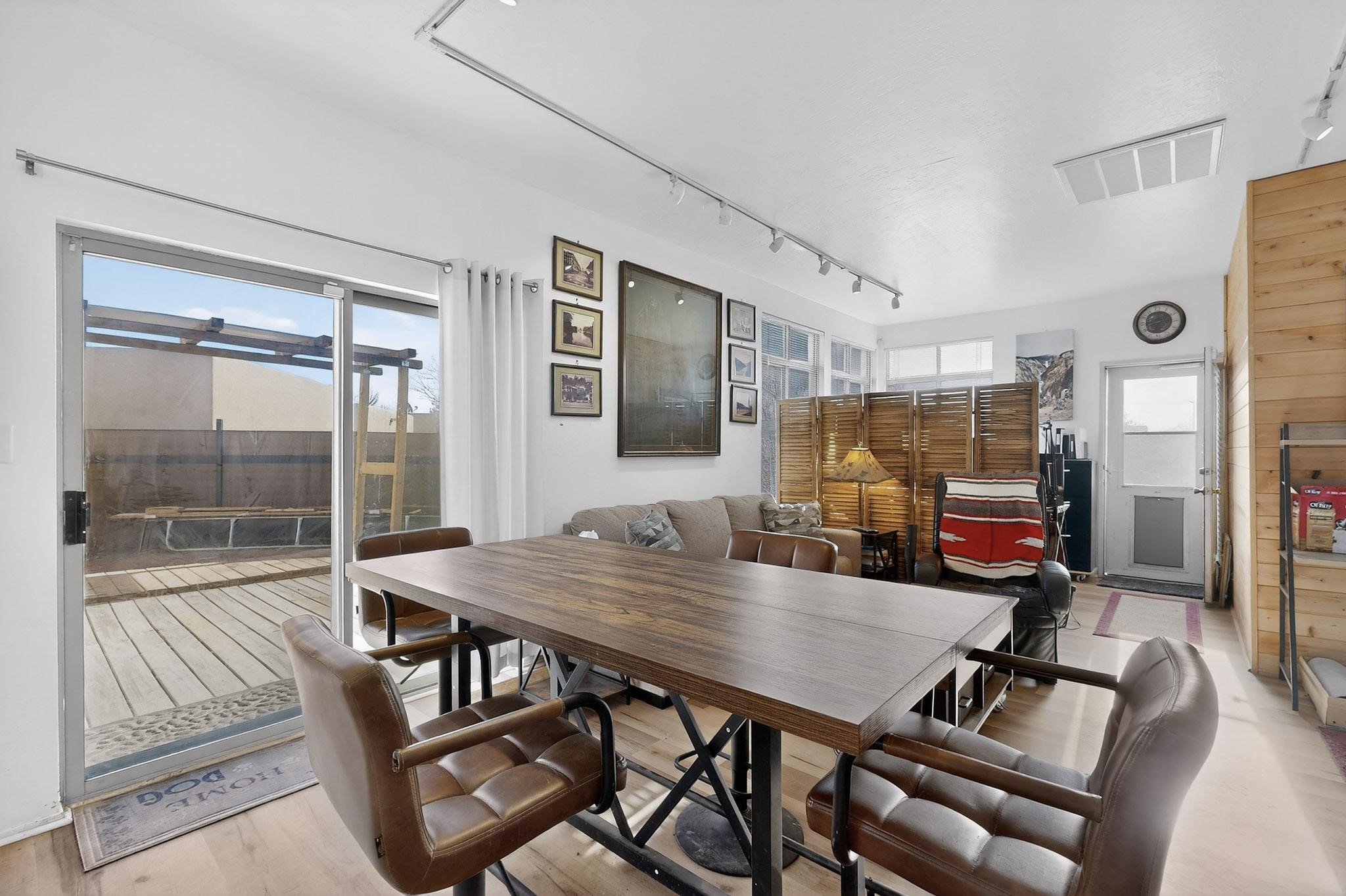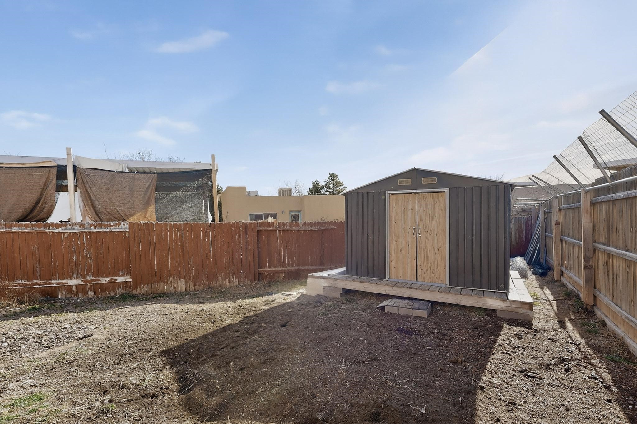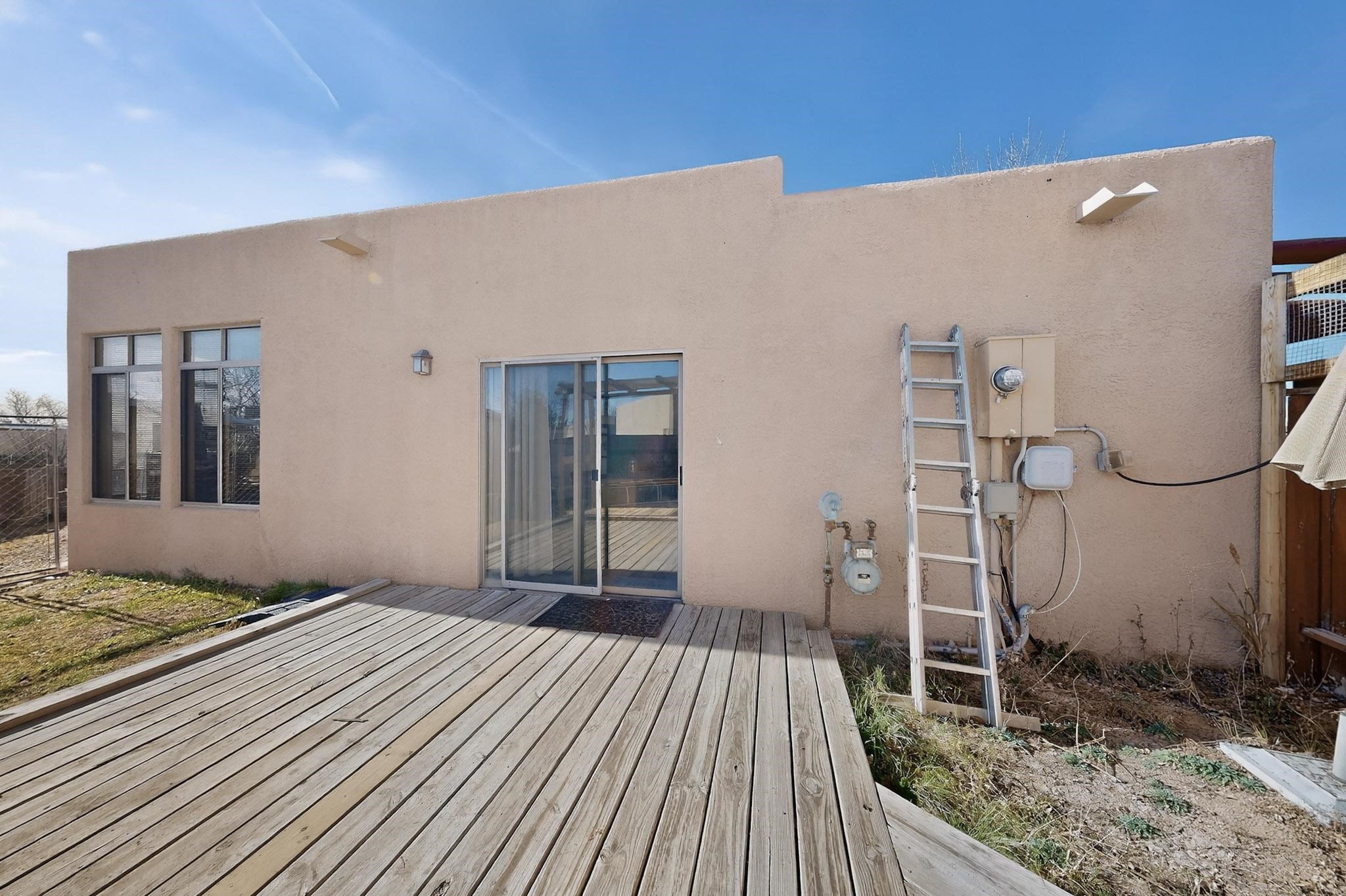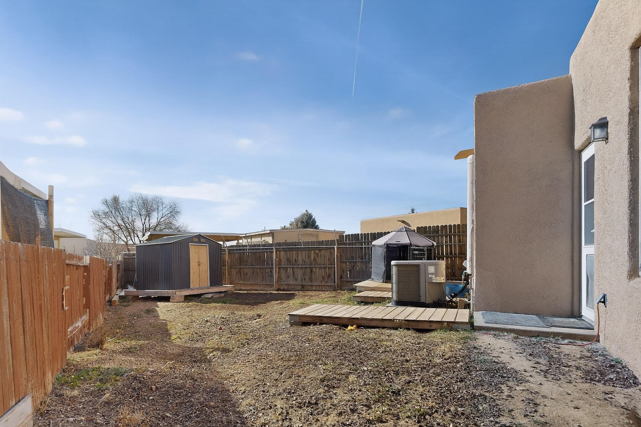 This two bedroom, two bathroom, single level home with a two car detached garage is the Perfect and Best Value in Santa Fe! The open concept living and dining area is flooded with natural light and has easy to care for flooring. The dining area offers patio access to the east yard and a custom trellis awaiting a porch swing. Quick access to a separated backyard allows for pets to enjoy their own space. Lots of great outdoor areas awaiting your ideas. The primary suite has a custom closet with a sliding barn door, private access to the backyard with a deck and a primary bathroom with a sliding barn door as well, to allow for maximum use of the space. Bedroom #2 sits at the entry of the home with a cul-de-sac view and access to the guest's full bathroom. The stackable washer and dryer save space and are tucked away from view. Lots of great perks, including the refrigerated A/C that was added and the storage shed in the backyard that will convey. The Seller is offering a $3,000 credit towards a flooring allowance and a $2,000 paint allowance with a reasonable and accepted offer.