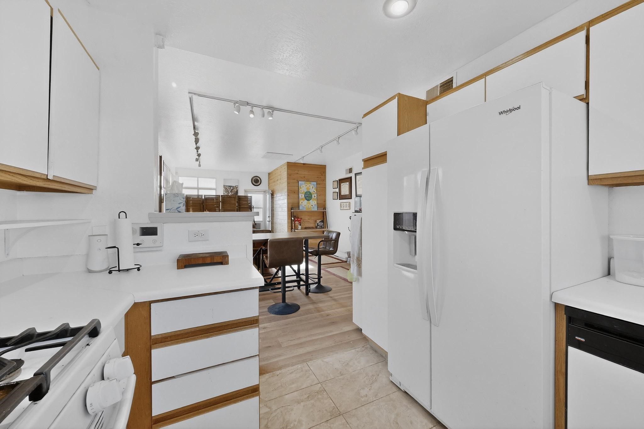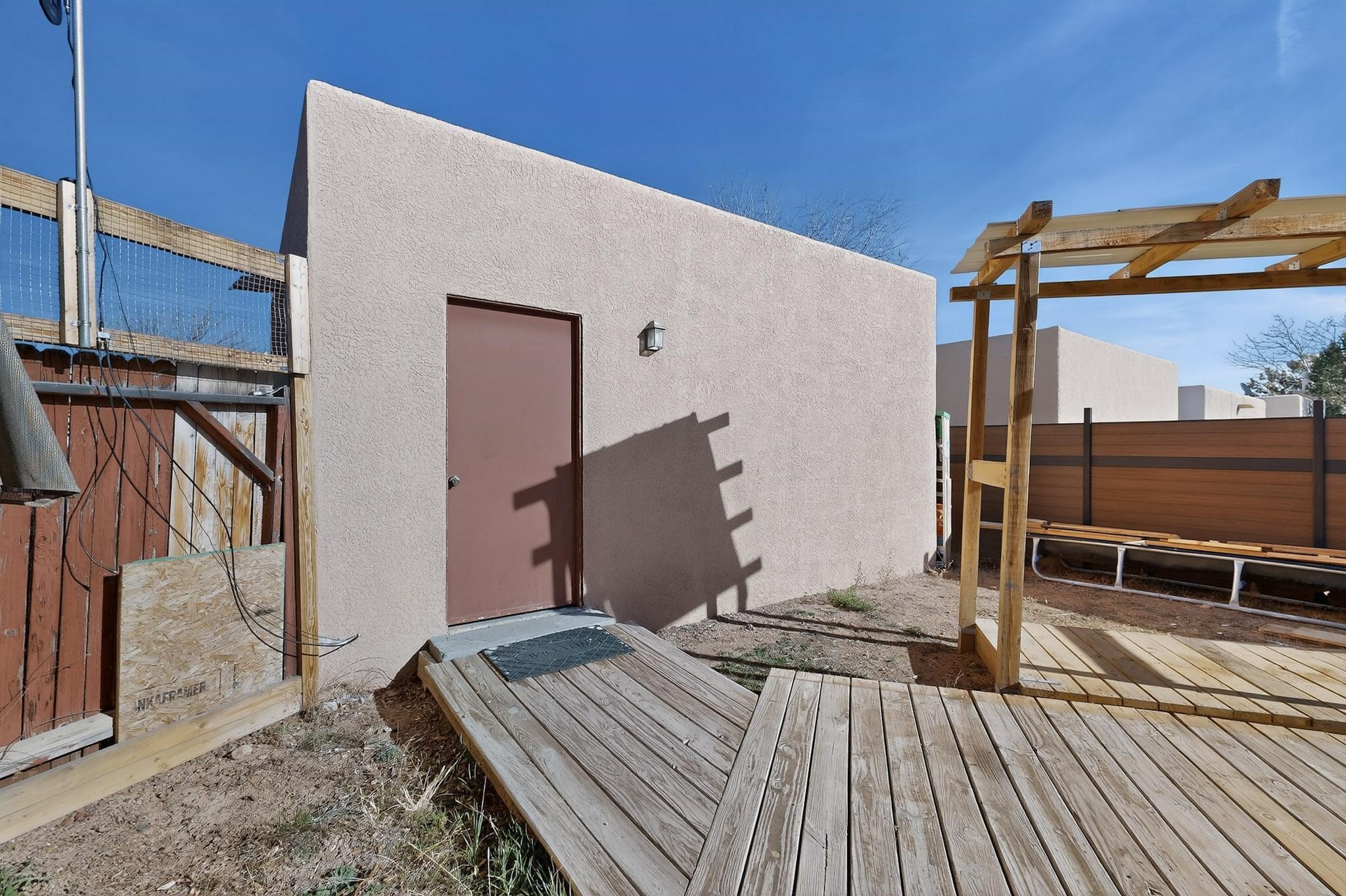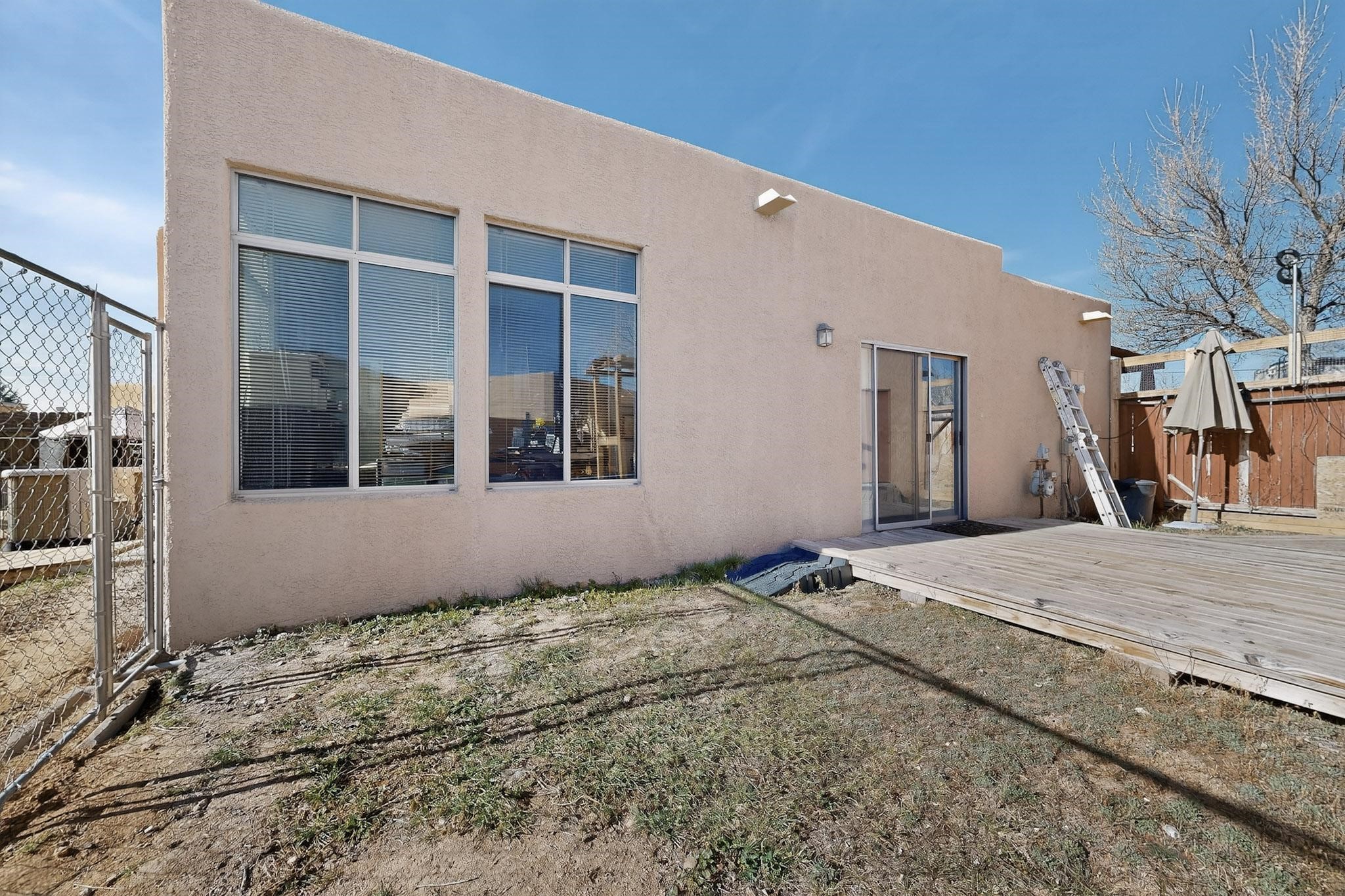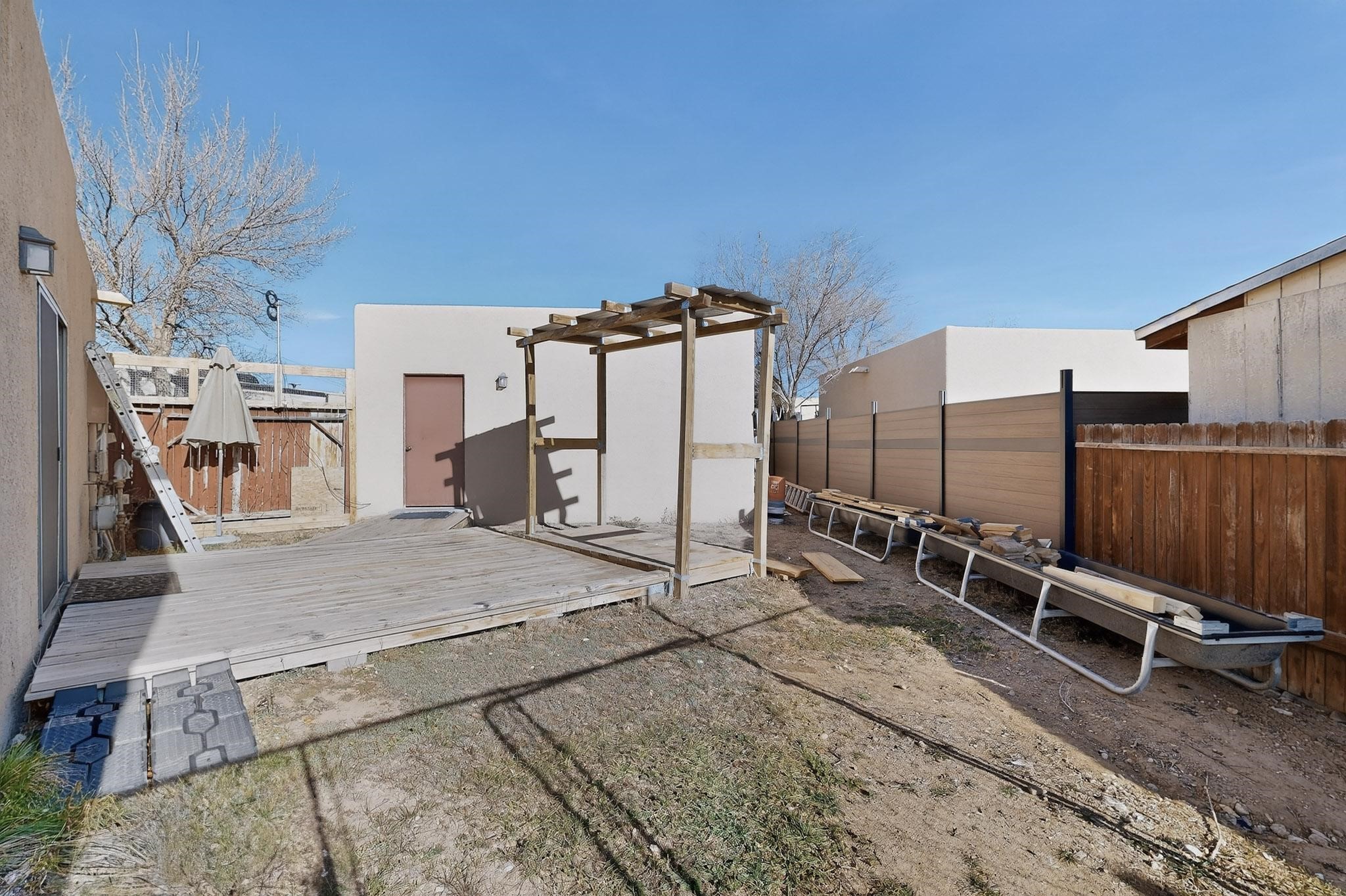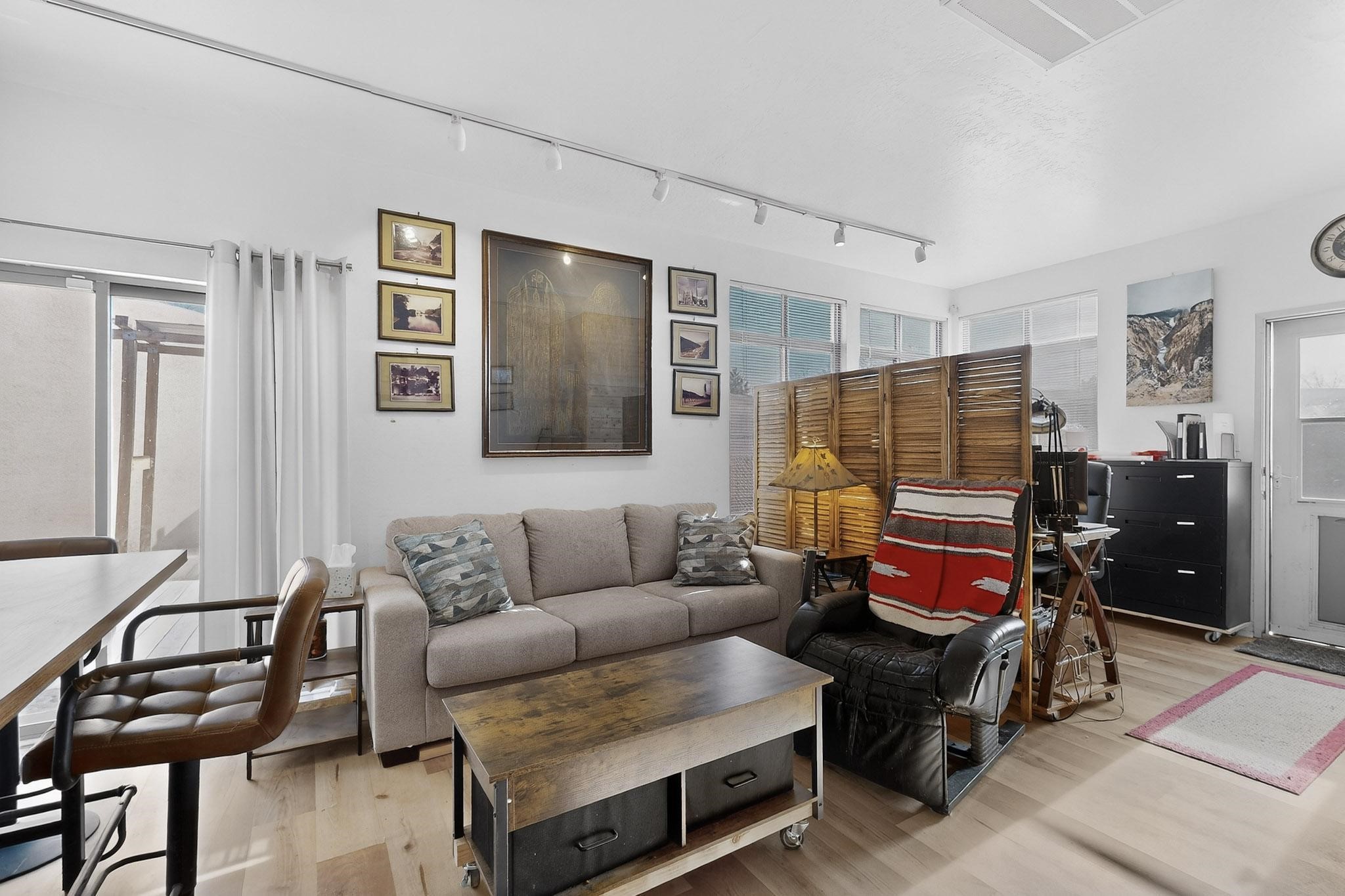 This two bedroom, two bathroom, single level home with a two car detached garage is the Perfect and Best Value in Santa Fe! The open concept living and dining area is flooded with natural light and has easy to care for flooring. The dining area offers patio access to the east yard and a custom trellis awaiting a porch swing. Quick access to a separated backyard allows for pets to enjoy their own space. Lots of great outdoor areas awaiting your ideas. The primary suite has a custom closet with a sliding barn door, private access to the backyard with a deck and a primary bathroom with a sliding barn door as well, to allow for maximum use of the space. Bedroom #2 sits at the entry of the home with a cul-de-sac view and access to the guest's full bathroom. The stackable washer and dryer save space and are tucked away from view. Lots of great perks, including the refrigerated A/C that was added and the storage shed in the backyard that will convey. The Seller is offering a $3,000 credit towards a flooring allowance and a $2,000 paint allowance with a reasonable and accepted offer.