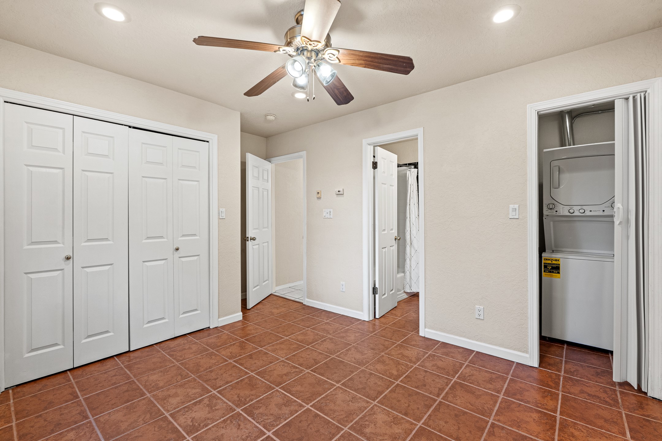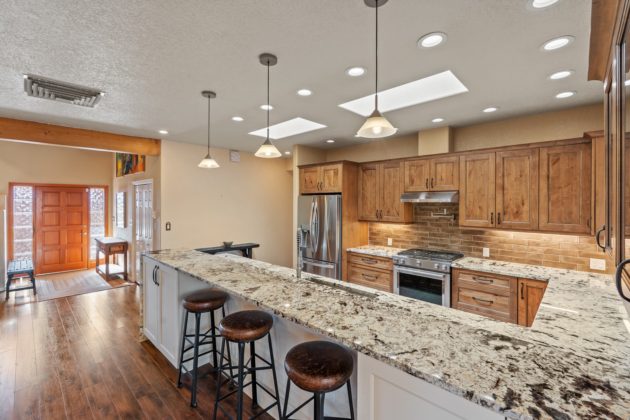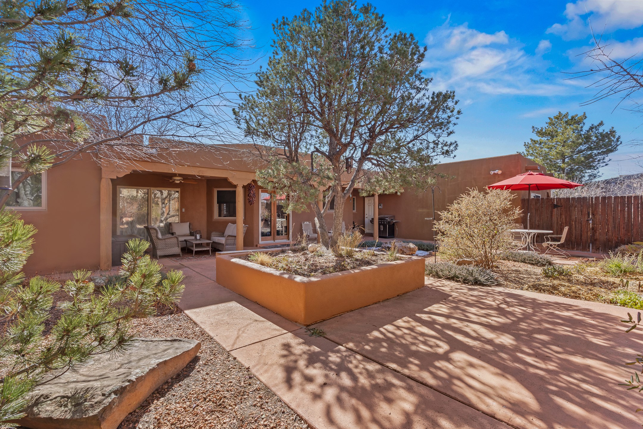 Tucked into the coveted Pueblos Del Sol neighborhood, this custom home with a guest house is a rare find--offering privacy, thoughtful design, and flexible living. The main house and guest house are connected by a two-car garage, yet are completely separate and private, and are enclosed within a stucco wall that creates a private, cohesive compound. The 1,892 sq. ft. single-level main residence features 3 bedrooms and 2 bathrooms with a light-filled open-concept living, kitchen, and dining area. The generous South-facing living room offers high tongue-and-groove ceilings with beams, warm wood flooring, and a corner gas fireplace for added ambience. The recently renovated kitchen--designed by Sven Grell of Santa Fe Kitchen Design--is the centerpiece of the home. It features beautiful granite countertops, custom Alder wood cabinetry, stainless steel appliances, and a functional U-shaped layout with bar seating--creating a seamless space for cooking and conversation. The adjacent dining area is enhanced by a custom, lighted built-in buffet--perfect for displaying pottery, glassware, or treasured dishware. The private, landscaped backyard is accessible from both the dining room and the primary suite. The primary bedroom includes a gas fireplace and a generous sitting area--ideal for a home office or reading nook. The 533 sq. ft. 1-bedroom, 1-bathroom guest house enjoys its own entrance and private courtyard, and has been a successful rental for the current owners. Additional bonuses: In-floor radiant heat, mini-split and evaporative cooling, ample off street parking and a wonderful South-facing front courtyard for sunny, winter morning coffee hour. This is a rare opportunity to own both a beautifully crafted home and a private guest house in one of Santa Fe's desirable midtown neighborhoods--complete with access to nearby trails, privacy, and timeless Santa Fe charm.