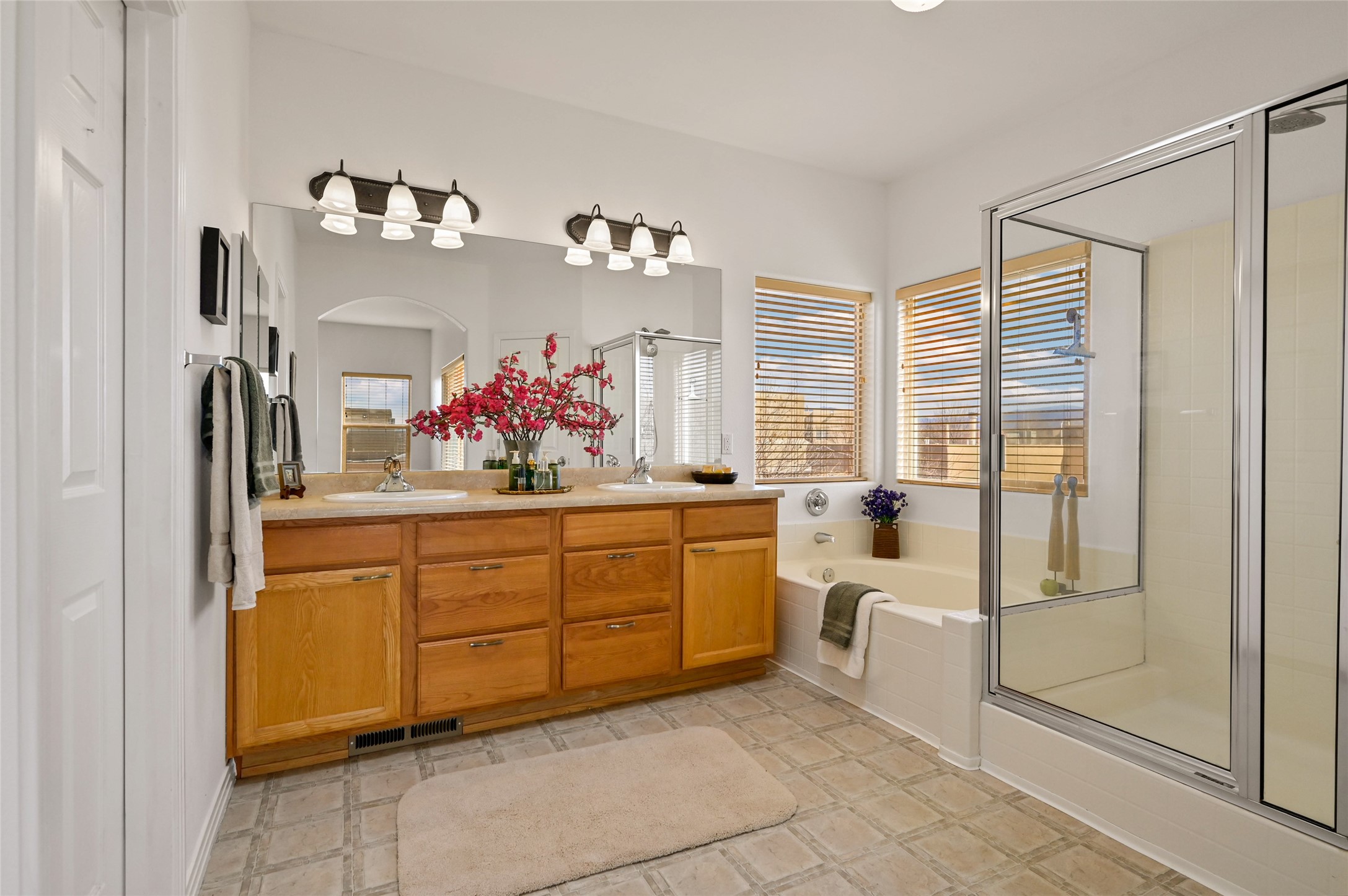 Light and bright two-story home featuring three upstairs bedrooms, two baths, and a versatile bonus room ideal for a home office, second living area, or playroom. Enjoy views from all bedrooms and the bonus room, complemented by attractive wood-look flooring throughout the upper level.The beautifully updated kitchen (2024) showcases newer cabinetry, quartz countertops, stainless steel appliances, and an induction stove any home chef will appreciate. The main level also offers a powder bath, a large laundry room, and access to the two-car garage. Additional upgrades include newer central air conditioning, heating system, and water heater.The spacious primary suite features a large walk-in closet and a well-appointed bathroom with double vanity sinks, a soaking tub, separate shower, and enclosed water closet. The open floor plan, anchored by a charming fireplace, creates an inviting space for relaxing or entertaining. Outdoors, enjoy a fully fenced yard, perfect for gatherings and four-legged friends.Built by BT Homes, this 2117 sqft property has no HOA and is conveniently located near shopping, restaurants, and easy access to 599 and I-25, making commuting to Albuquerque, Historic Downtown Santa Fe, or Los Alamos a breeze.