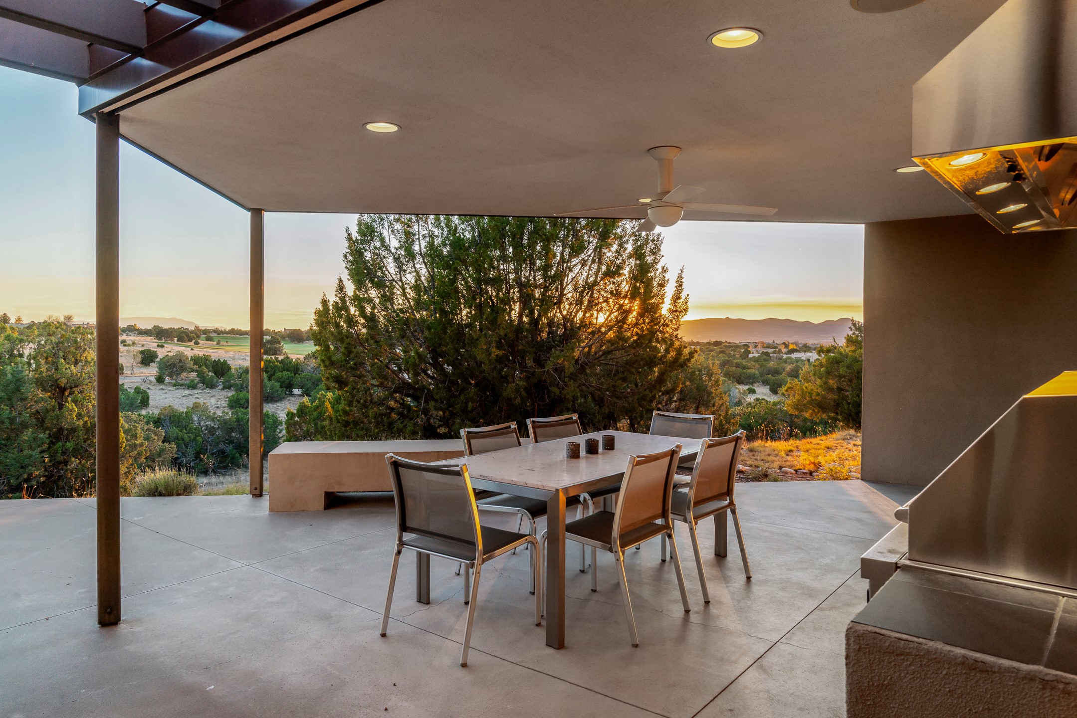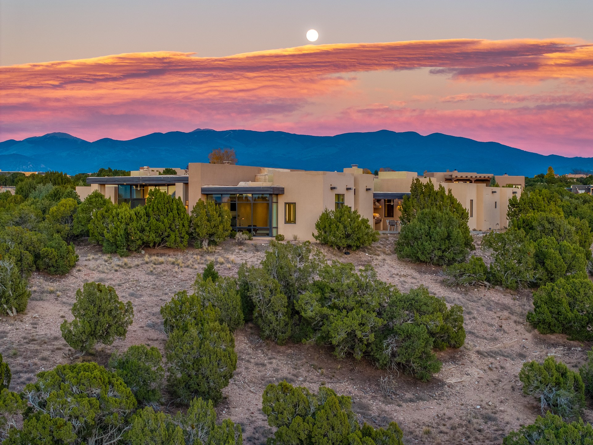 Striking modern architecture in Las Campanas! 26 Bishop's Dome was designed by Craig Hoopes and built by Chuck Apple to capture light, views, and refined Santa Fe living. The home offers 5 bedrooms and 7 bathrooms, including two powder rooms, with a thoughtfully designed floor plan featuring two living rooms and two portals, ideal for both elegant entertaining and relaxed daily living. Walls of glass frame extraordinary east-facing views of the snow-capped Sangre de Cristo Mountains and west-facing Jemez Mountain vistas, delivering exquisite sunset views. The portals extend the living spaces outdoors, creating seamless indoor-outdoor living for gatherings or quiet enjoyment of the surrounding landscape.Private bedroom suites provide comfort and flexibility, while a generous 3-car garage adds convenience and functionality. A rare opportunity to own a true architectural home where modern design, exceptional construction, and breathtaking mountain views converge.
