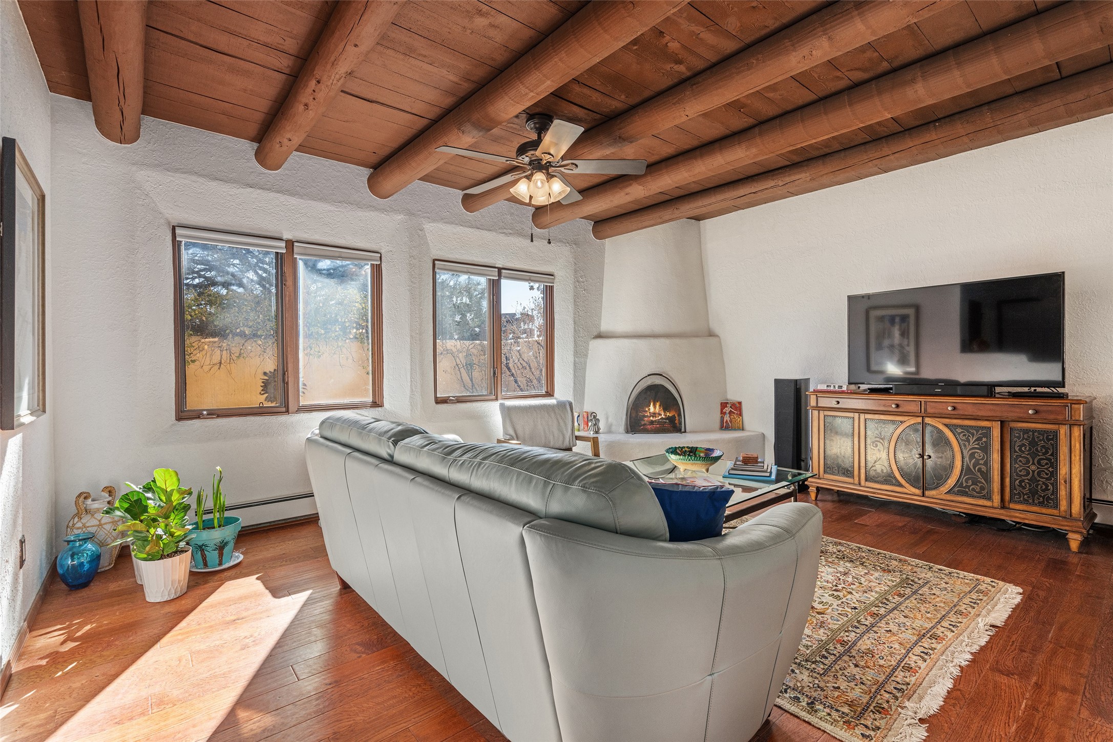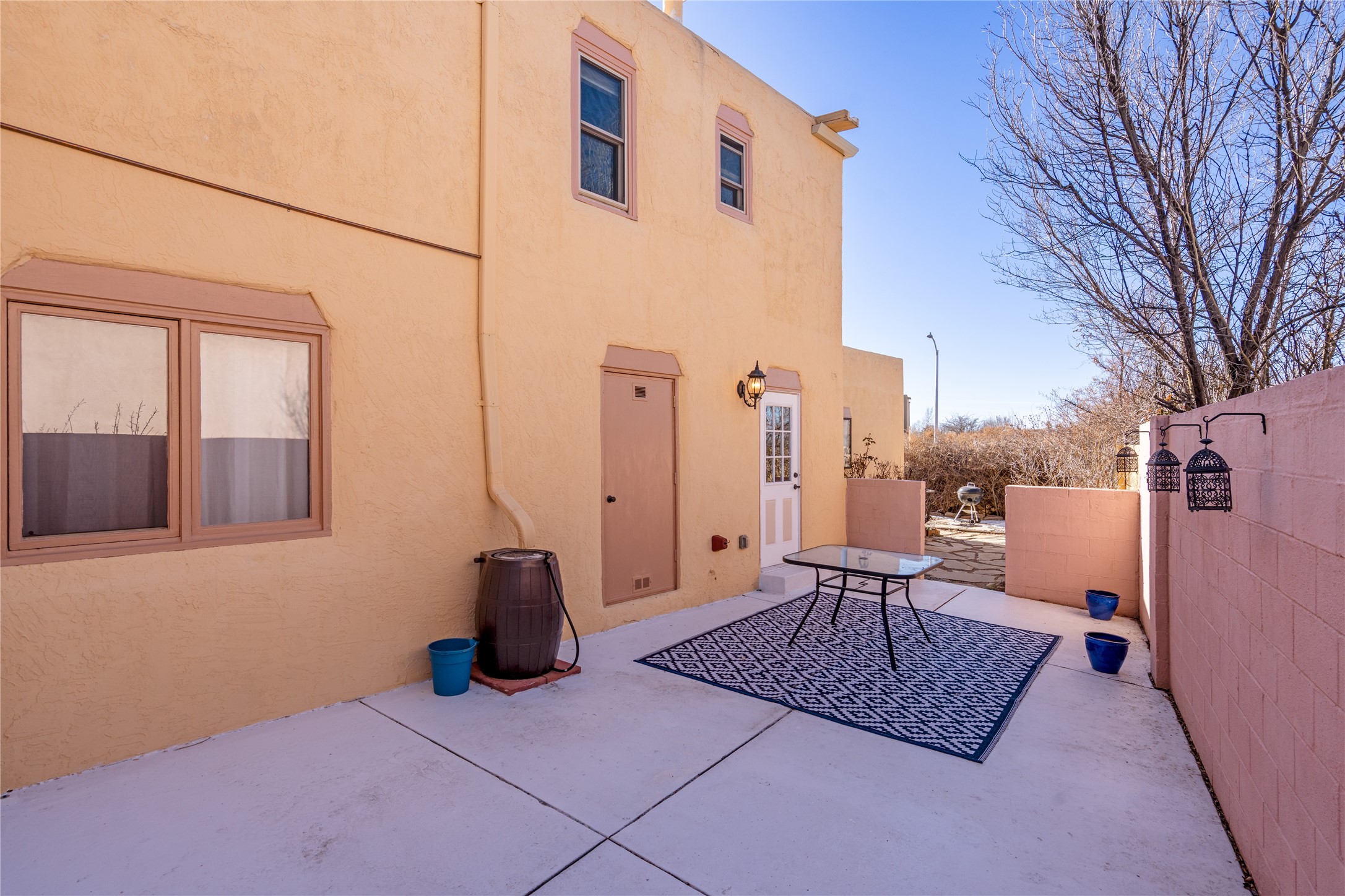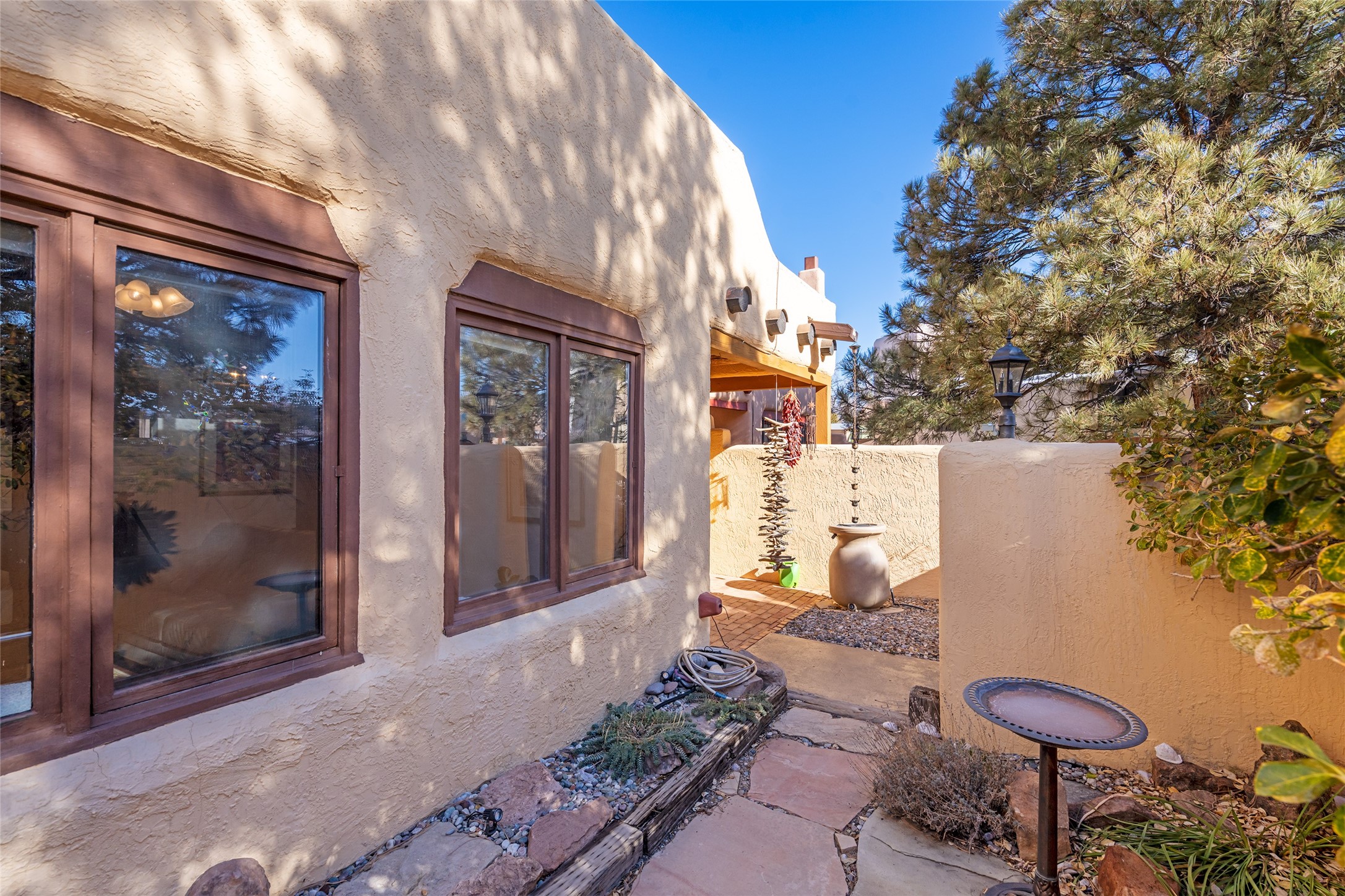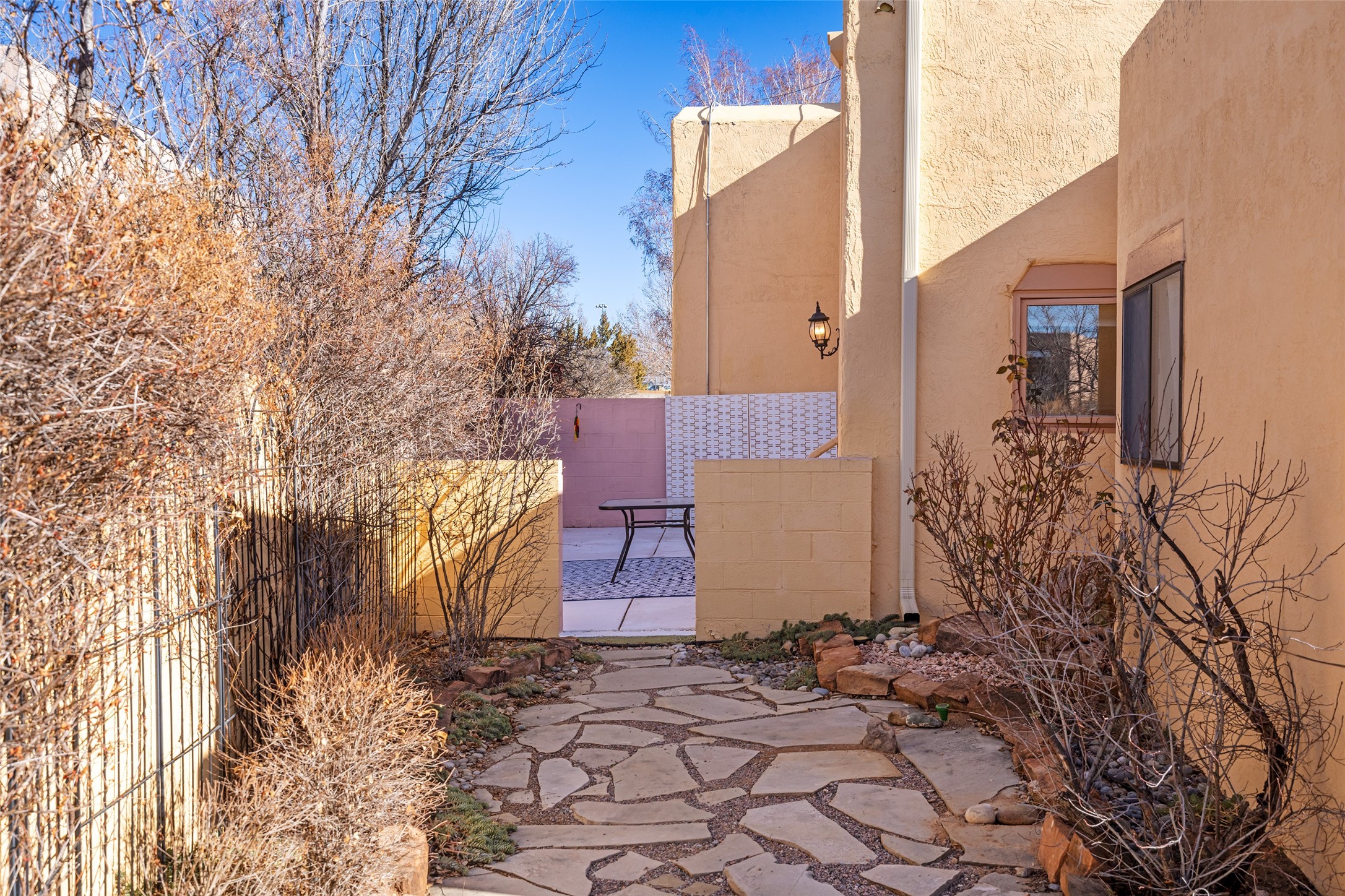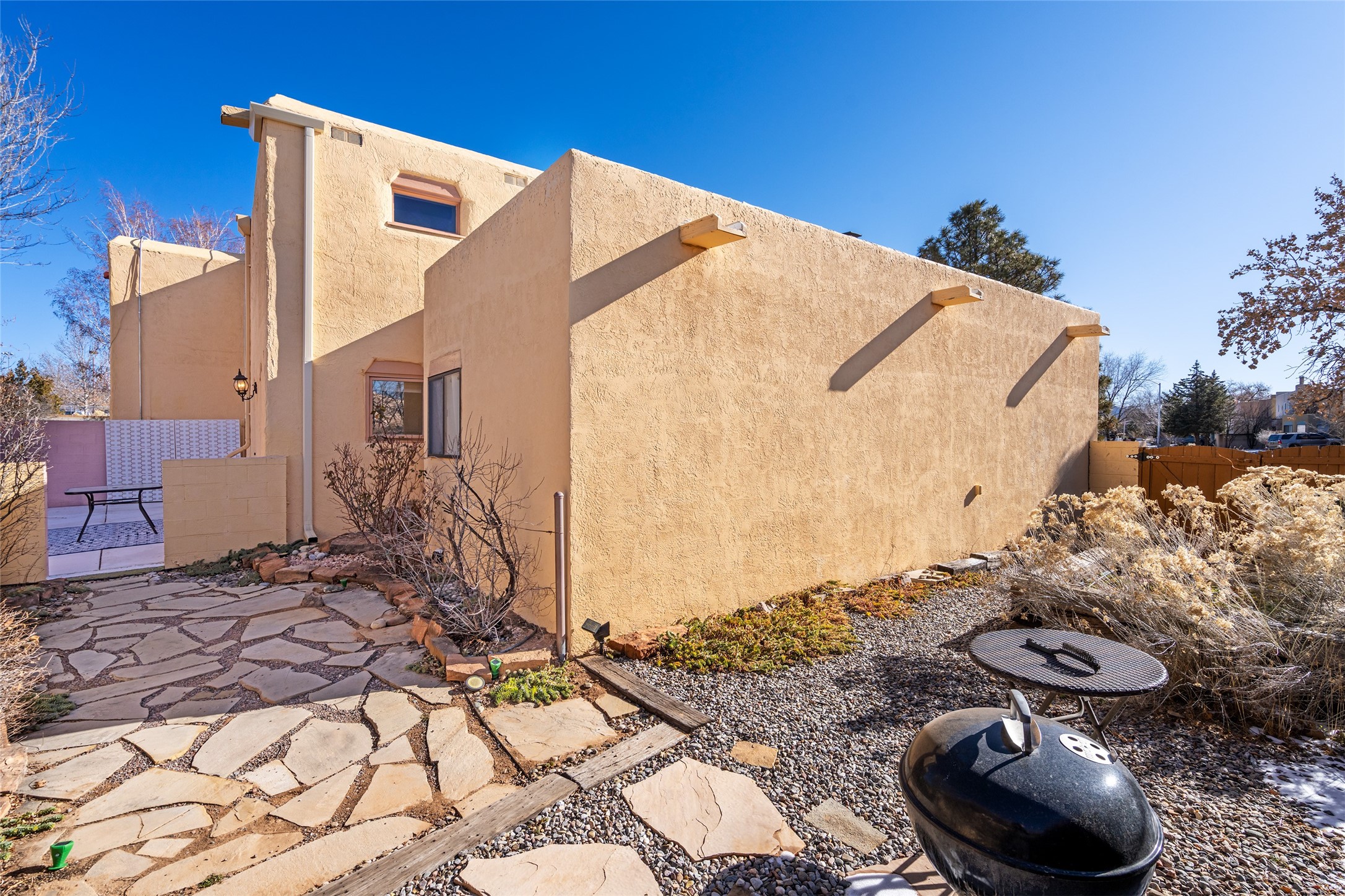 Lovely, two story townhouse on a corner lot. Light and bright! Pueblo style with a kiva wood burning fireplace, vigas, plus Santa Fe style accents. Flooring includes brick, Pergo wood and tile. Newer blinds, and the roof and the boiler were replaced in 2021. Views from the 2nd story deck area. Primary bedroom and second bedroom are located upstairs with one bathroom. One bedroom and one bath are located downstairs. Stainless appliances in the kitchen. Nice sized laundry area and an attached 2 car garage. Walled in front/back patio. Conveniently located to Ragle Park, coffee shops, Target, grocery stores, Genoveva Chavez recreation center and Santa Fe Place Mall.