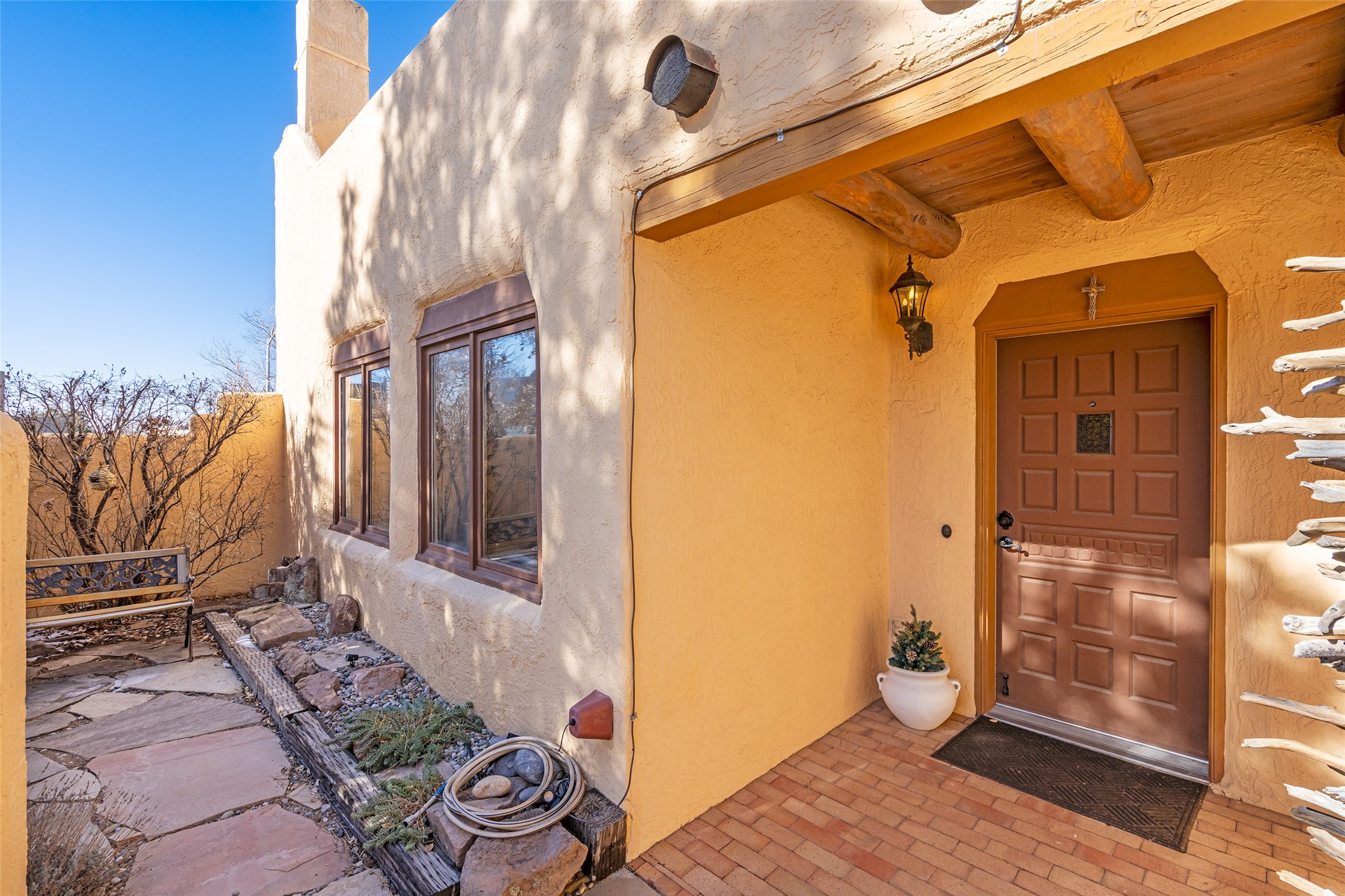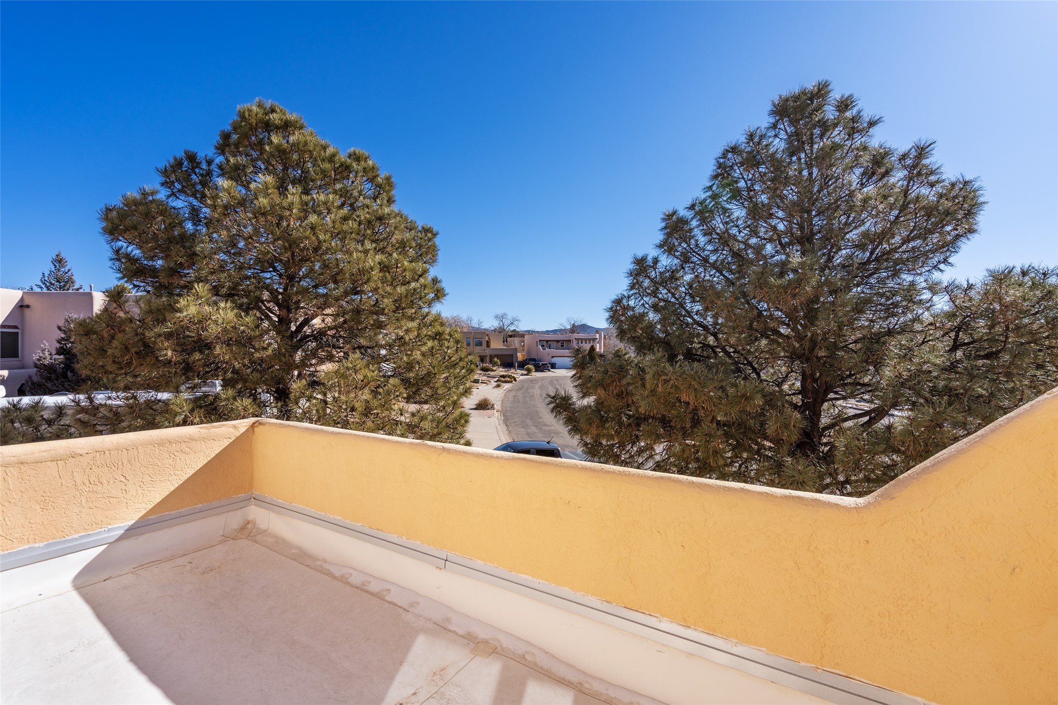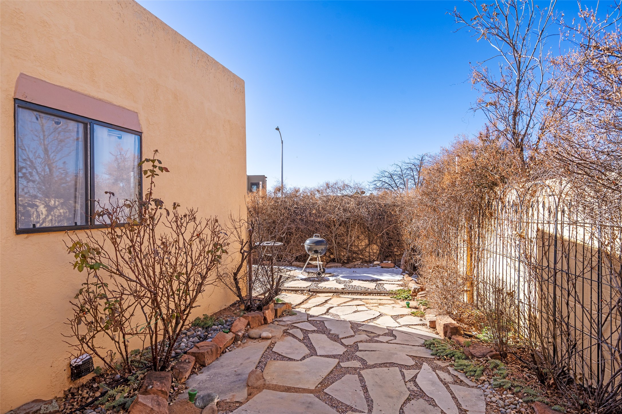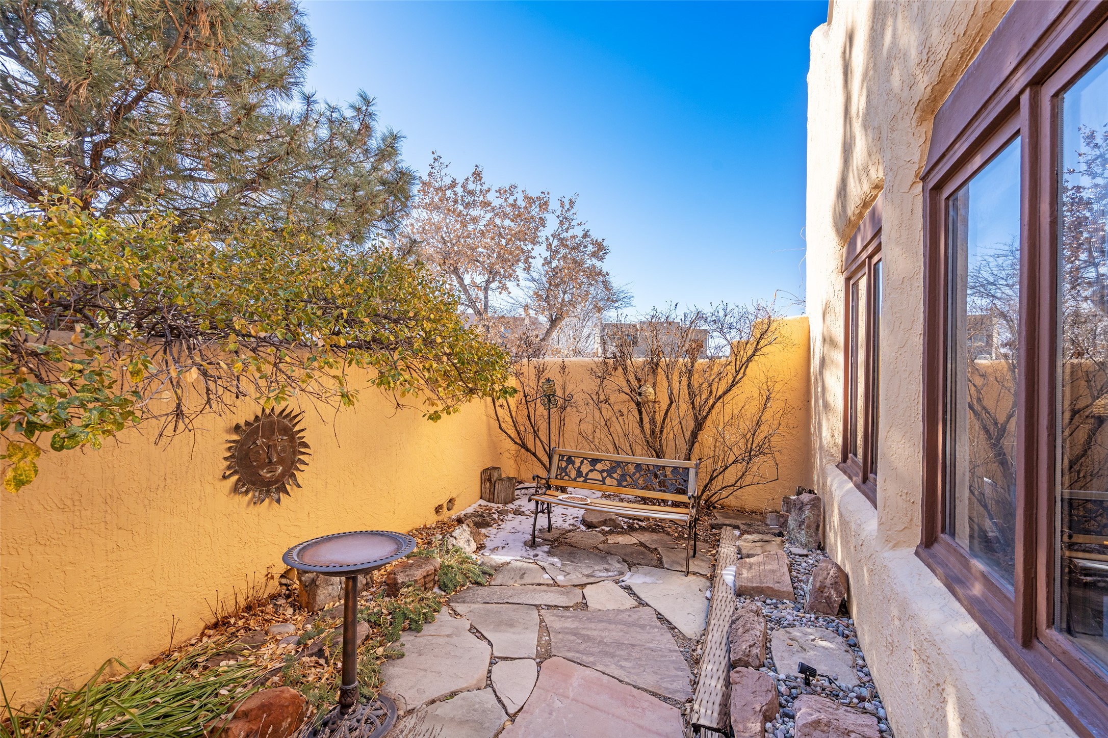 Lovely, two story townhouse on a corner lot. Light and bright! Pueblo style with a kiva wood burning fireplace, vigas, plus Santa Fe style accents. Flooring includes brick, Pergo wood and tile. Newer blinds, and the roof and the boiler were replaced in 2021. Views from the 2nd story deck area. Primary bedroom and second bedroom are located upstairs with one bathroom. One bedroom and one bath are located downstairs. Stainless appliances in the kitchen. Nice sized laundry area and an attached 2 car garage. Walled in front/back patio. Conveniently located to Ragle Park, coffee shops, Target, grocery stores, Genoveva Chavez recreation center and Santa Fe Place Mall.