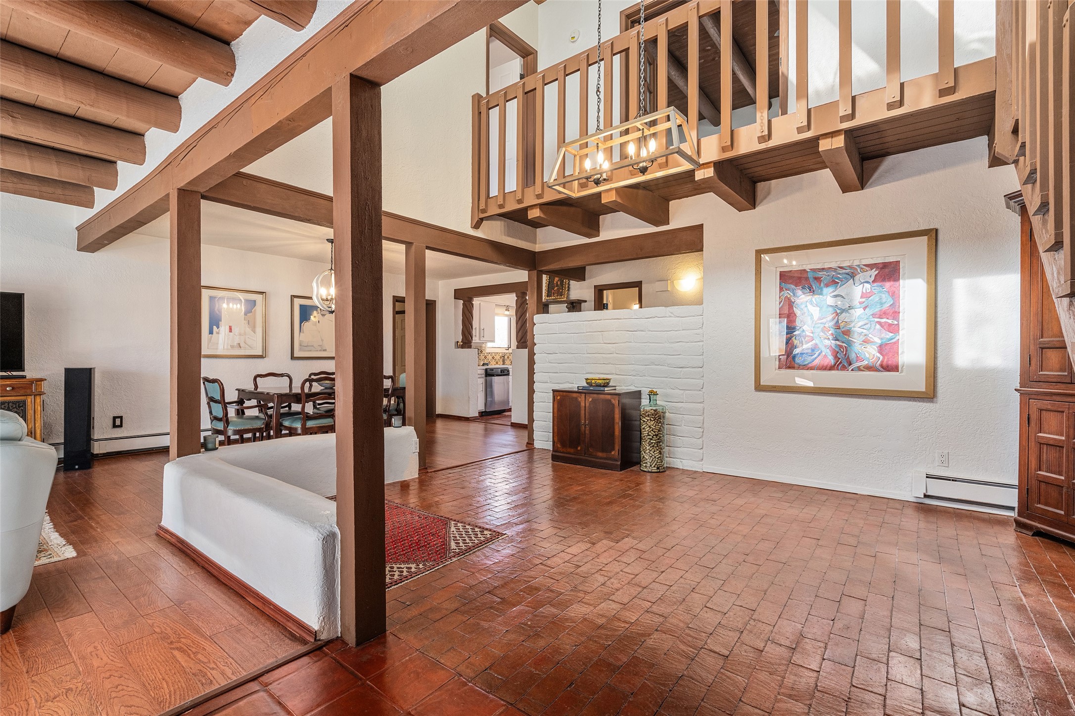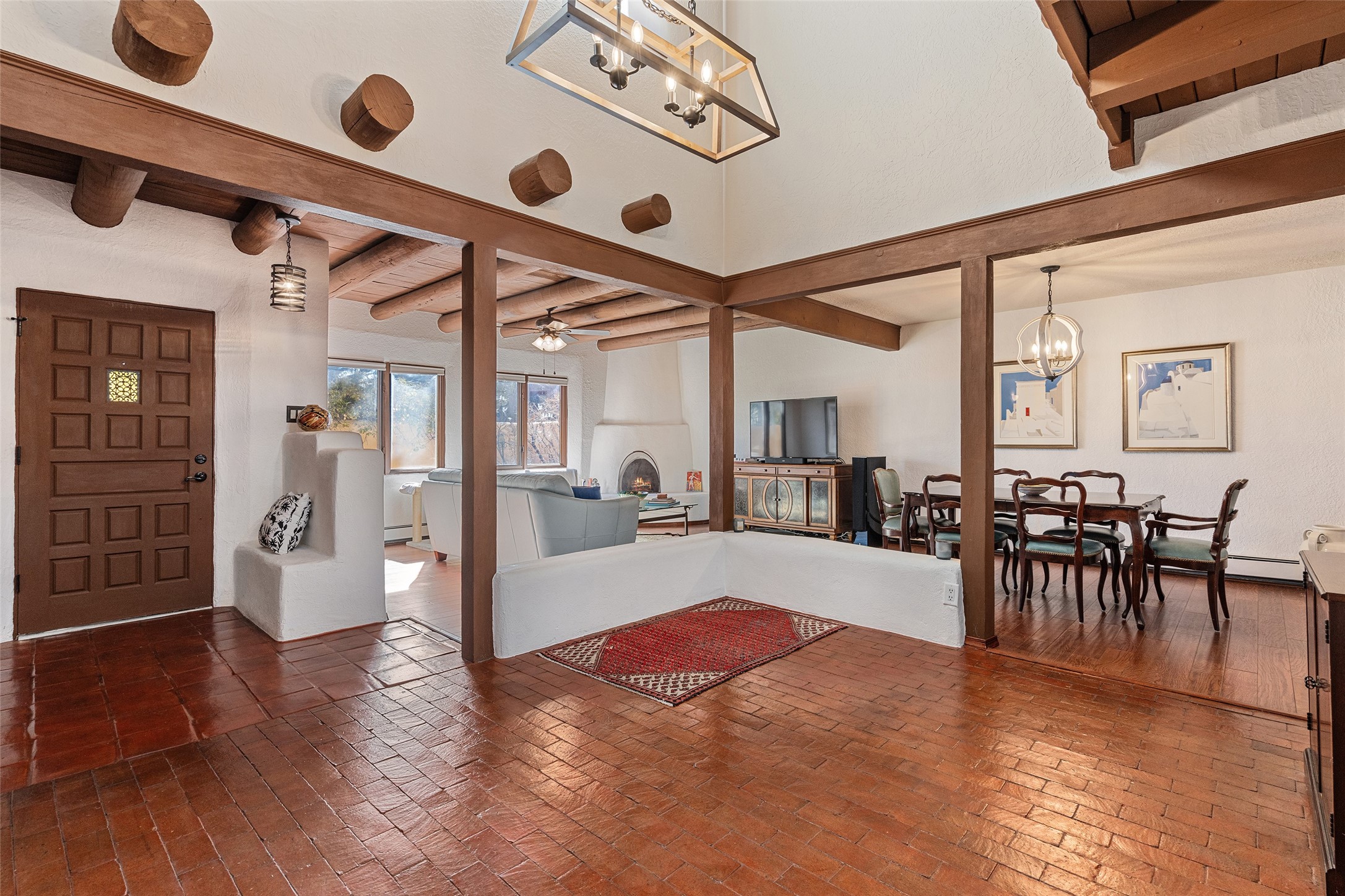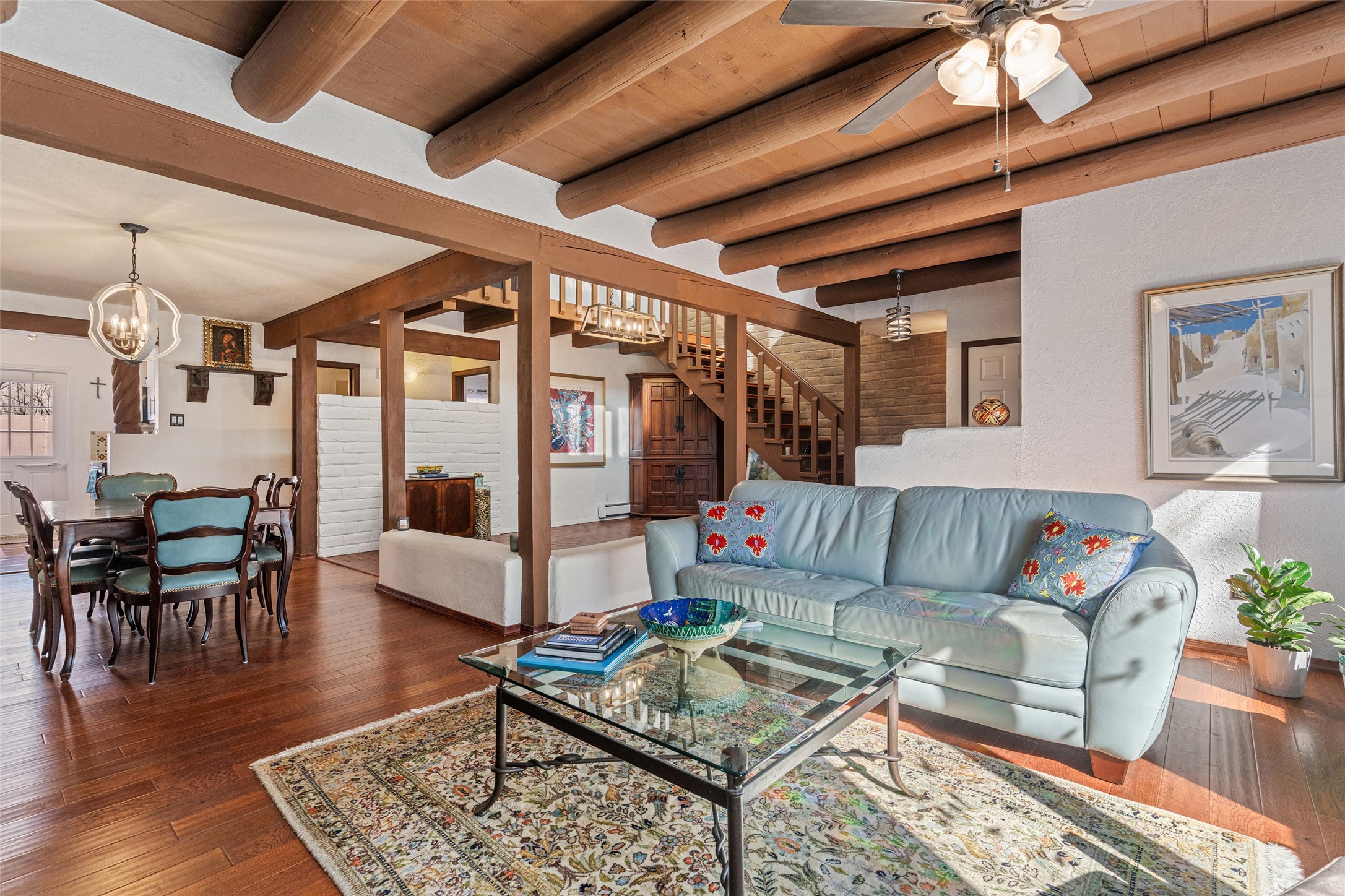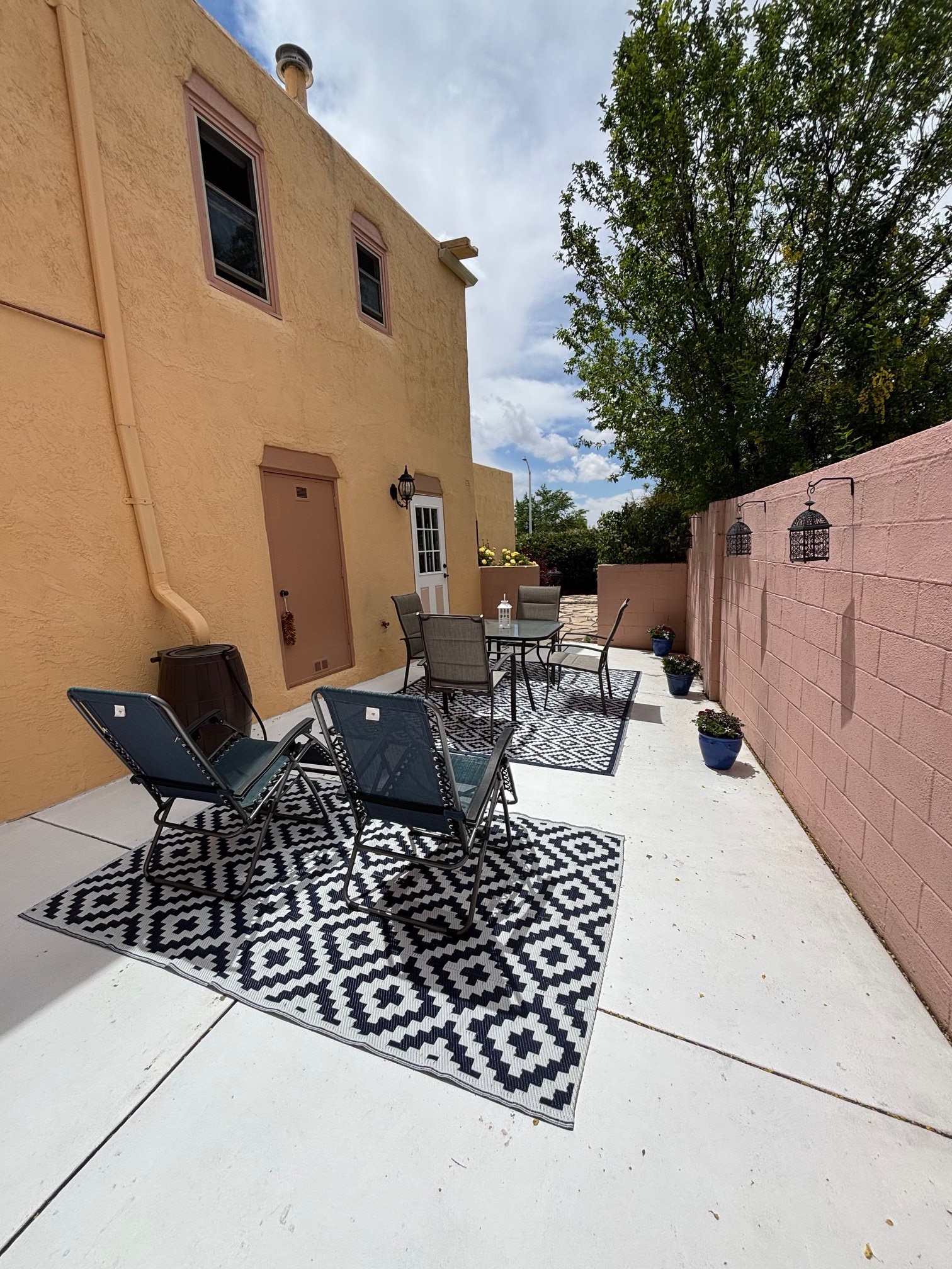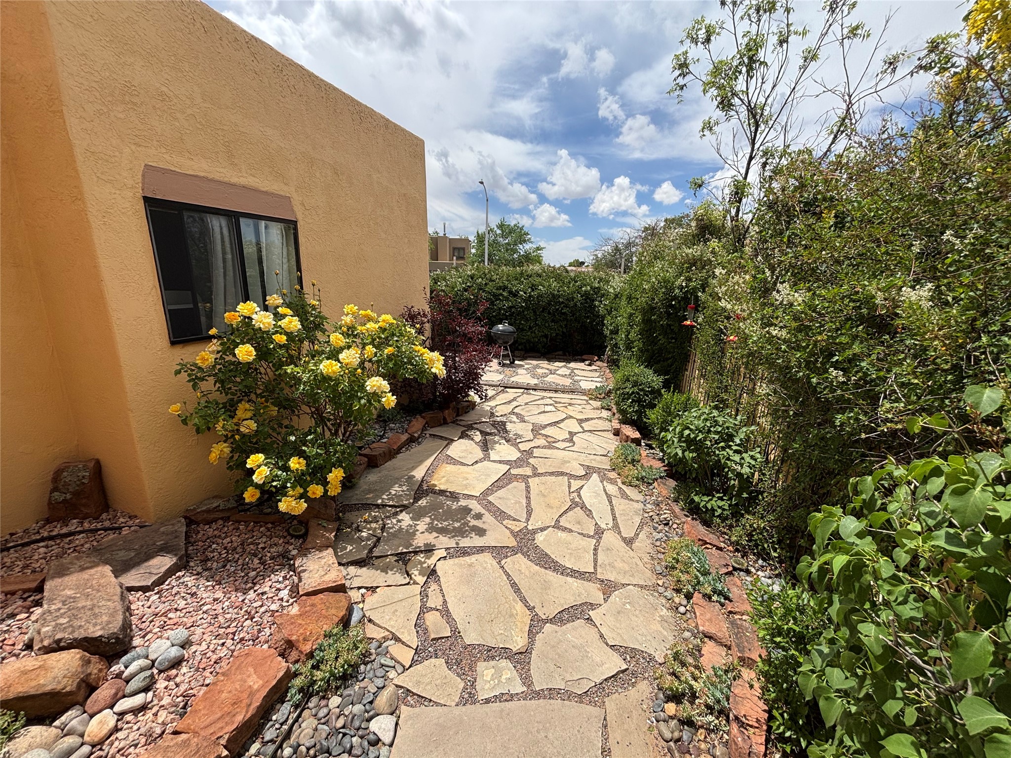 Lovely, two story townhouse on a corner lot. Light and bright! Pueblo style with a kiva wood burning fireplace, vigas, plus Santa Fe style accents. Flooring includes brick, Pergo wood and tile. Newer blinds, and the roof and the boiler were replaced in 2021. Views from the 2nd story deck area. Primary bedroom and second bedroom are located upstairs with one bathroom. One bedroom and one bath are located downstairs. Stainless appliances in the kitchen. Nice sized laundry area and an attached 2 car garage. Walled in front/back patio. Conveniently located to Ragle Park, coffee shops, Target, grocery stores, Genoveva Chavez recreation center and Santa Fe Place Mall.