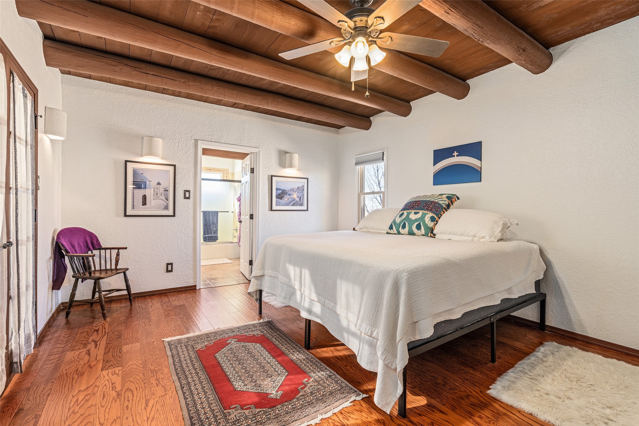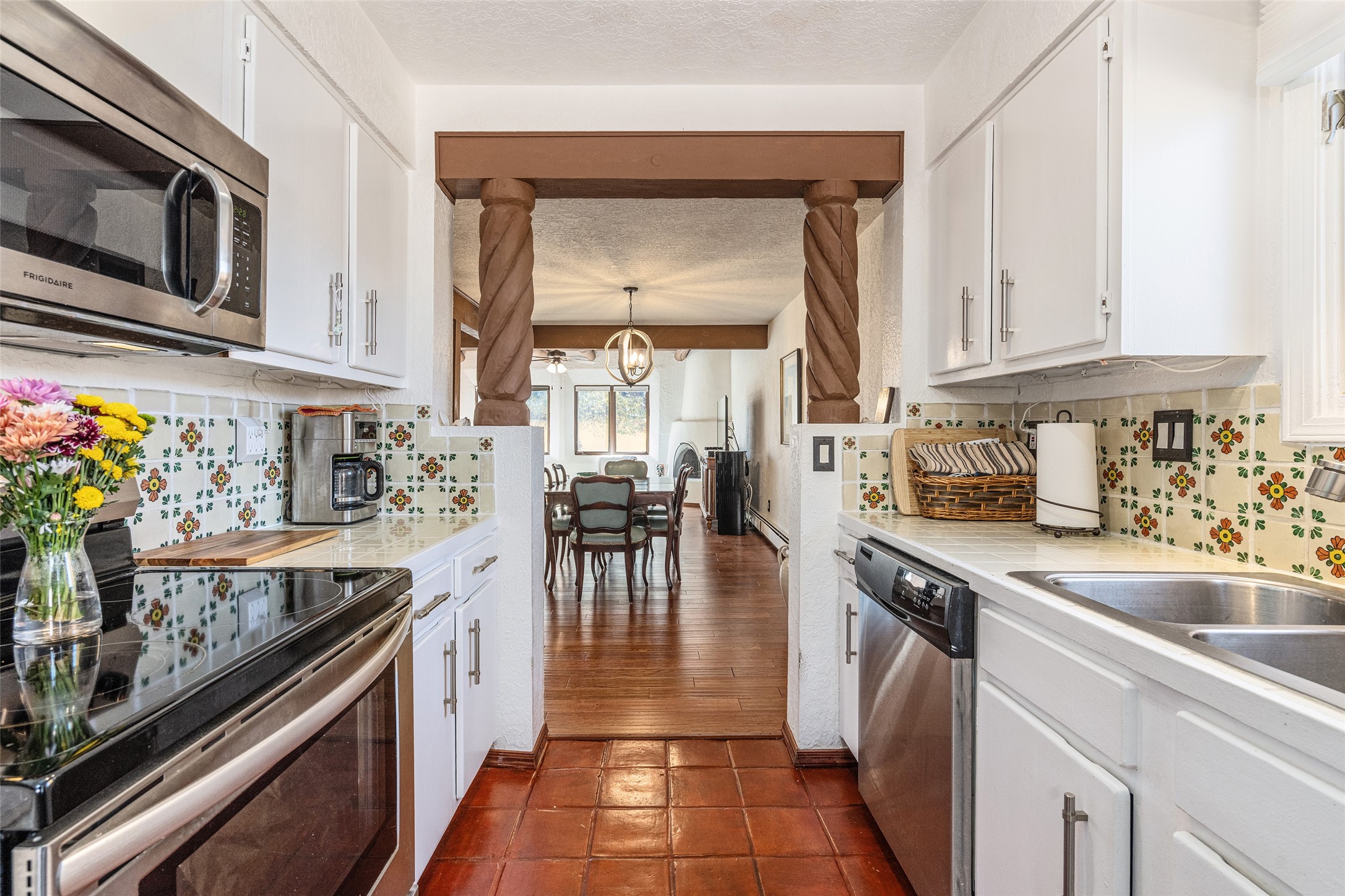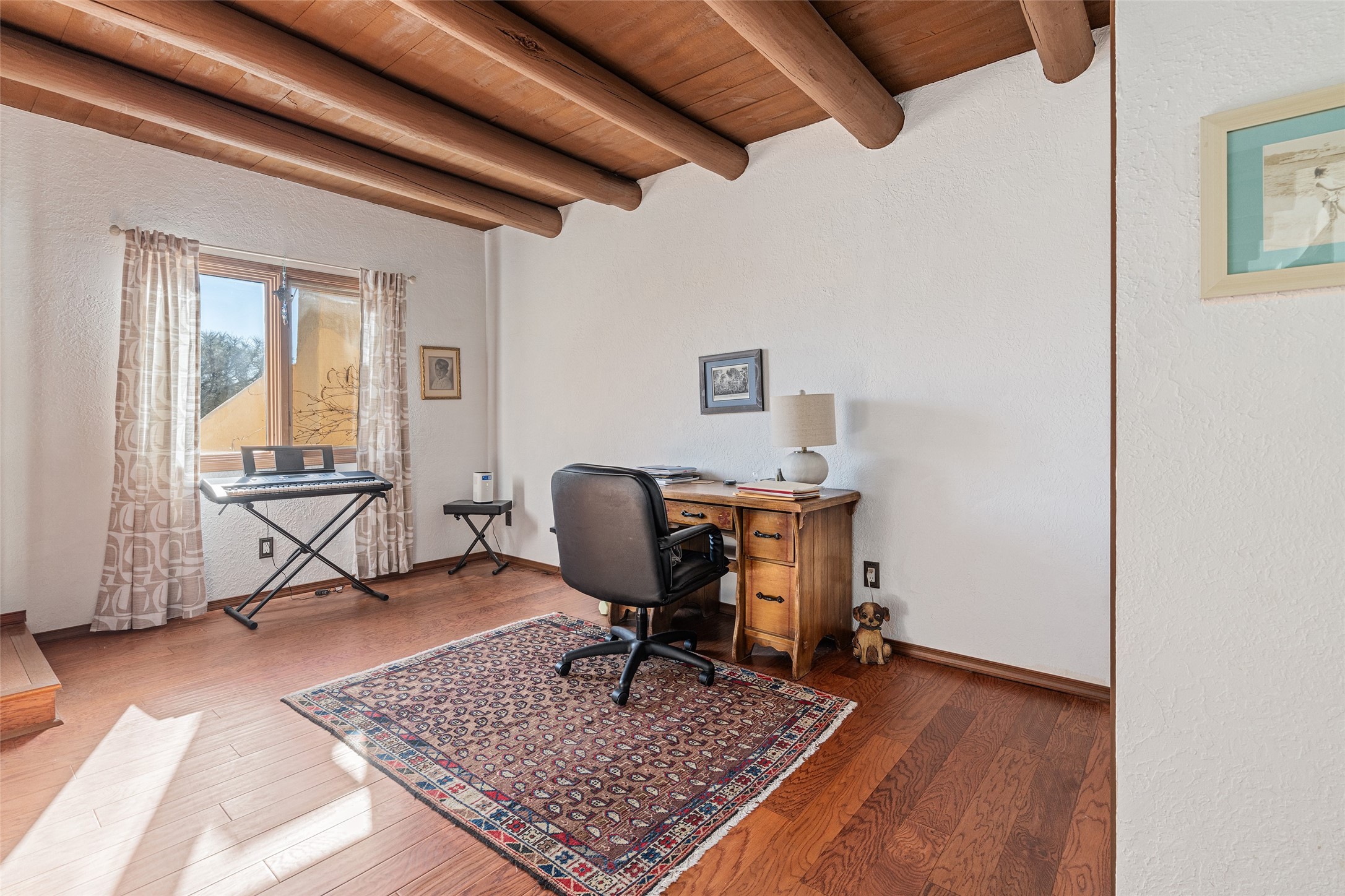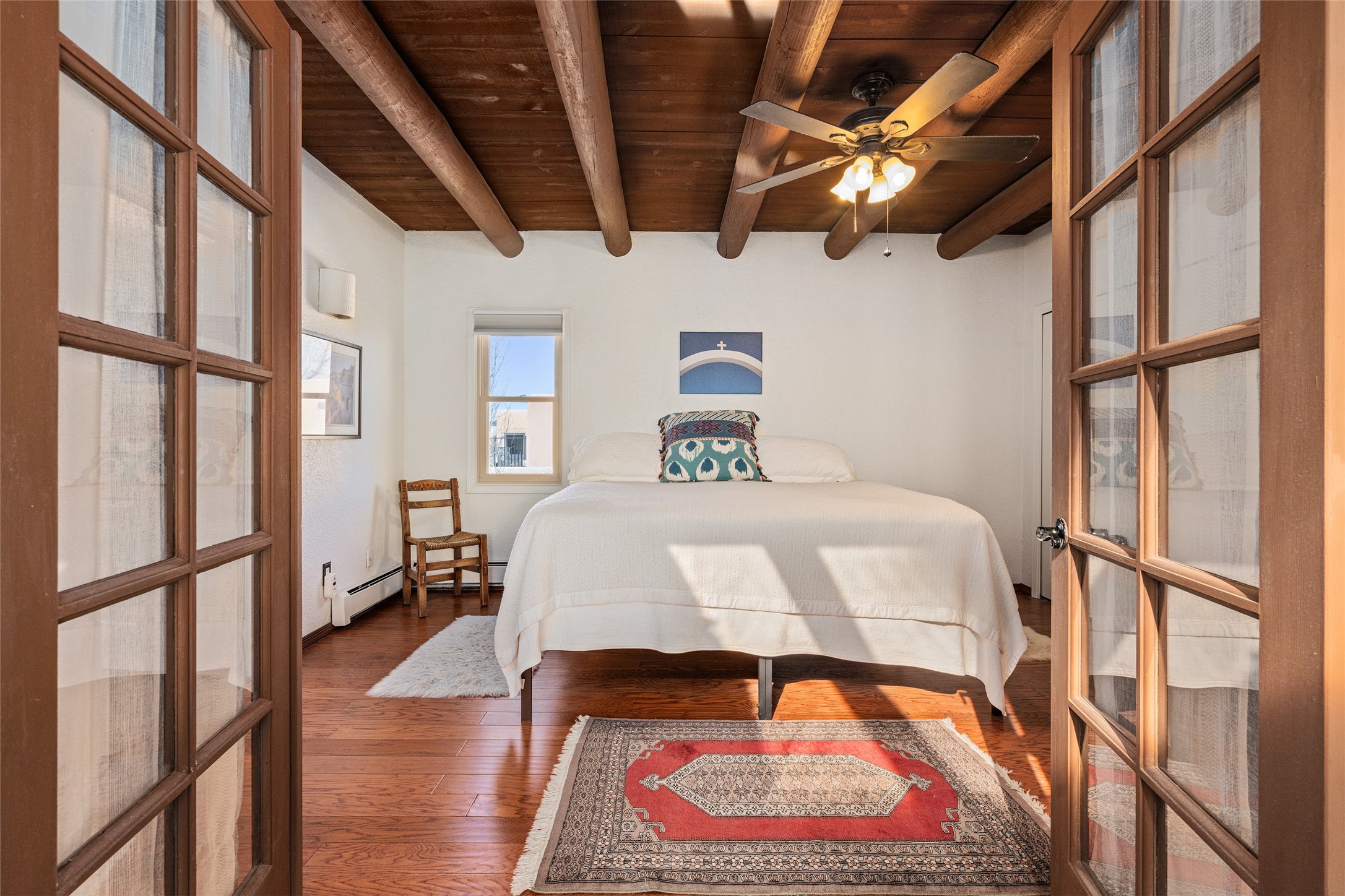 Lovely, two story townhouse on a corner lot. Light and bright! Pueblo style with a kiva wood burning fireplace, vigas, plus Santa Fe style accents. Flooring includes brick, Pergo wood and tile. Newer blinds, and the roof and the boiler were replaced in 2021. Views from the 2nd story deck area. Primary bedroom and second bedroom are located upstairs with one bathroom. One bedroom and one bath are located downstairs. Stainless appliances in the kitchen. Nice sized laundry area and an attached 2 car garage. Walled in front/back patio. Conveniently located to Ragle Park, coffee shops, Target, grocery stores, Genoveva Chavez recreation center and Santa Fe Place Mall.