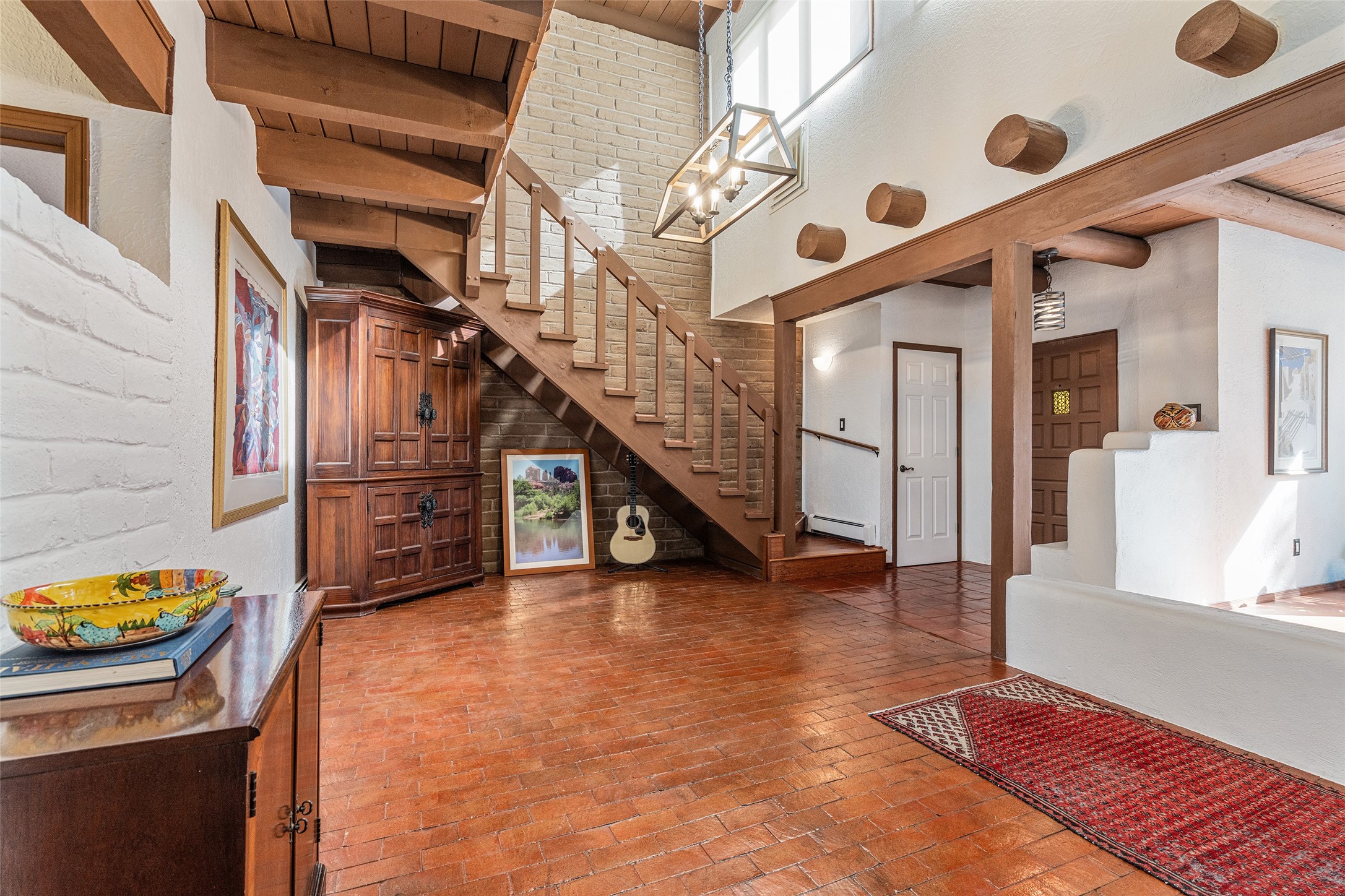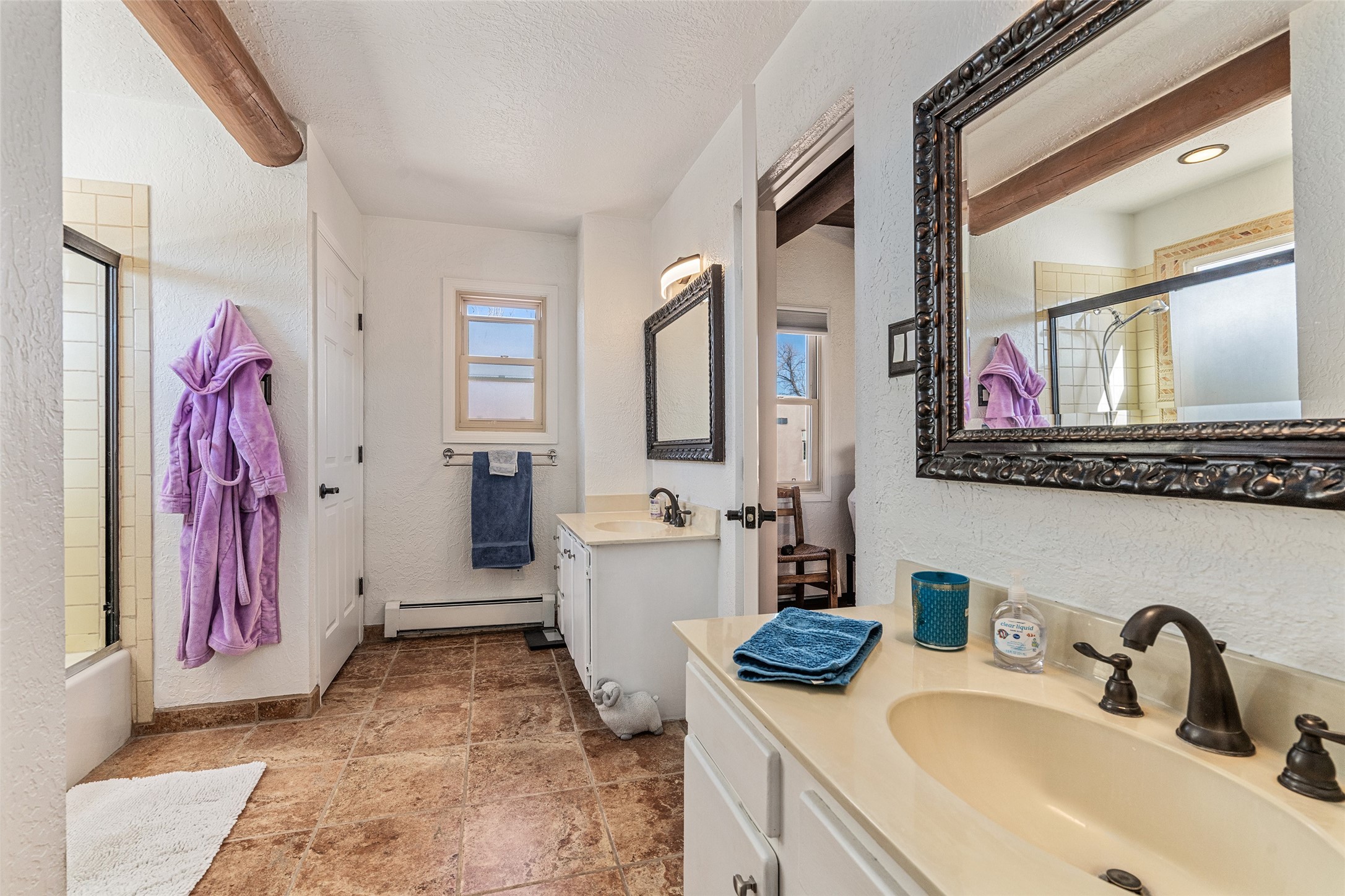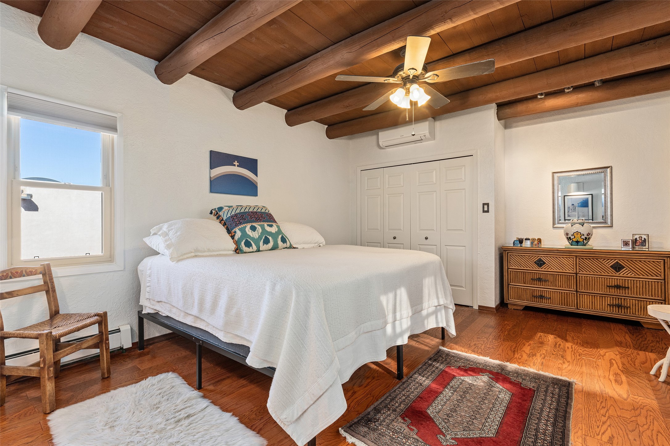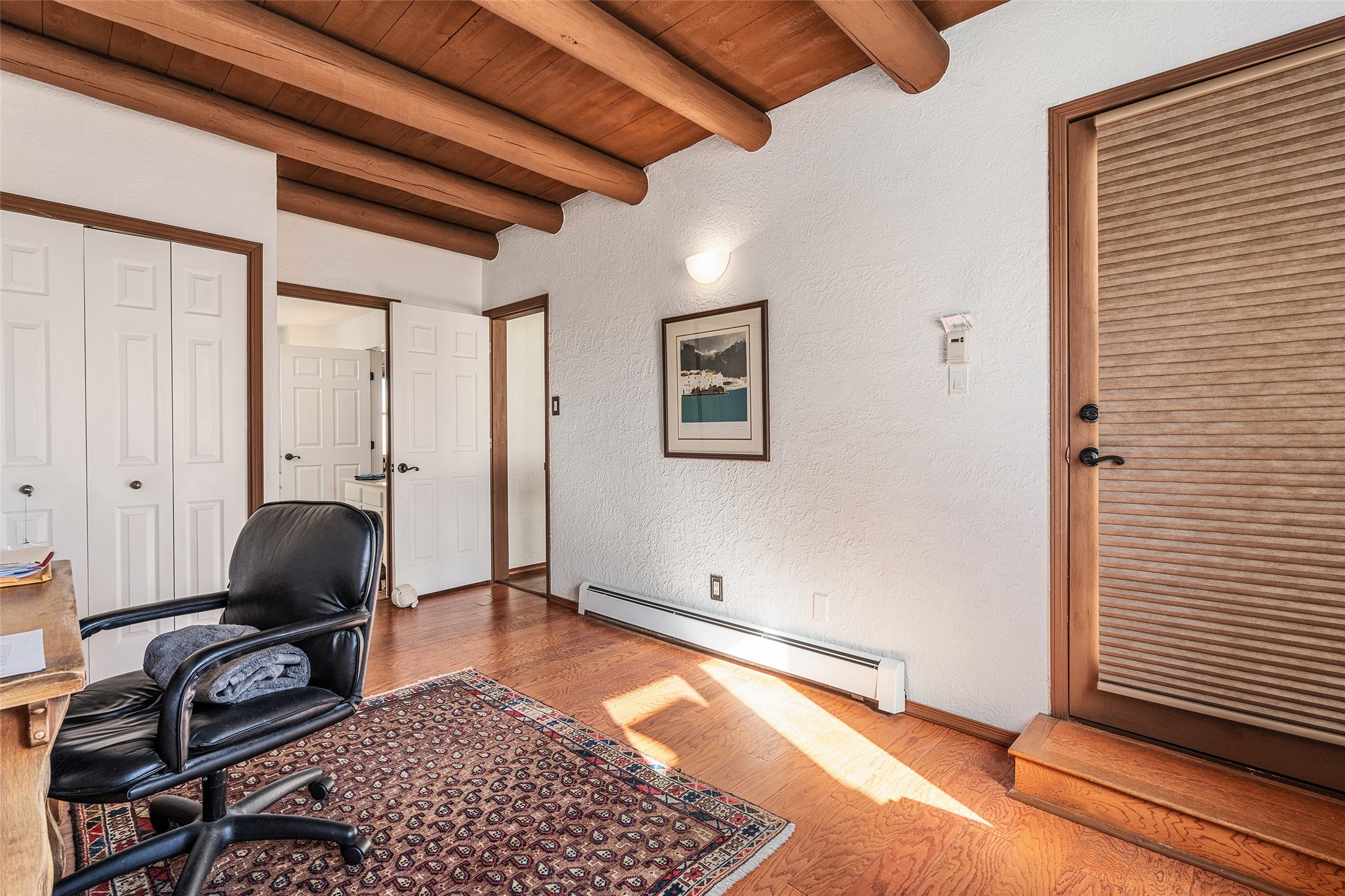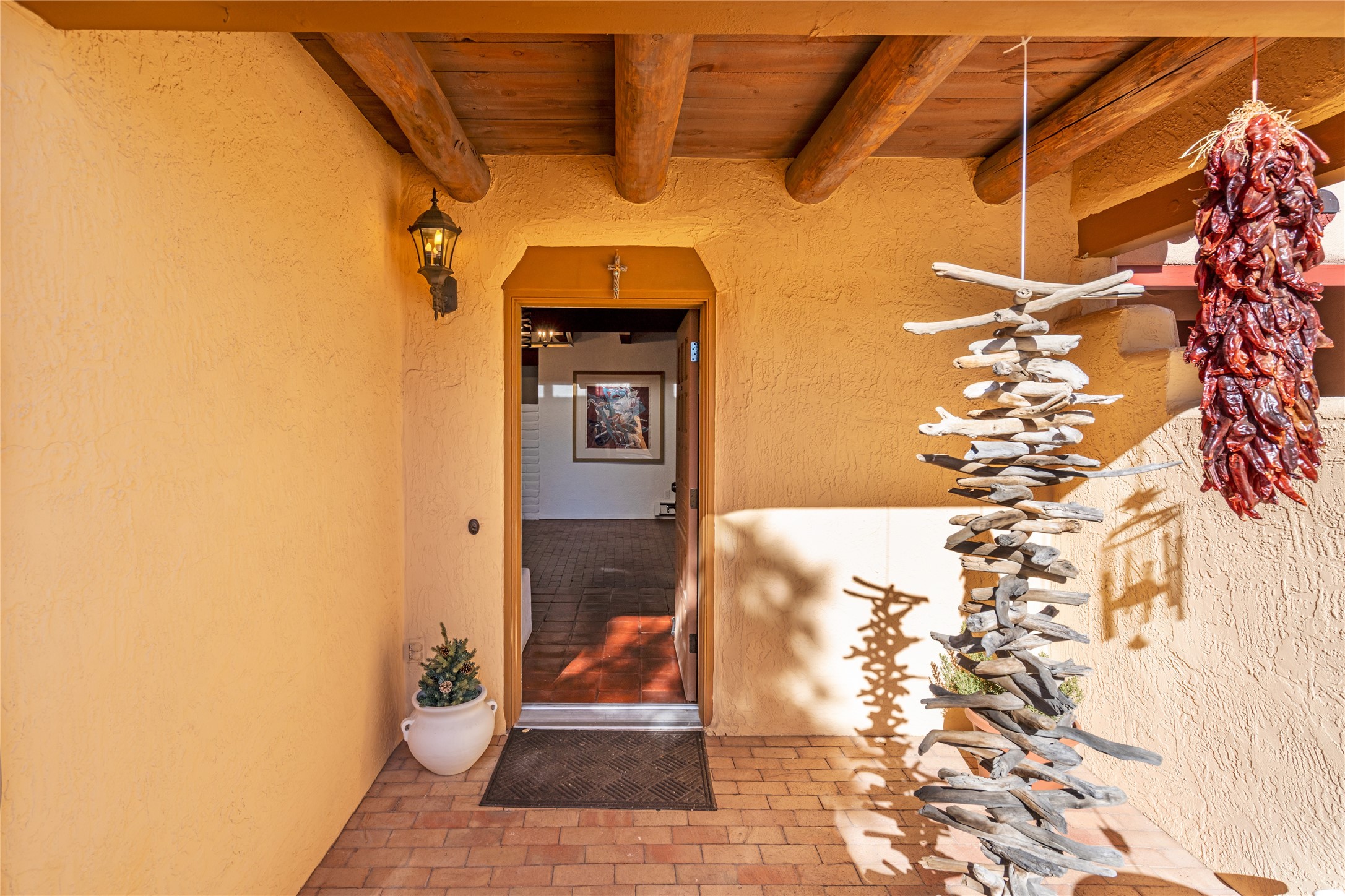Lovely, two story townhouse on a corner lot. Light and bright! Pueblo style with a kiva wood burning fireplace, vigas, plus Santa Fe style accents. Flooring includes brick, Pergo wood and tile. Newer blinds, and the roof and the boiler were replaced in 2021. Views from the 2nd story deck area. Primary bedroom and second bedroom are located upstairs with one bathroom. One bedroom and one bath are located downstairs. Stainless appliances in the kitchen. Nice sized laundry area and an attached 2 car garage. Walled in front/back patio. Conveniently located to Ragle Park, coffee shops, Target, grocery stores, Genoveva Chavez recreation center and Santa Fe Place Mall.