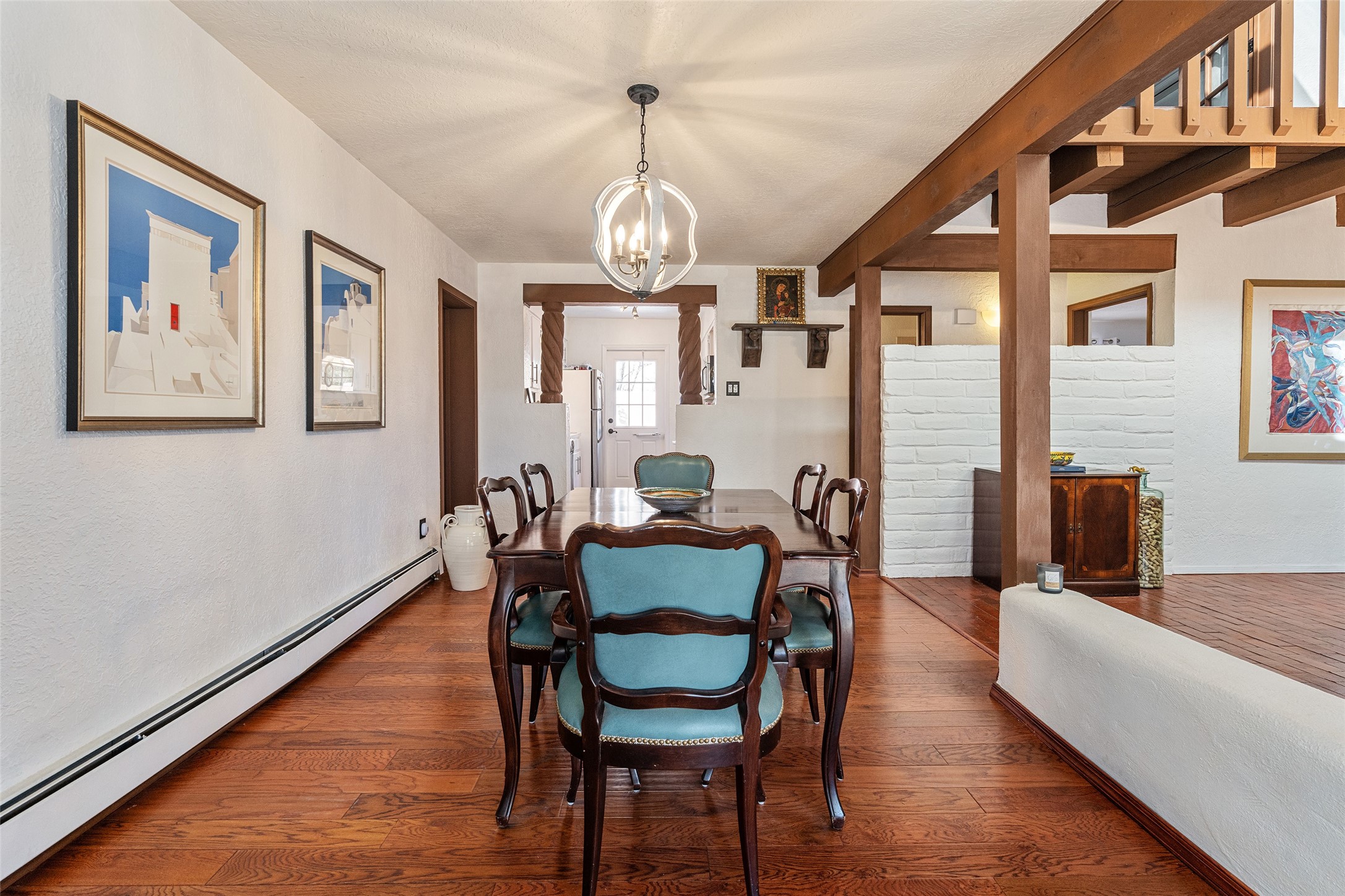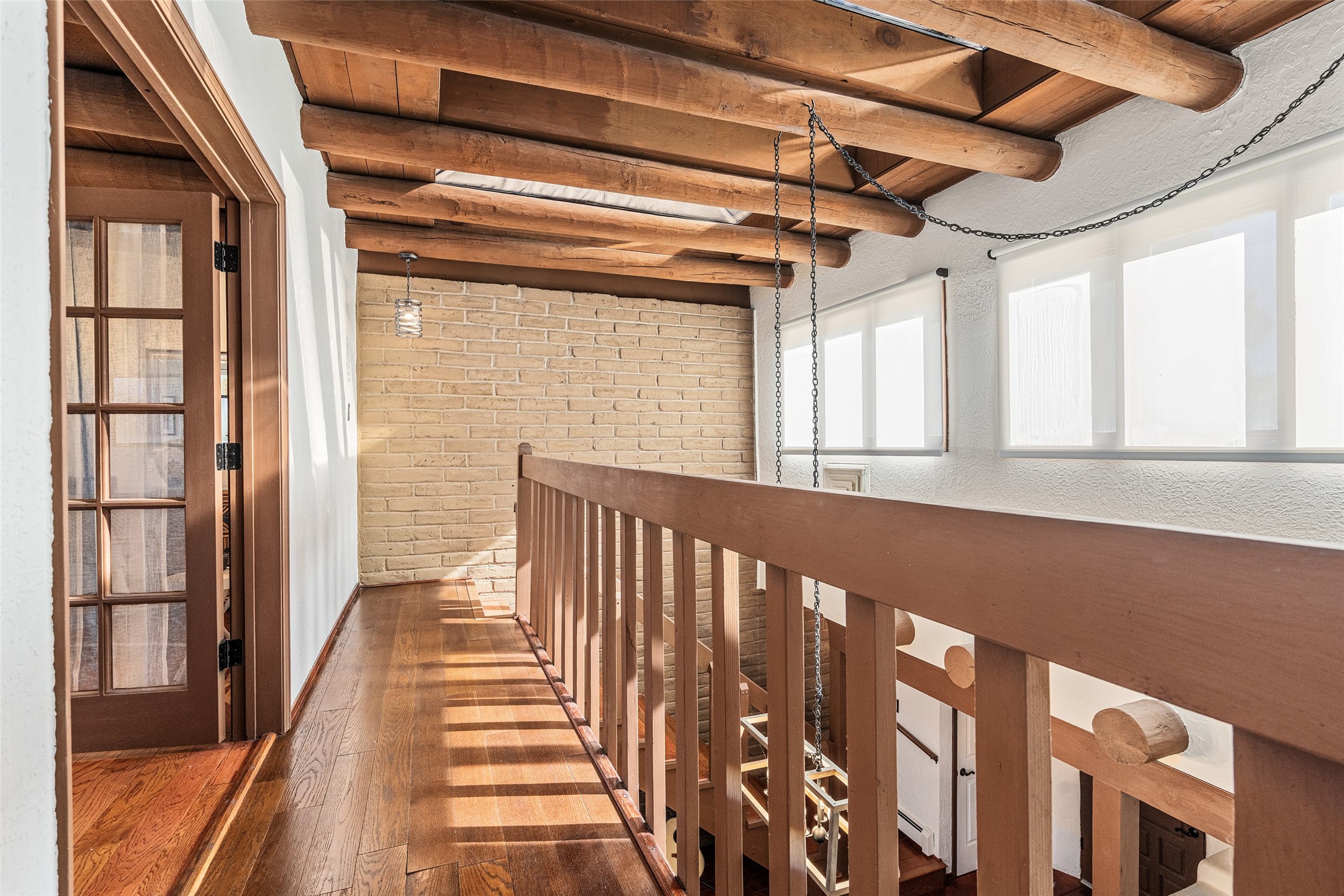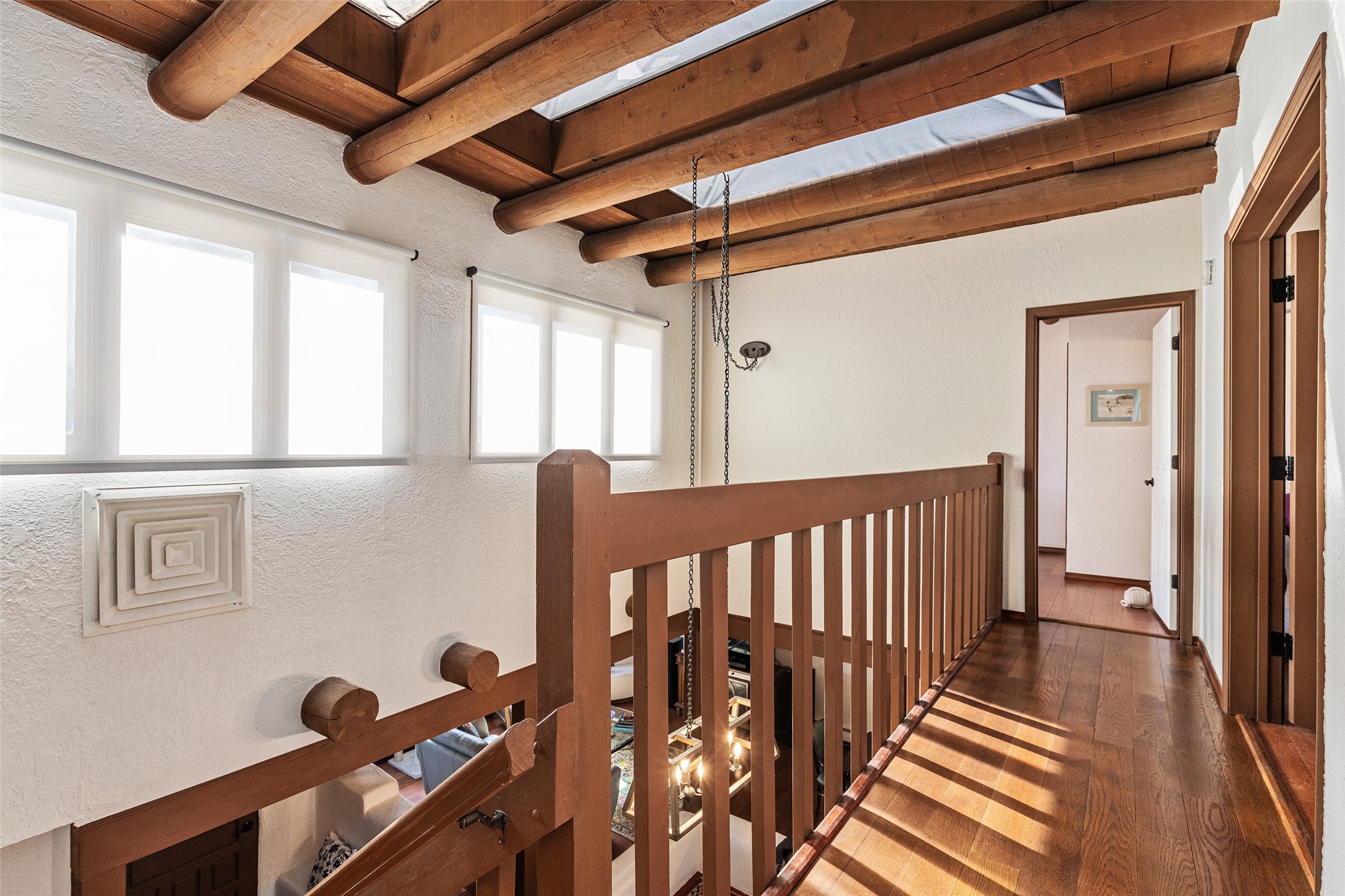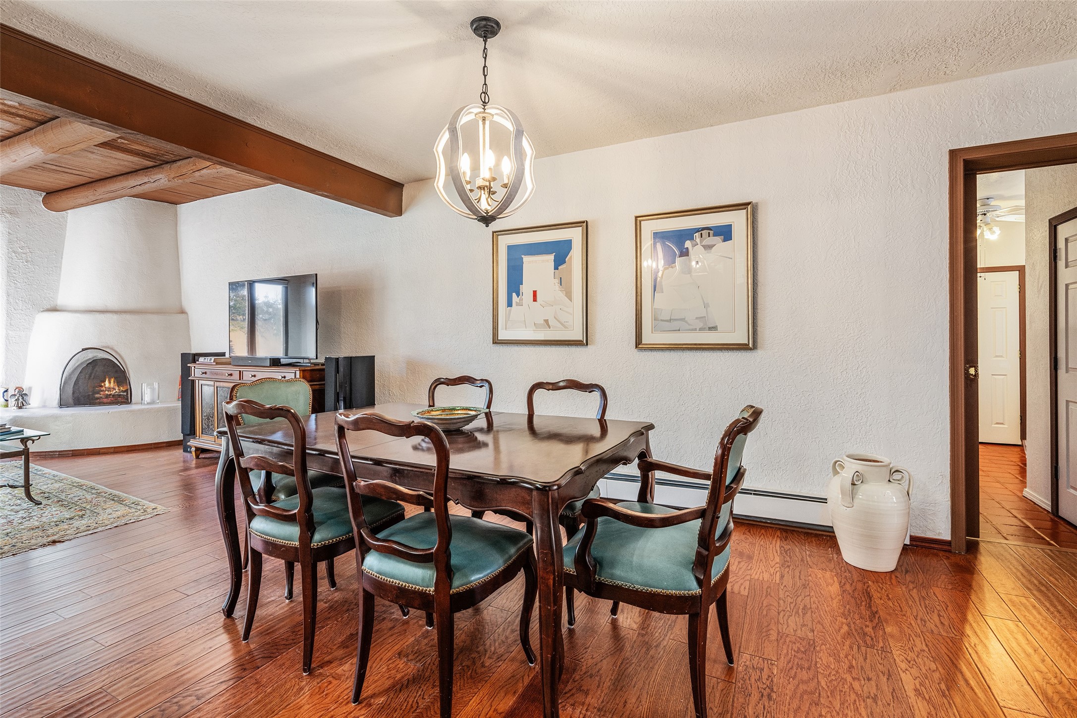 Lovely, two story townhouse on a corner lot. Light and bright! Pueblo style with a kiva wood burning fireplace, vigas, plus Santa Fe style accents. Flooring includes brick, Pergo wood and tile. Newer blinds, and the roof and the boiler were replaced in 2021. Views from the 2nd story deck area. Primary bedroom and second bedroom are located upstairs with one bathroom. One bedroom and one bath are located downstairs. Stainless appliances in the kitchen. Nice sized laundry area and an attached 2 car garage. Walled in front/back patio. Conveniently located to Ragle Park, coffee shops, Target, grocery stores, Genoveva Chavez recreation center and Santa Fe Place Mall.