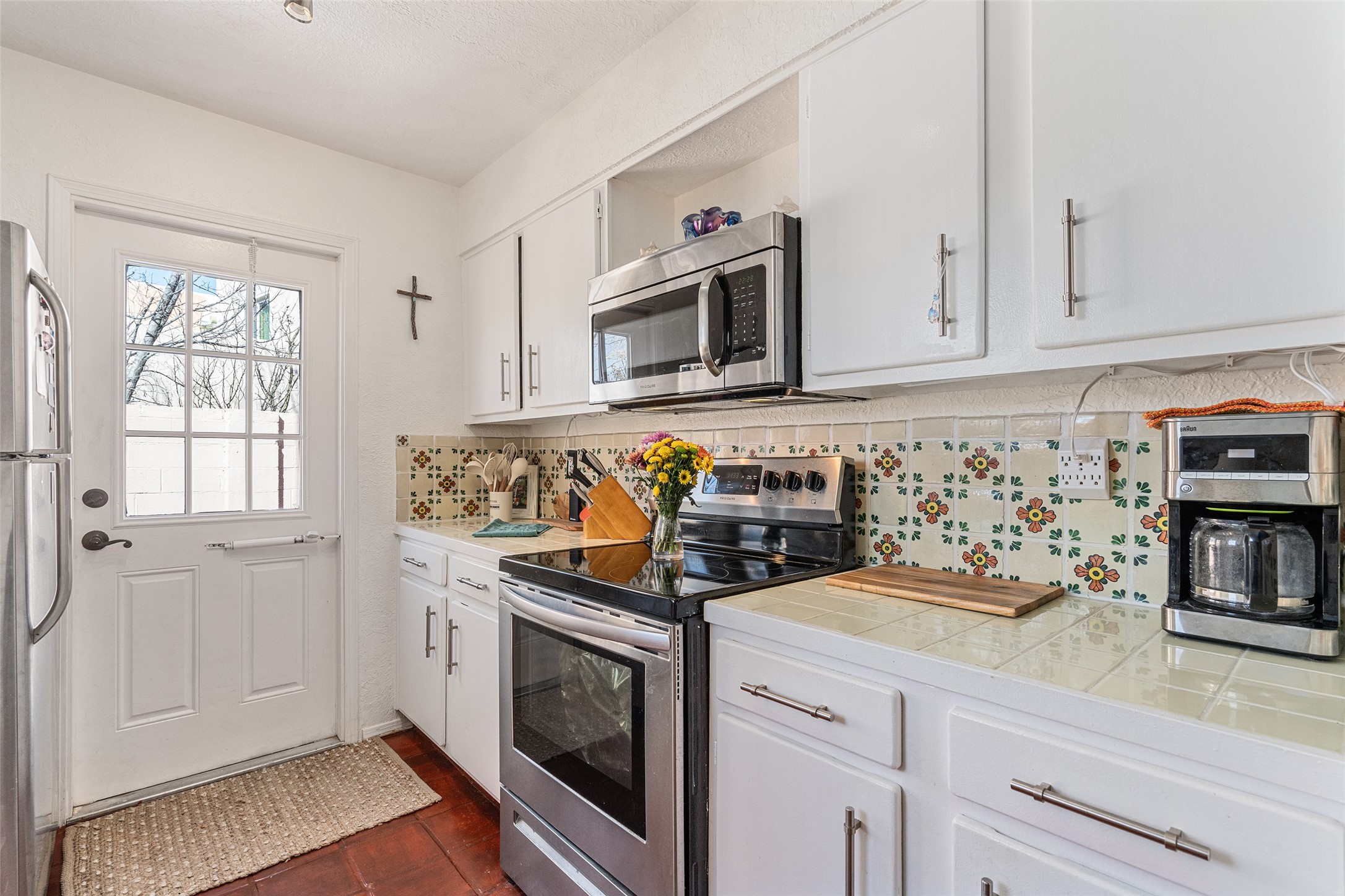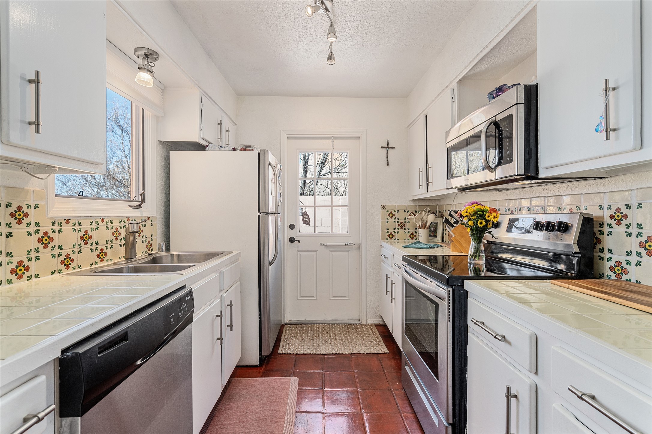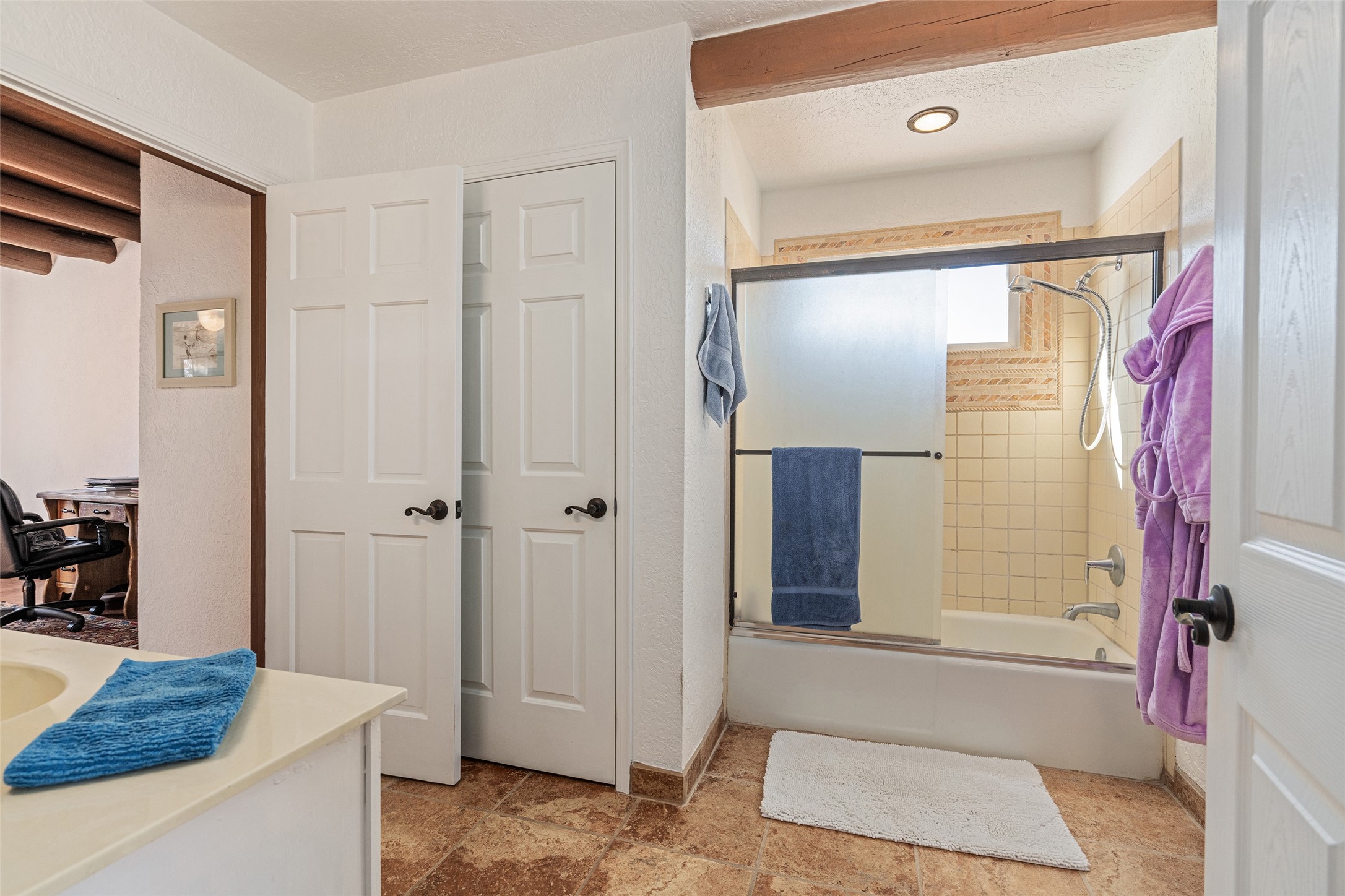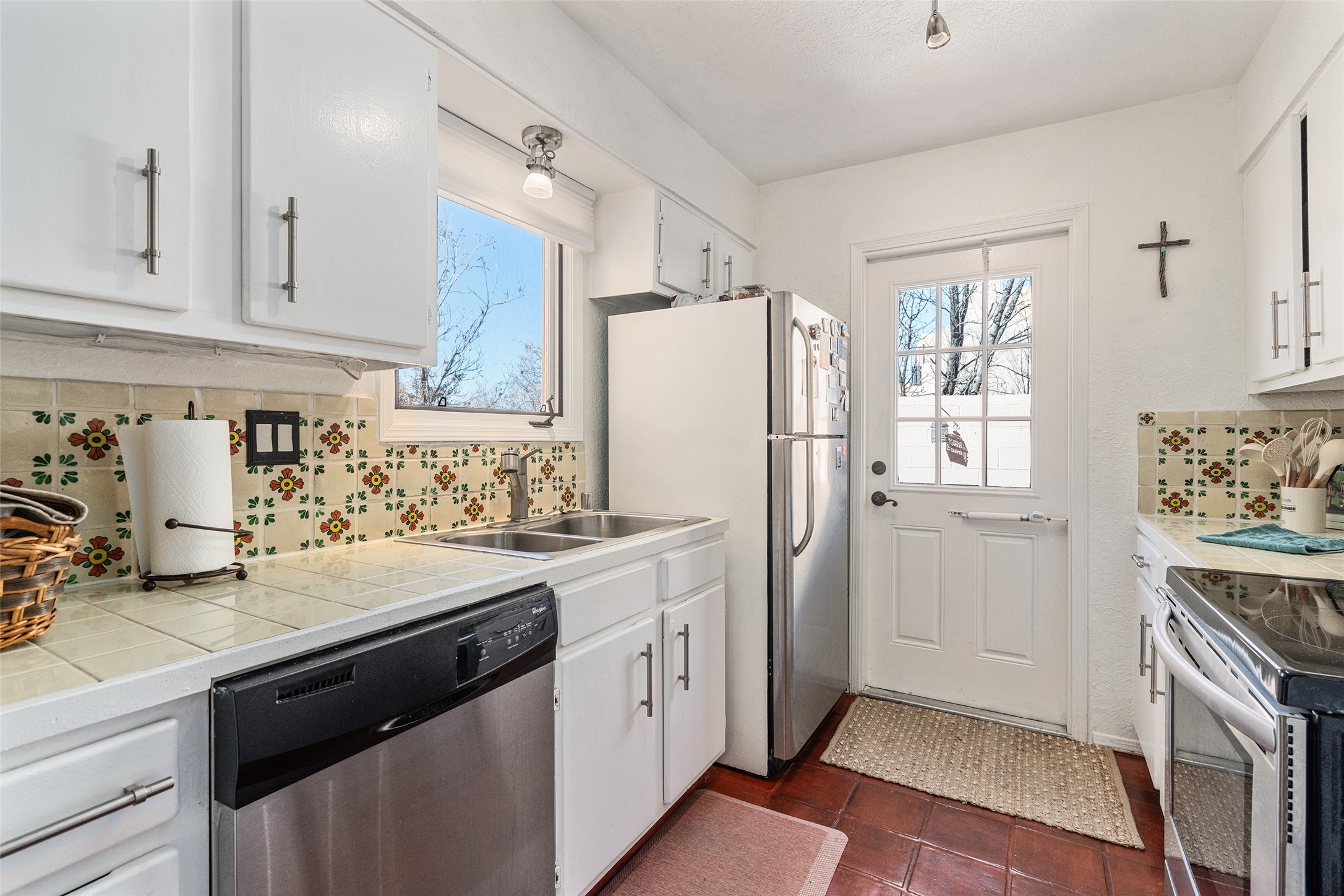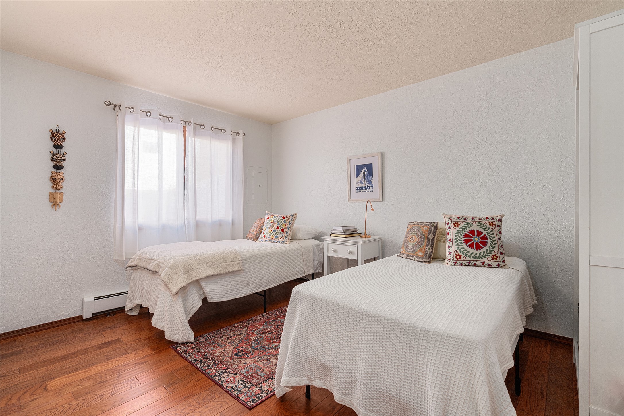 Lovely, two story townhouse on a corner lot. Light and bright! Pueblo style with a kiva wood burning fireplace, vigas, plus Santa Fe style accents. Flooring includes brick, Pergo wood and tile. Newer blinds, and the roof and the boiler were replaced in 2021. Views from the 2nd story deck area. Primary bedroom and second bedroom are located upstairs with one bathroom. One bedroom and one bath are located downstairs. Stainless appliances in the kitchen. Nice sized laundry area and an attached 2 car garage. Walled in front/back patio. Conveniently located to Ragle Park, coffee shops, Target, grocery stores, Genoveva Chavez recreation center and Santa Fe Place Mall.