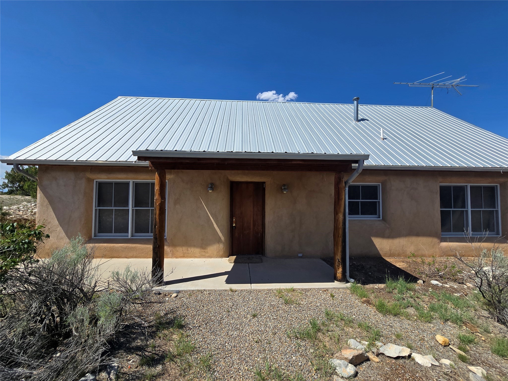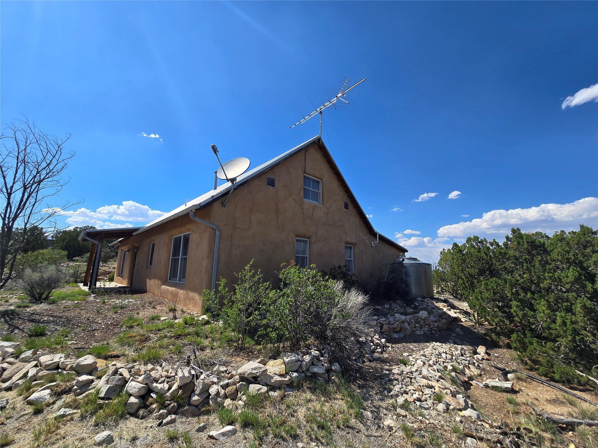 Off-grid living at its finest. Breath-taking panoramic views, quiet and serene amongst the natural flora and fauna of the beautiful, high deserts of New Mexico. 58 acres located outside the historic Village of Cerrillos, nestled between Santa Fe and Albuquerque. This strawbale home has all the amenities. Fully solar-powered home, radiant floor heating, a wood stove, rain catchment system attached to a pitched, metal roof, and an enchanting open-concept kitchen and common area. One master bedroom, laundry room, full bath, and a loft, accessible by a spiral staircase from the common area. There is a detached, insulated building with windows can be used as a studio. Recently renovated at the end of 2025.