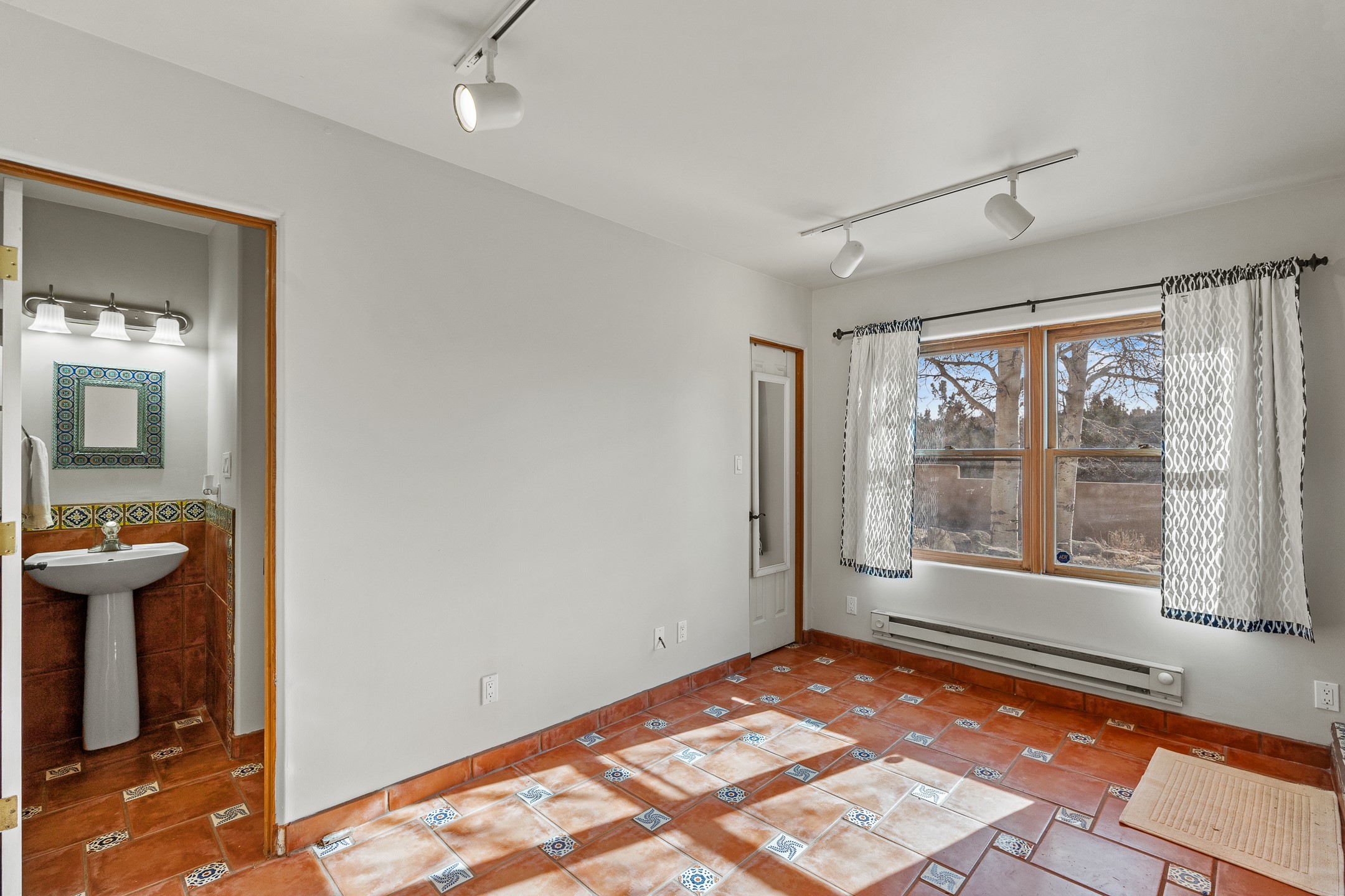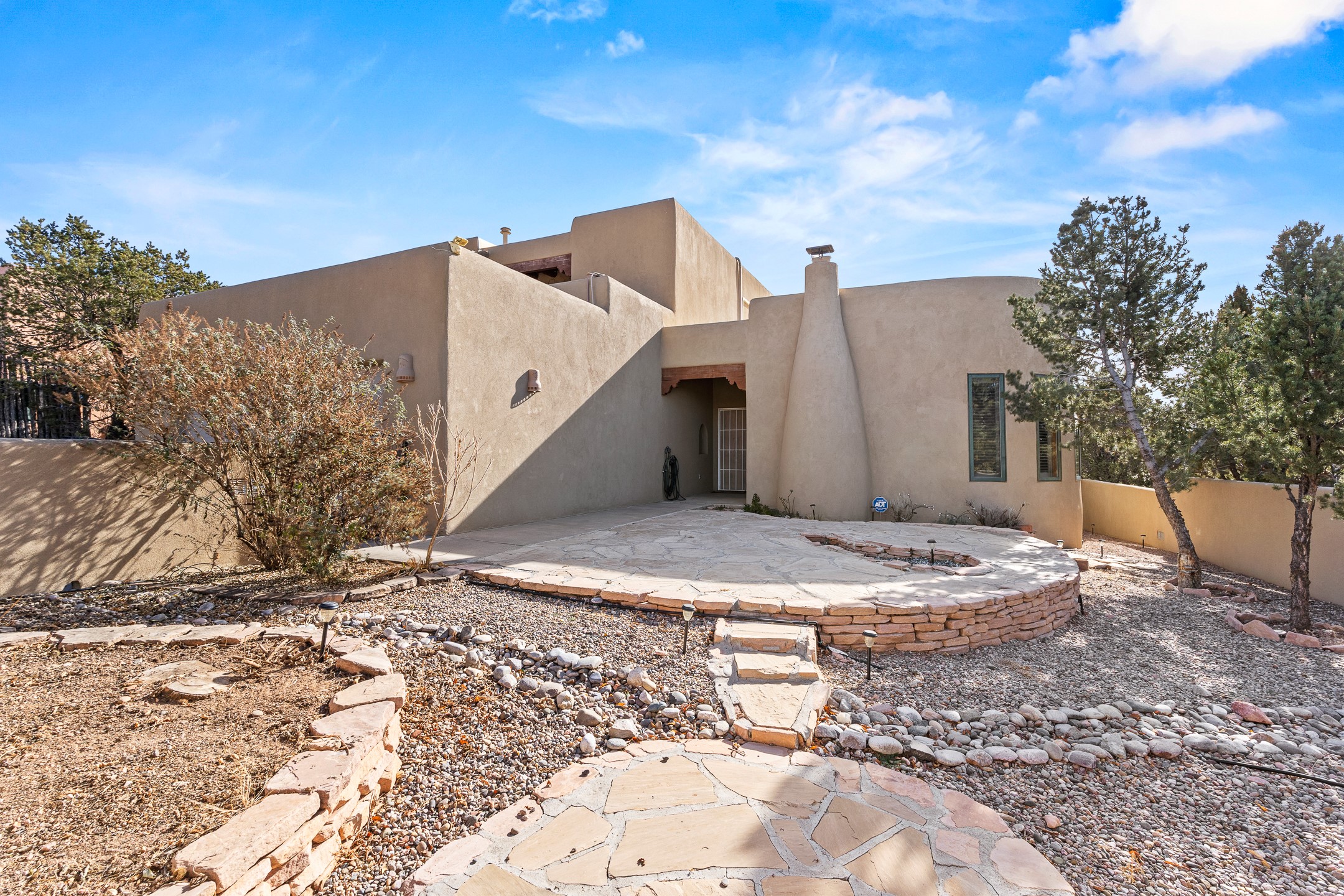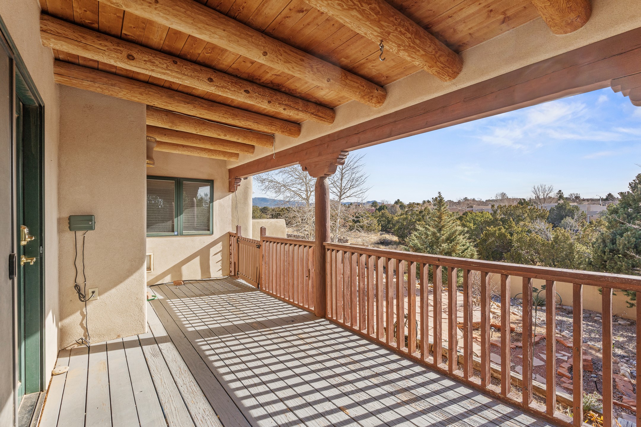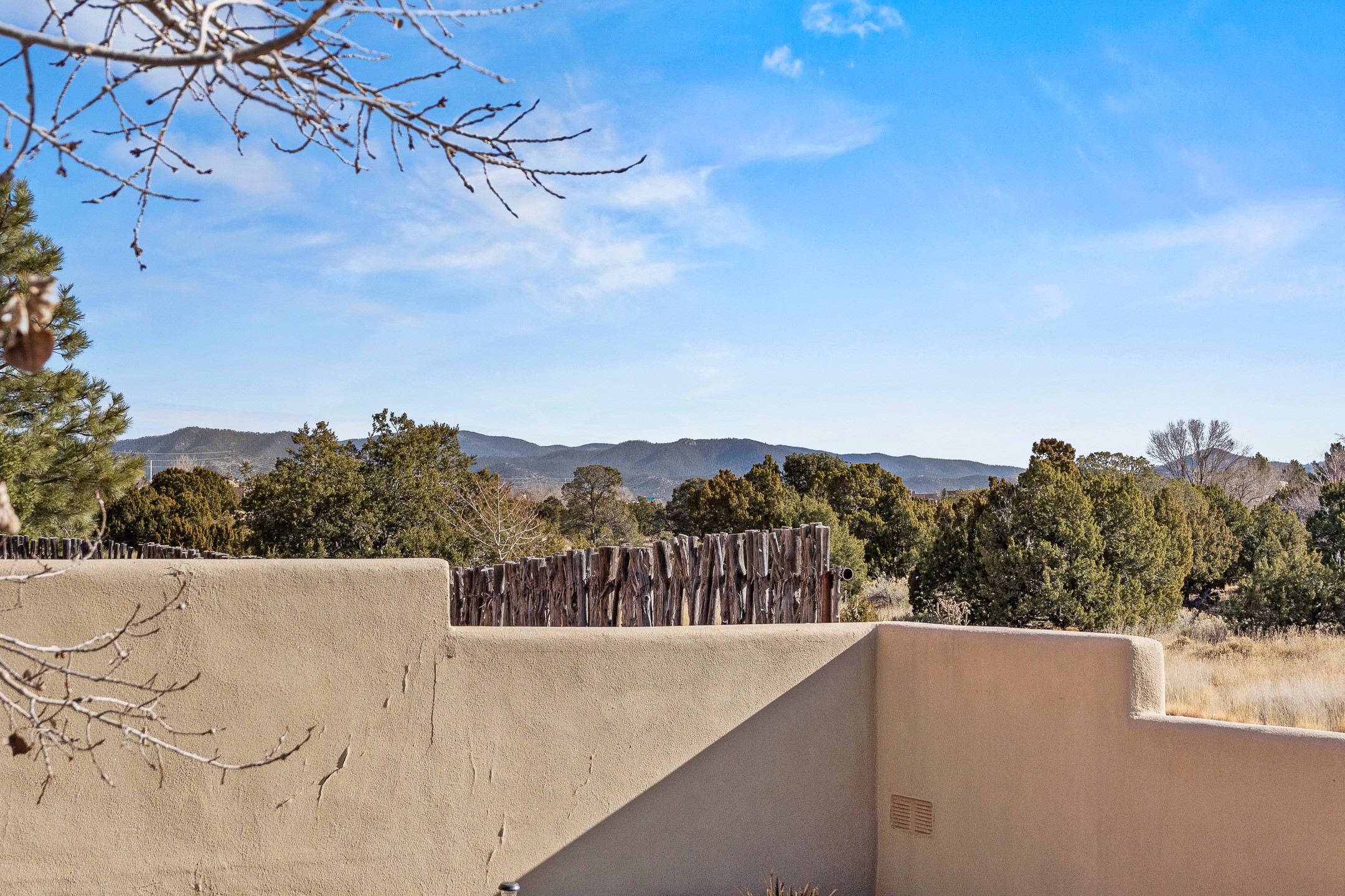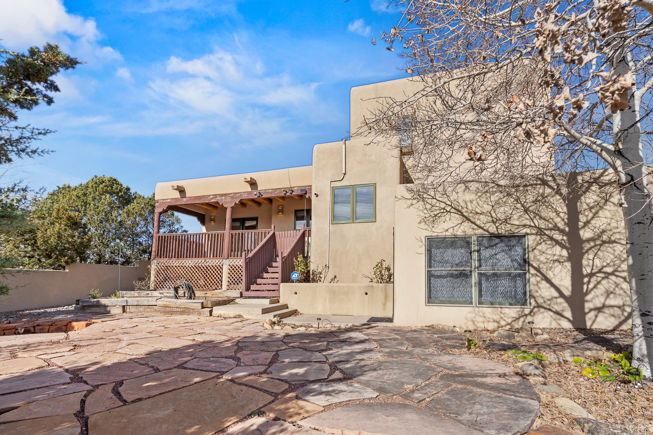 Custom home located in the sought-after Pueblos de Sol subdivision, offering comfortable living and sweeping sunrise andsunset views. Situated on a nicely sized corner lot, this home features a covered portal and rear deck--perfect for relaxingand enjoying the scenery. The kitchen showcases newer cabinetry, stainless steel appliances, granite countertops, and acoordinating backsplash. A formal dining room and a separate breakfast nook provide flexible dining options. ClassicSouthwestern details shine throughout, including tongue-and-groove ceilings with vigas and a Kiva fireplace. The oversized primary bedroom offers a true retreat, complete with a spa-like en suite bathroom featuring a standalone soaking tub, separate shower, and access to a private deck. Recent upgrades include a TPO roof installed in 2022 and a new boiler for radiant heating installed in 2024. Year-round comfort is ensured with five mini-split systems. Outdoor spaces include a charming landscaped courtyard with flagstone, mature trees, drip irrigation, and a pet-friendly layout. The rear deck is ideal for outdoor entertaining. The property backs to a walking trail, with a community park conveniently located across the street. A separate-entry studio/guesthouse with a full bath completes this exceptional offering--perfect for guests or rental income potential.