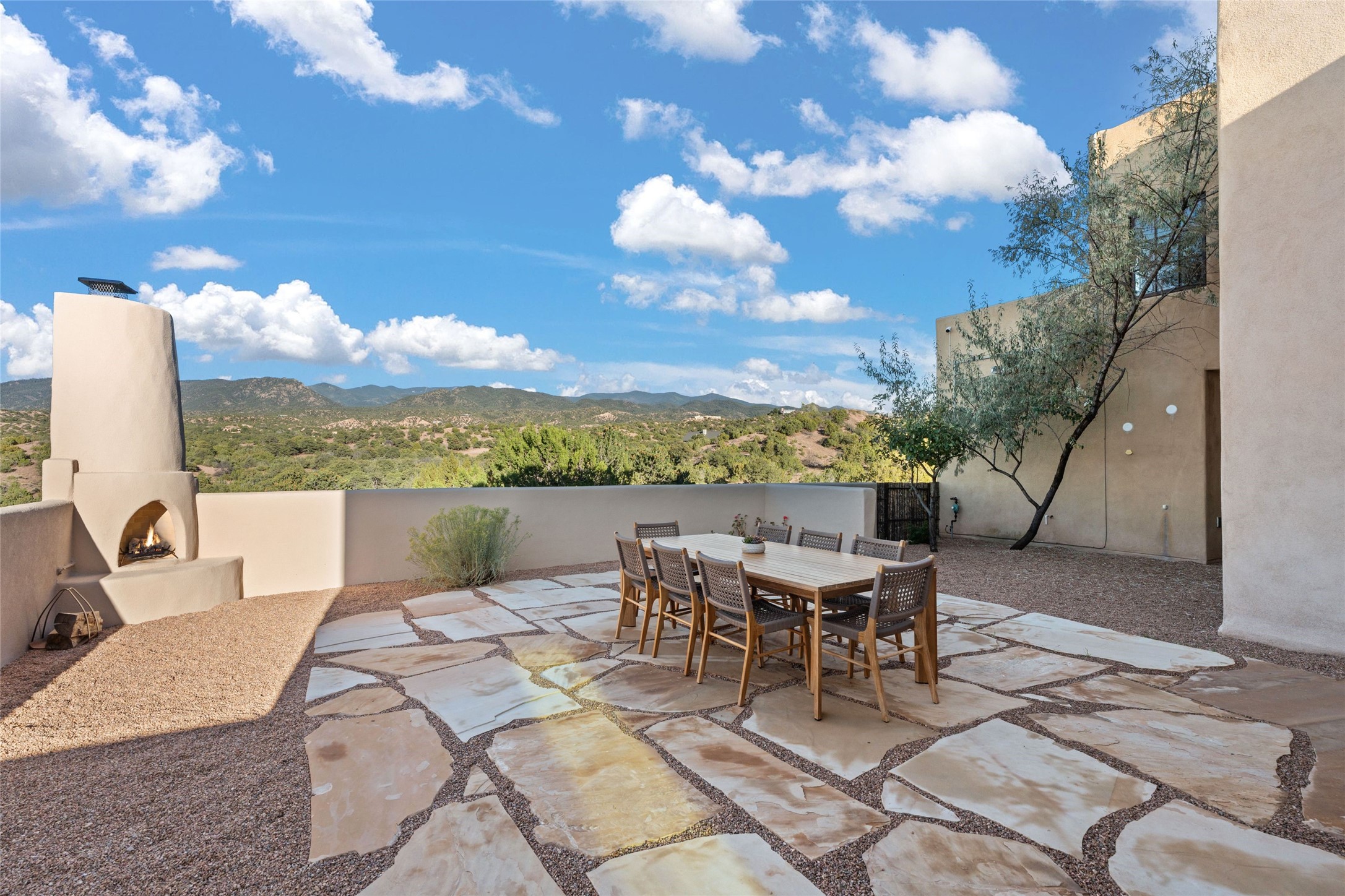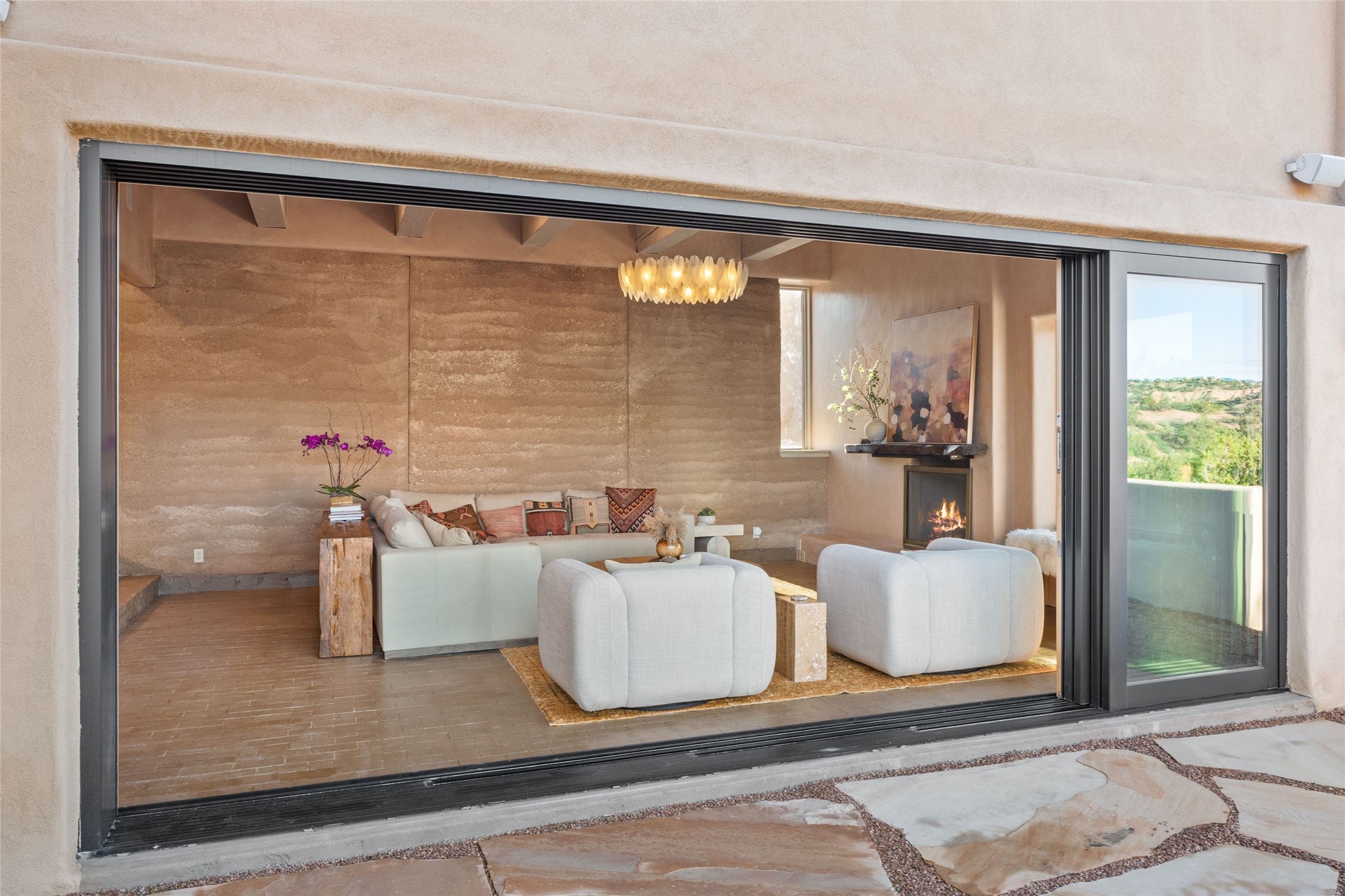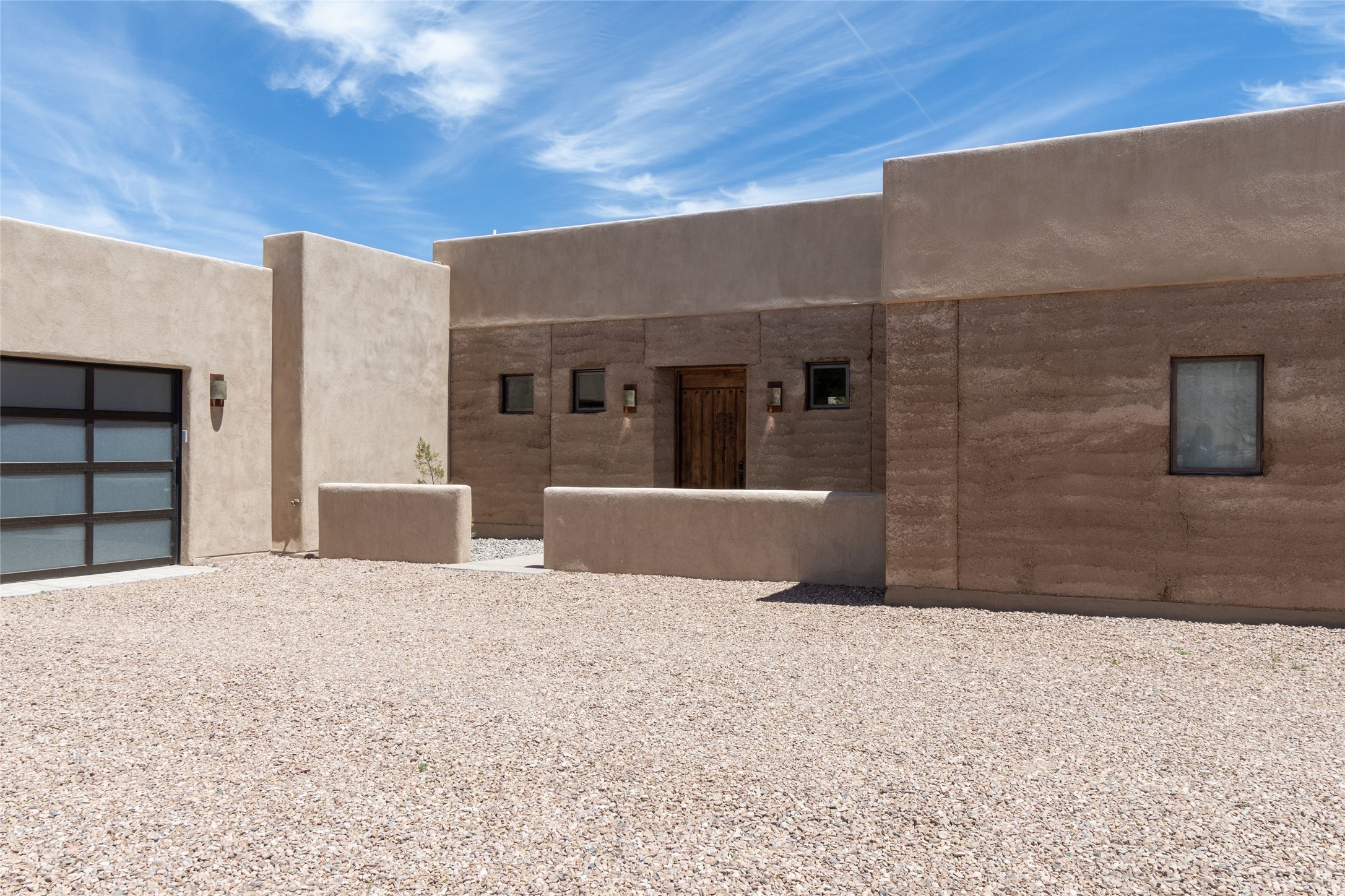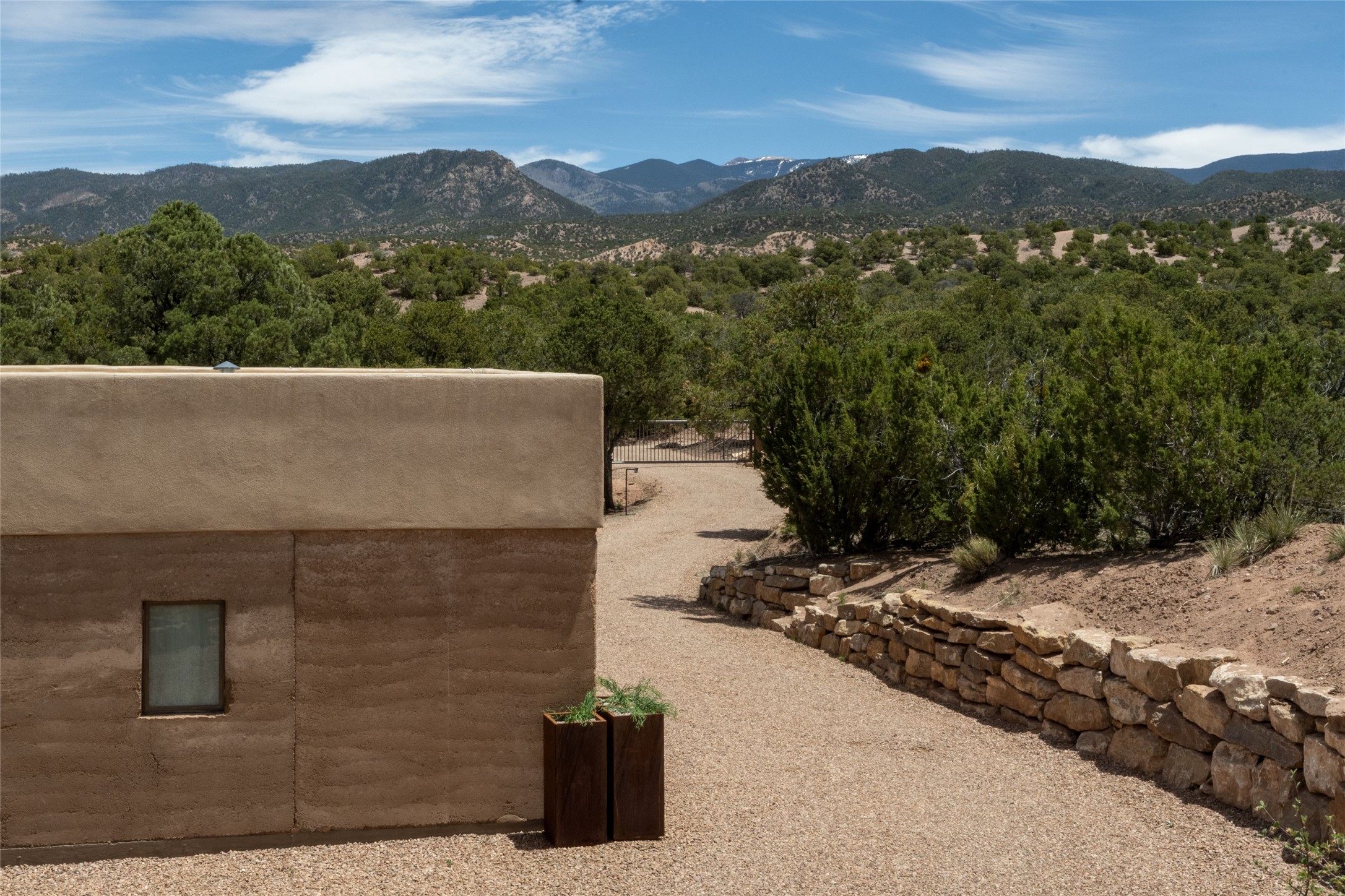Tranquility, seclusion, and refined living define this beautifully reimagined dual-residence estate tucked into the Sangre de Cristo foothills. Designed by award-winning architect Efthimios Maniatis, the residences reflect an organic modern aesthetic, blending clean architectural lines with warm textures, exposed beams, and earthy materials. Although located just minutes from the Santa Fe Plaza, Opera, Four Seasons Resort, and the village of Tesuque, the property feels wonderfully removed from the world. Adore multiple panoramas of the Sangre de Cristos, the Jemez, and expansive northern badlands. Set across 6.4 acres the estate provides openness and privacy rarely found this close to town. Mornings begin with sunlight spilling over the ski basin. Evenings invite quiet reflection on the north deck as the Jemez Mountains glow. Open the expansive glass doors in the living area for seamless indoor-outdoor dining beside the patio fireplace, or retreat to a primary suite with a media room and sweeping views. A distinctive feature of both homes is the use of rammed earth accent walls, an ancient construction technique prized for its natural beauty, acoustic calm, and thermal efficiency, making this estate one of a select few in Santa Fe to showcase this coveted architectural element. Both homes were professionally styled in 2024, and furnishings are available separately for a turnkey transition. Completely renovated in 2024, the property offers the confidence of modern systems throughout, including new roofs, kitchens, bathrooms, closets, boilers, whole-house water purification, and integrated smart-home technology with security, audio, high-speed internet, and climate controls. The 2/bed 2/bath, guest house is currently licensed for short term rentals and has generated over $100,000 annually, with existing reservations transferable to the new owner. This exceptional estate combines natural beauty, modern luxury, and investment opportunity in one unforgettable offering.