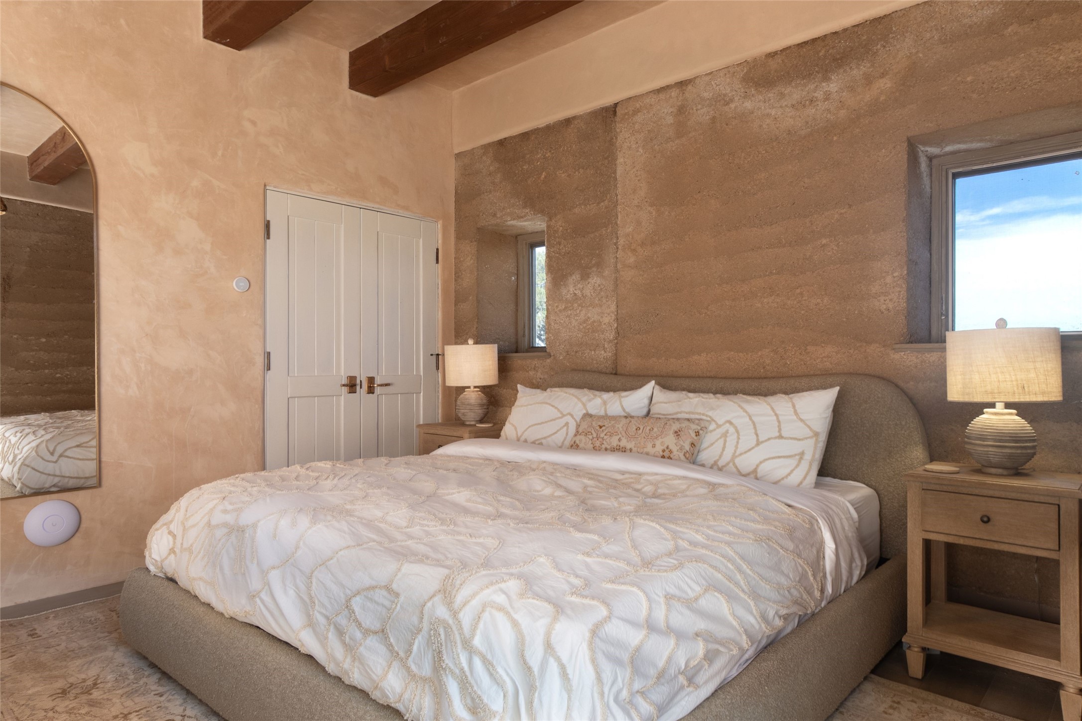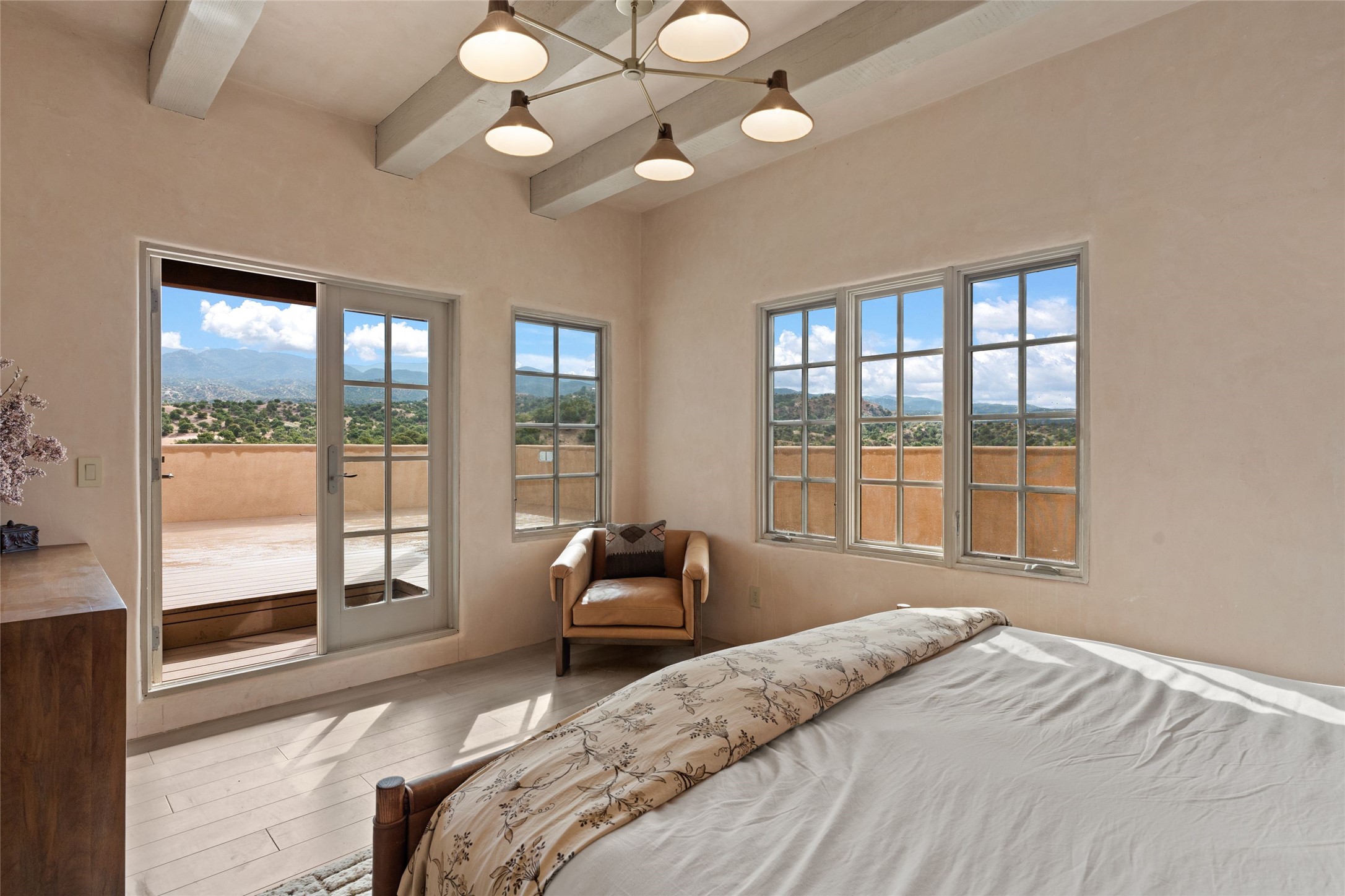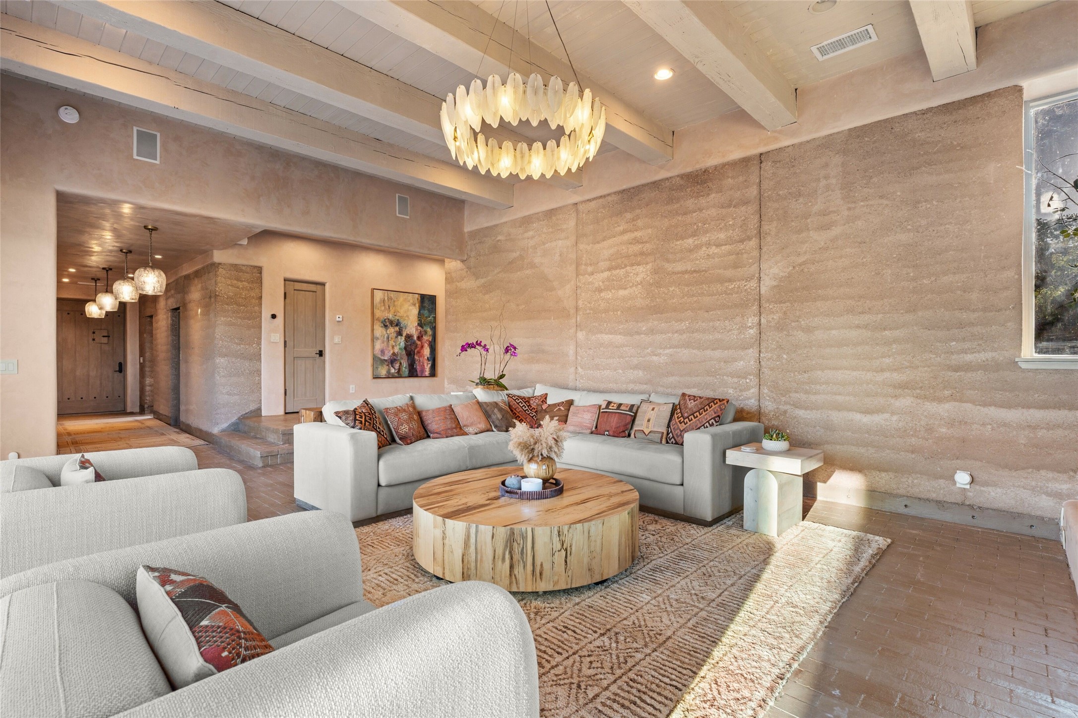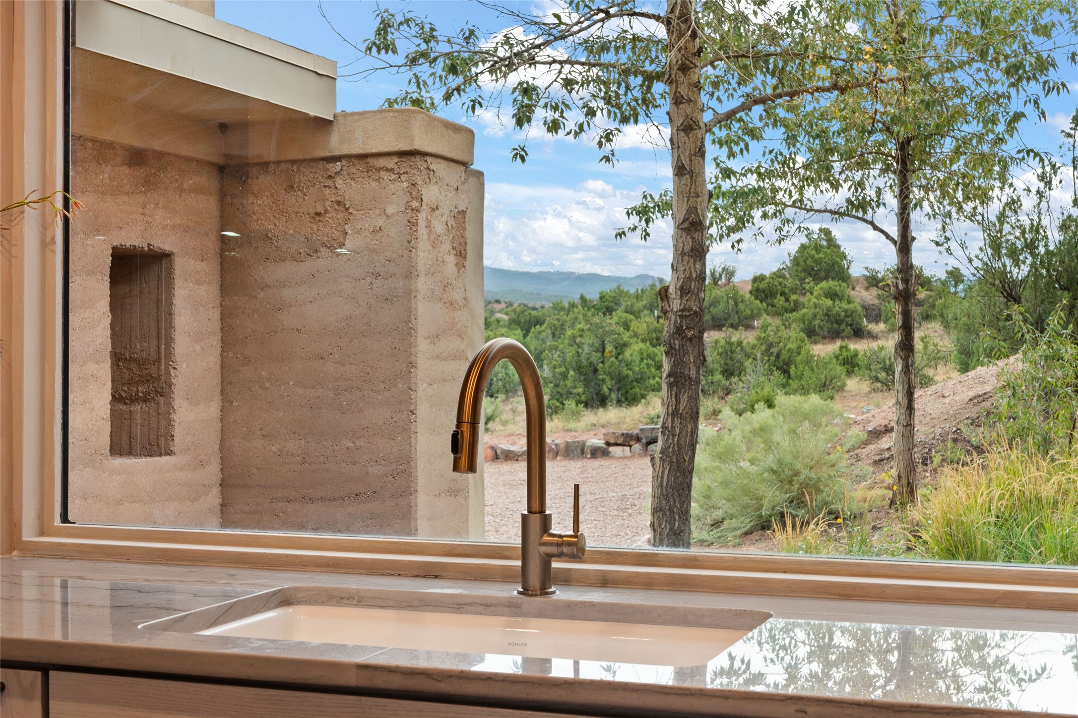 Tranquility, seclusion, and refined living define this beautifully reimagined dual-residence estate tucked into the Sangre de Cristo foothills. Designed by award-winning architect Efthimios Maniatis, the residences reflect an organic modern aesthetic, blending clean architectural lines with warm textures, exposed beams, and earthy materials. Although located just minutes from the Santa Fe Plaza, Opera, Four Seasons Resort, and the village of Tesuque, the property feels wonderfully removed from the world. Adore multiple panoramas of the Sangre de Cristos, the Jemez, and expansive northern badlands. Set across 6.4 acres the estate provides openness and privacy rarely found this close to town. Mornings begin with sunlight spilling over the ski basin. Evenings invite quiet reflection on the north deck as the Jemez Mountains glow. Open the expansive glass doors in the living area for seamless indoor-outdoor dining beside the patio fireplace, or retreat to a primary suite with a media room and sweeping views. A distinctive feature of both homes is the use of rammed earth accent walls, an ancient construction technique prized for its natural beauty, acoustic calm, and thermal efficiency, making this estate one of a select few in Santa Fe to showcase this coveted architectural element. Both homes were professionally styled in 2024, and furnishings are available separately for a turnkey transition. Completely renovated in 2024, the property offers the confidence of modern systems throughout, including new roofs, kitchens, bathrooms, closets, boilers, whole-house water purification, and integrated smart-home technology with security, audio, high-speed internet, and climate controls. The 2/bed 2/bath, guest house is currently licensed for short term rentals and has generated over $100,000 annually, with existing reservations transferable to the new owner. This exceptional estate combines natural beauty, modern luxury, and investment opportunity in one unforgettable offering.