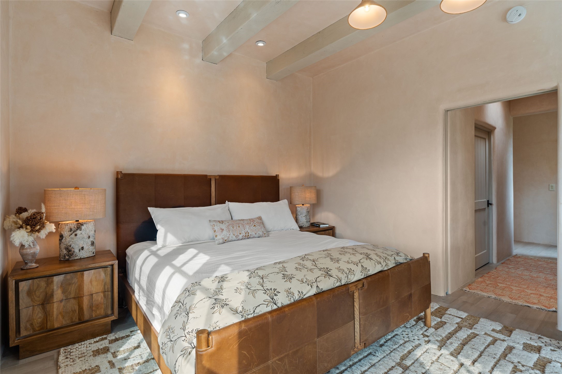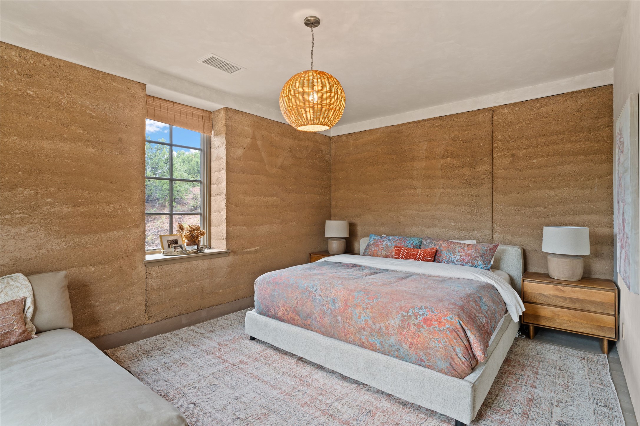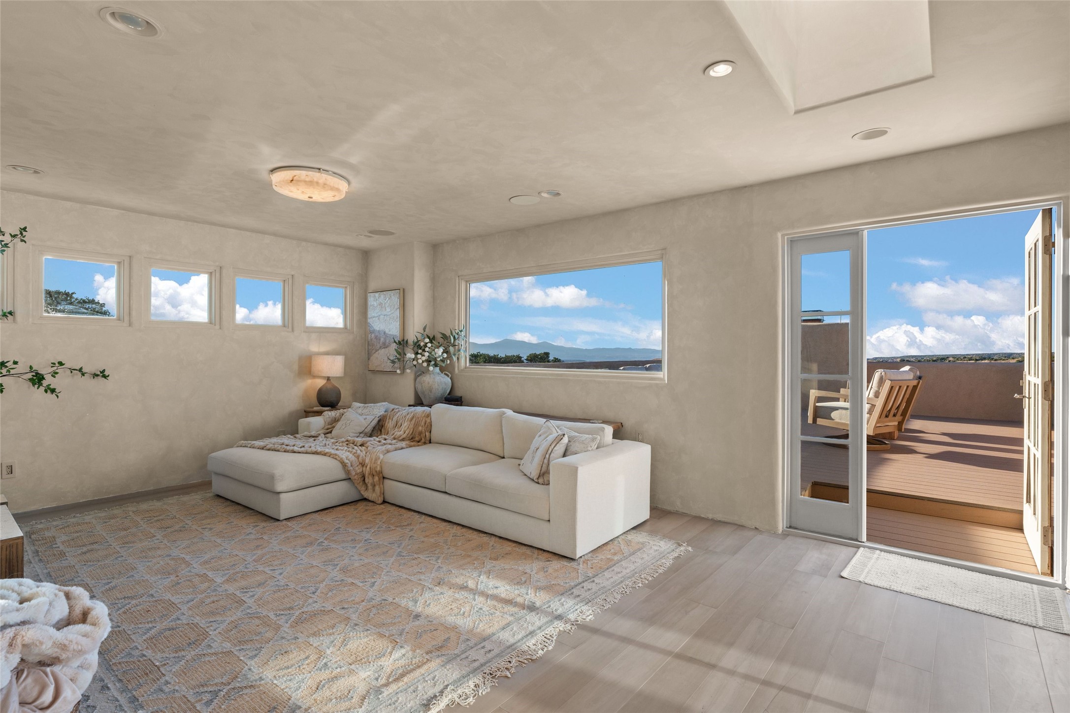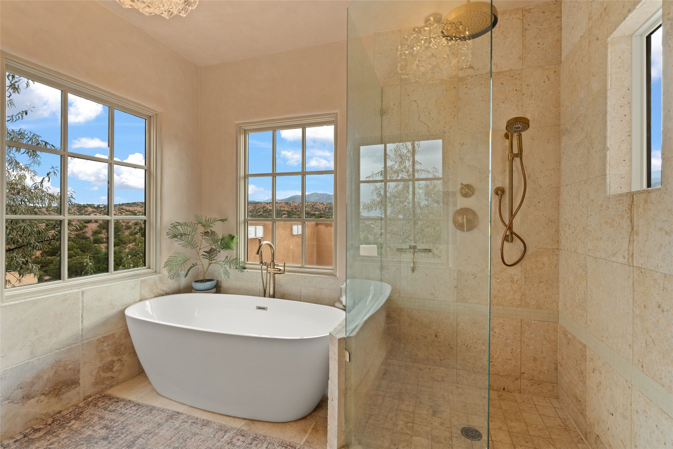 Tranquility, seclusion, and refined living define this beautifully reimagined dual-residence estate tucked into the Sangre de Cristo foothills. Designed by award-winning architect Efthimios Maniatis, the residences reflect an organic modern aesthetic, blending clean architectural lines with warm textures, exposed beams, and earthy materials. Although located just minutes from the Santa Fe Plaza, Opera, Four Seasons Resort, and the village of Tesuque, the property feels wonderfully removed from the world. Adore multiple panoramas of the Sangre de Cristos, the Jemez, and expansive northern badlands. Set across 6.4 acres the estate provides openness and privacy rarely found this close to town. Mornings begin with sunlight spilling over the ski basin. Evenings invite quiet reflection on the north deck as the Jemez Mountains glow. Open the expansive glass doors in the living area for seamless indoor-outdoor dining beside the patio fireplace, or retreat to a primary suite with a media room and sweeping views. A distinctive feature of both homes is the use of rammed earth accent walls, an ancient construction technique prized for its natural beauty, acoustic calm, and thermal efficiency, making this estate one of a select few in Santa Fe to showcase this coveted architectural element. Both homes were professionally styled in 2024, and furnishings are available separately for a turnkey transition. Completely renovated in 2024, the property offers the confidence of modern systems throughout, including new roofs, kitchens, bathrooms, closets, boilers, whole-house water purification, and integrated smart-home technology with security, audio, high-speed internet, and climate controls. The 2/bed 2/bath, guest house is currently licensed for short term rentals and has generated over $100,000 annually, with existing reservations transferable to the new owner. This exceptional estate combines natural beauty, modern luxury, and investment opportunity in one unforgettable offering.